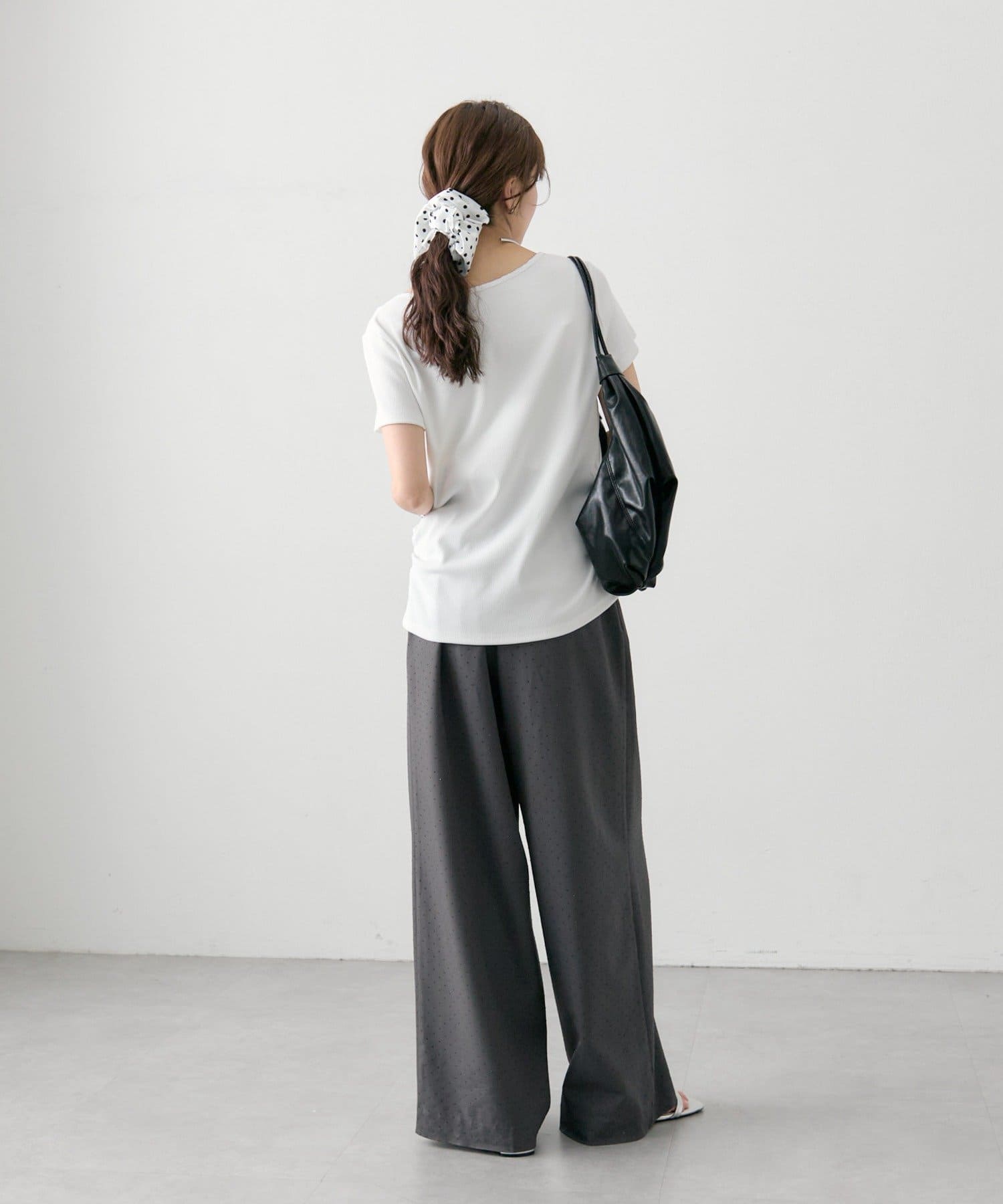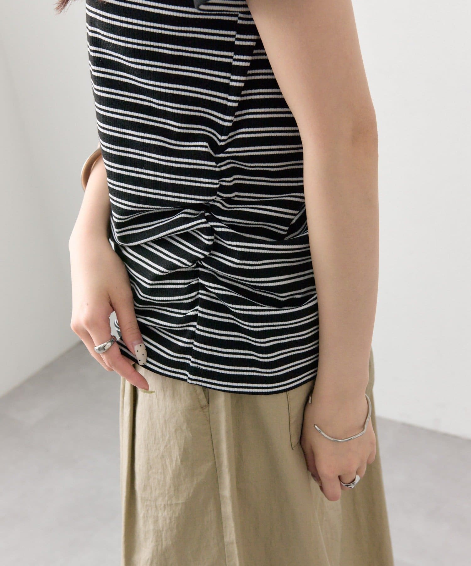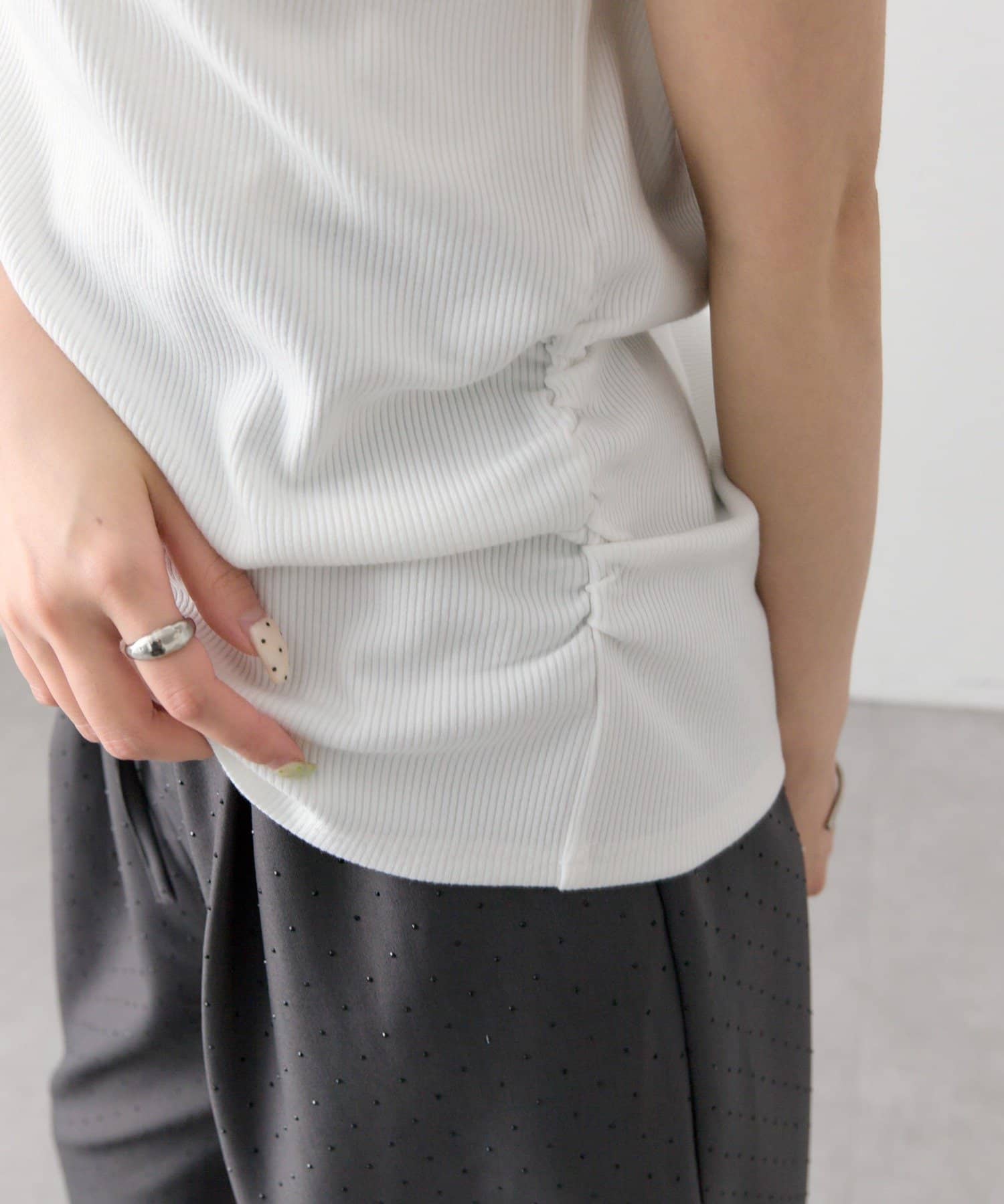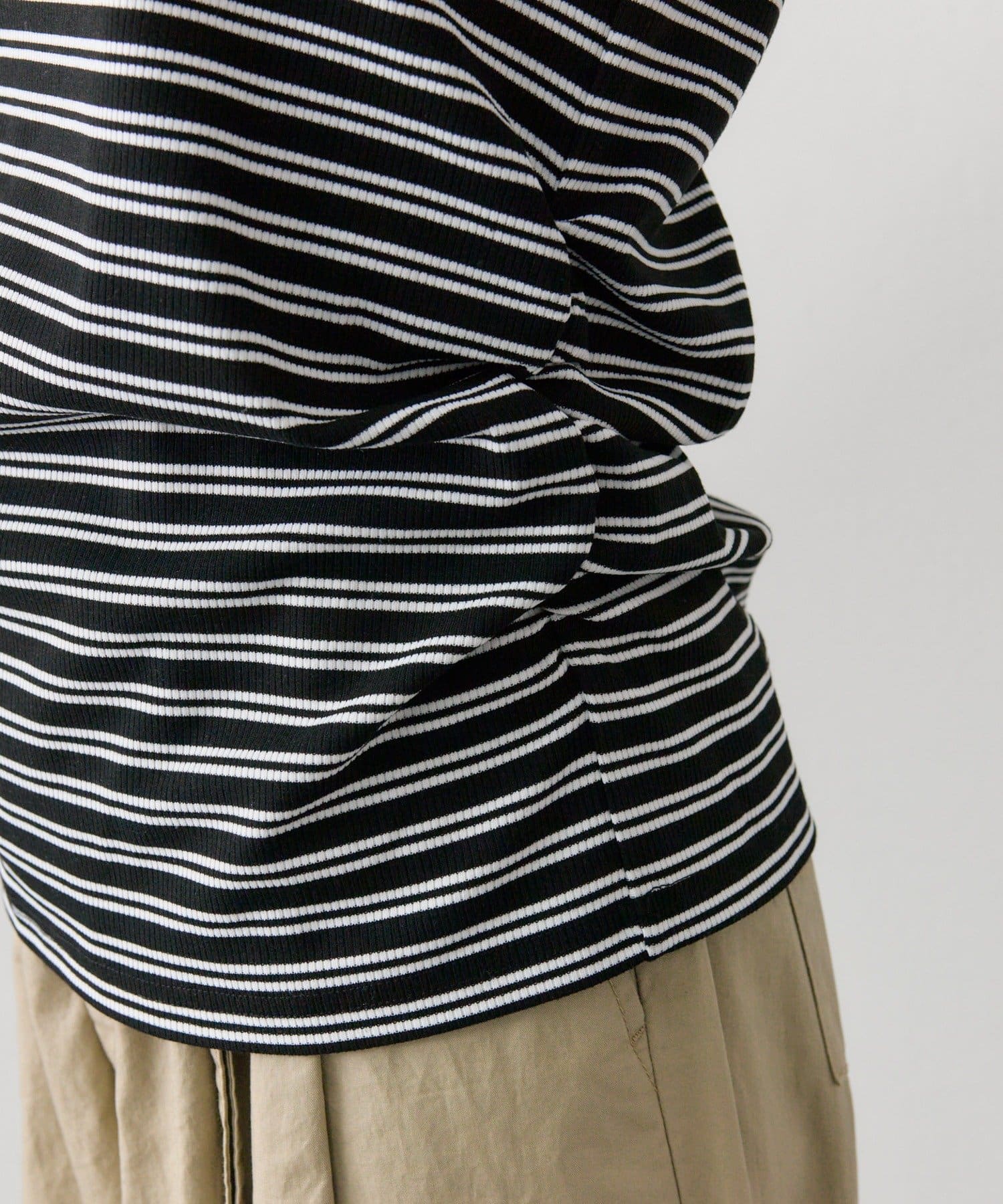 ・リブ素材で程よくフィットし、ボディラインをすっきり見せてくれる一枚です。