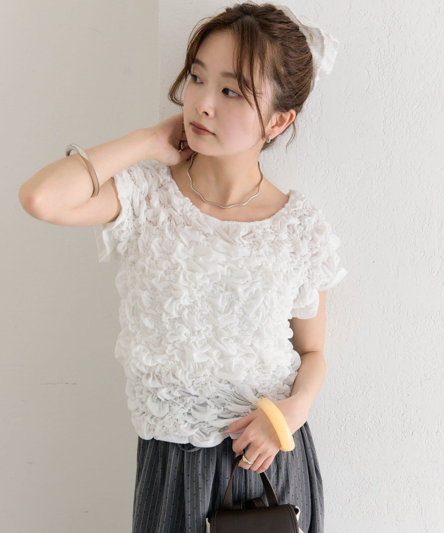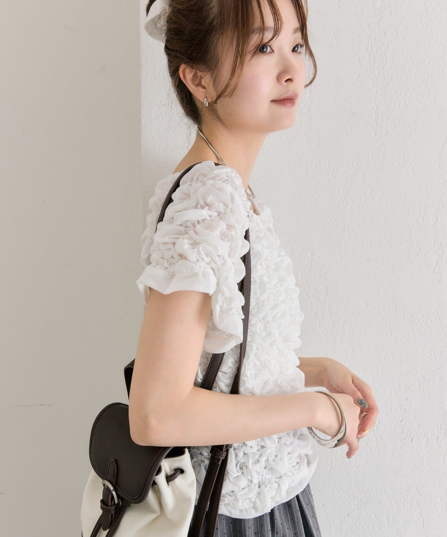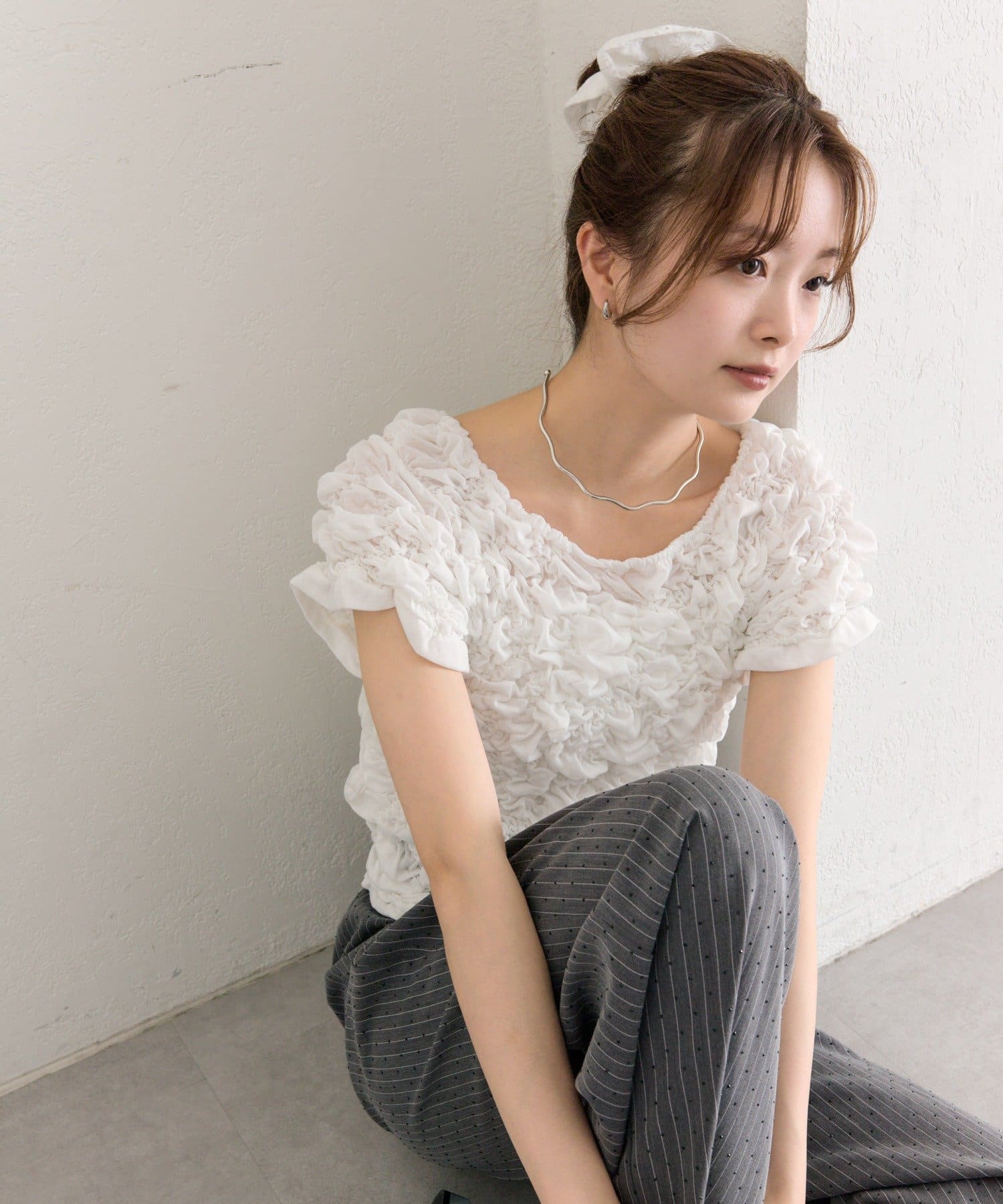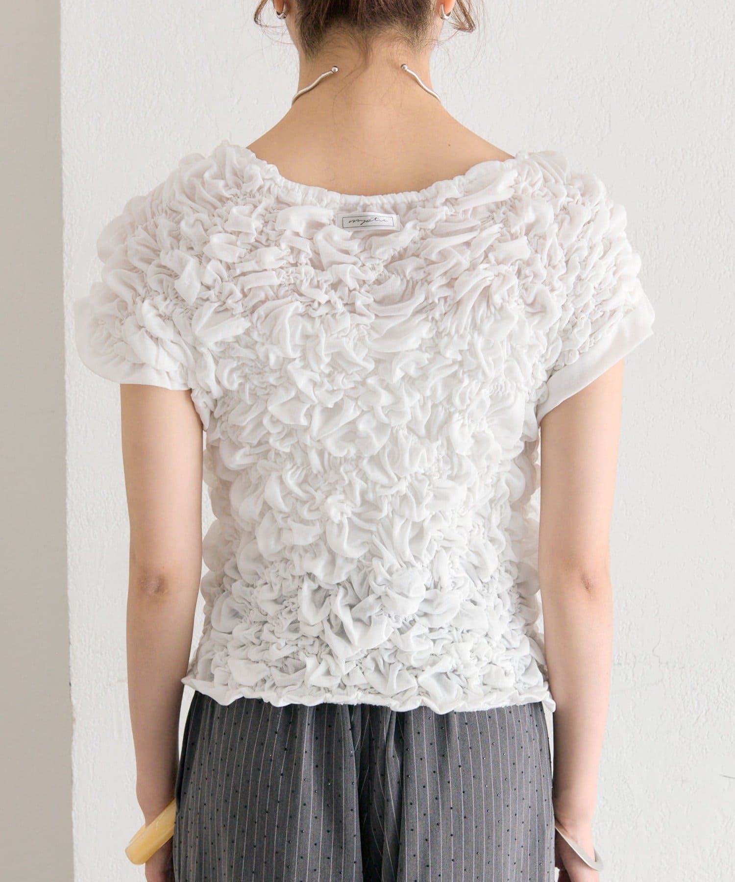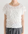 ・シャーリング加工が、ふわっとした立体感と華やかさを演出するトップス。