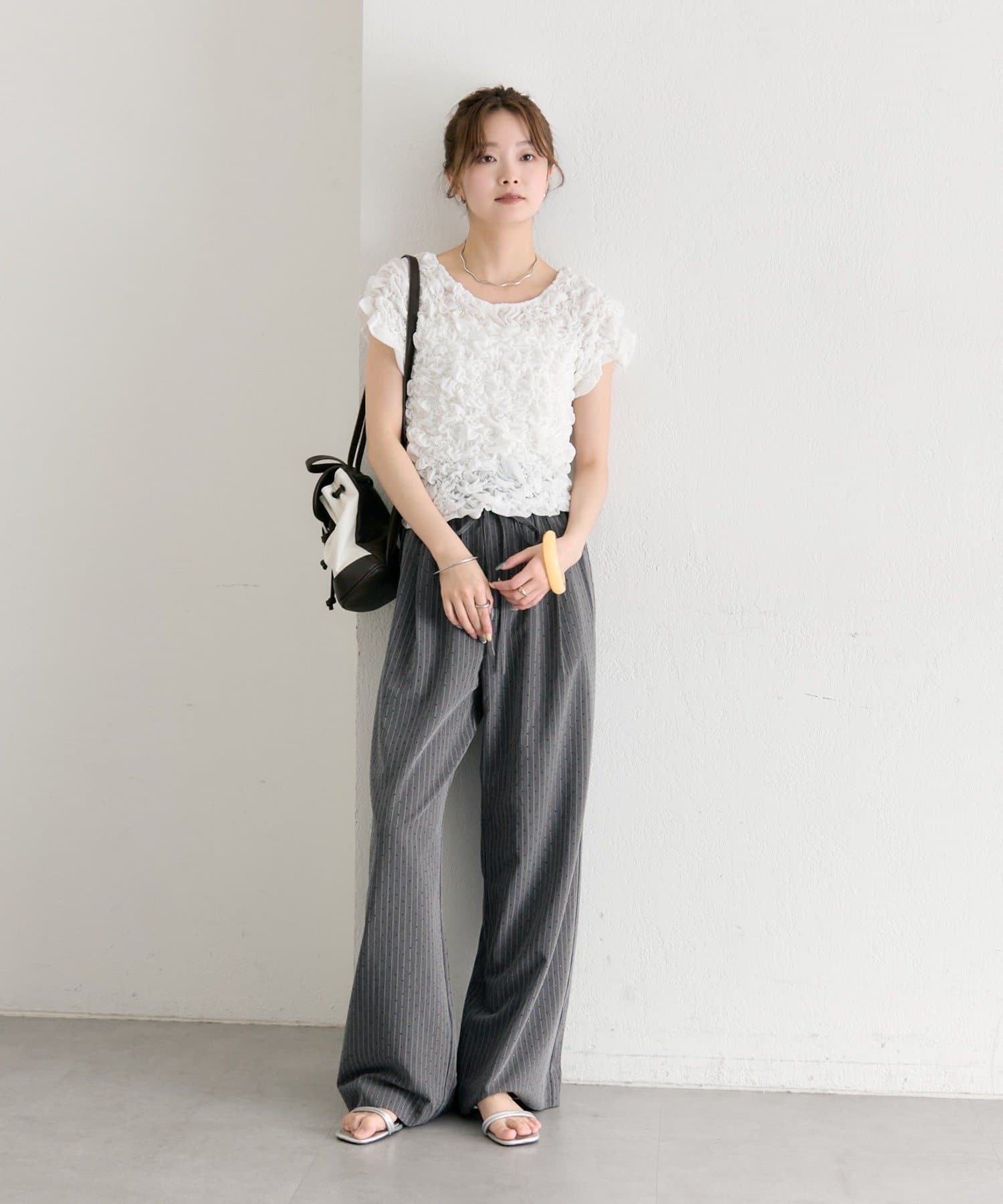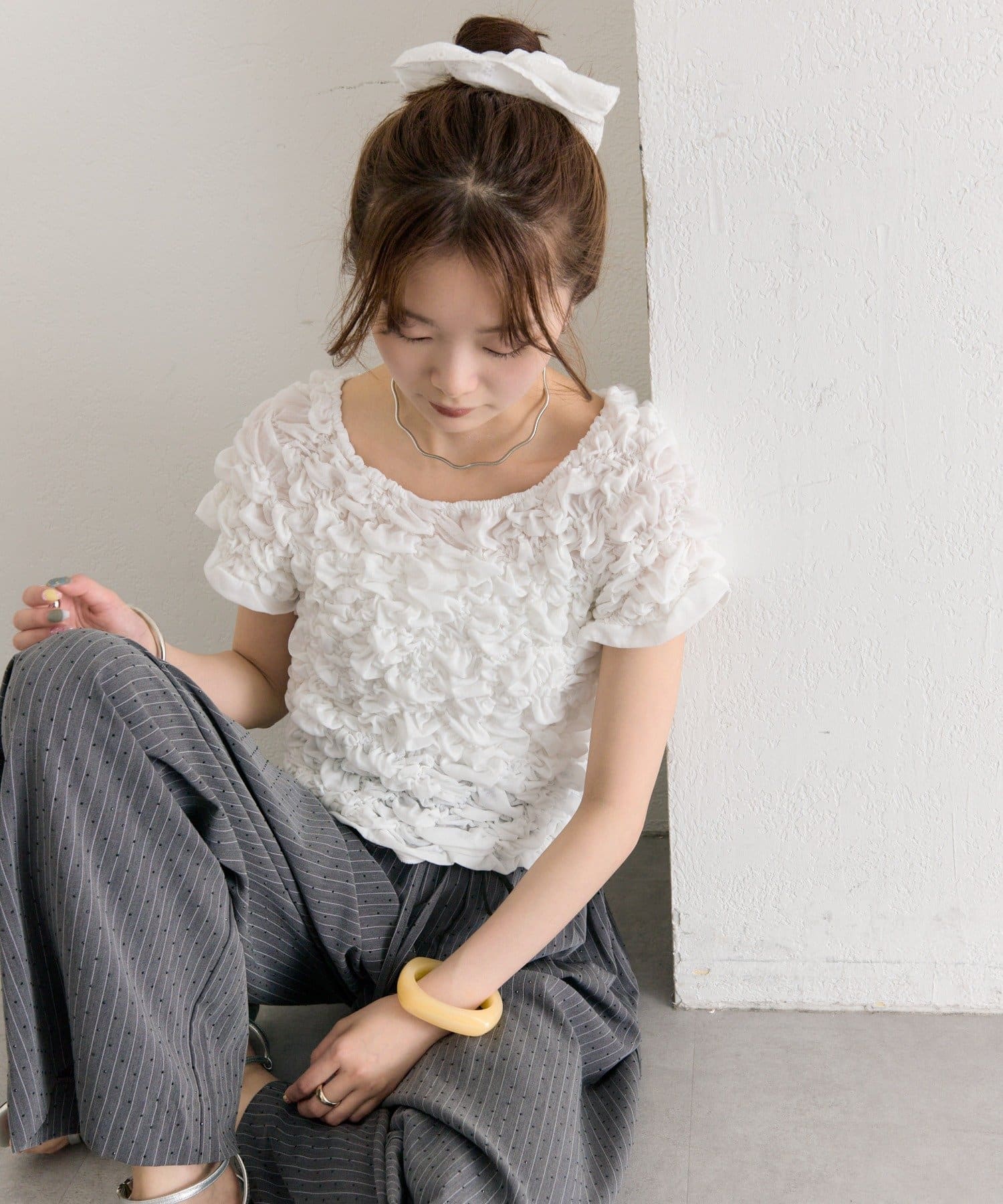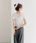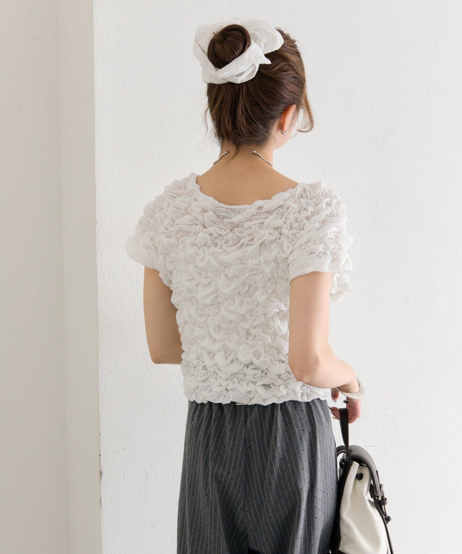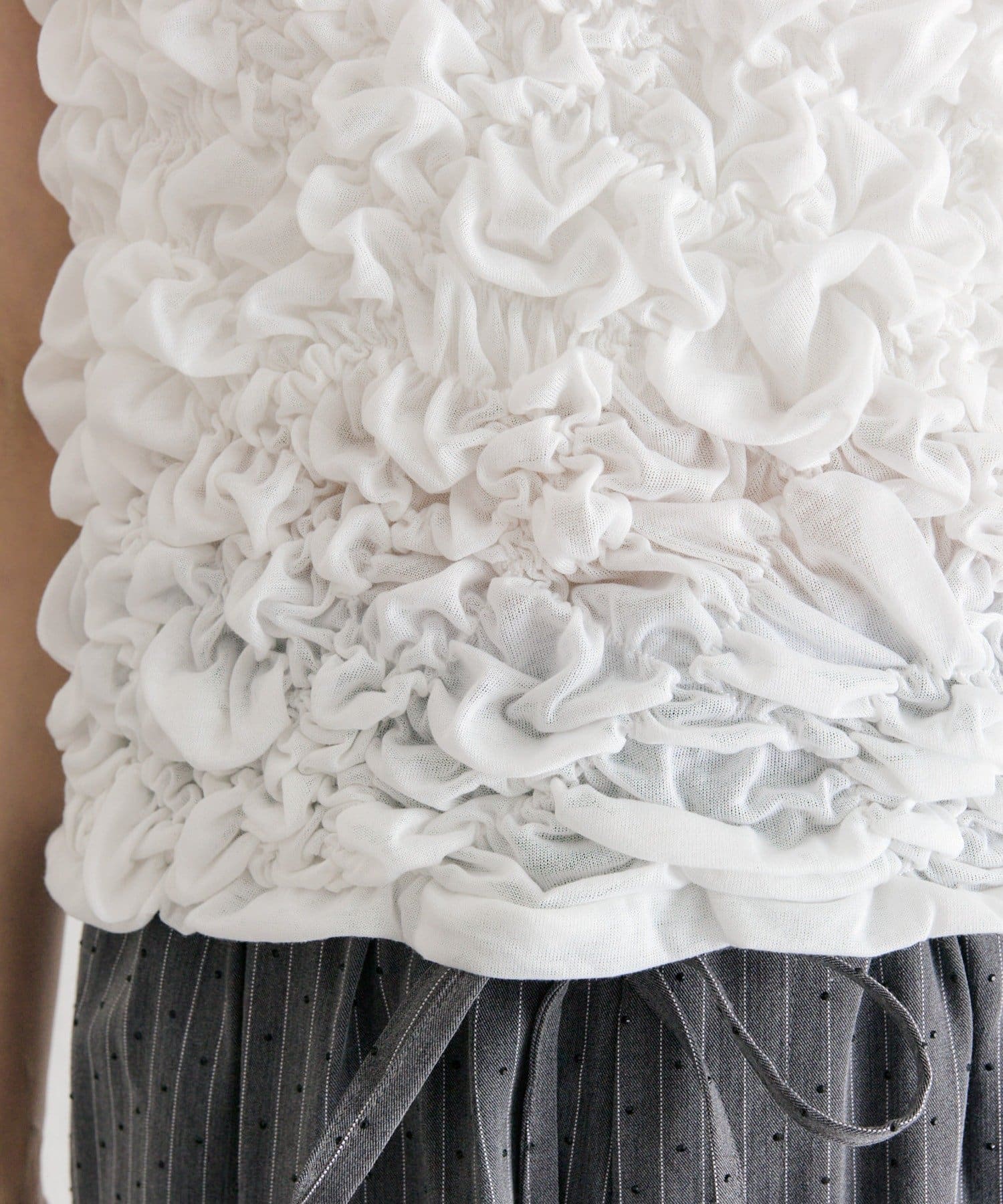 ・シャーリング加工が、ふわっとした立体感と華やかさを演出するトップス。