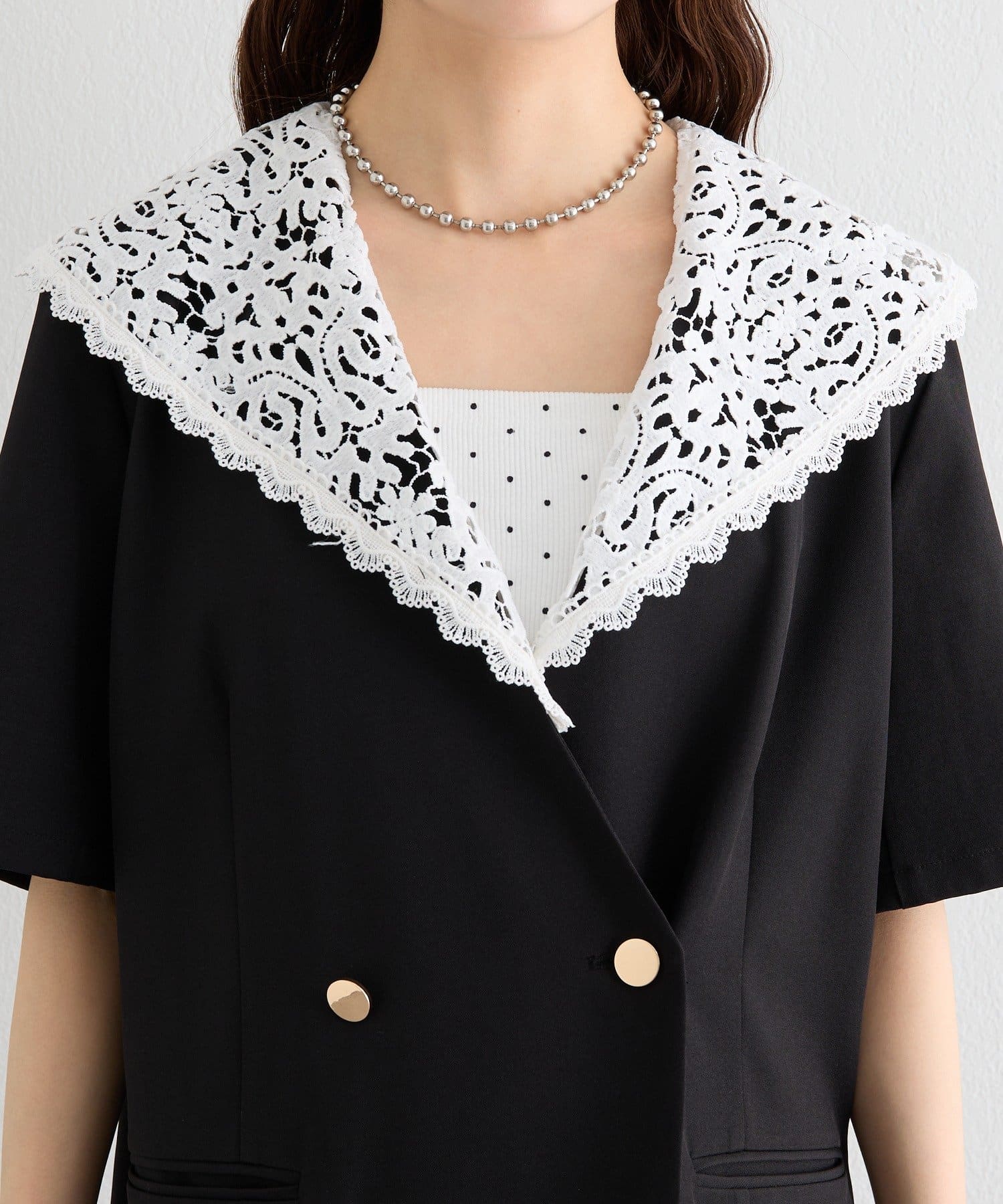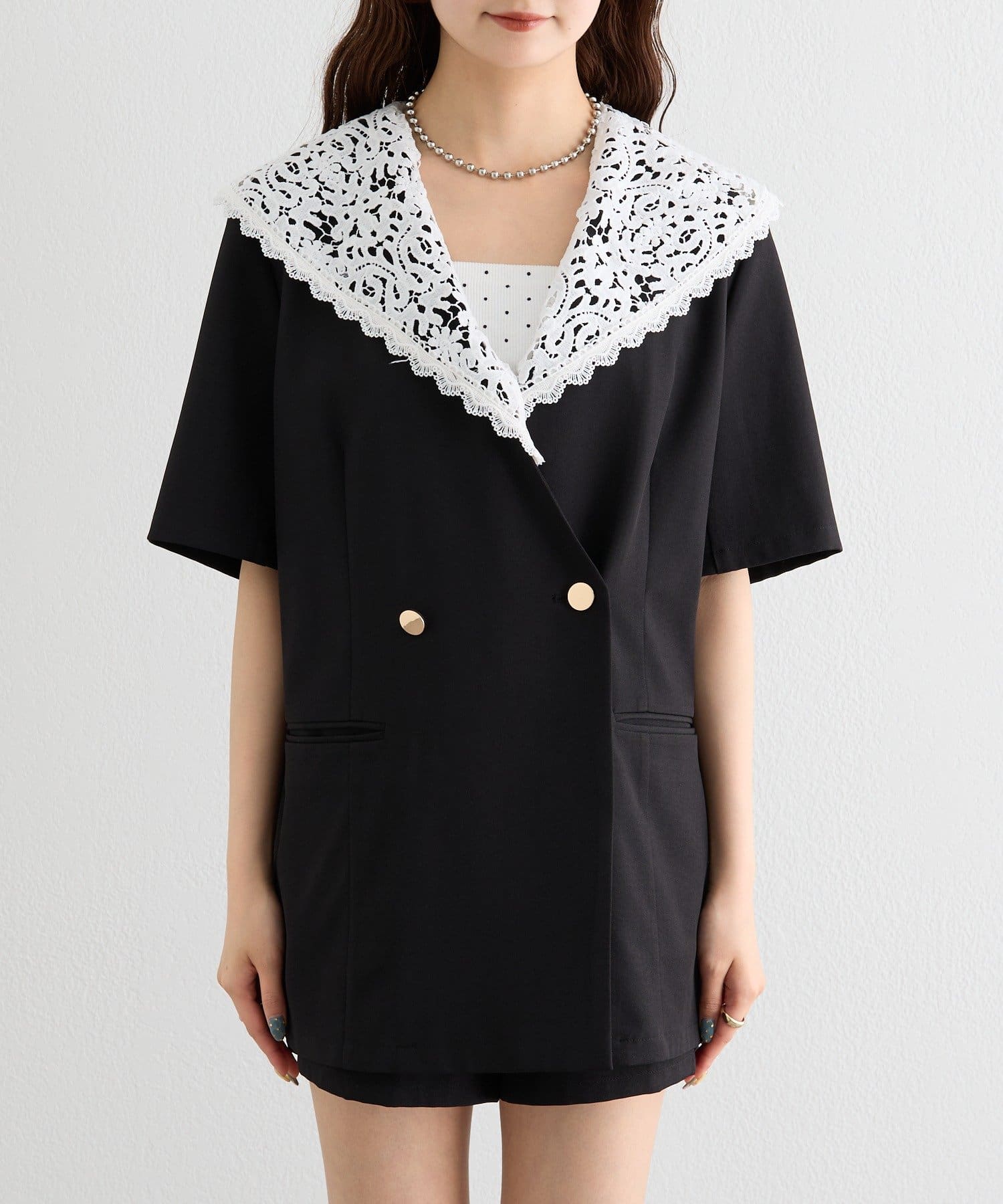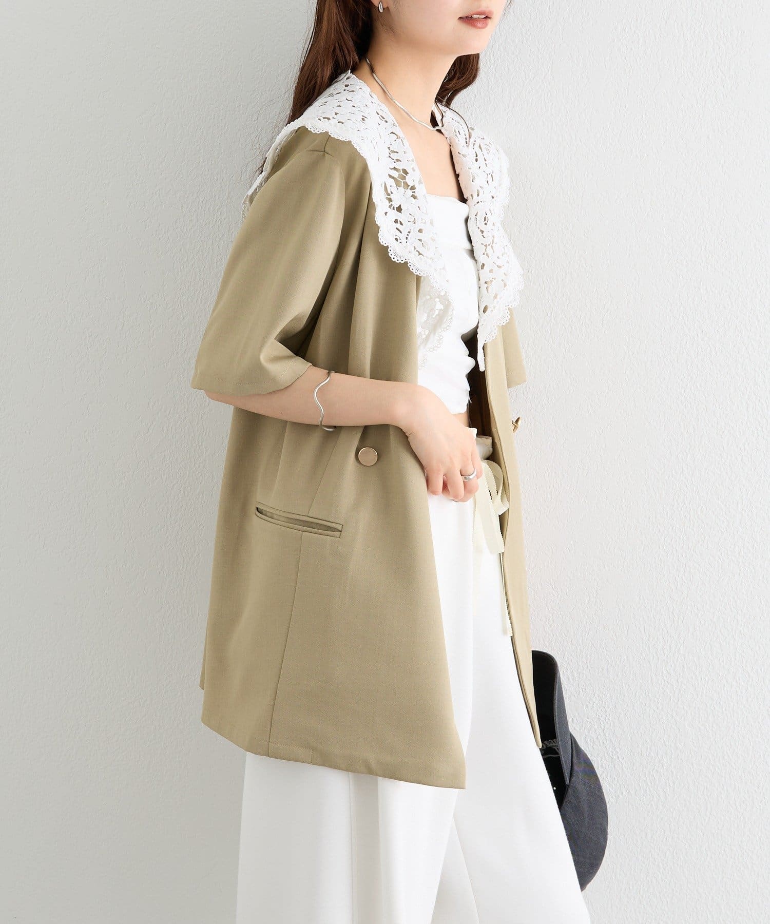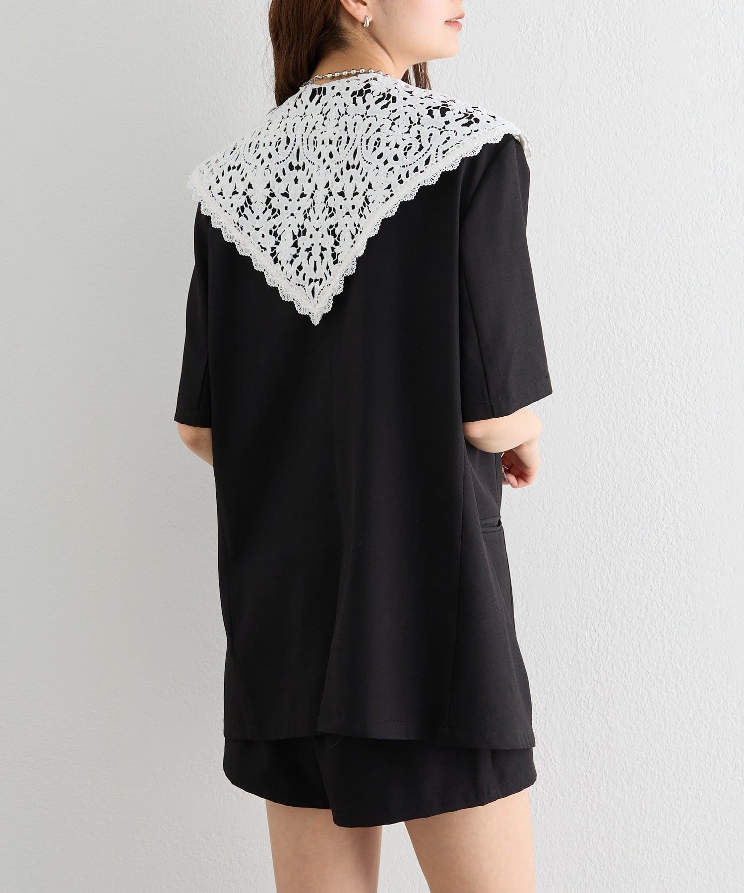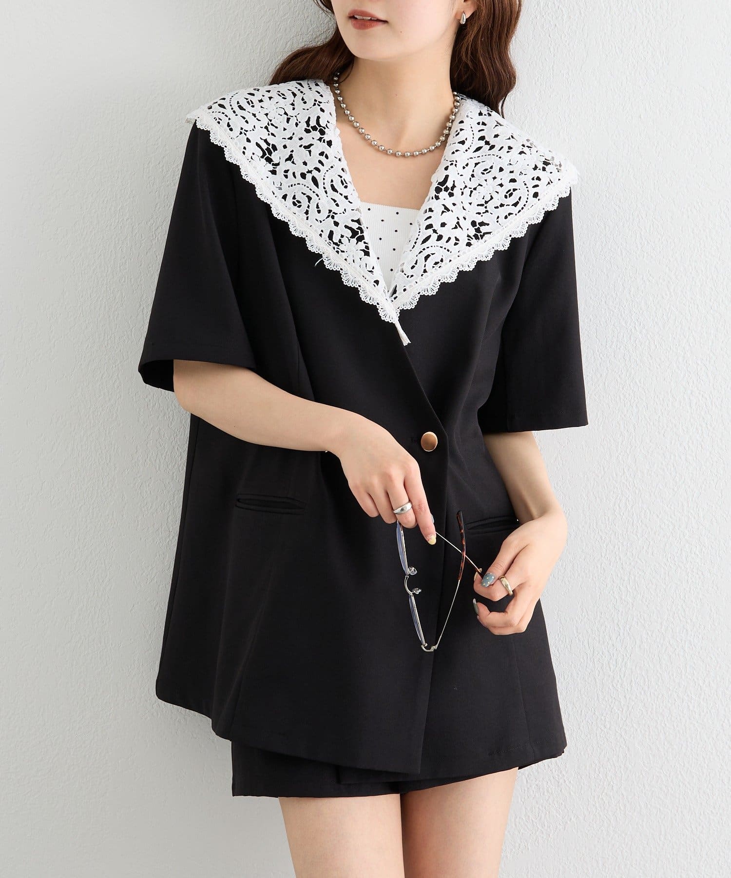 レースの付け襟でクラシカルも抜け感も叶う半袖ジャケット