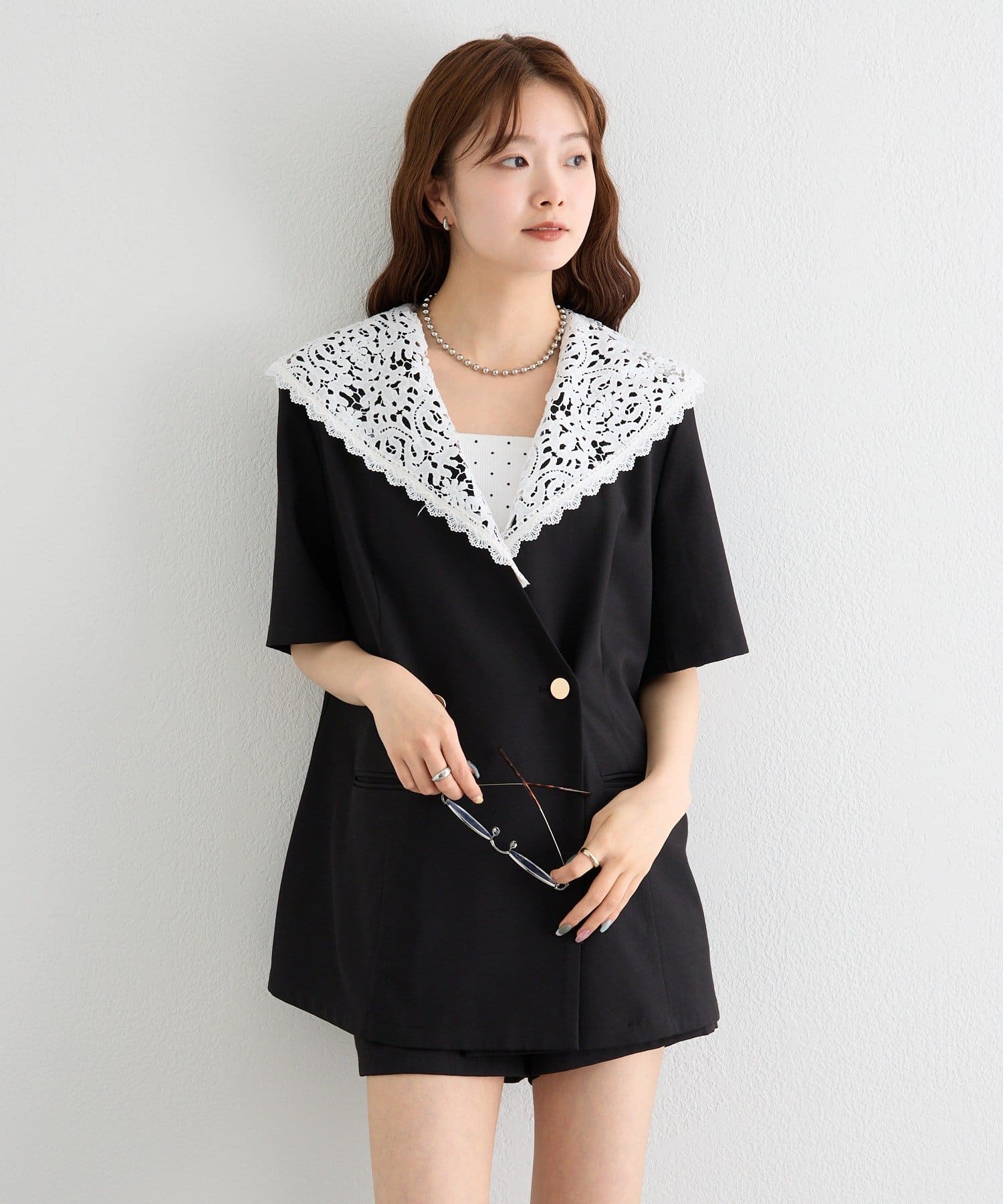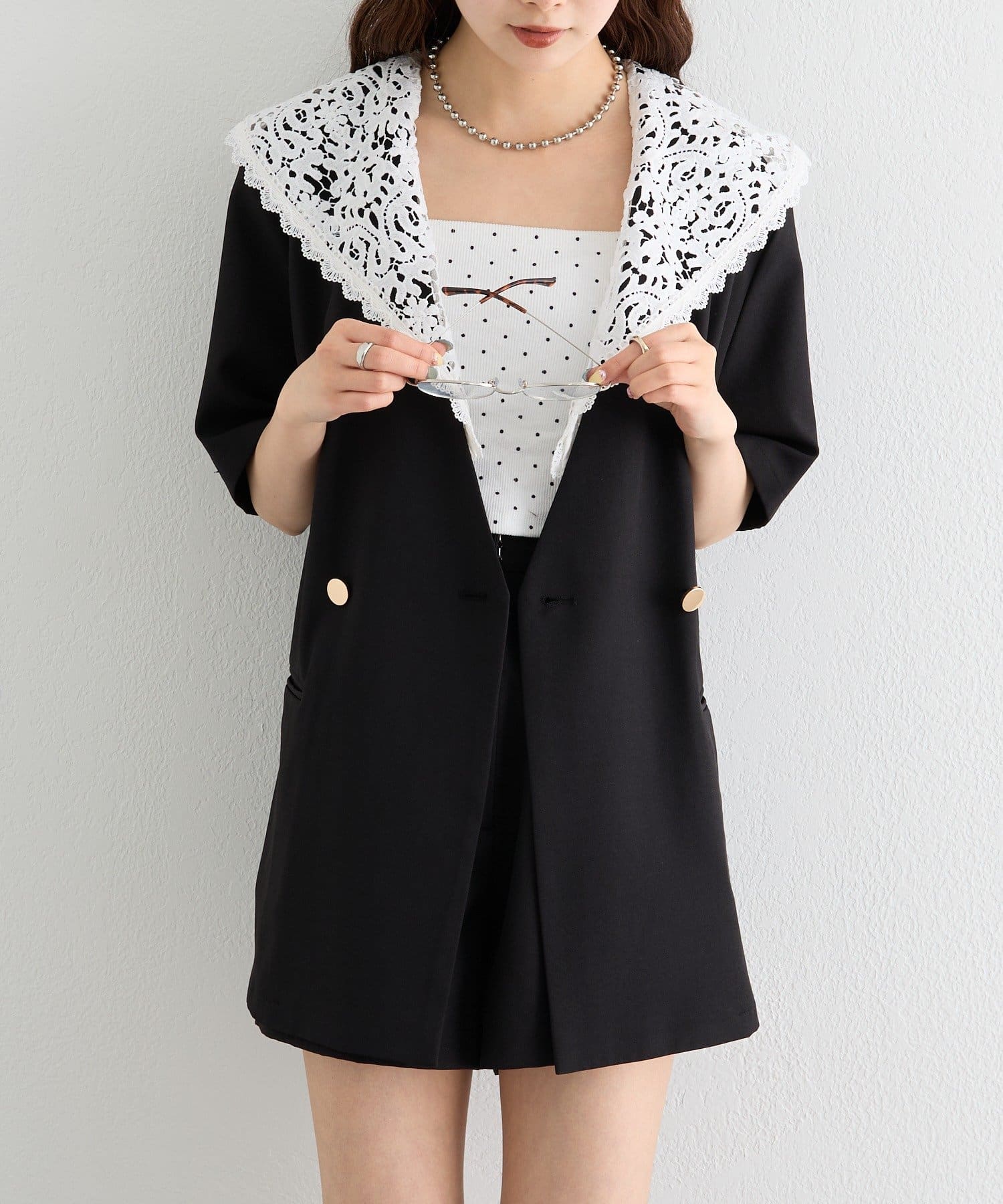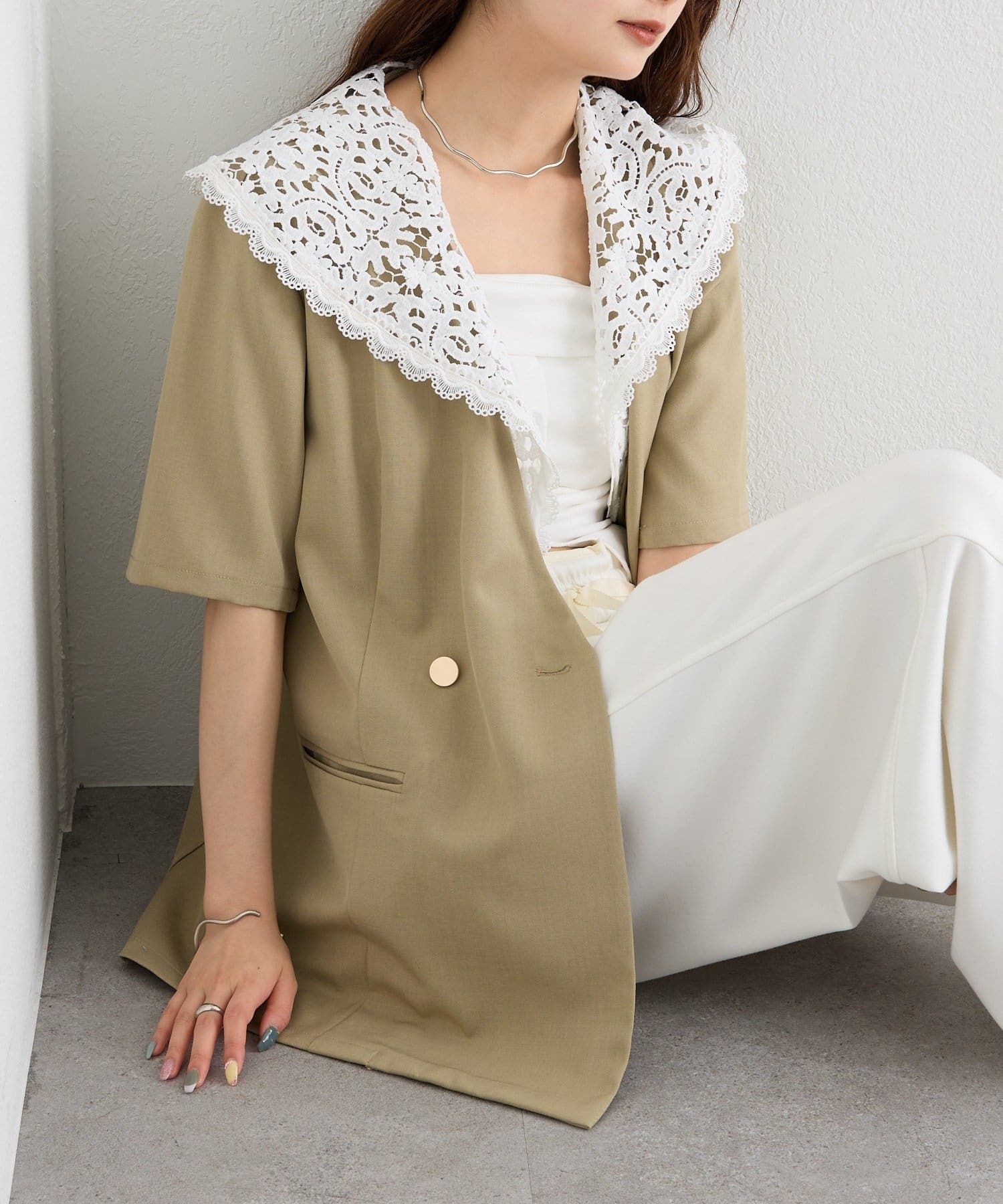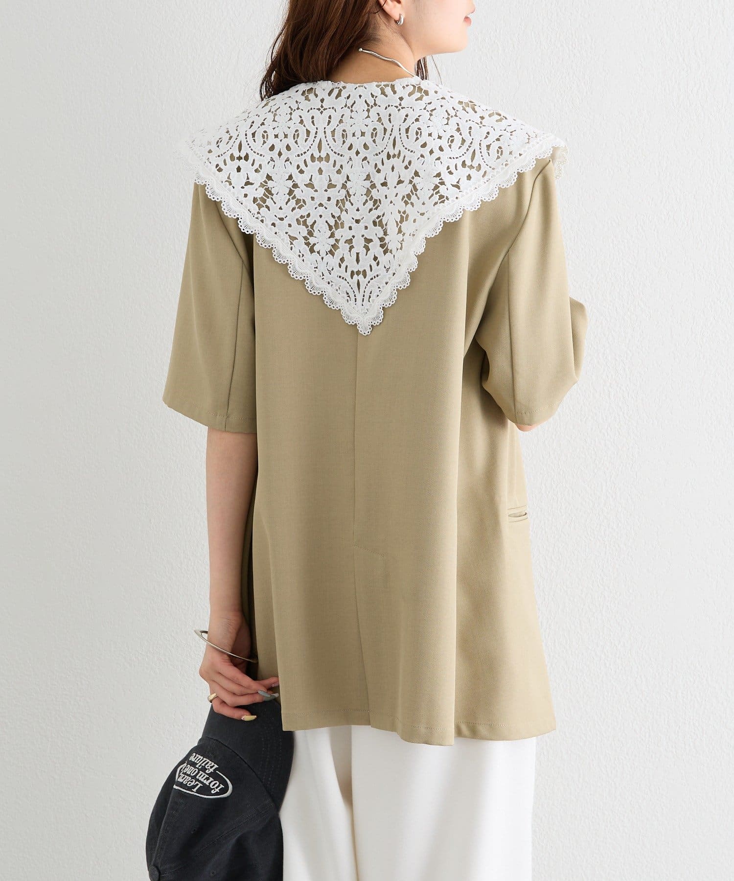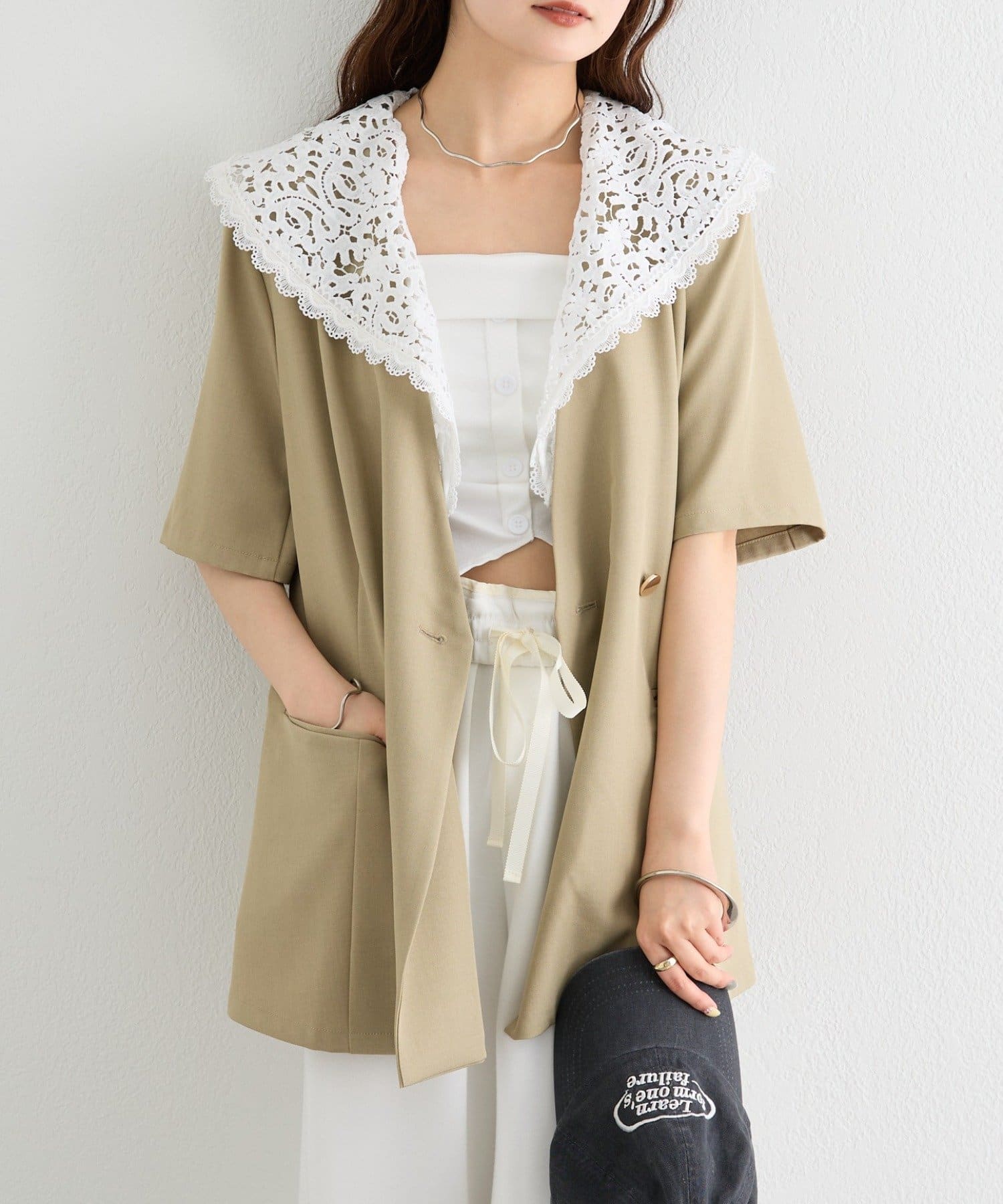 レースの付け襟でクラシカルも抜け感も叶う半袖ジャケット