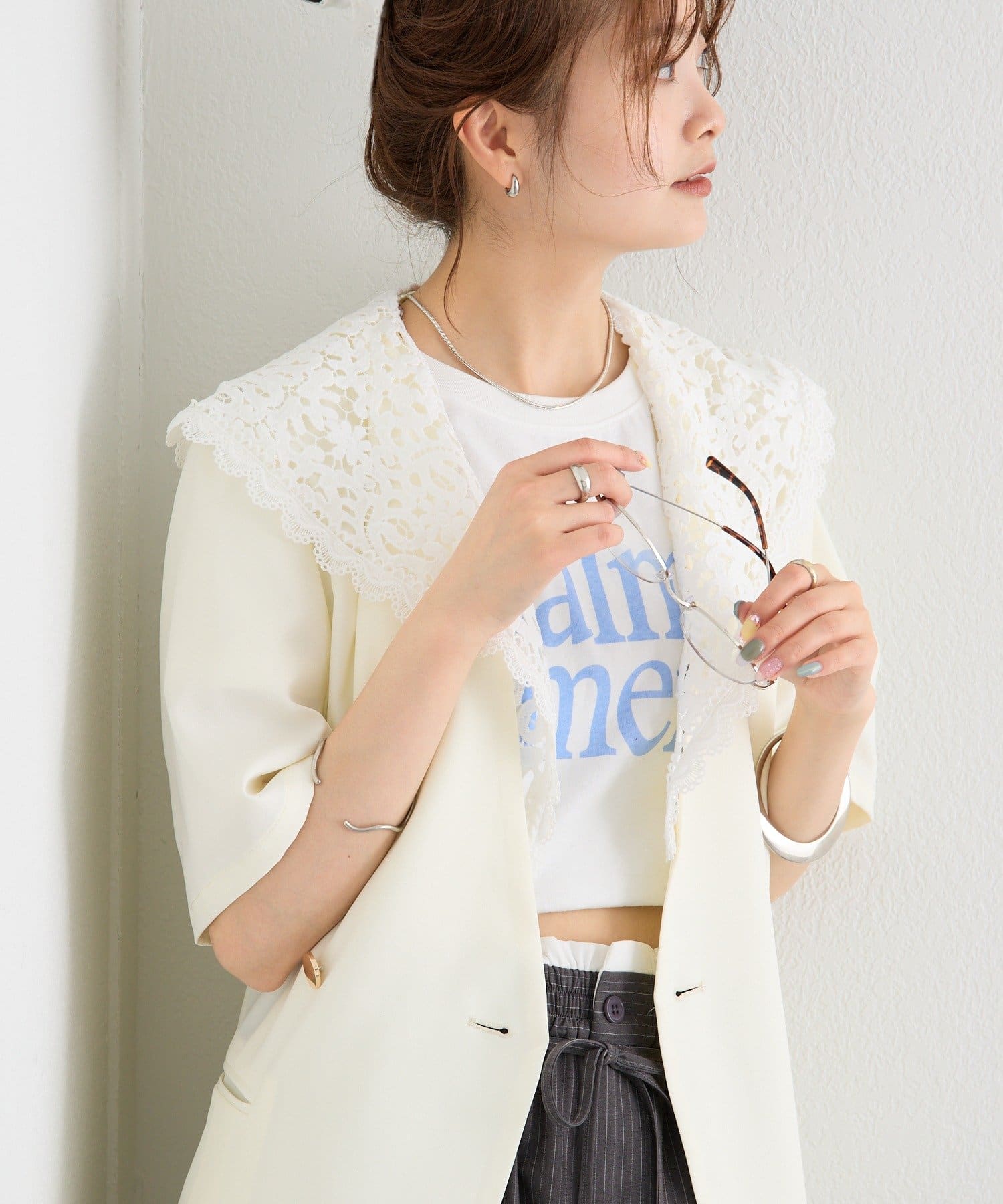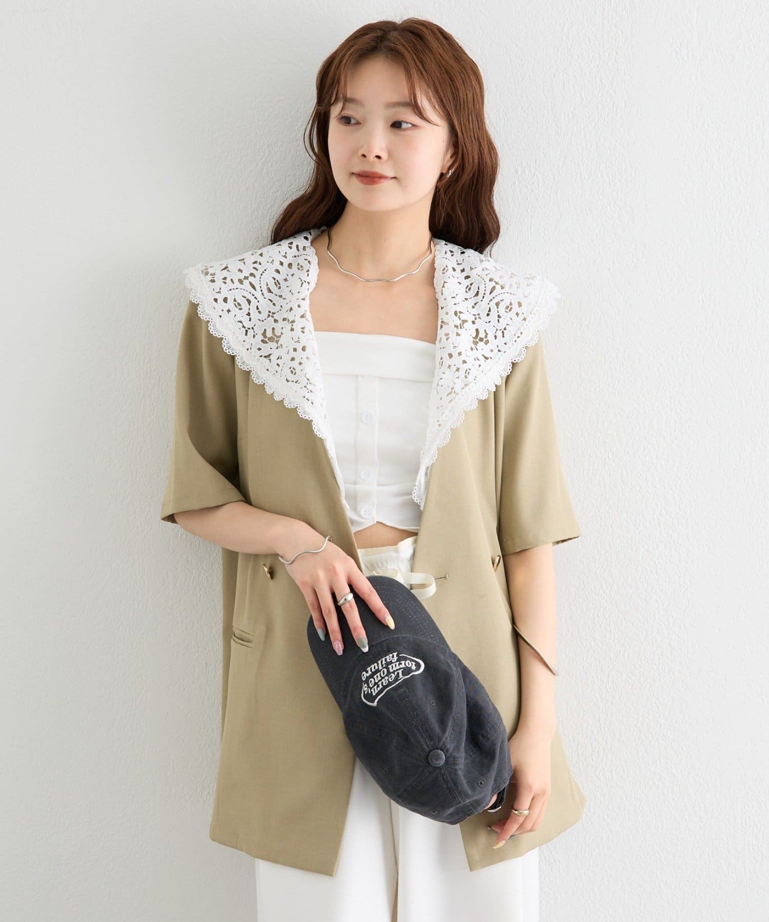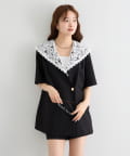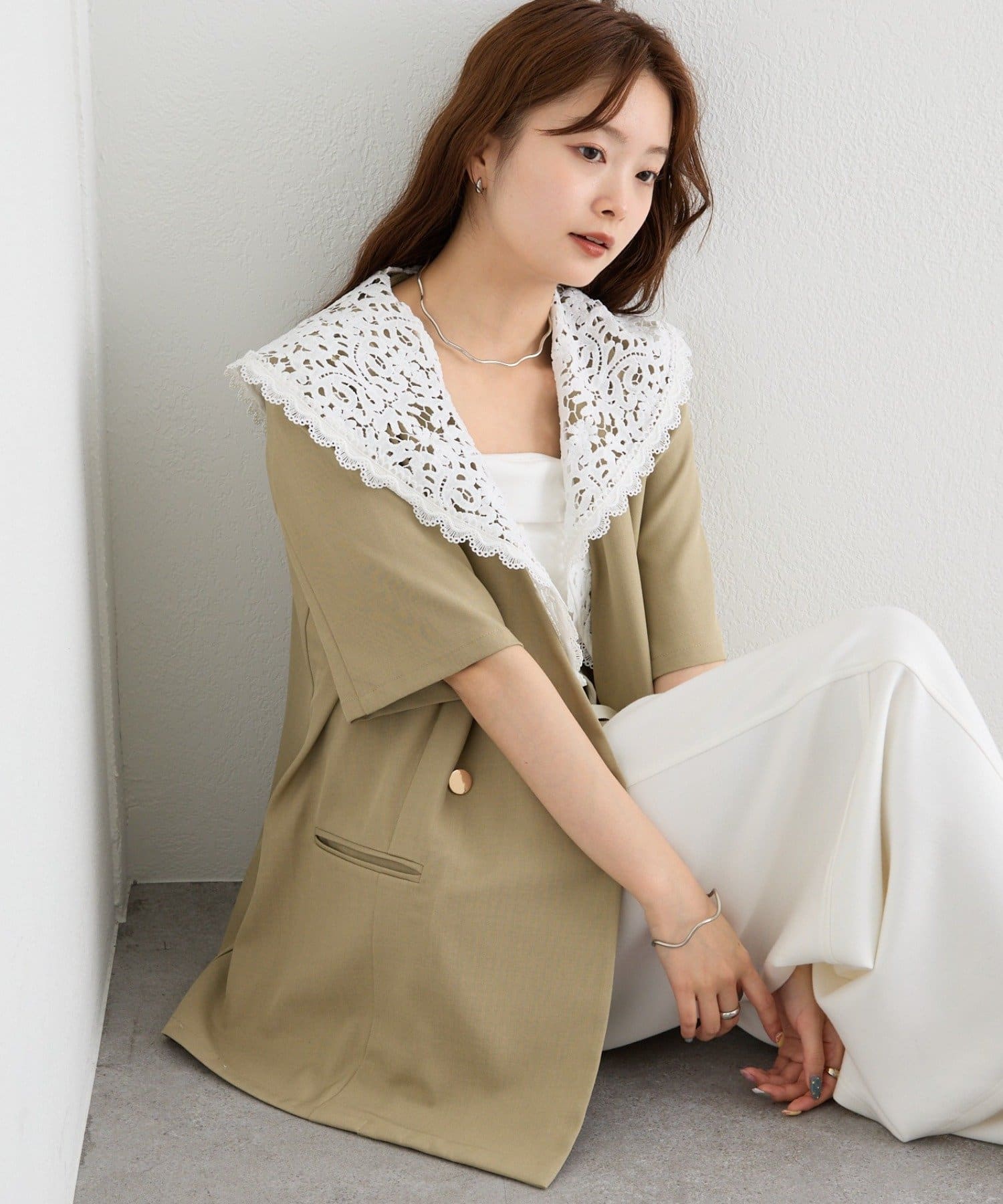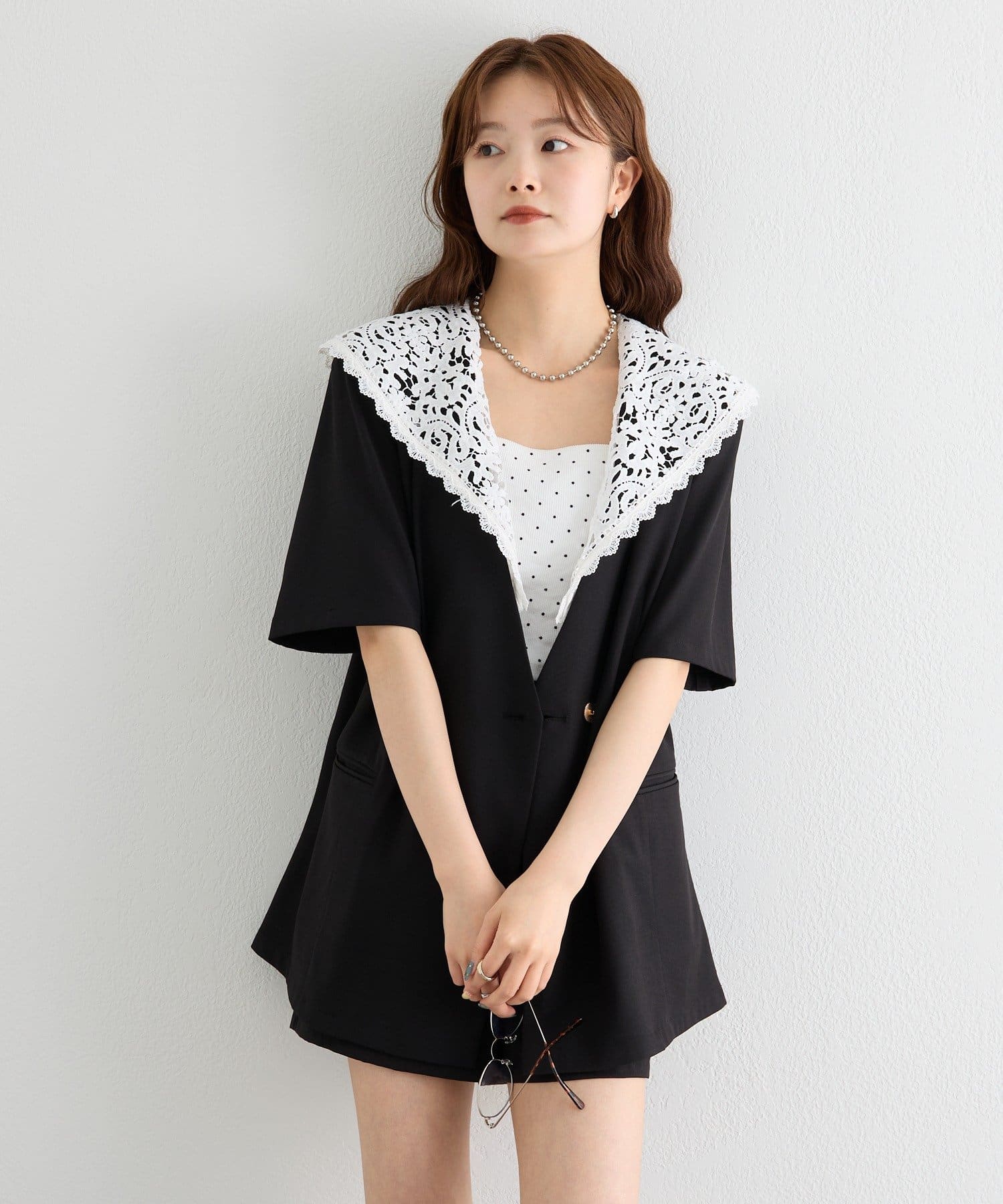 レースの付け襟でクラシカルも抜け感も叶う半袖ジャケット