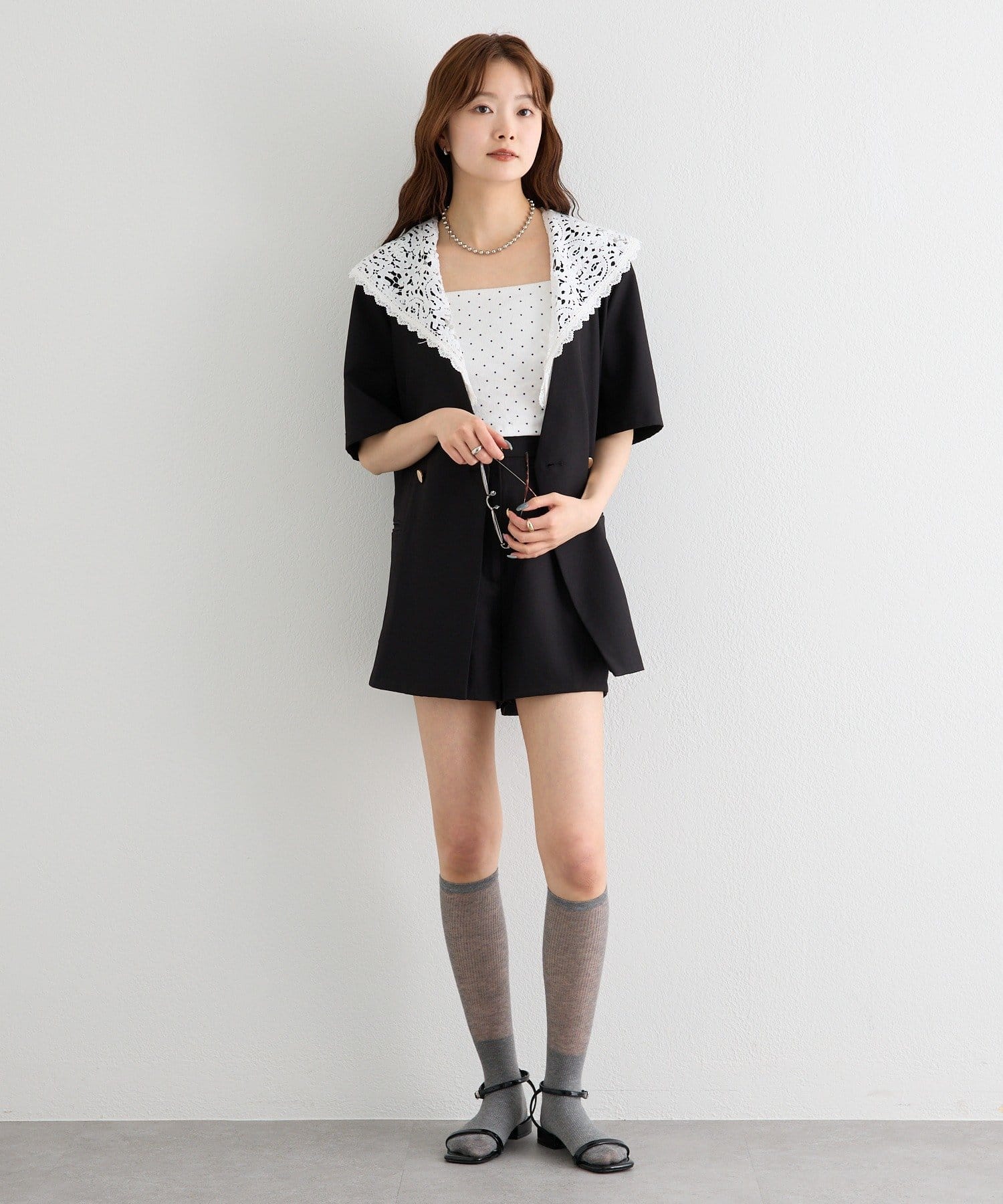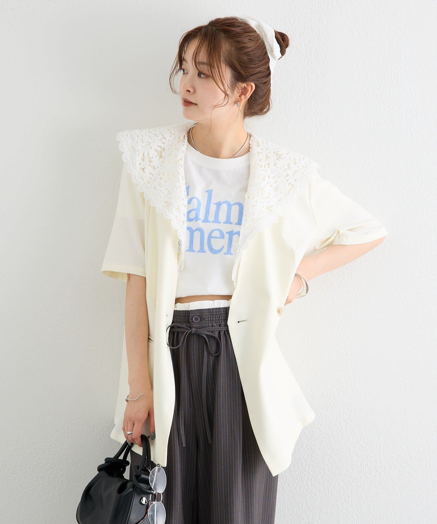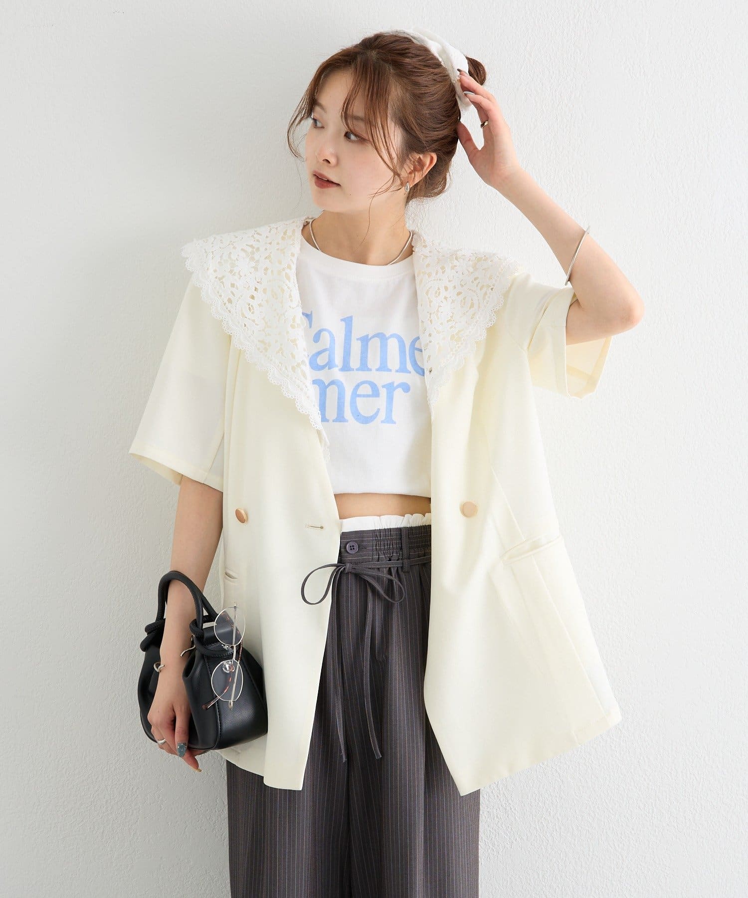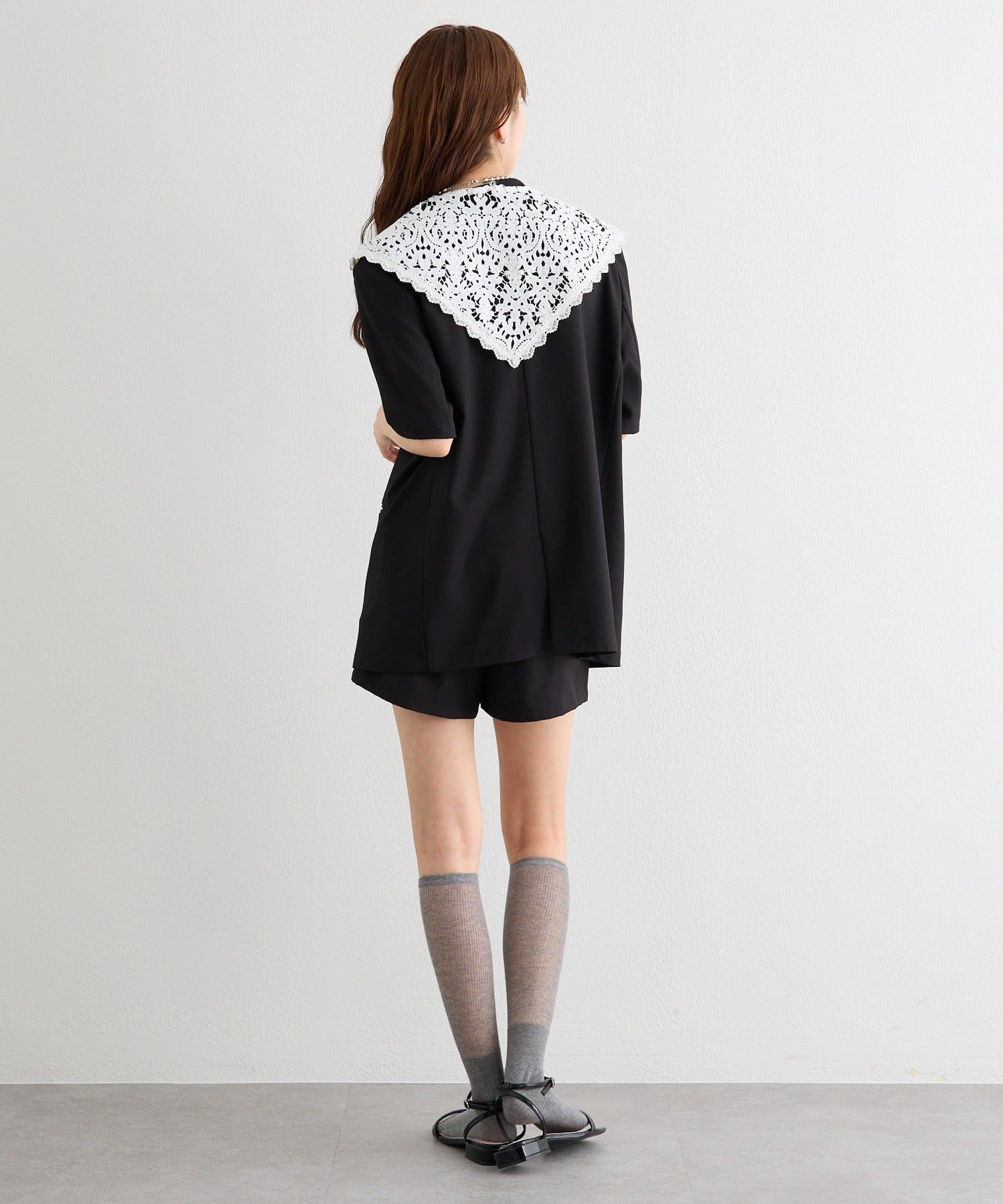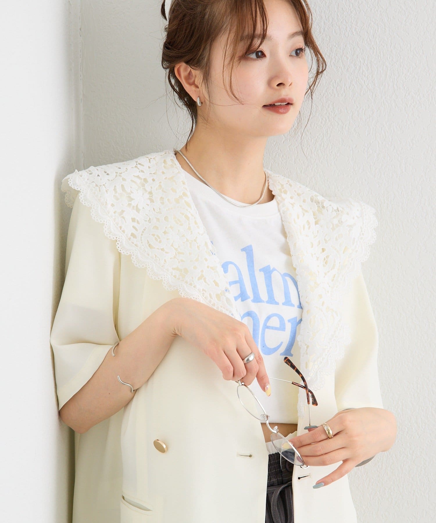 レースの付け襟でクラシカルも抜け感も叶う半袖ジャケット