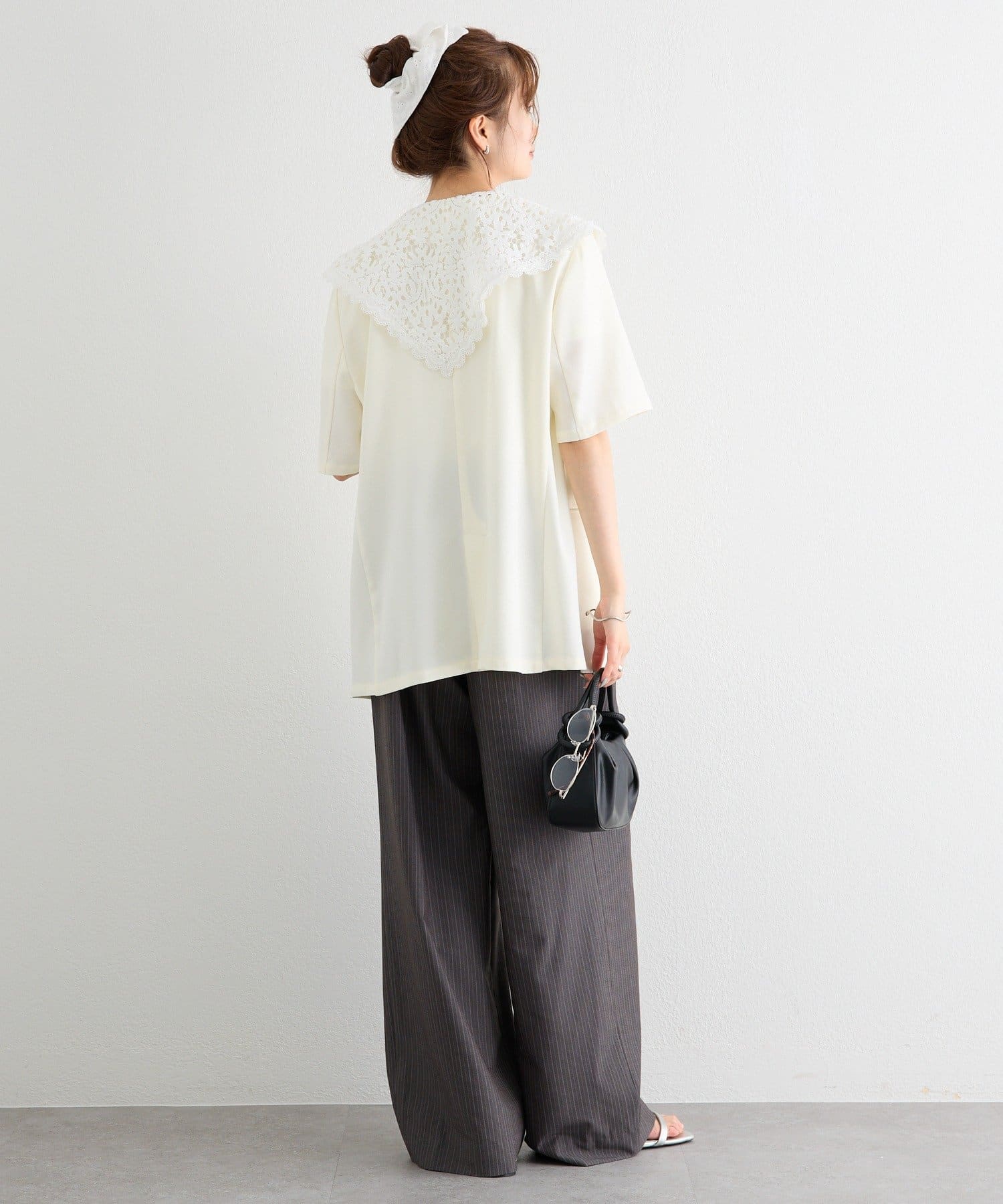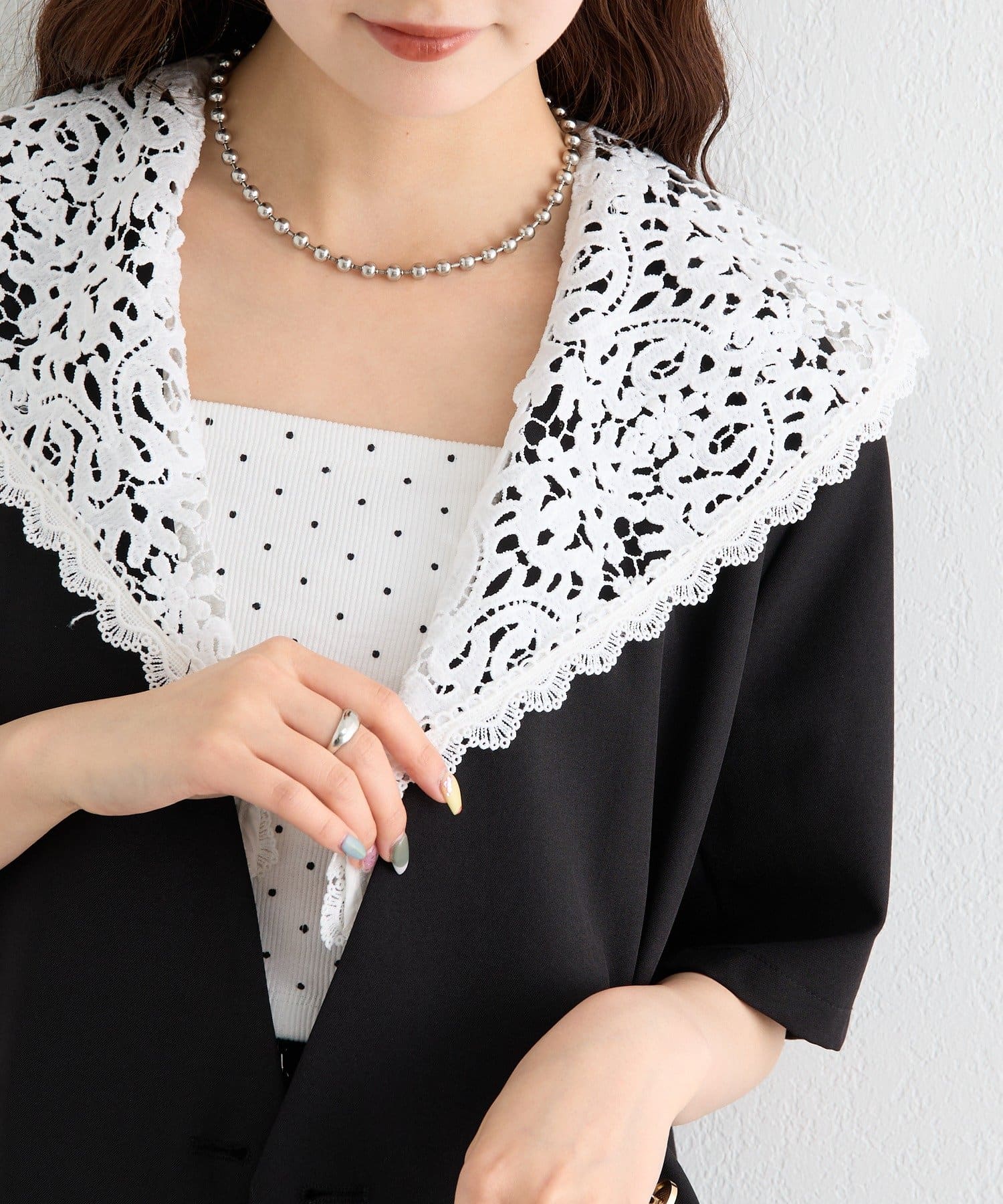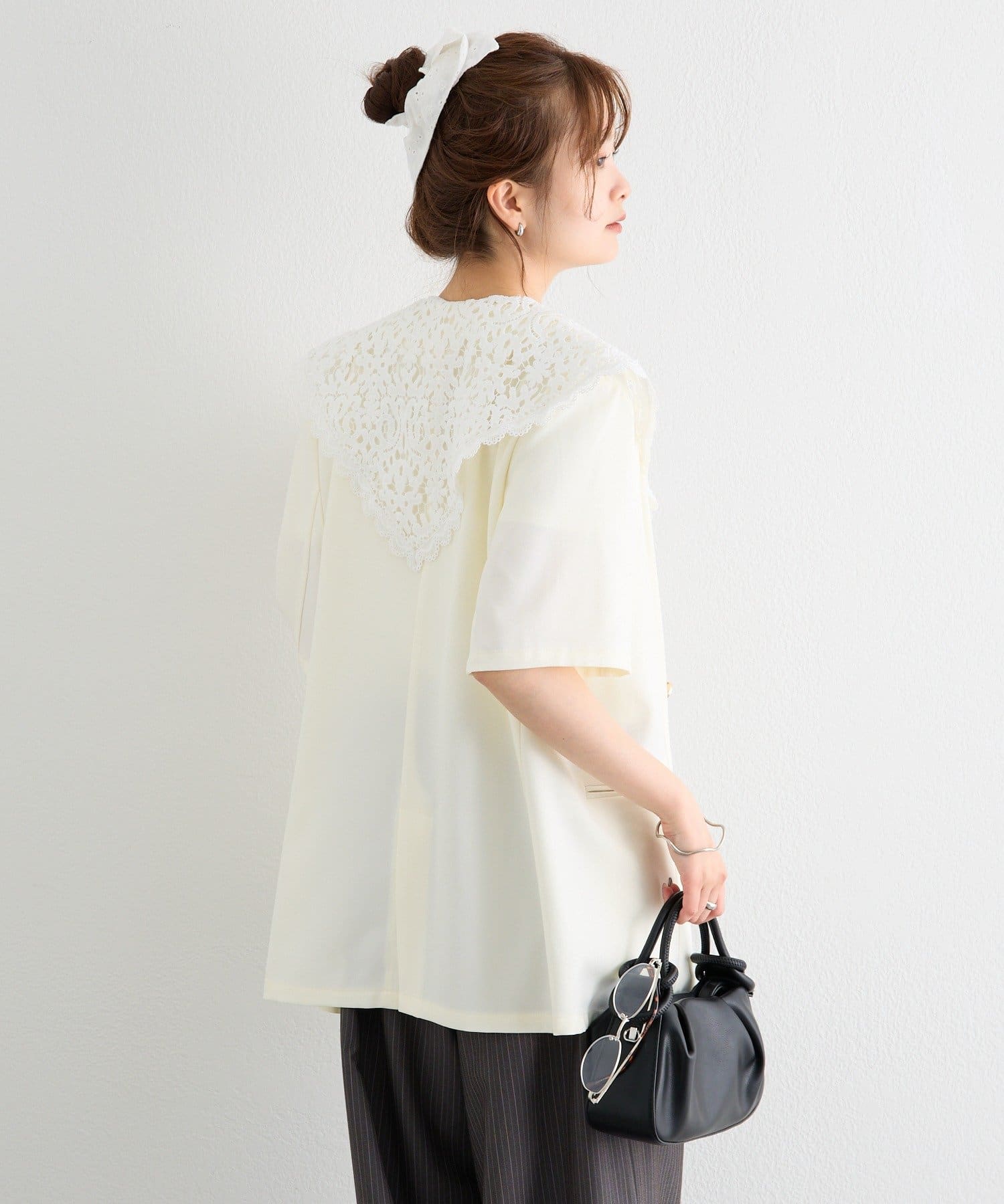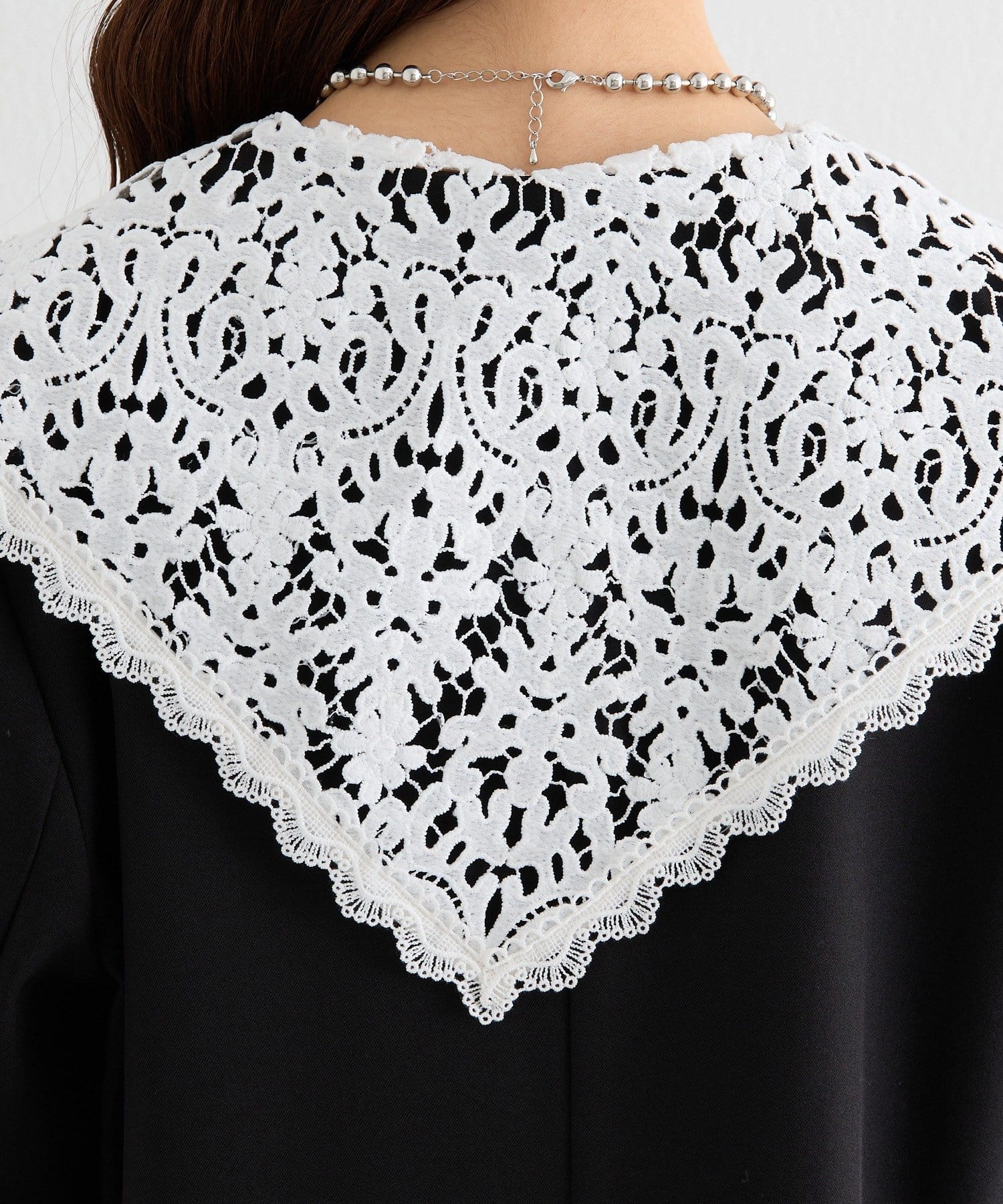 ・クラシカルなレースディティールが顔周りを華やかに見せつつ、外せばシンプルでミニマルな印象にも。