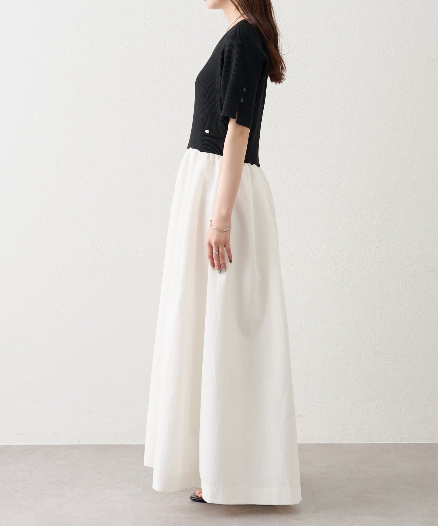 ・スカート部分はふんわりしていますが、トップス部分が薄手のニット素材で首元も開いており、デコルテがキレイに見えるシルエットです。