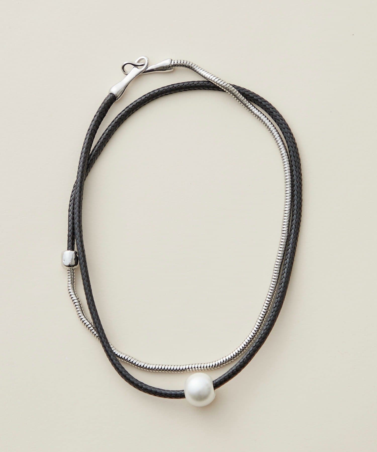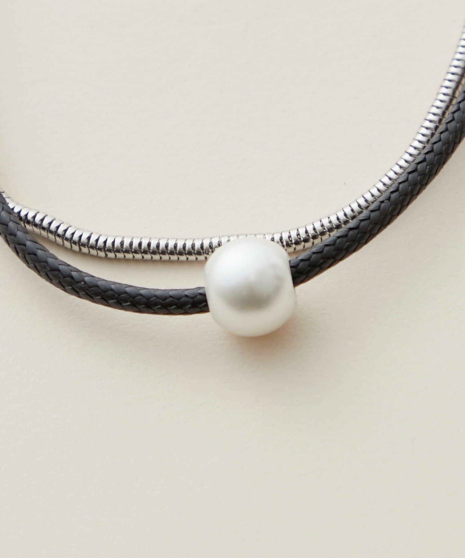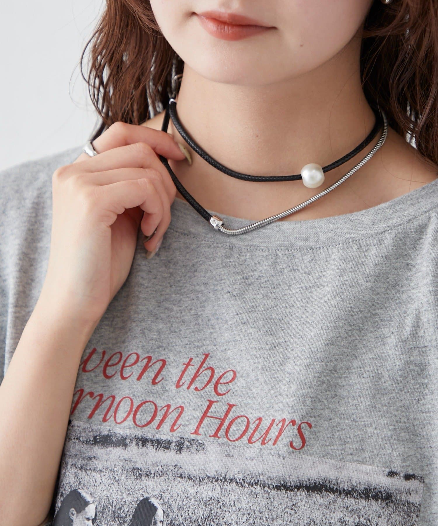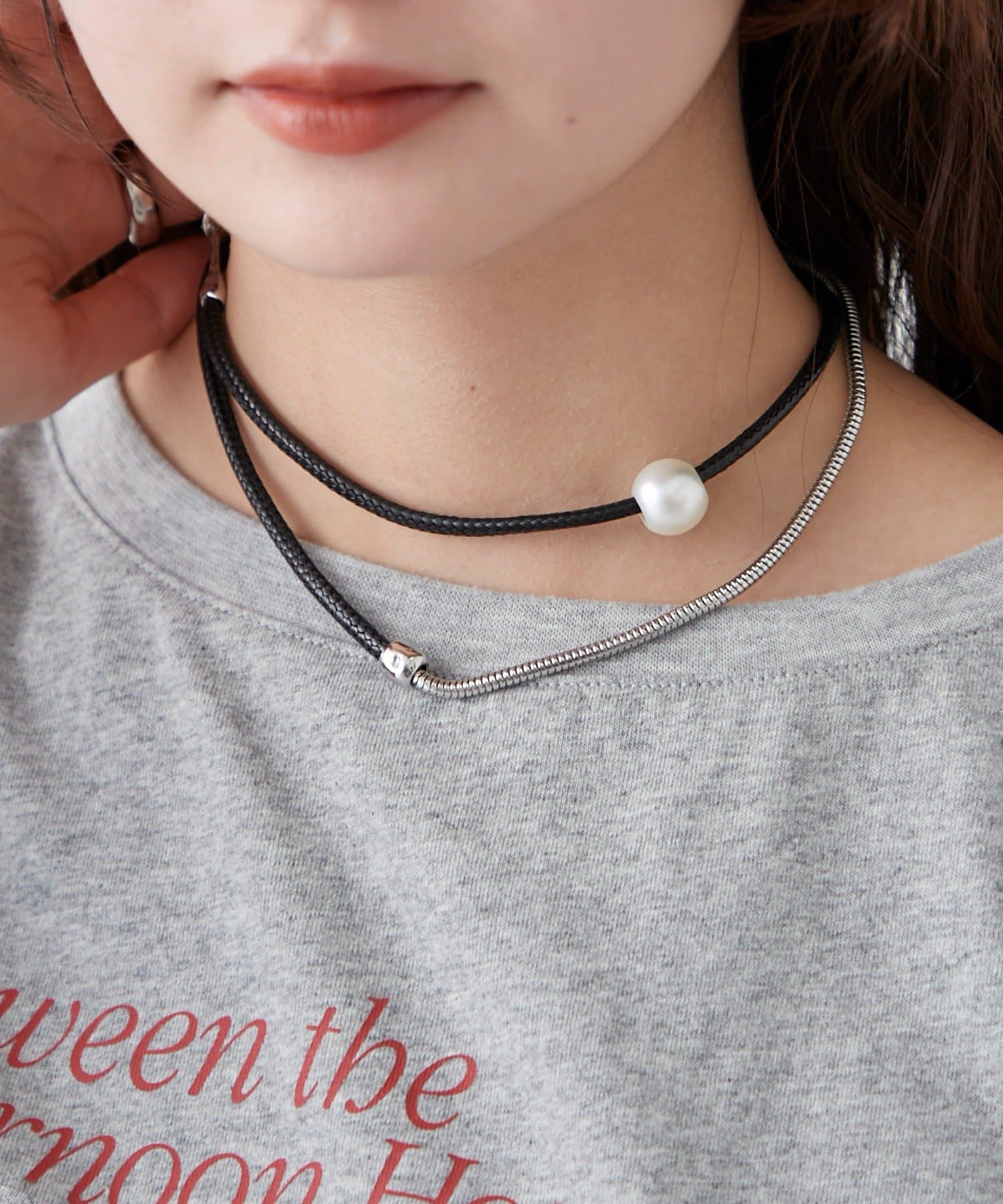 ・上品なパール調ネックレスと、スタイリッシュなチェーンネックレスが組み合わさったデザイン。