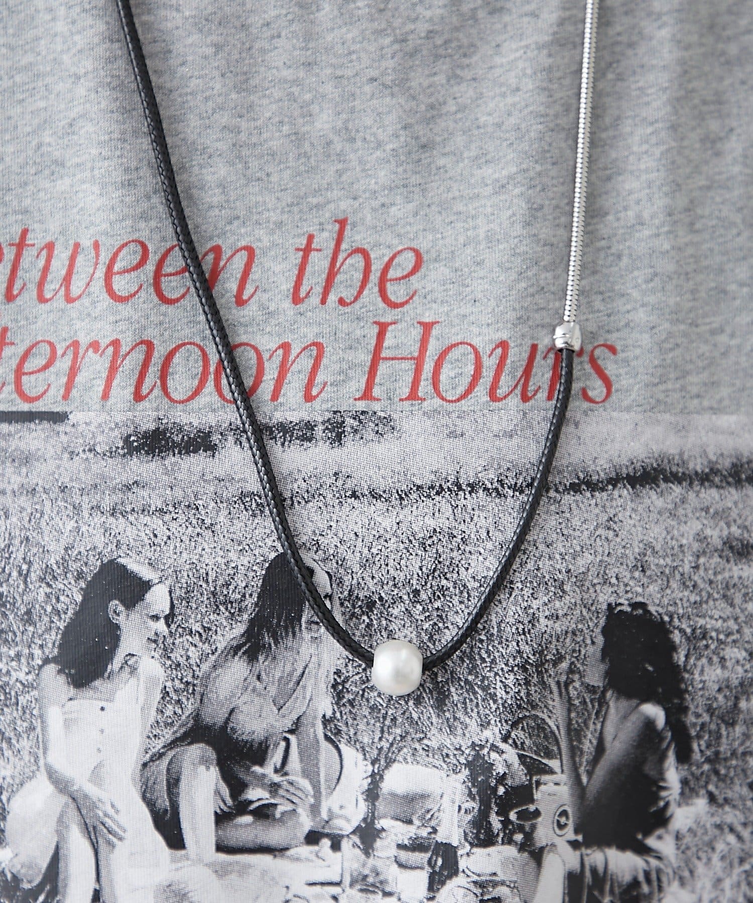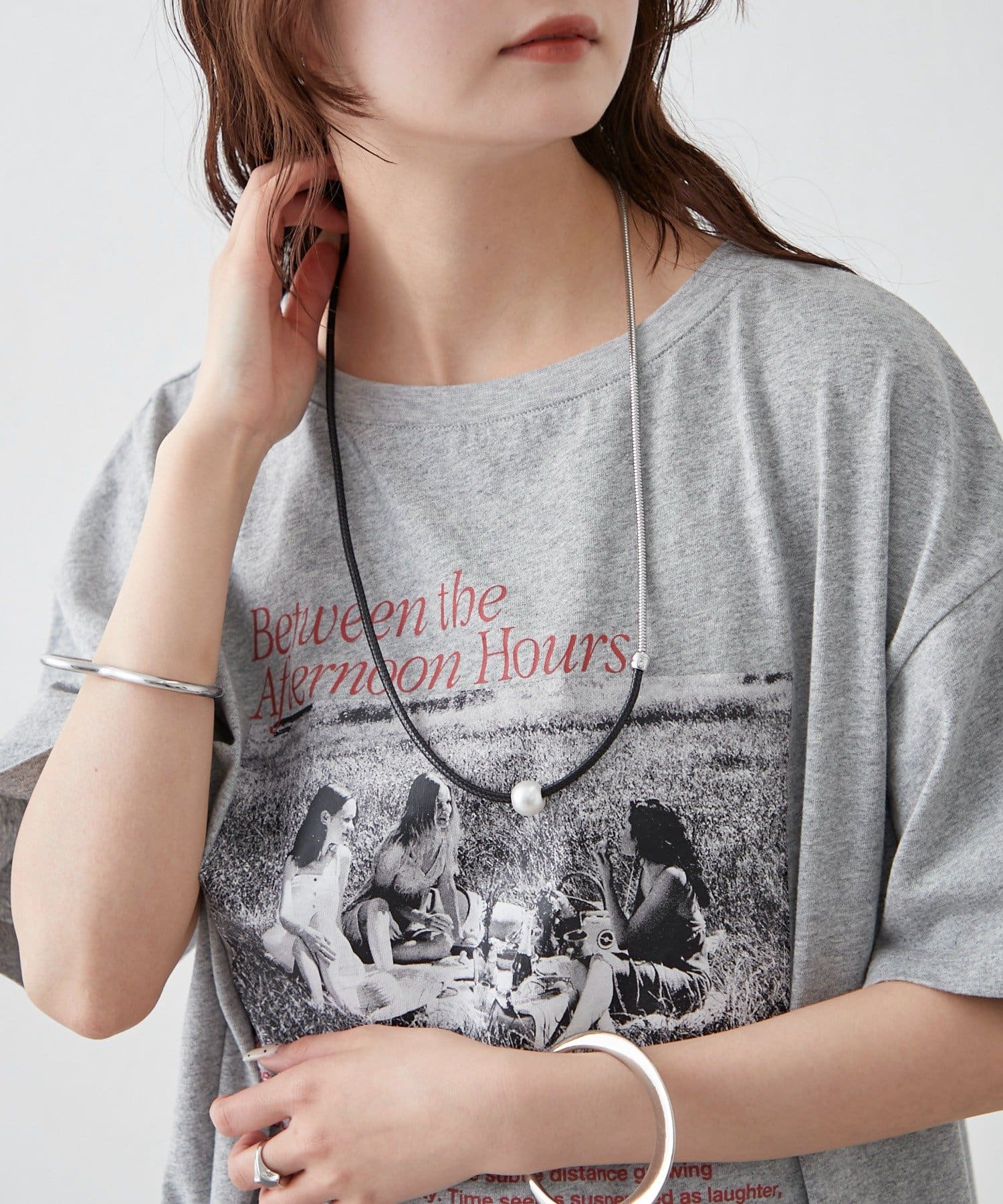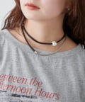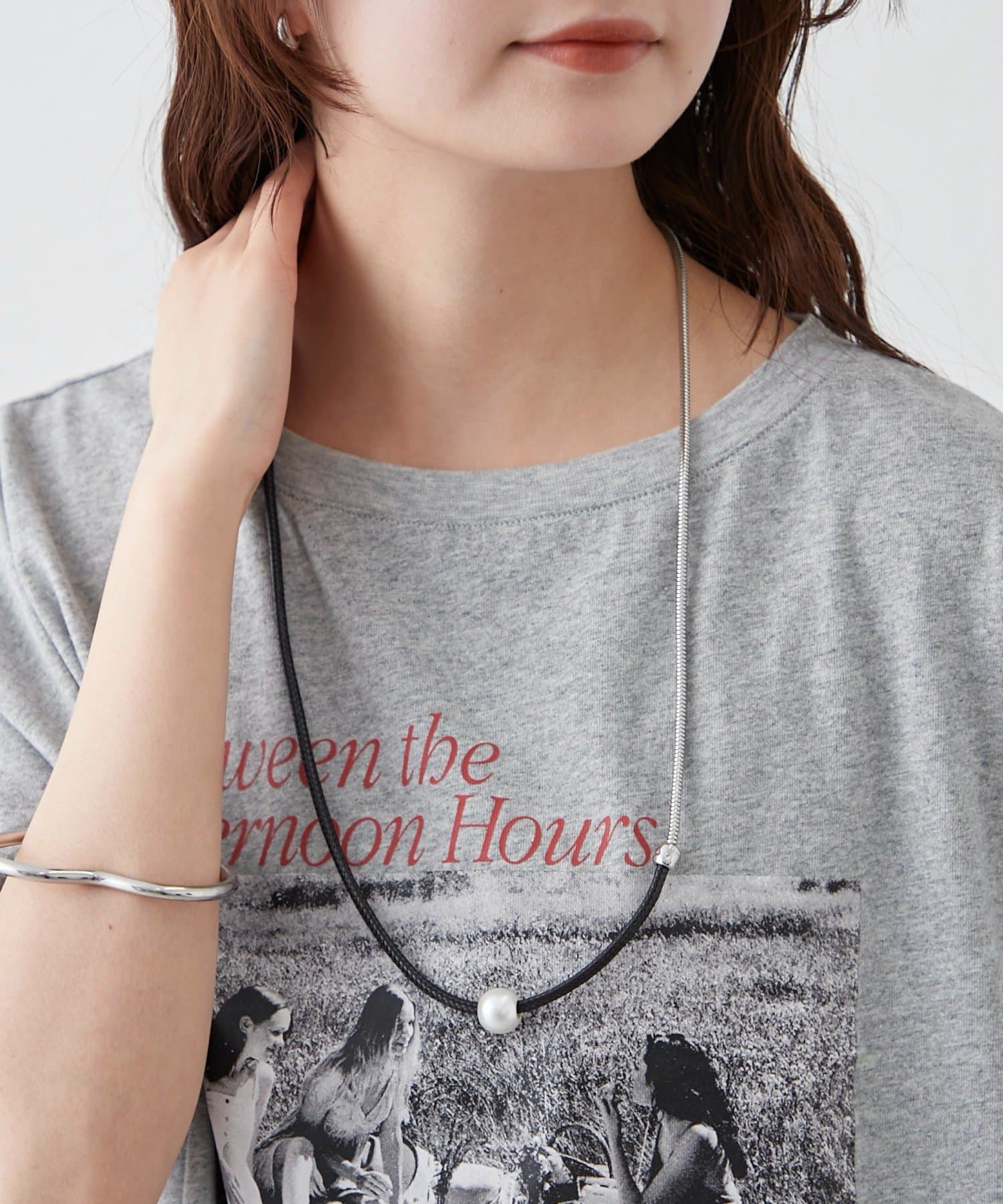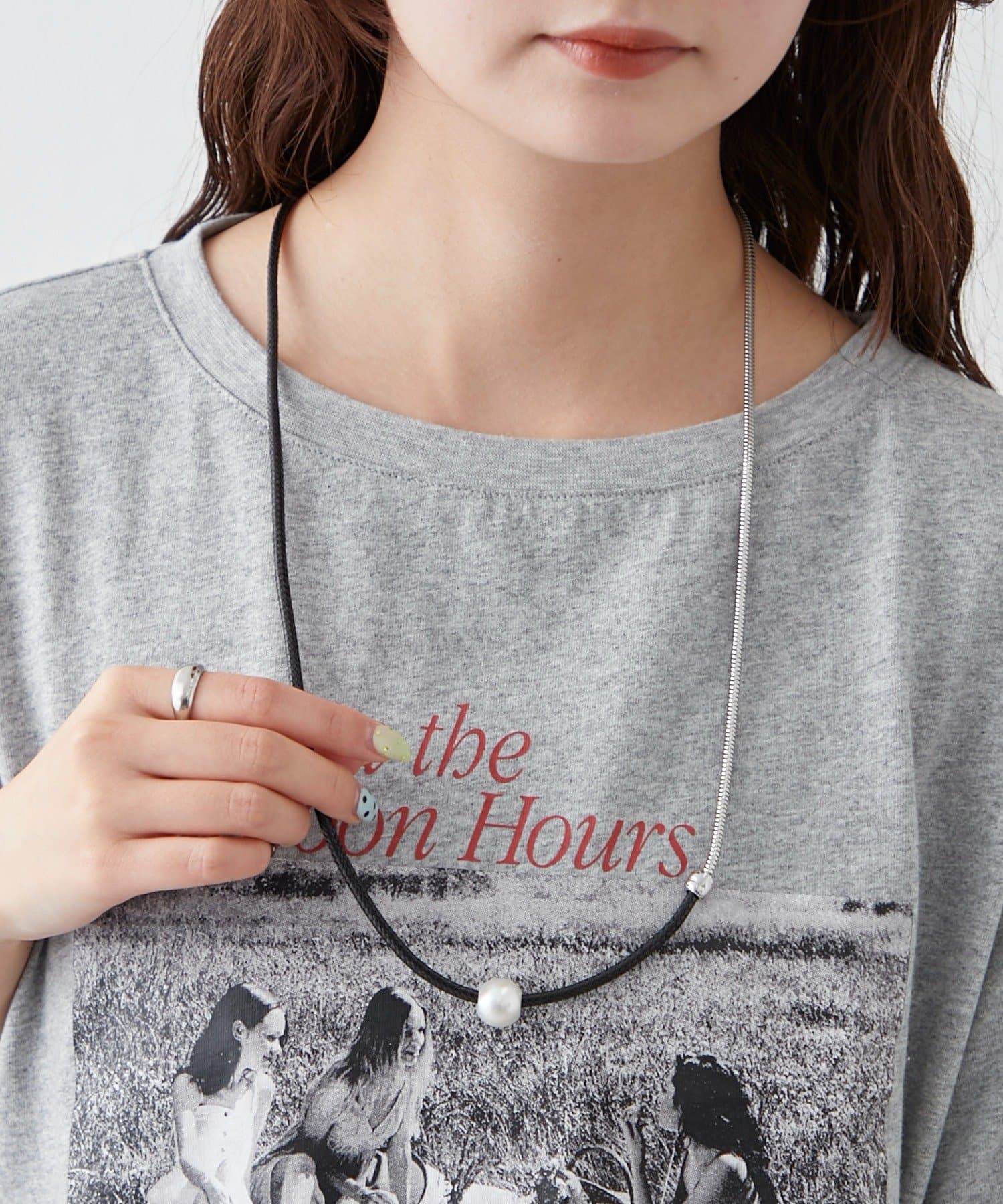 ・上品なパール調ネックレスと、スタイリッシュなチェーンネックレスが組み合わさったデザイン。