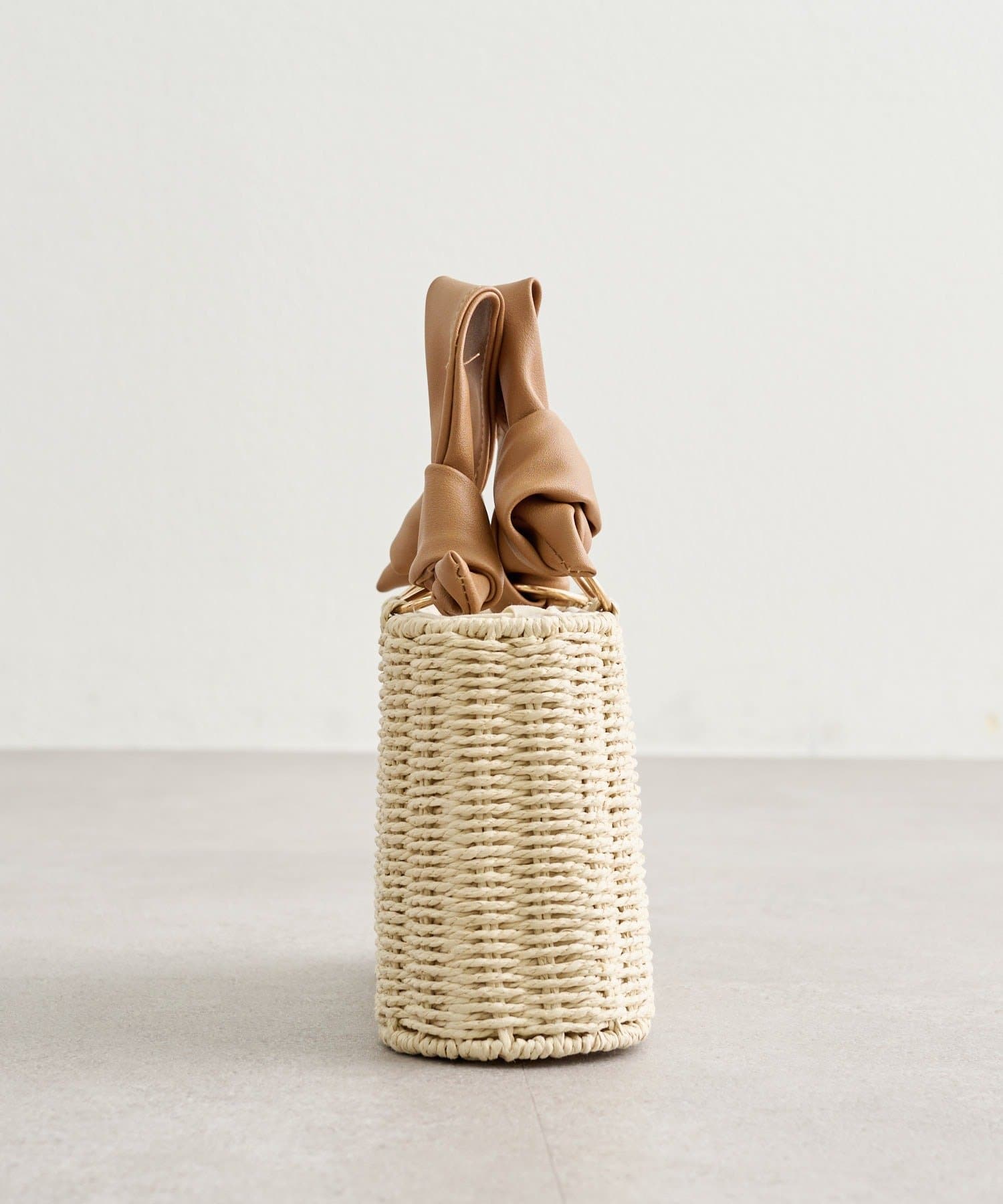 ナチュラルな風合いが魅力的で、持ち手の結び目デザインがアクセントに。