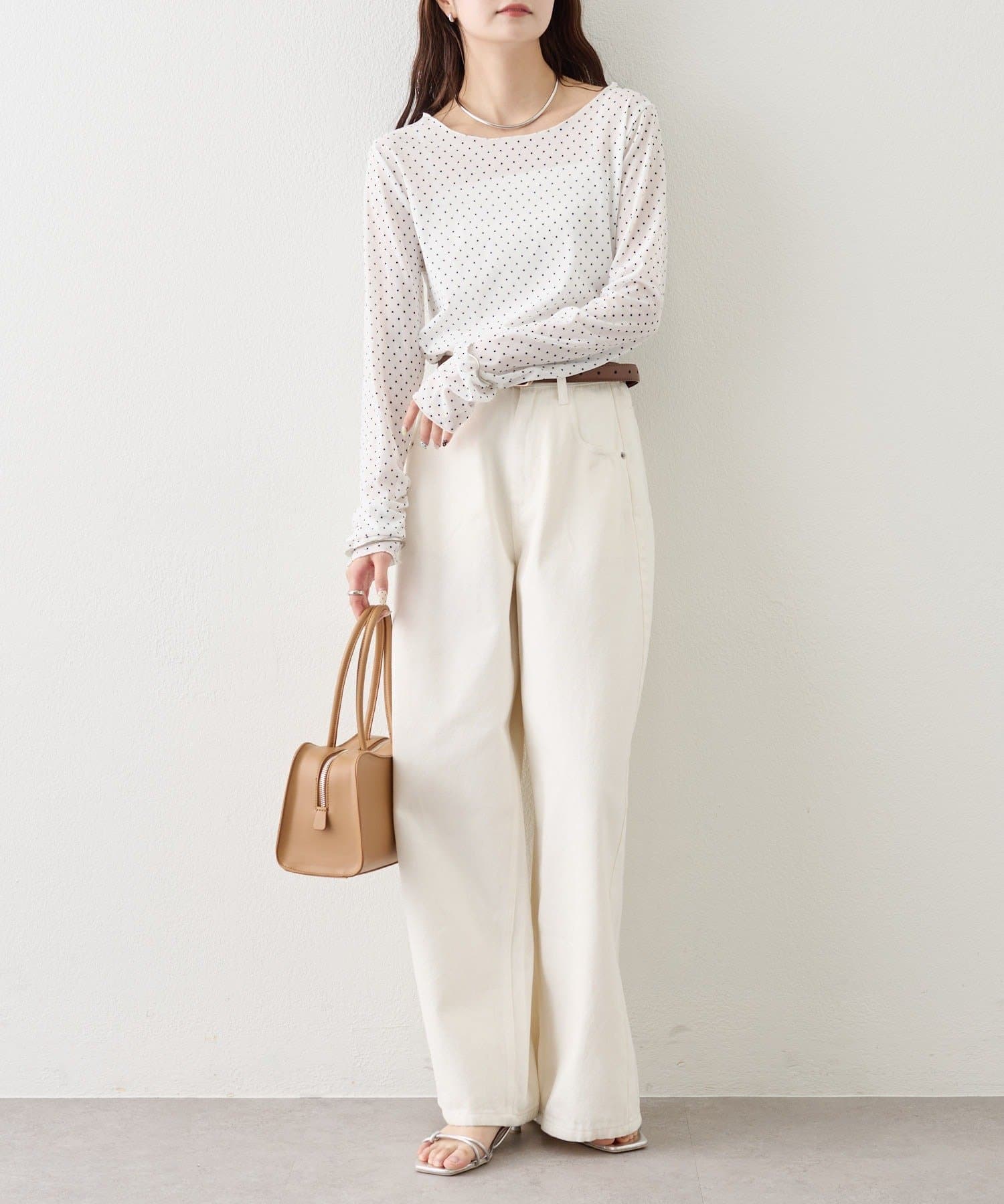 ・コンパクトなトップスを合わせて、シルエットを引き立てた着こなしに。