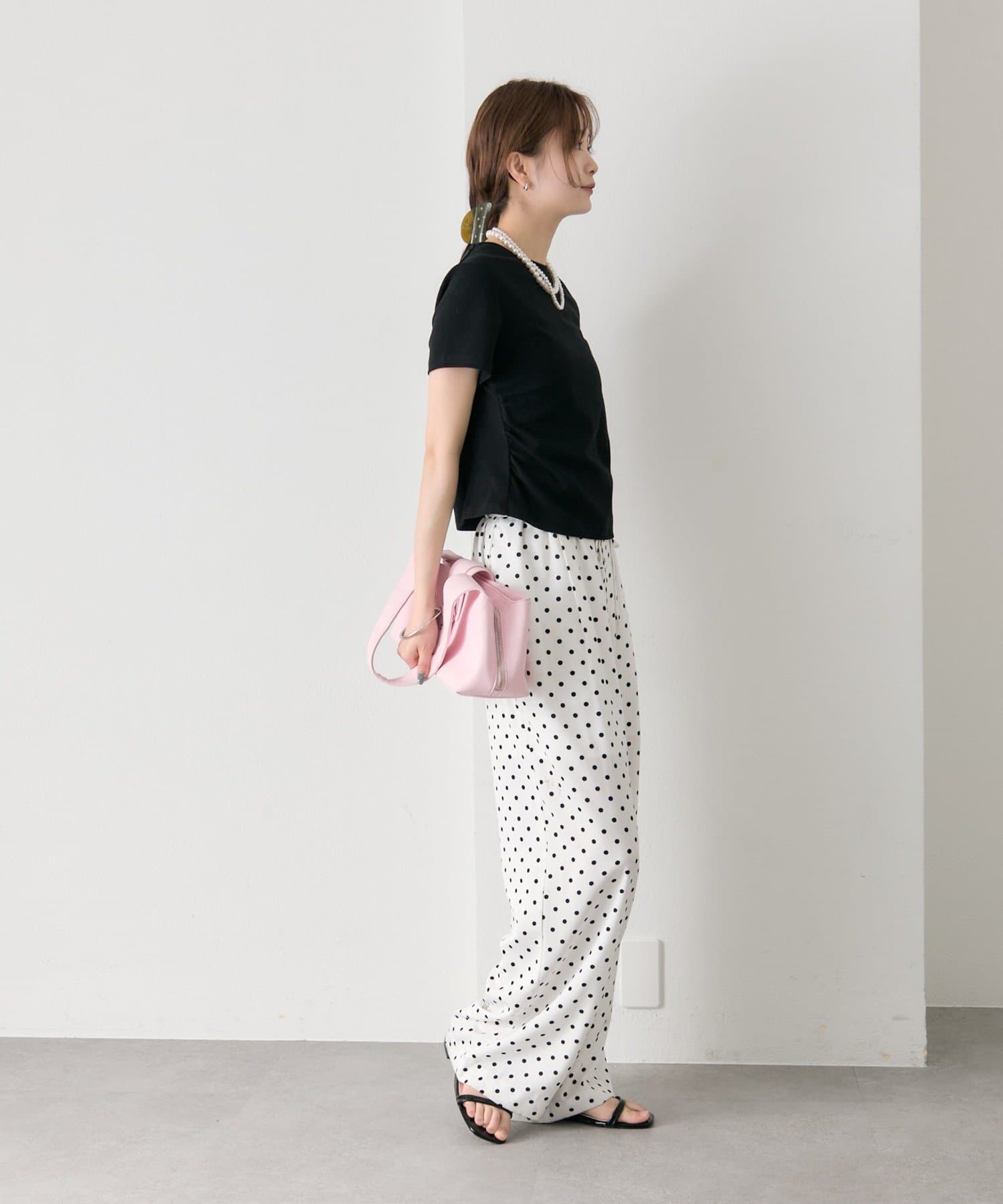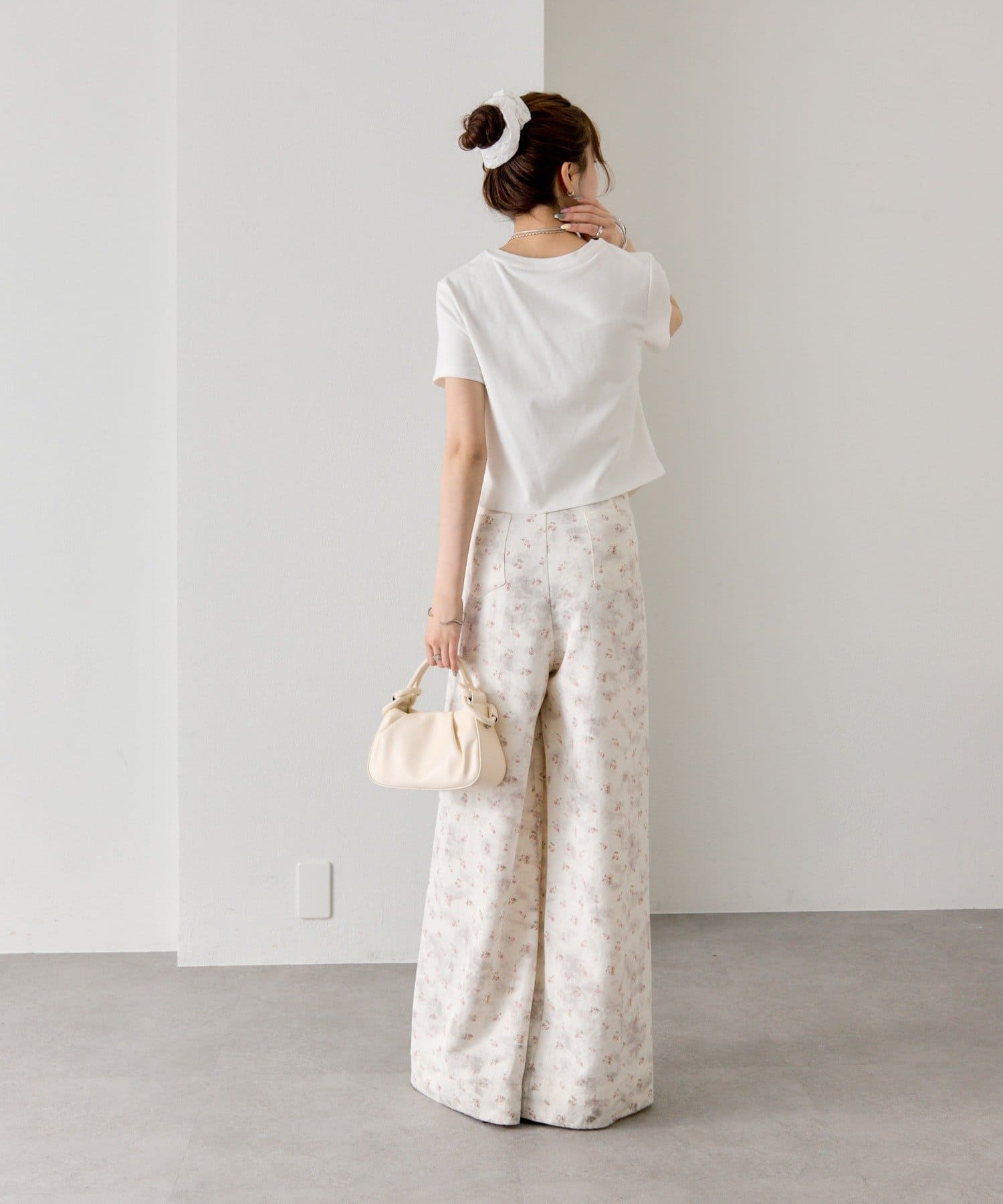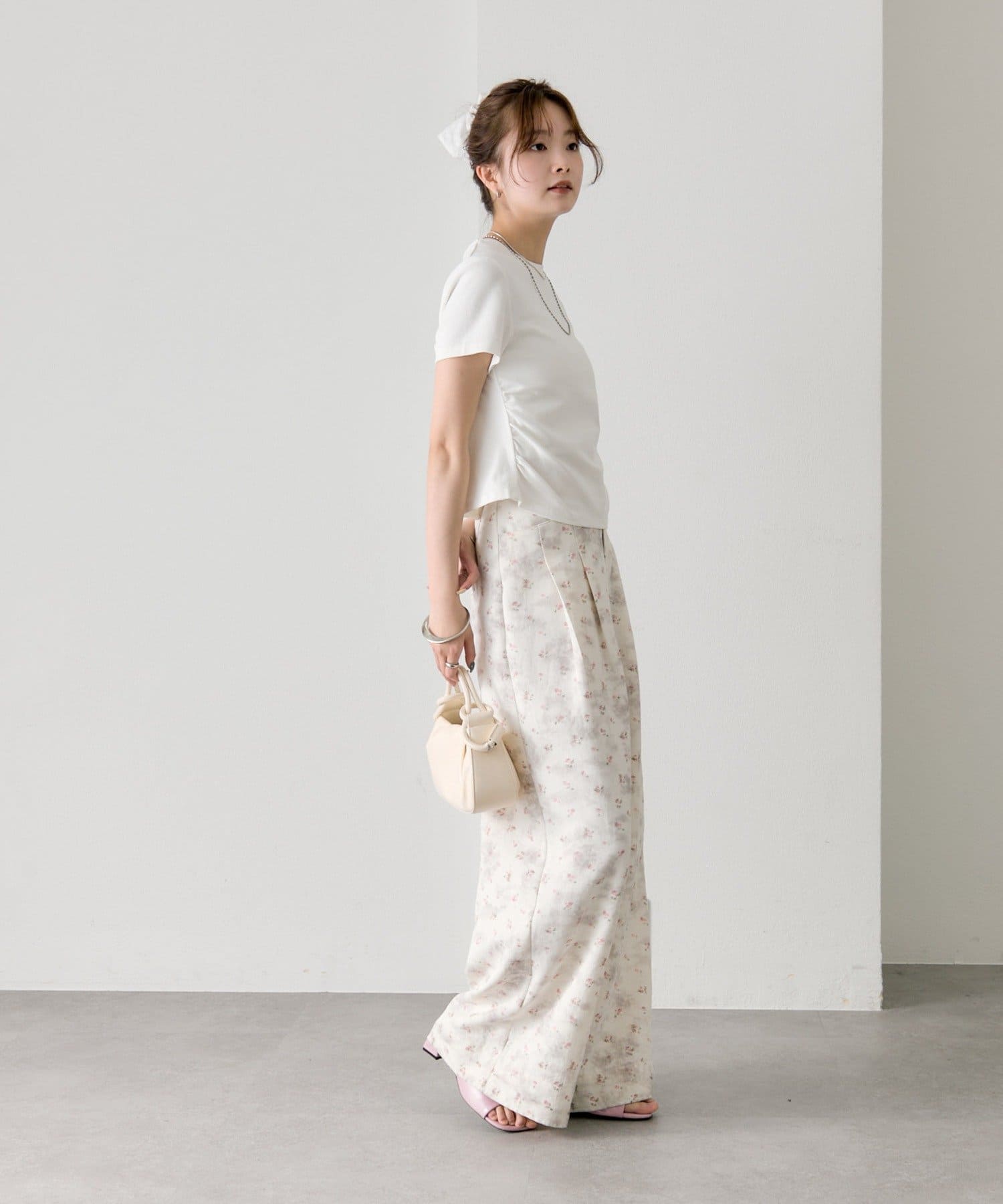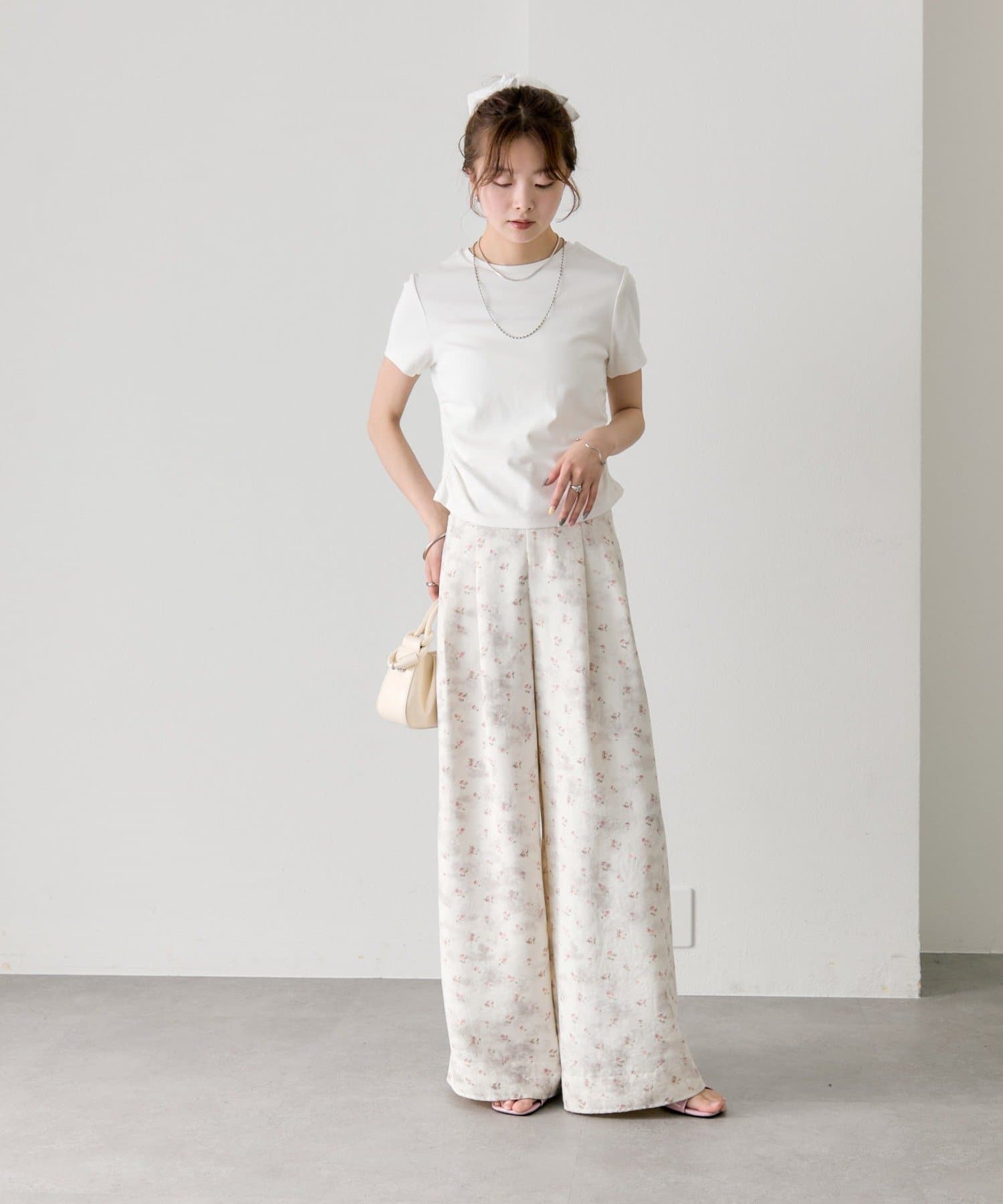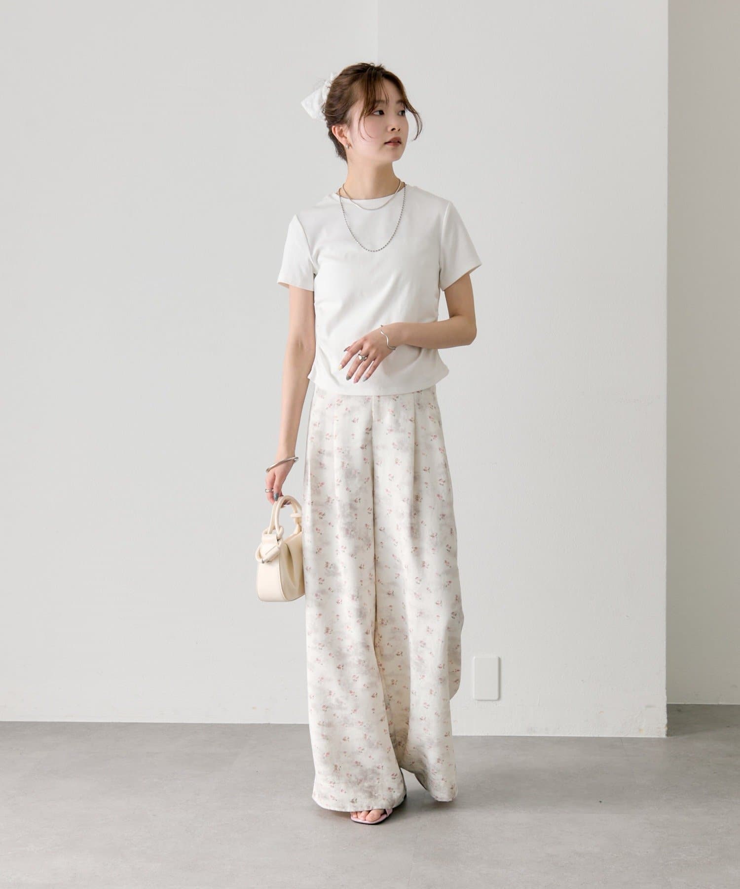 ・ワイドパンツを合わせて、メリハリのあるスタイリングに。