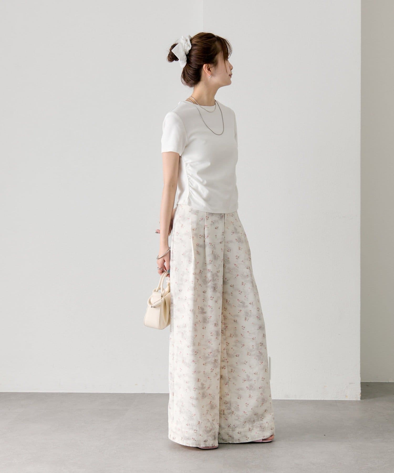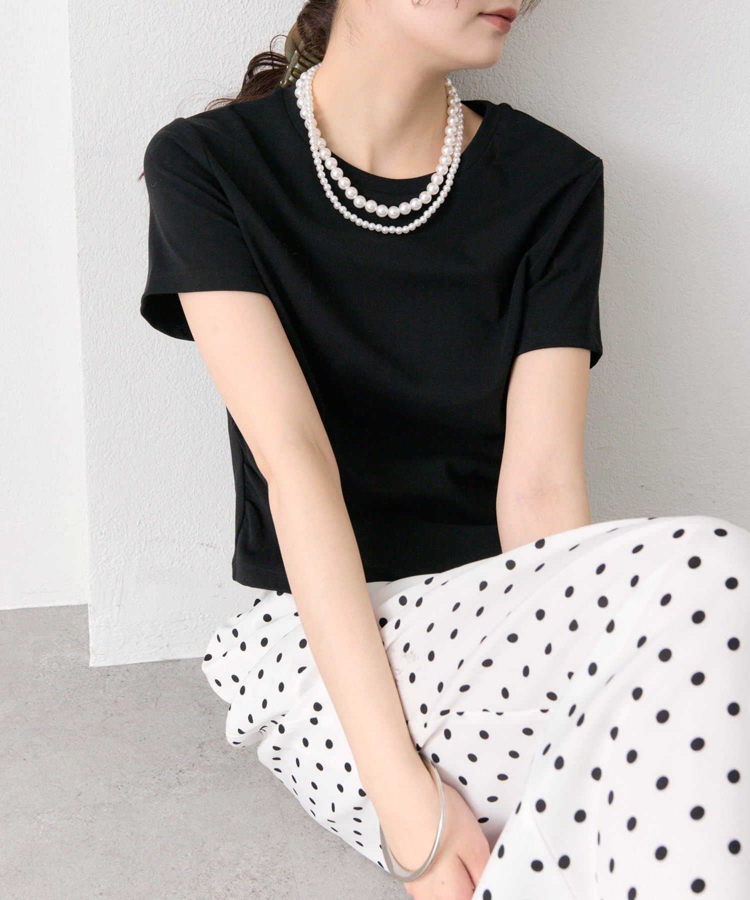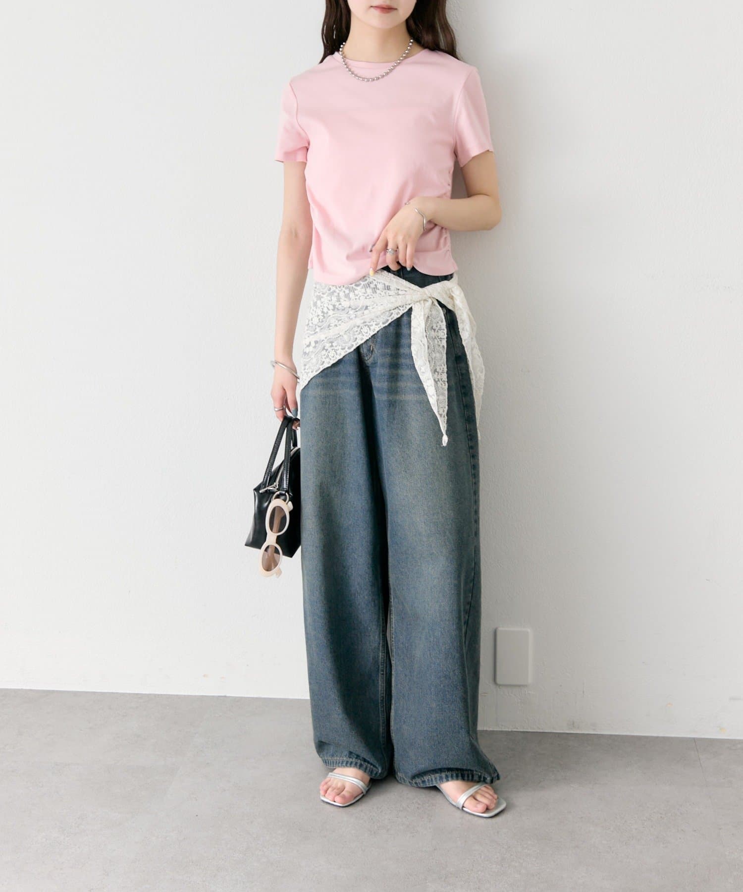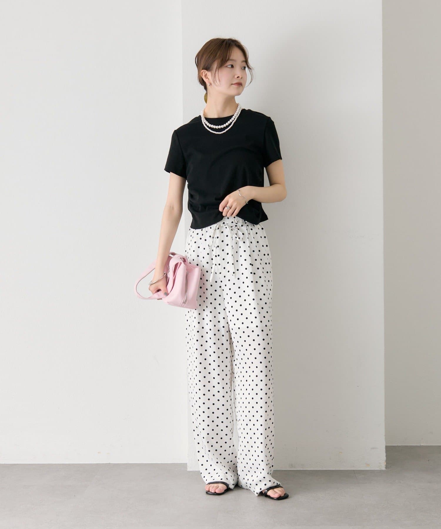 ・ワイドパンツを合わせて、メリハリのあるスタイリングに。