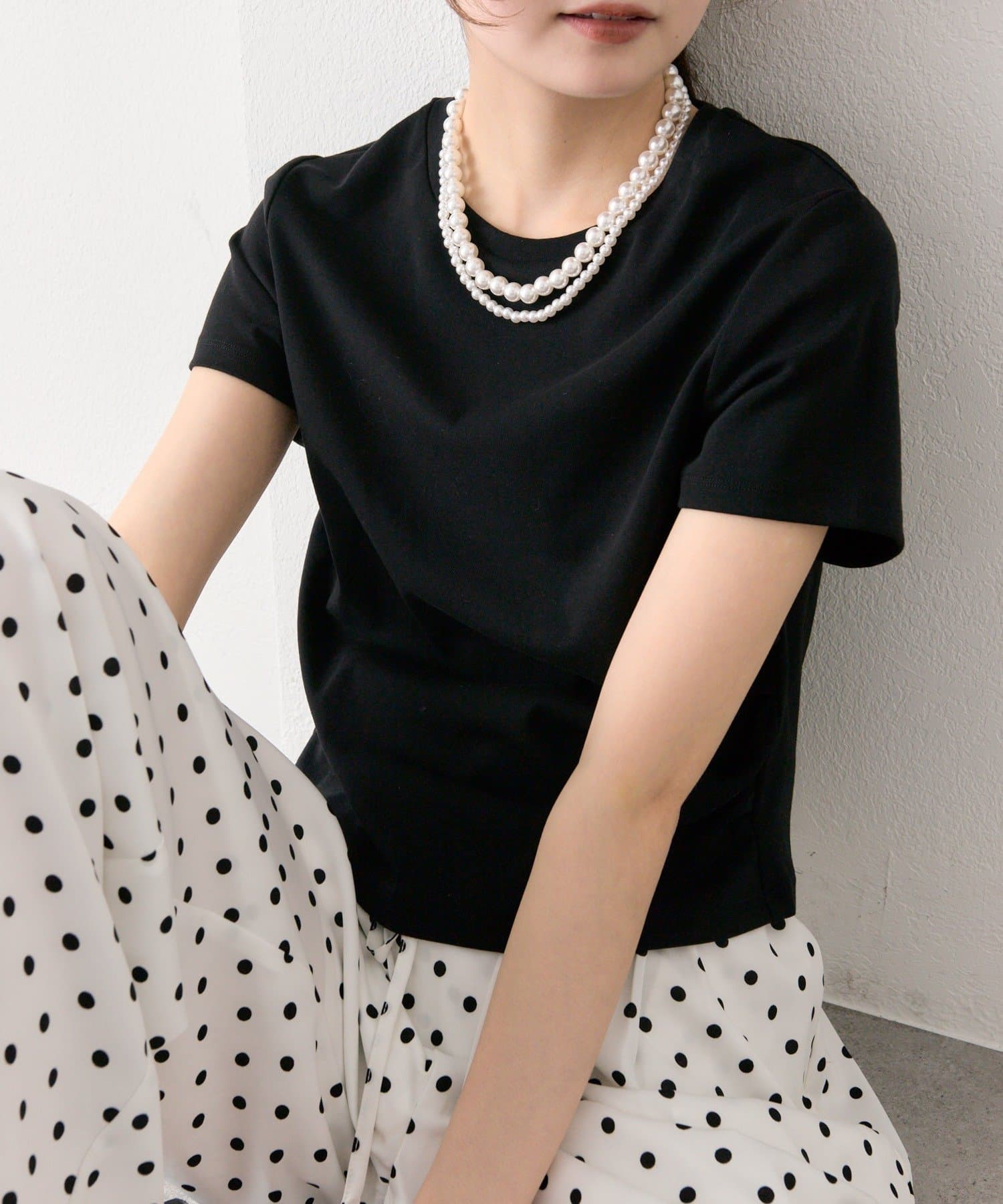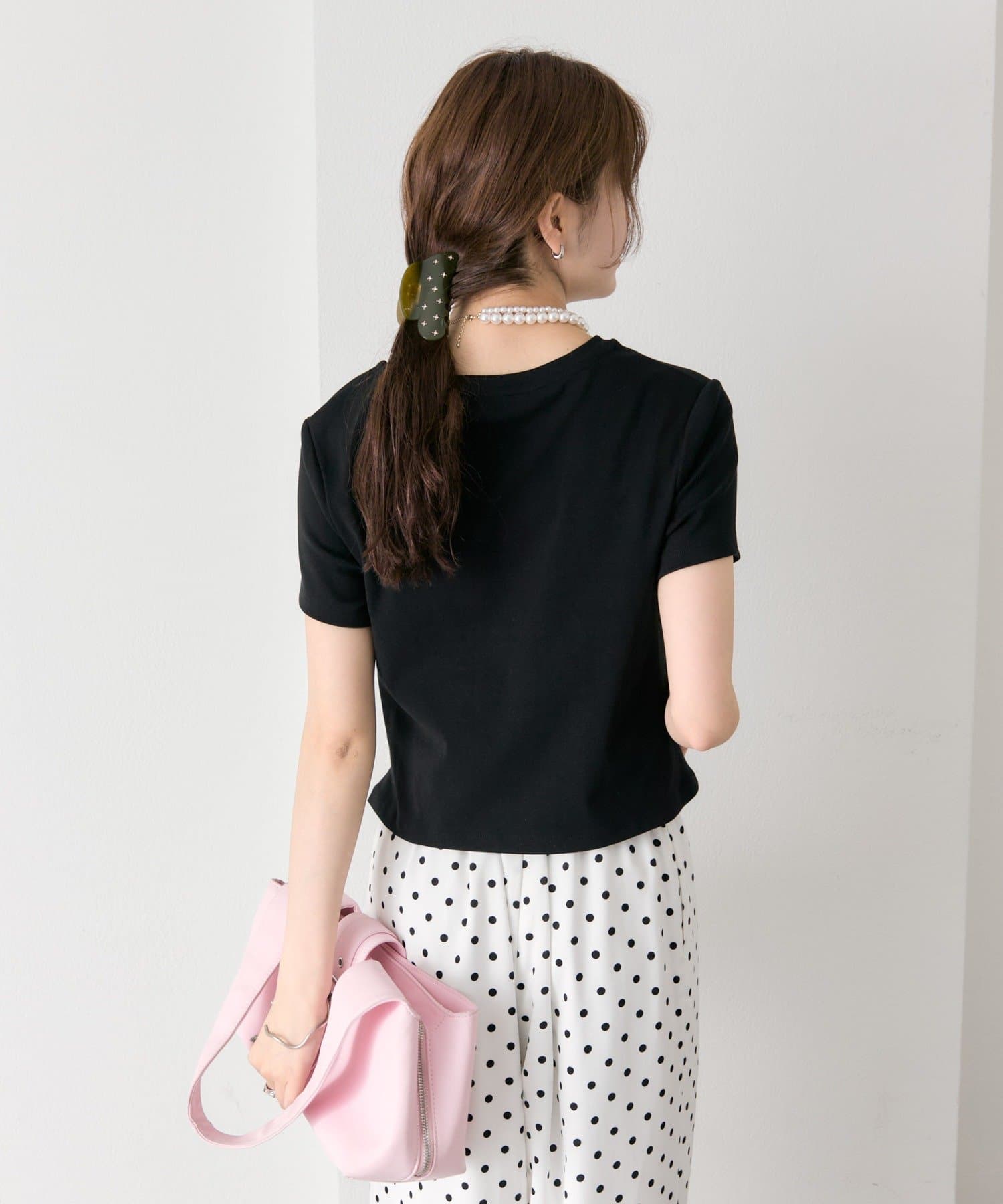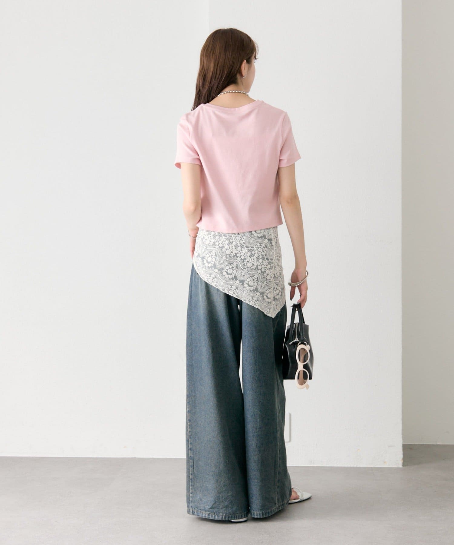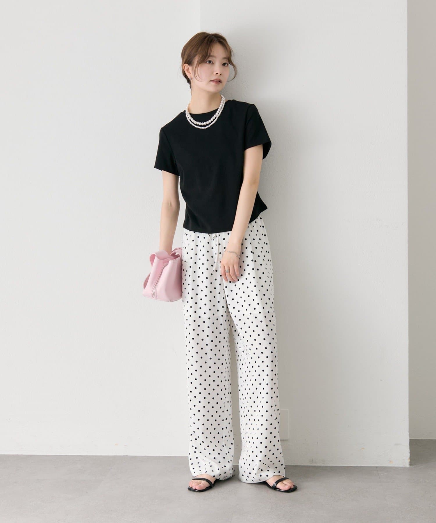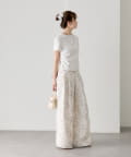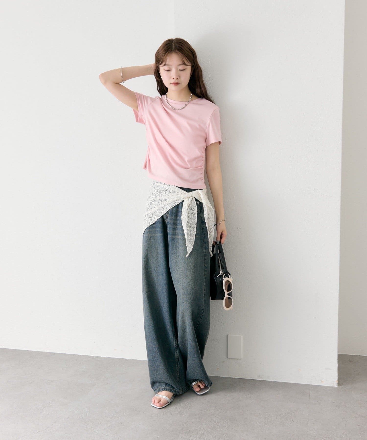 ・ワイドパンツを合わせて、メリハリのあるスタイリングに。