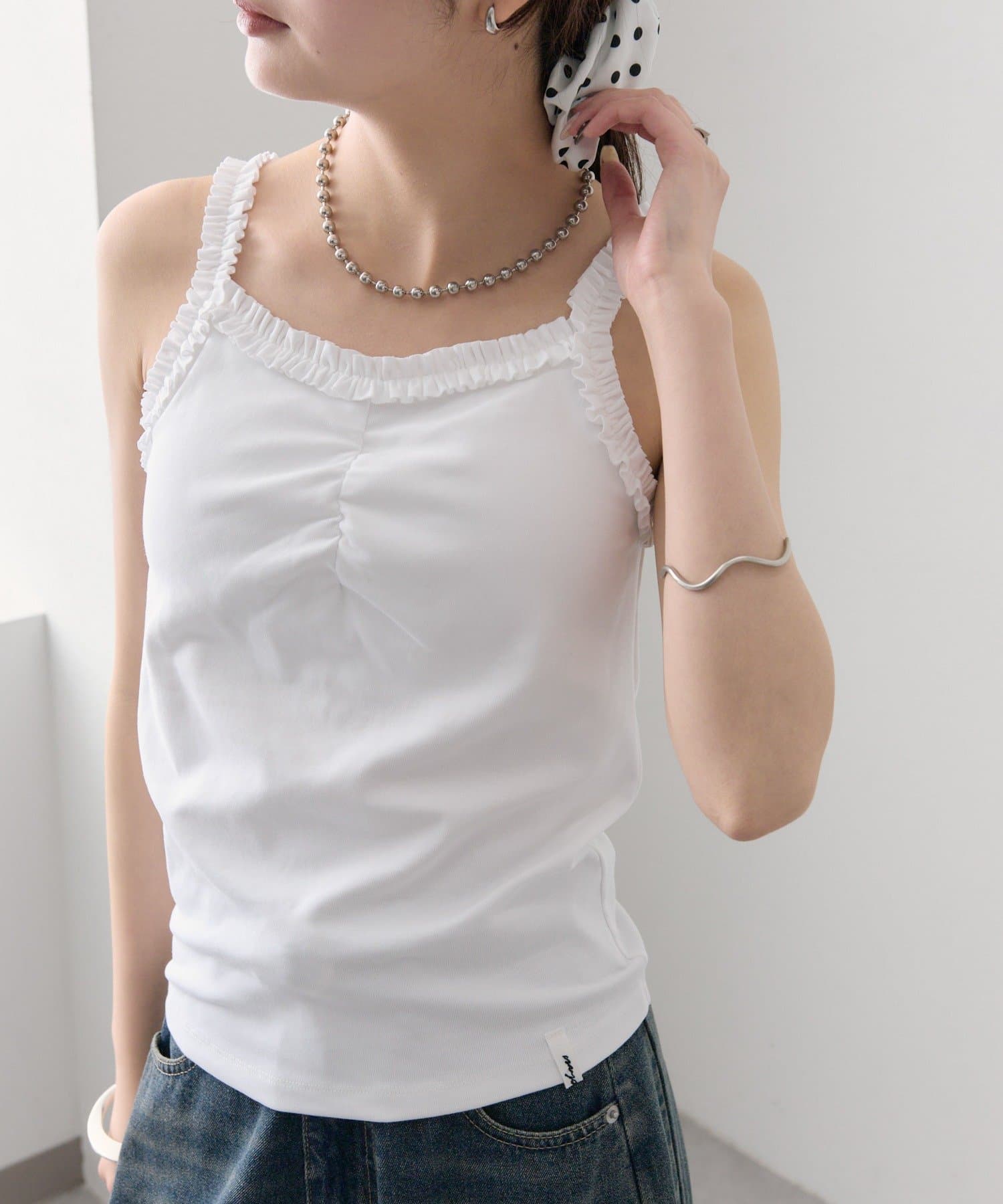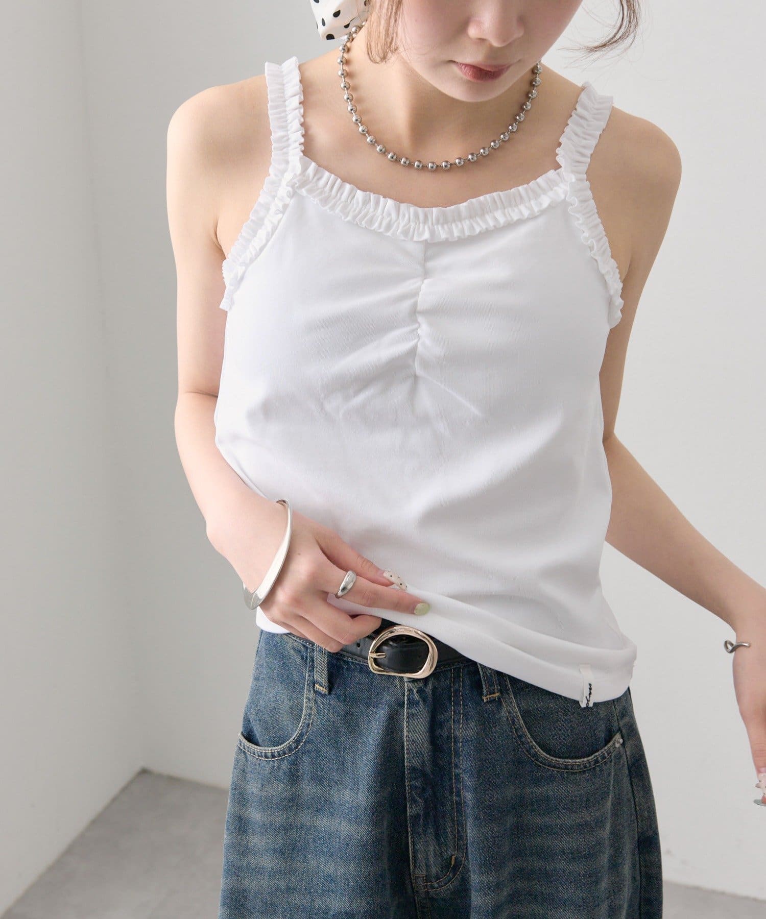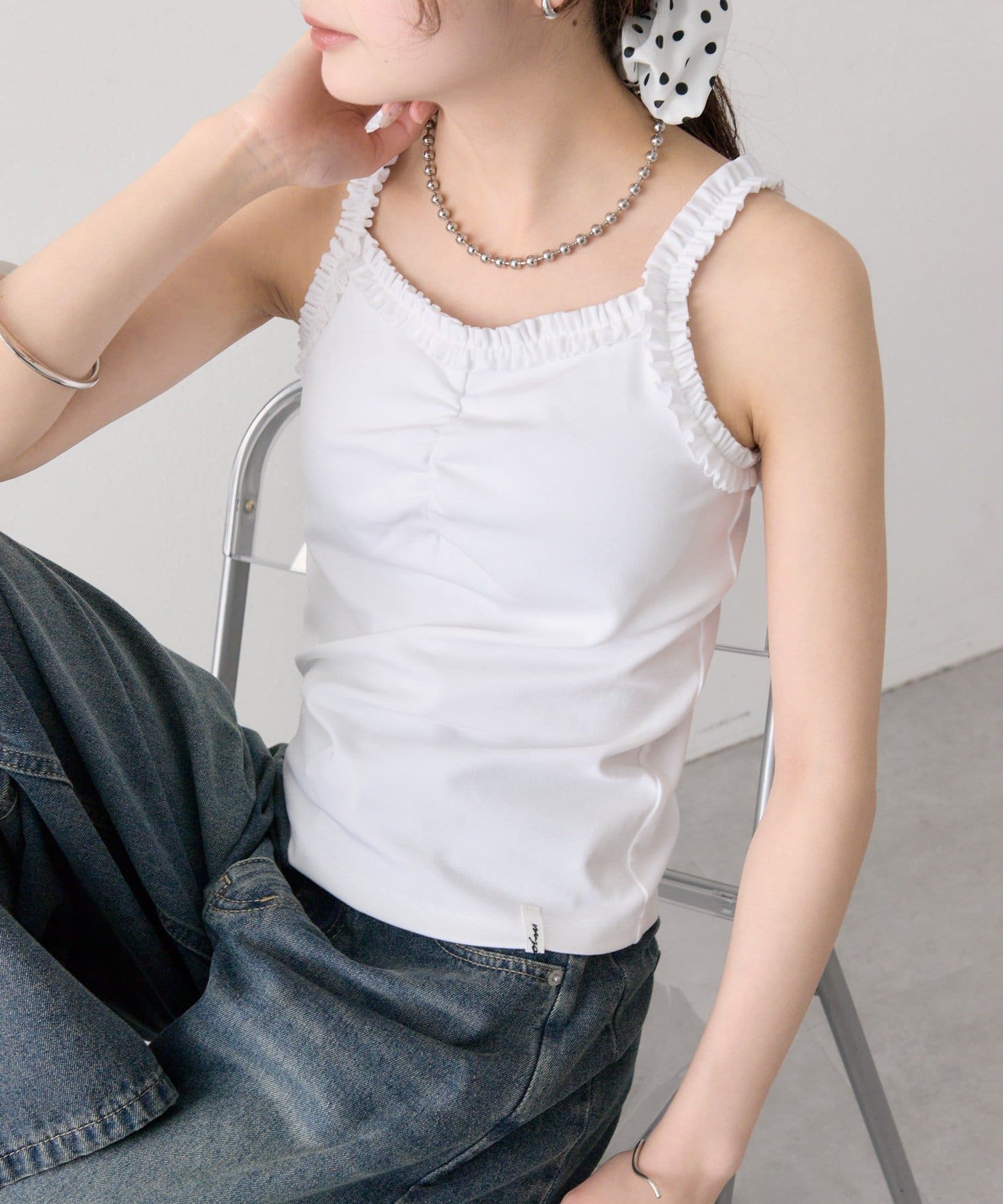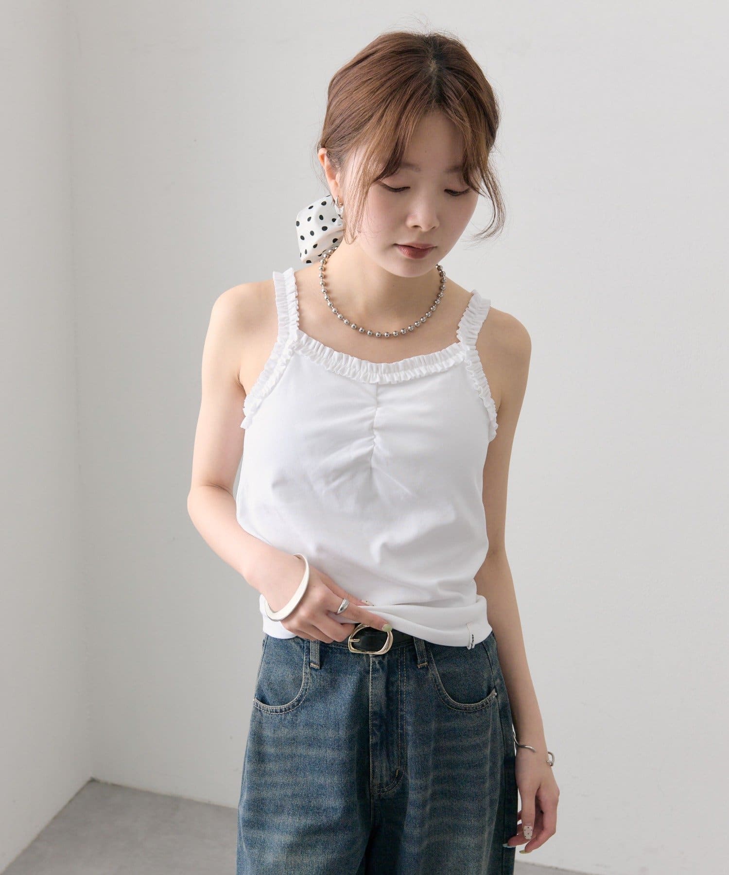 ギャザーフリルで華やかさをプラスするパット付きキャミソール