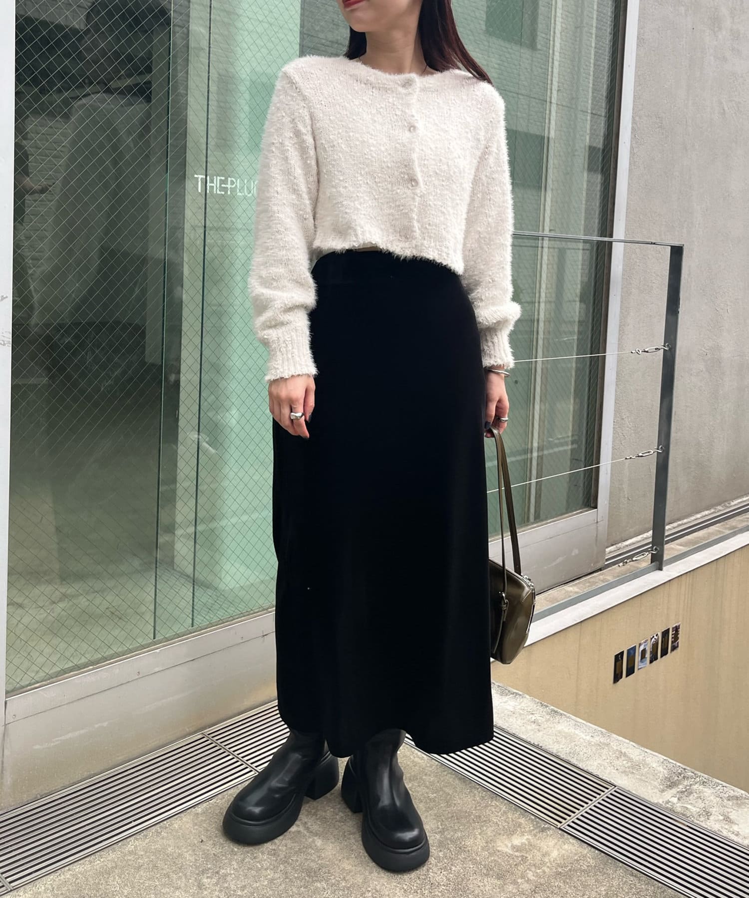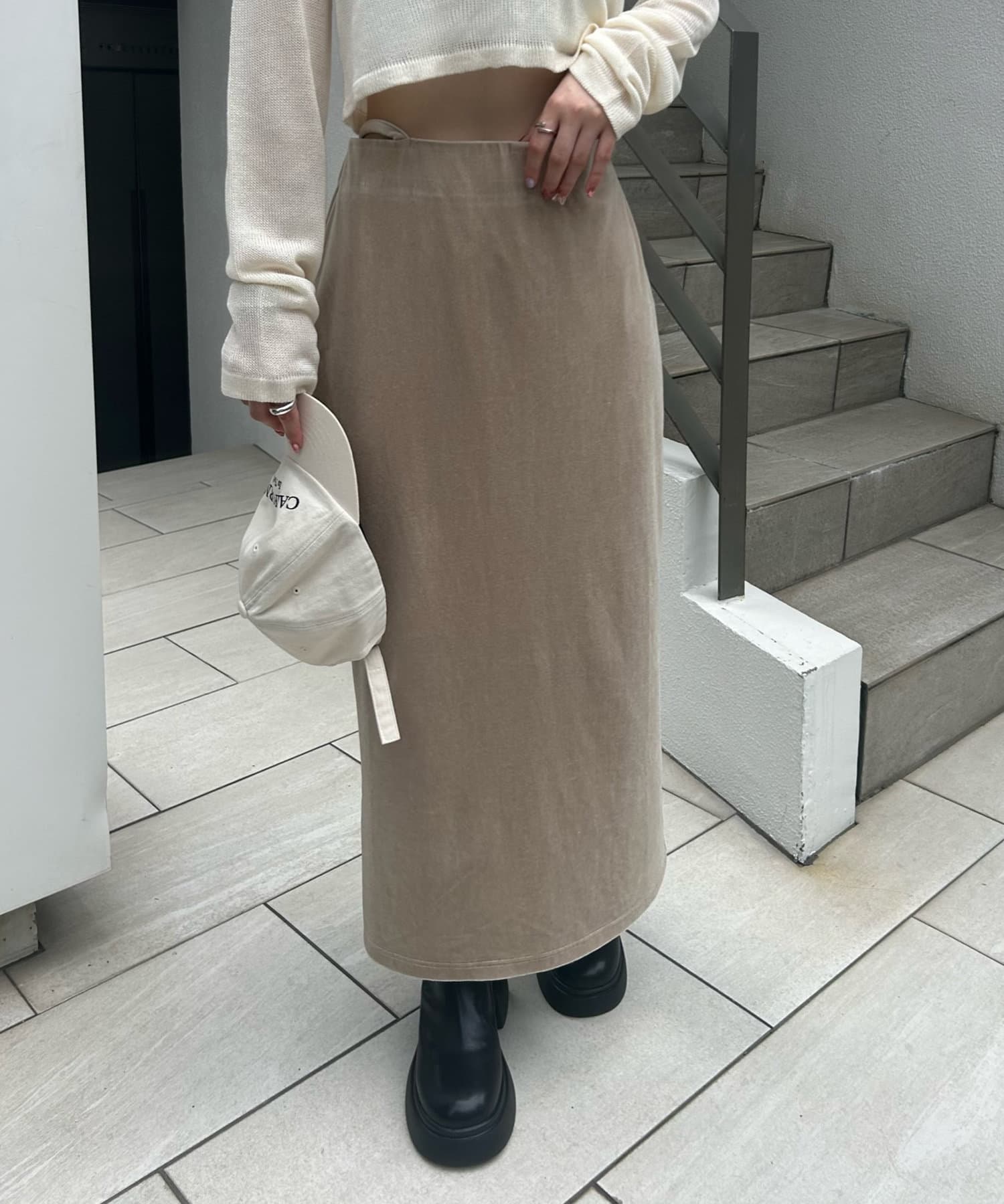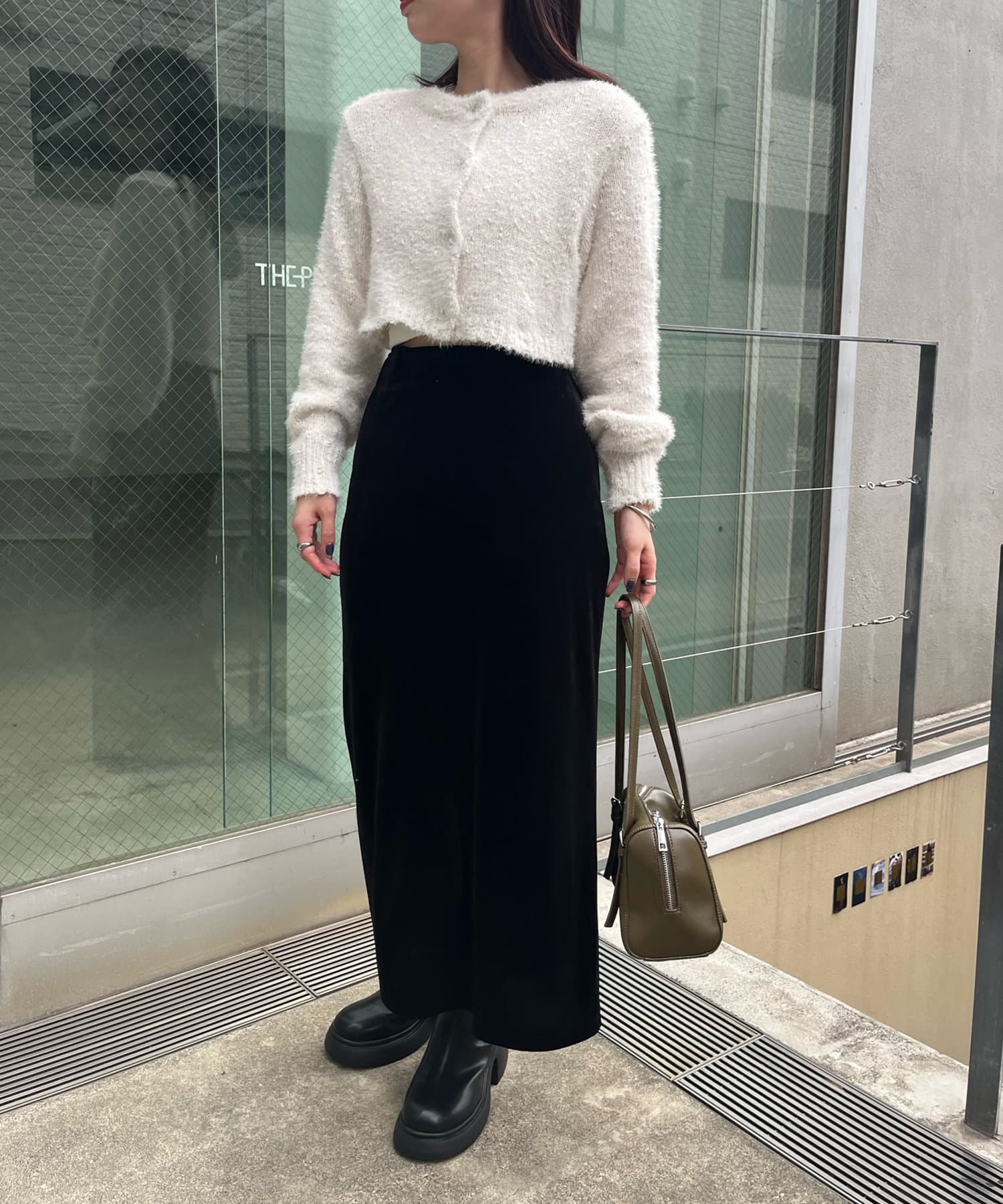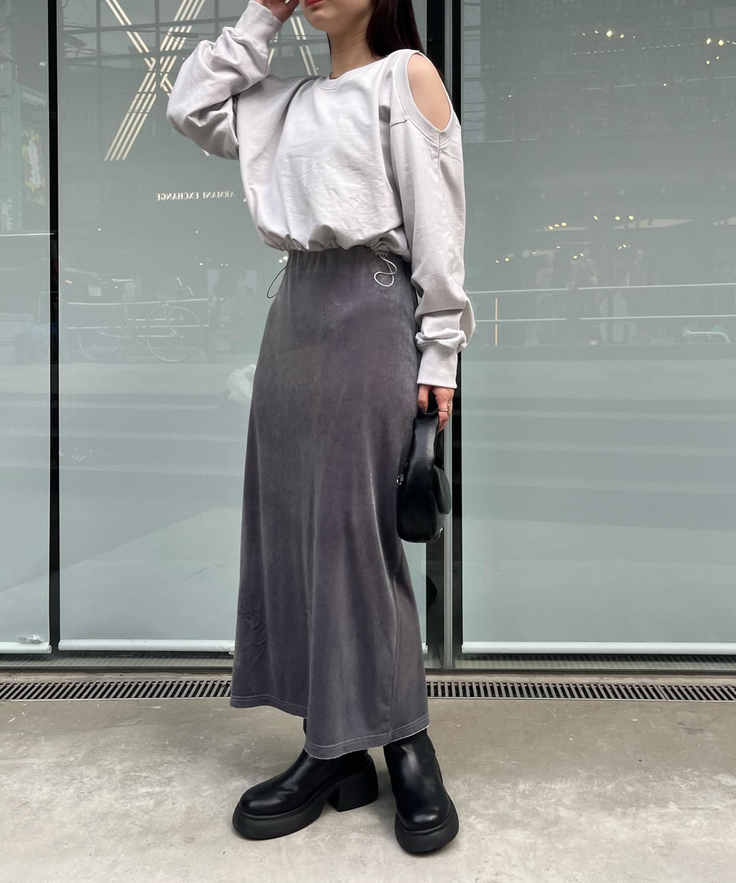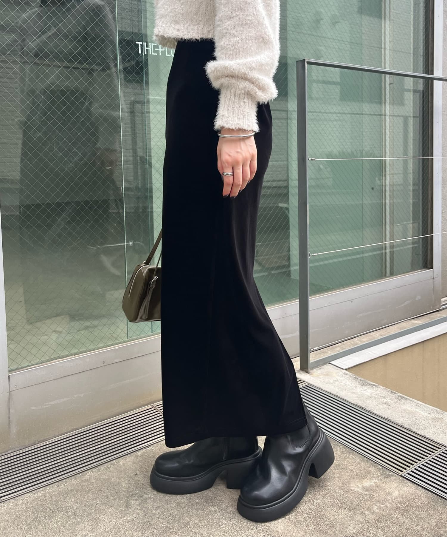 ・トレンド感たっぷりのベロア素材が上品なスカート。