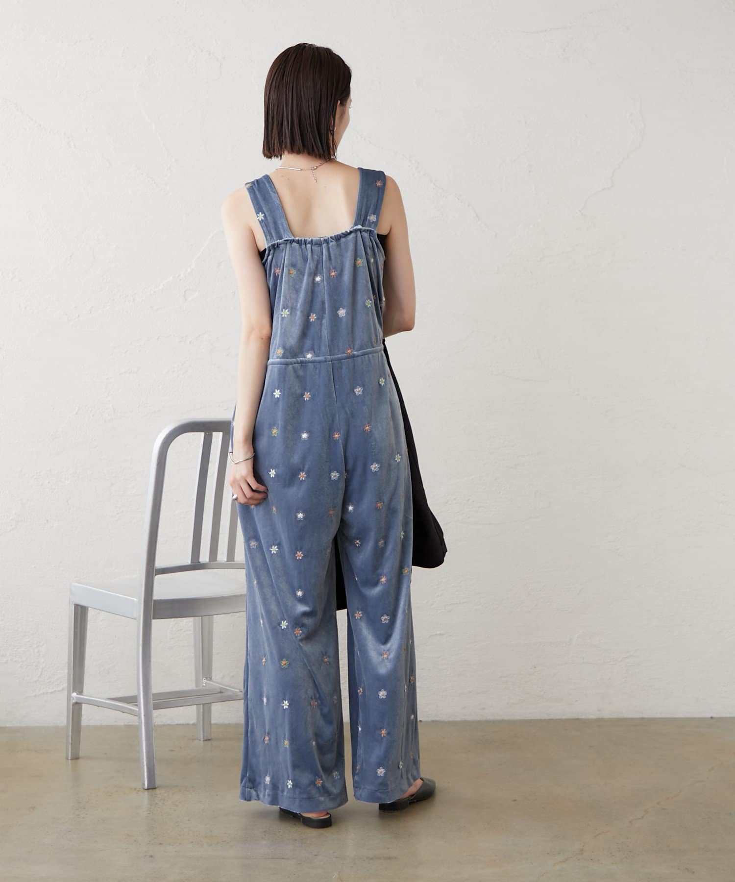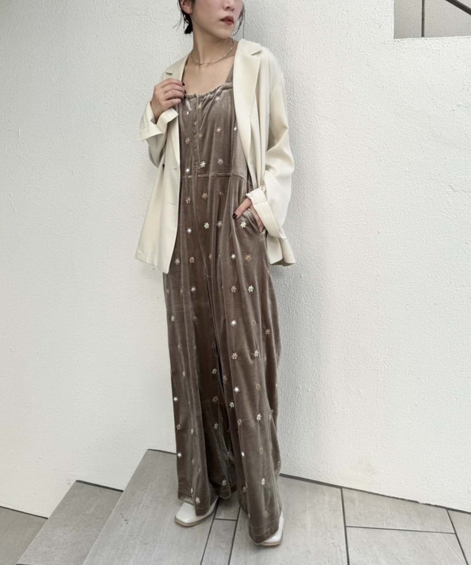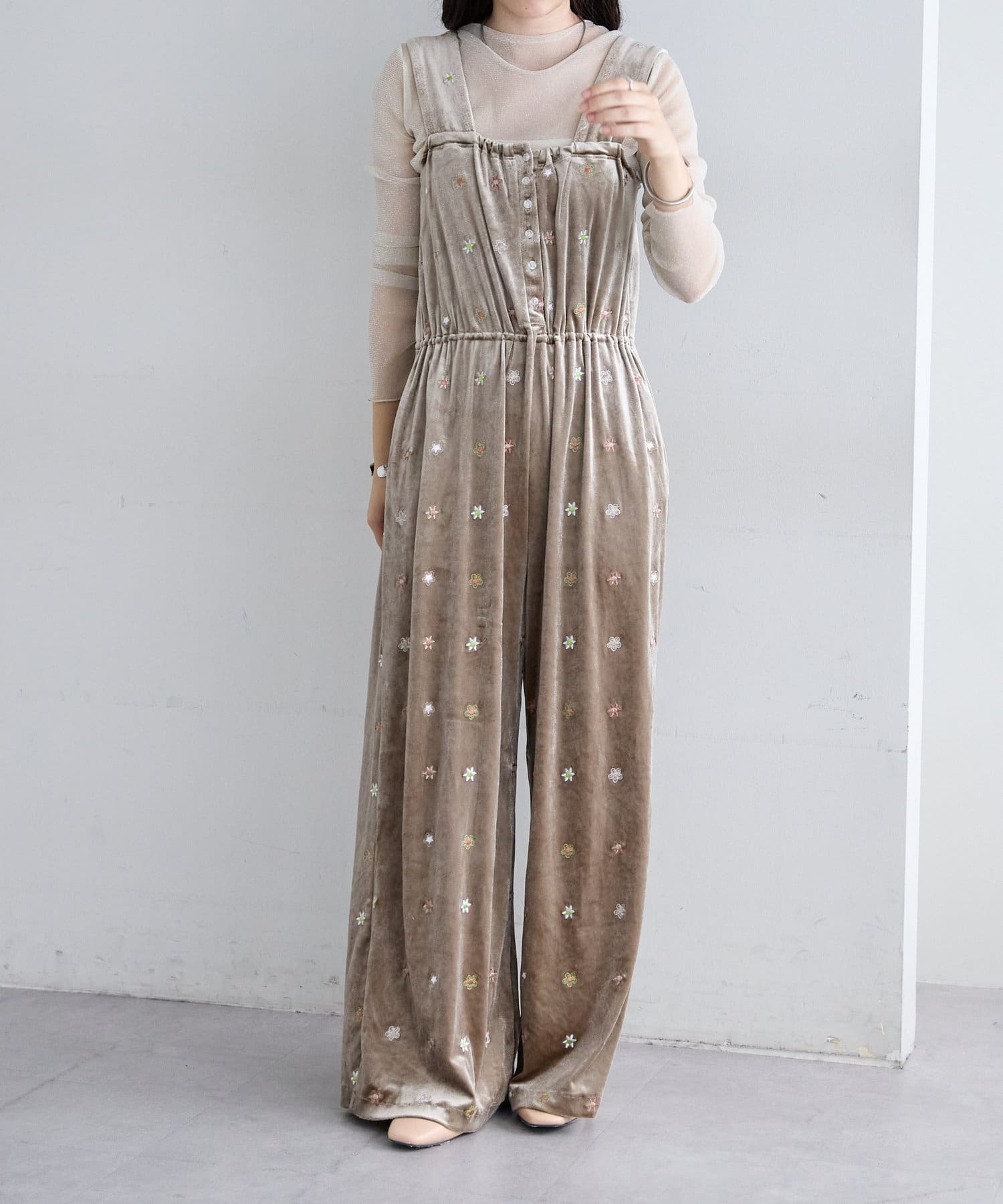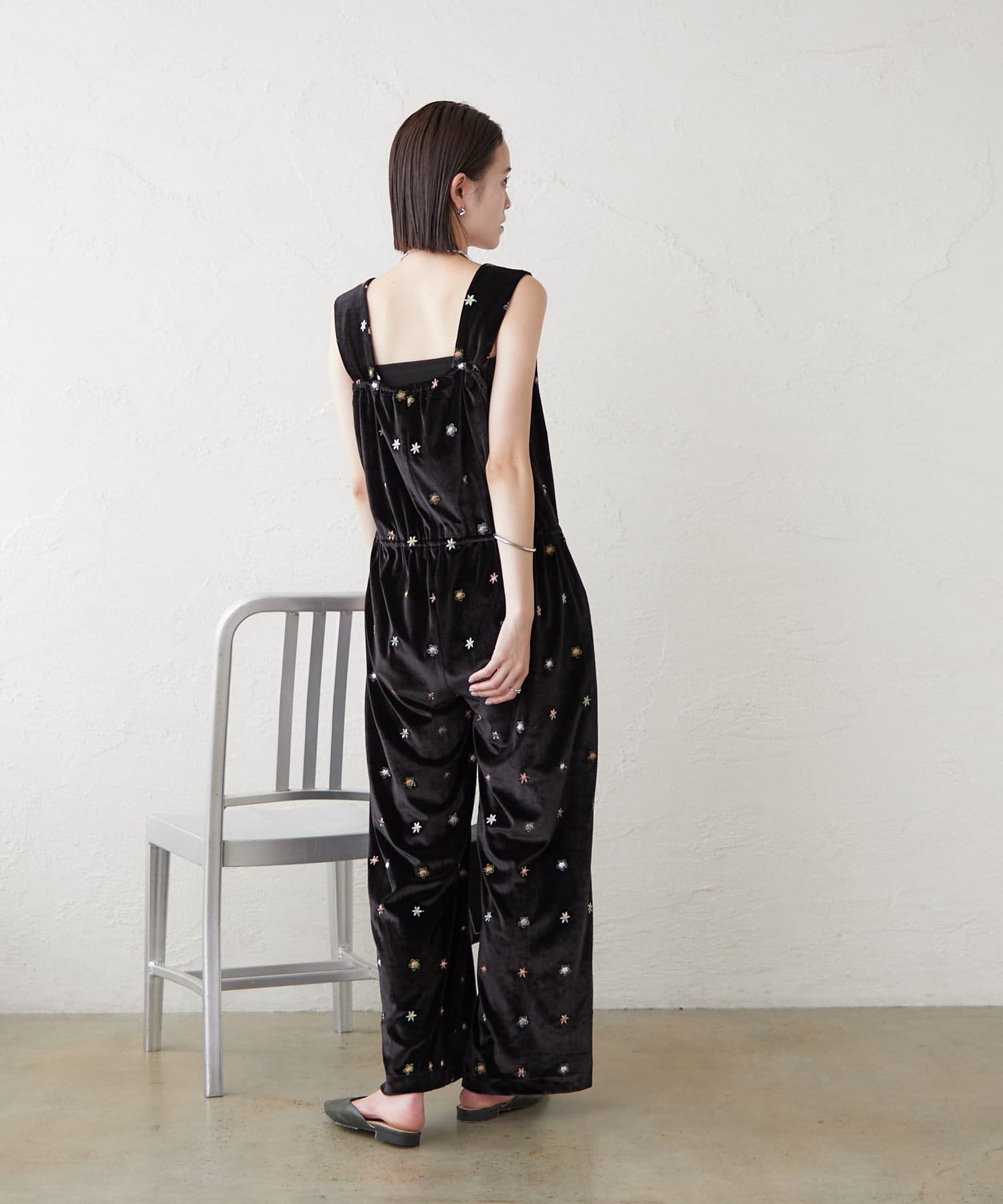 ツヤっとしたベロアとお花の刺繍がときめくオールインワンが登場!
