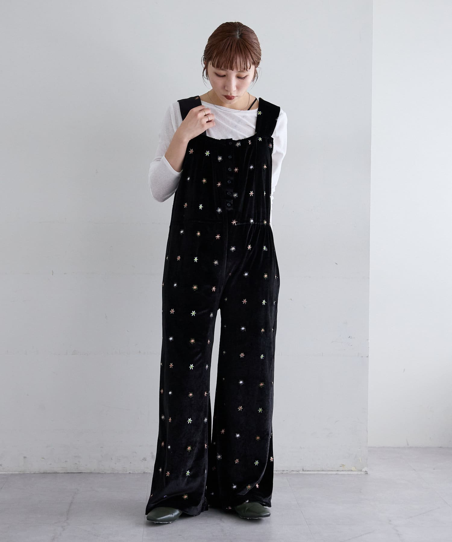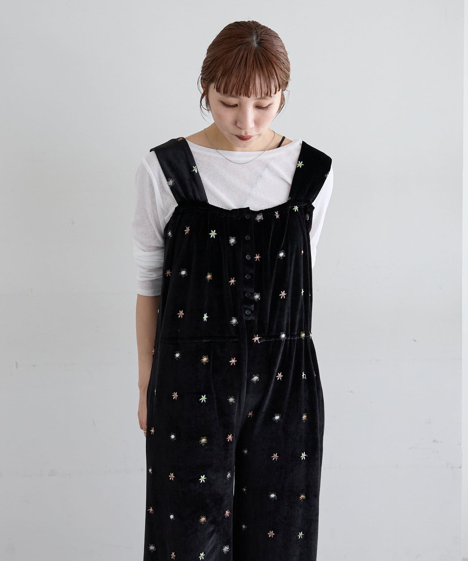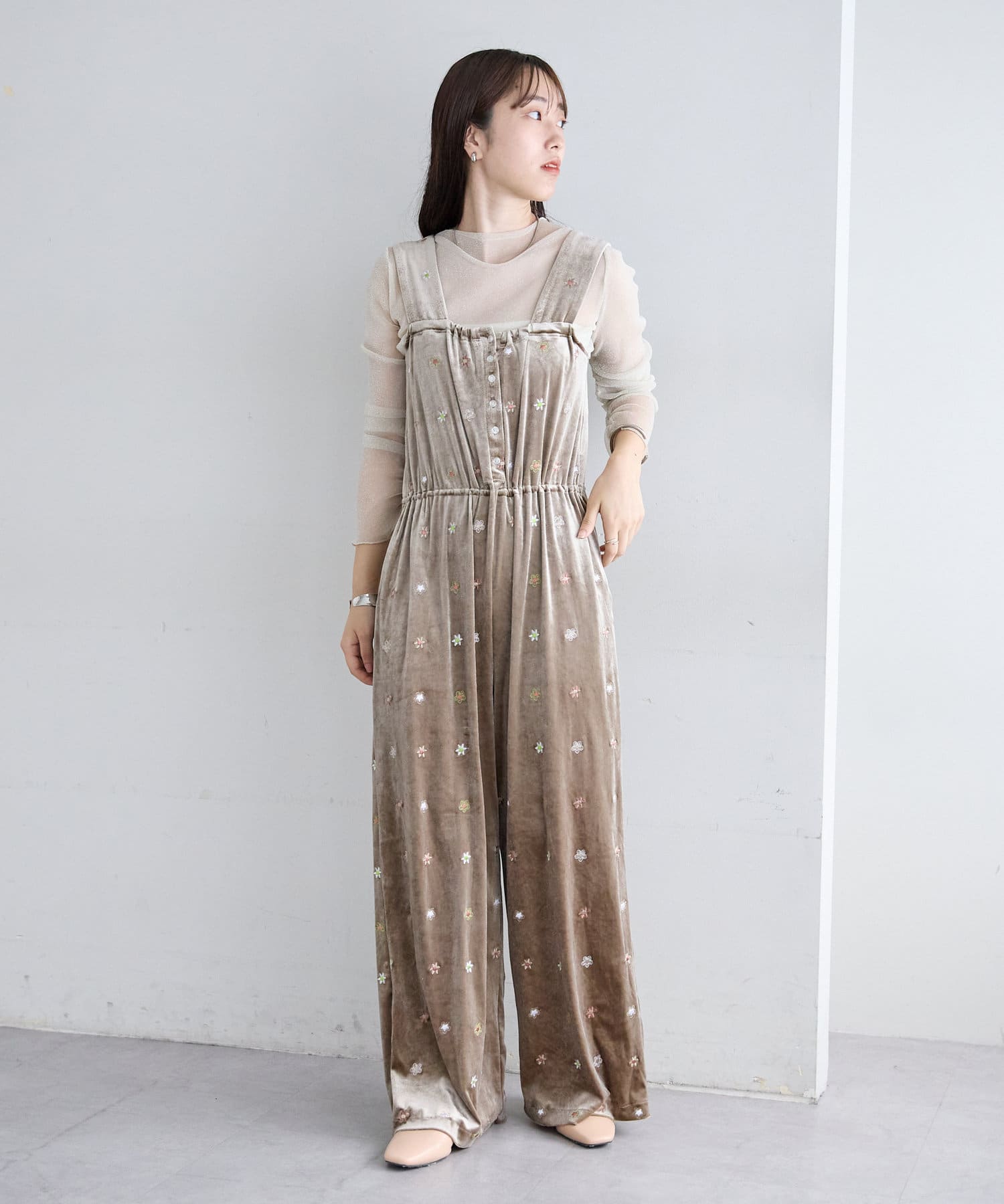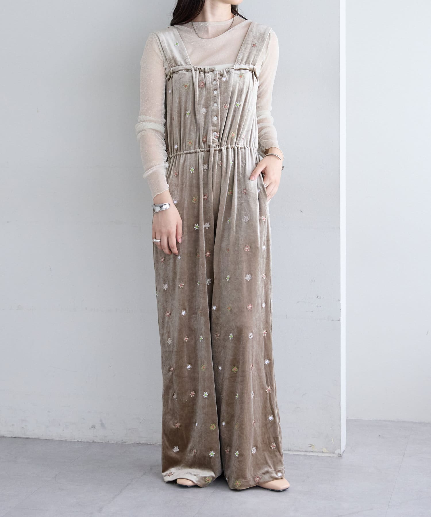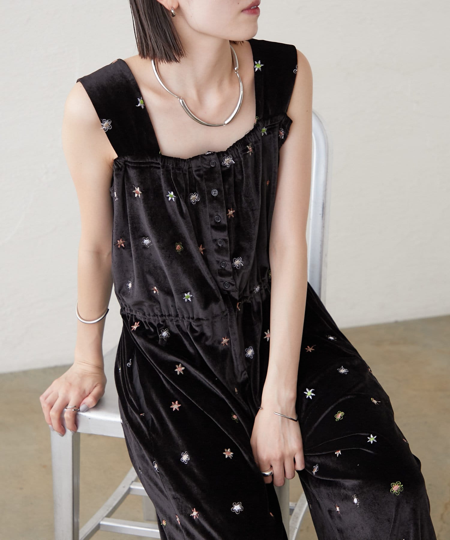 ツヤっとしたベロアとお花の刺繍がときめくオールインワンが登場!