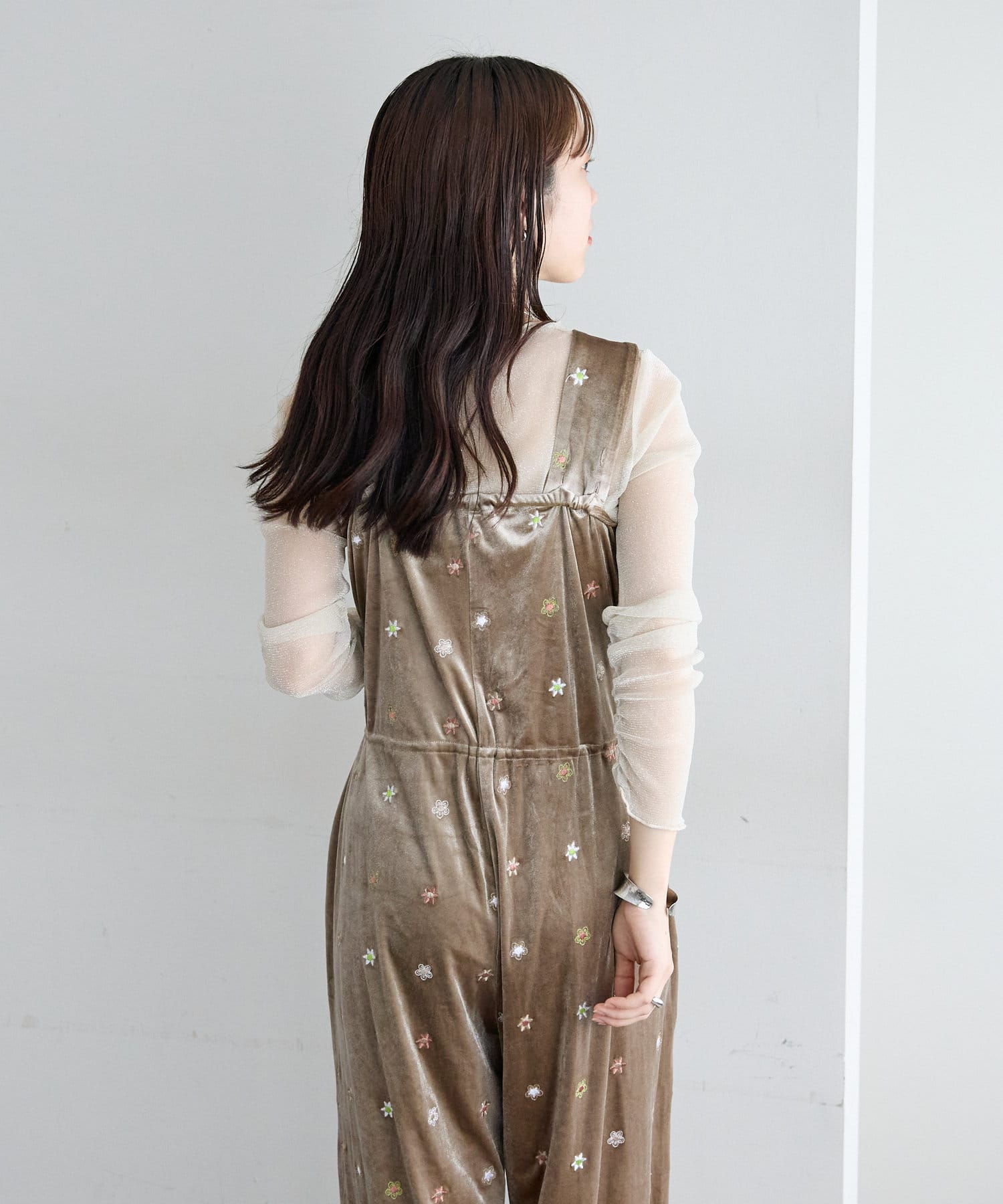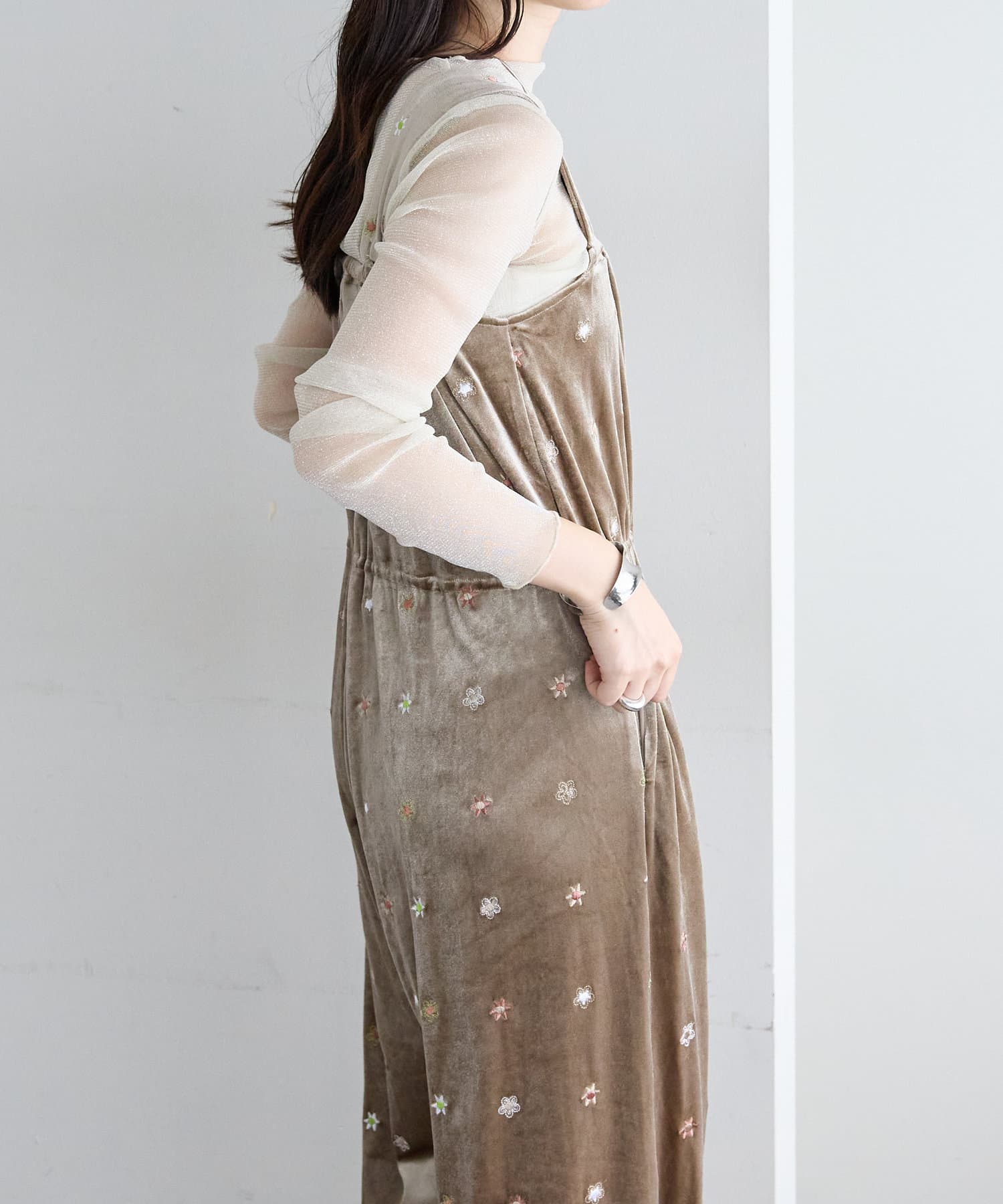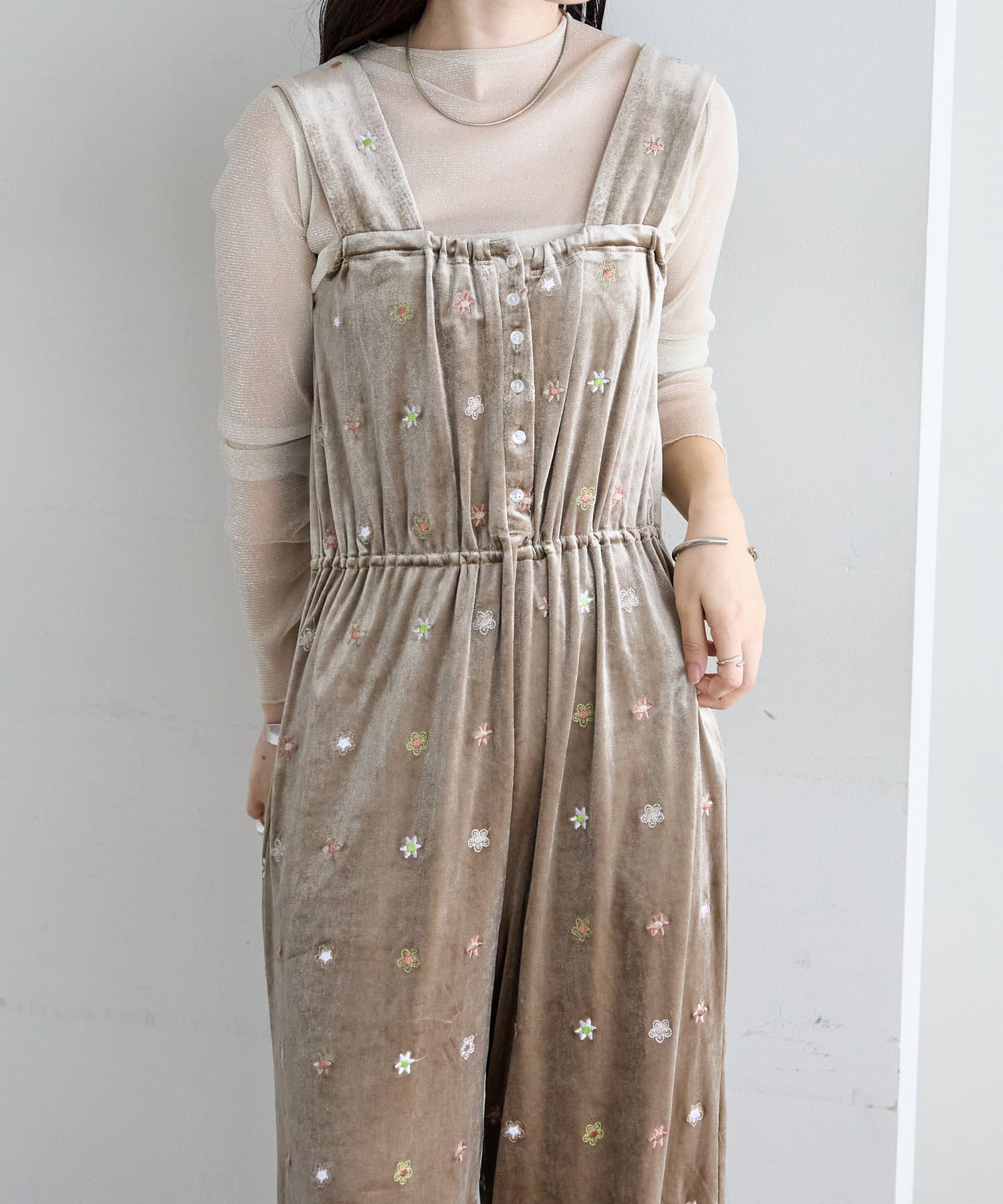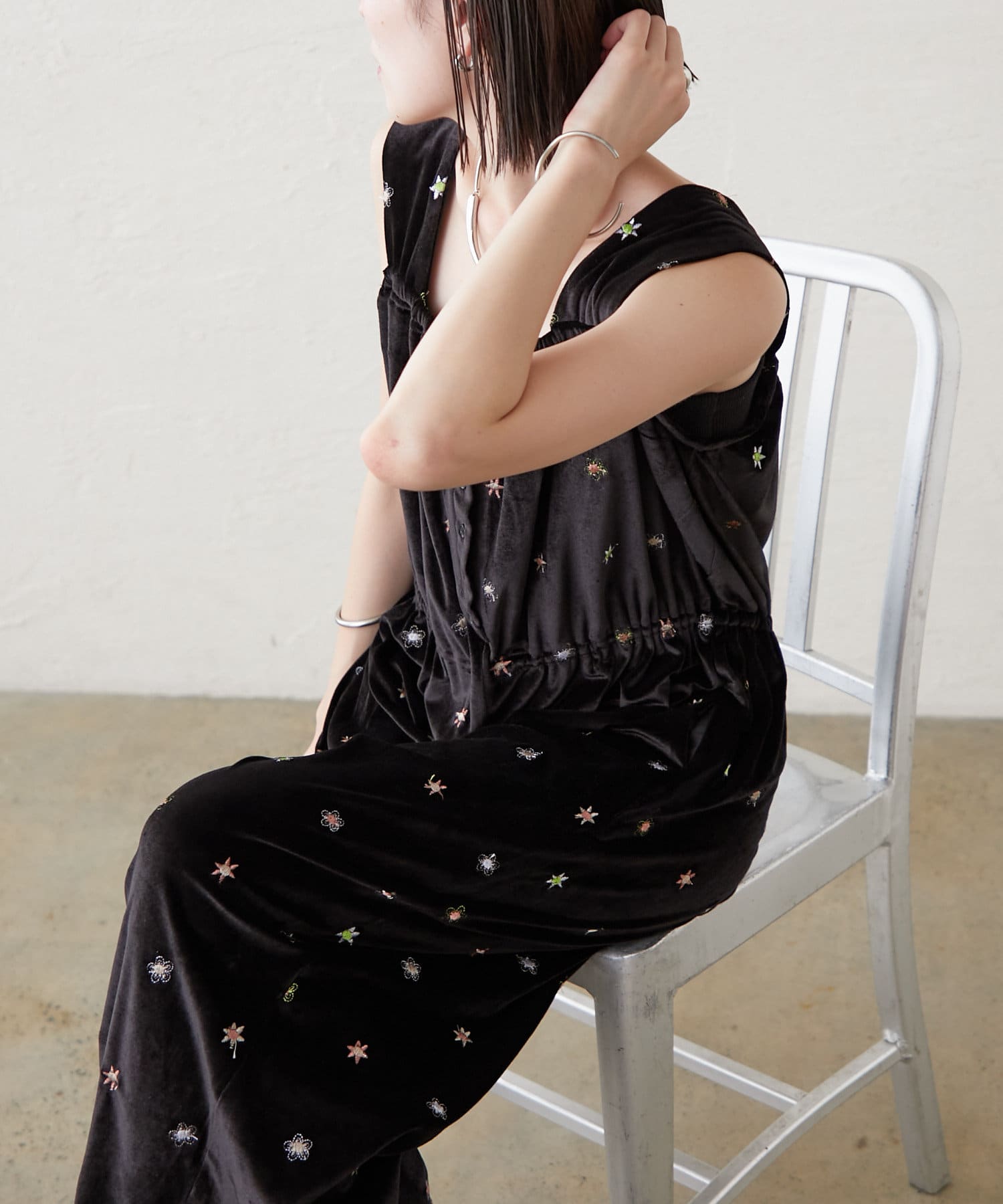ツヤっとしたベロアとお花の刺繍がときめくオールインワンが登場!