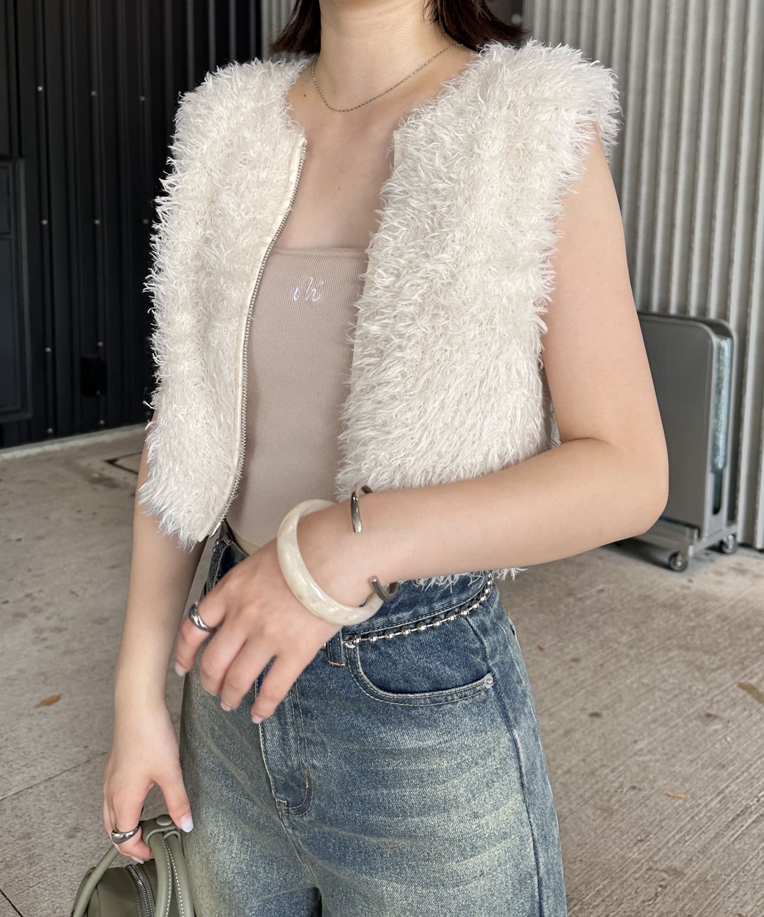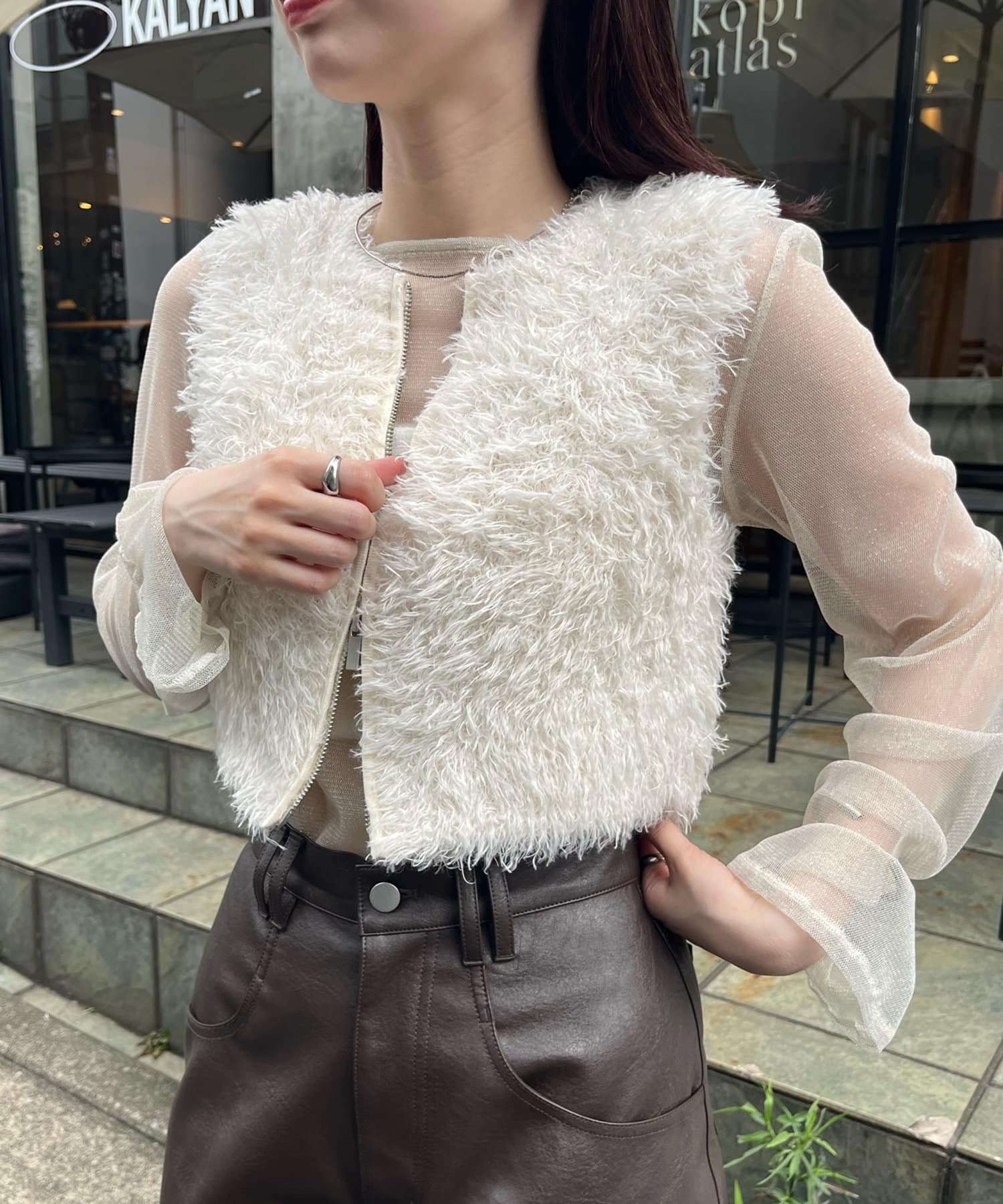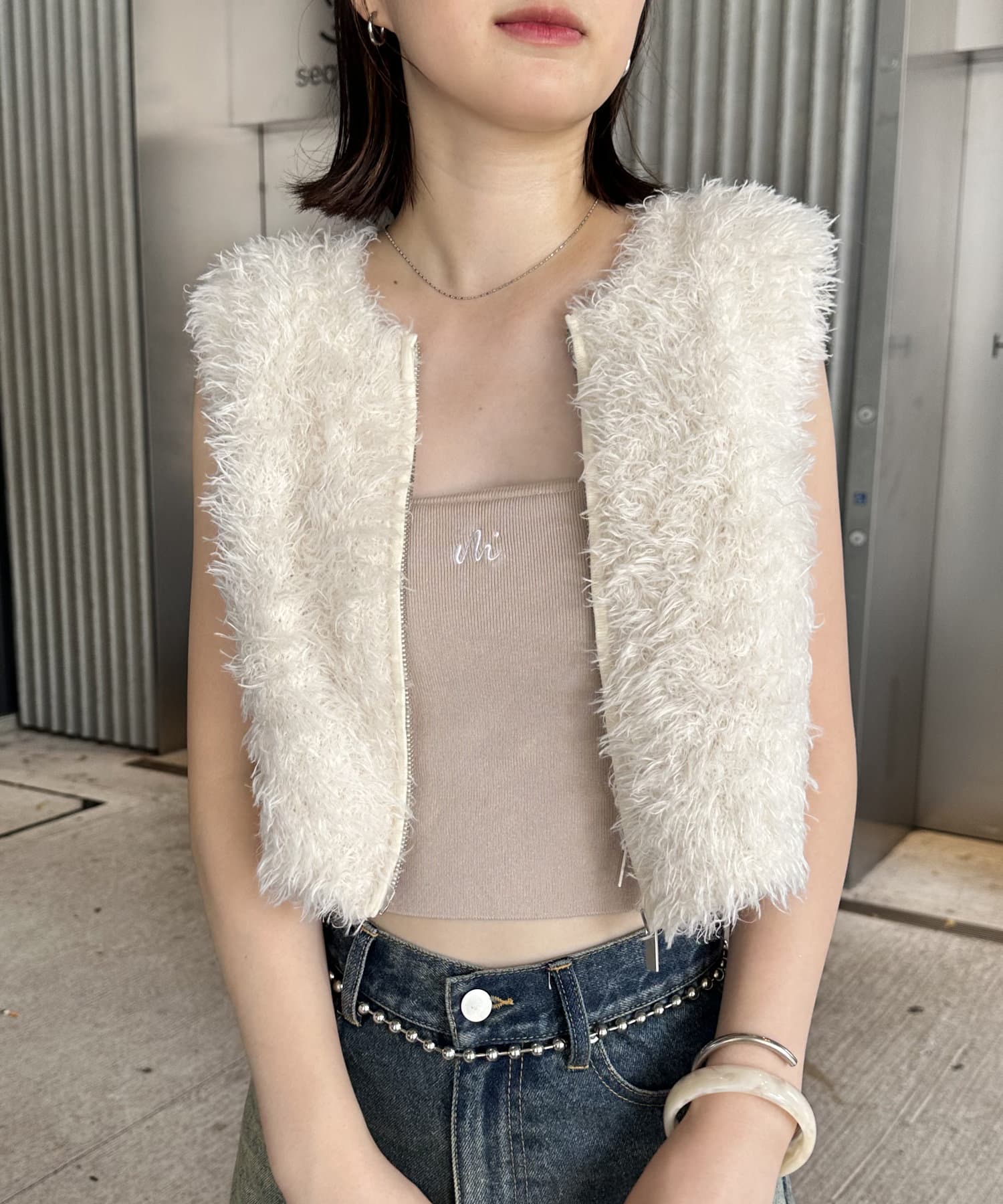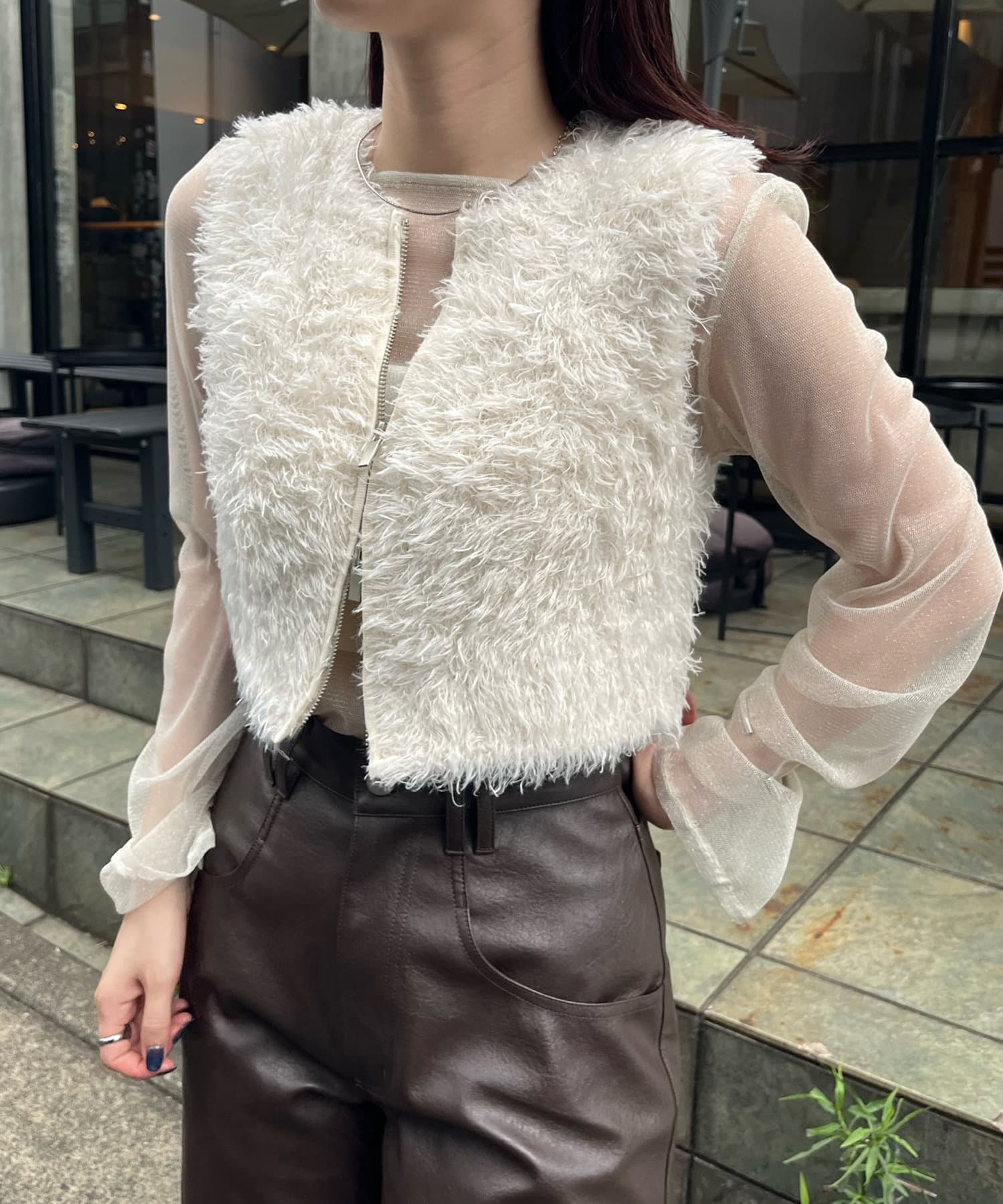 ・トレンドのふわふわシャギーが魅力的なショート丈のベスト。