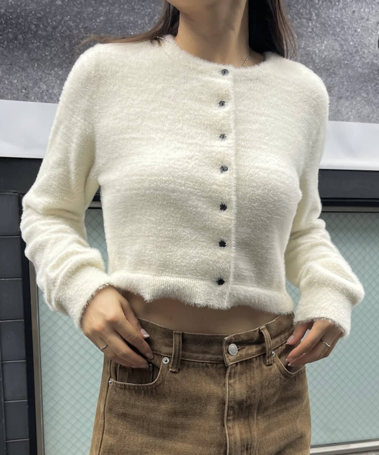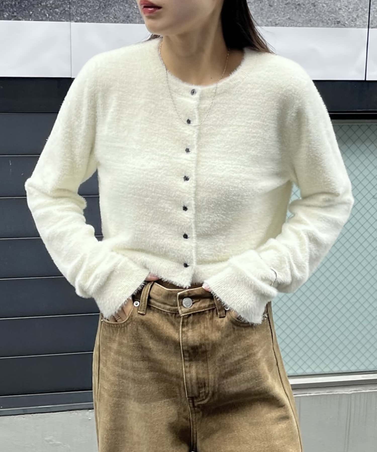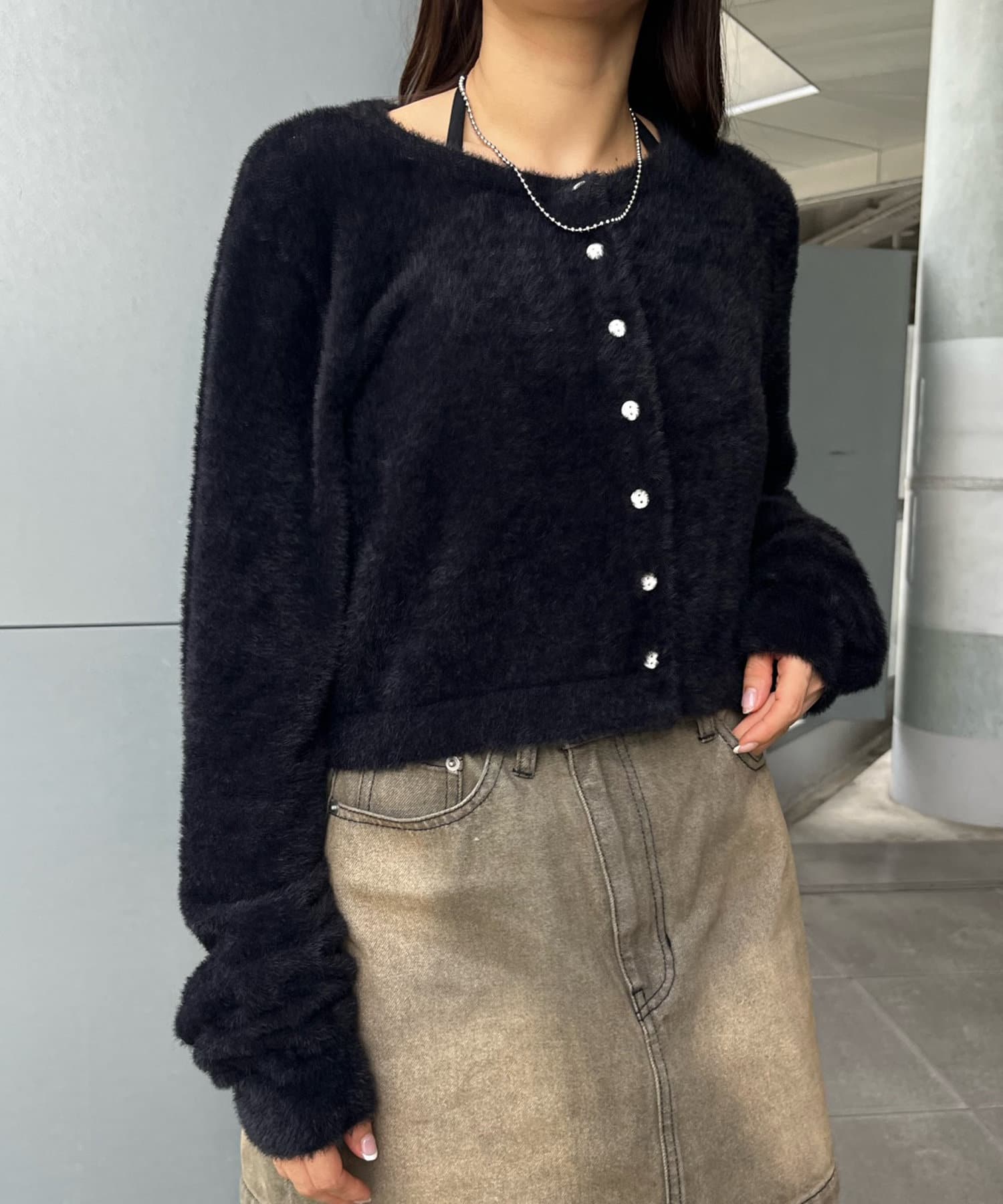 ・トレンドのシャギー素材とクロップド丈の両方を兼ね備えたカーディガン。