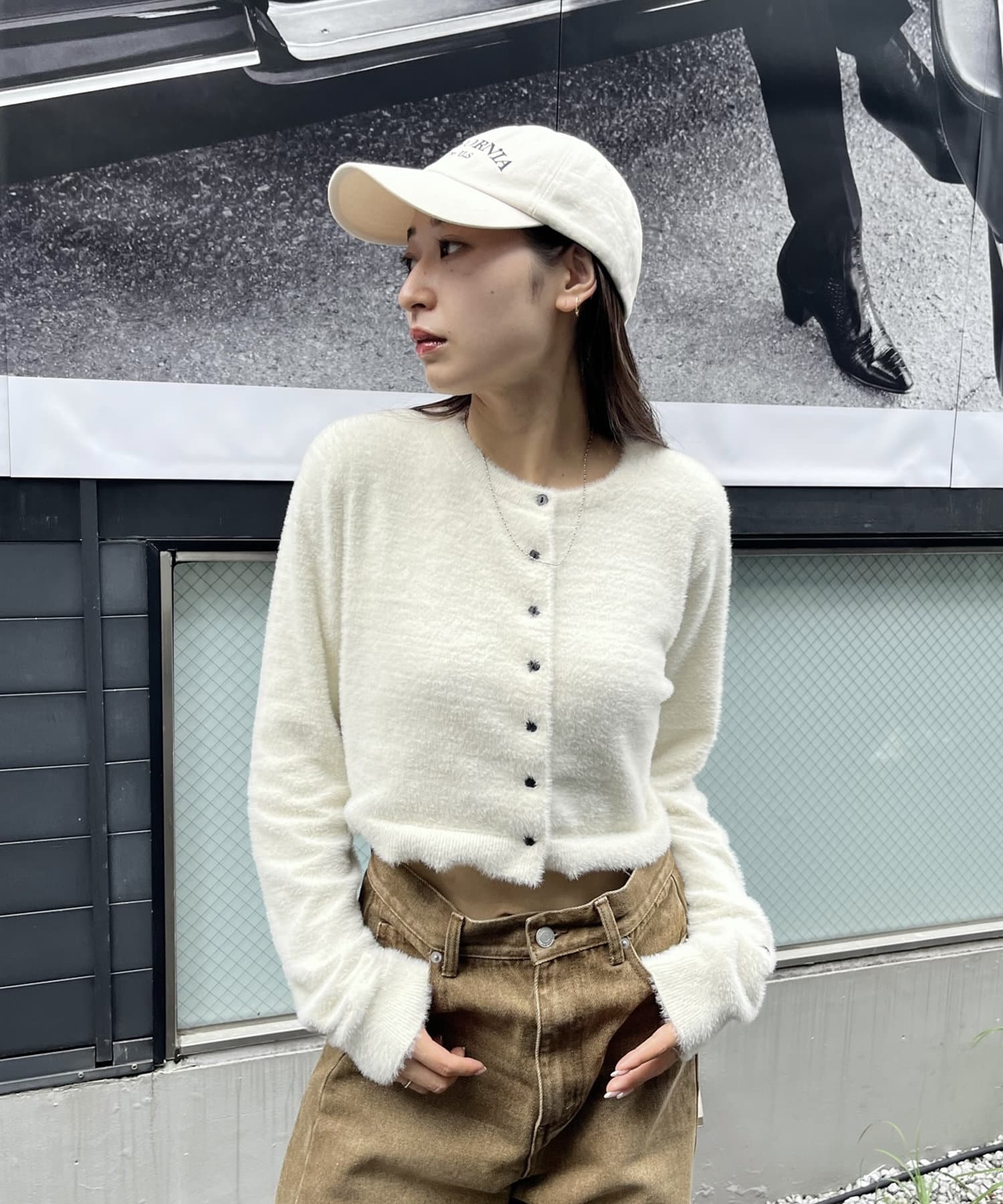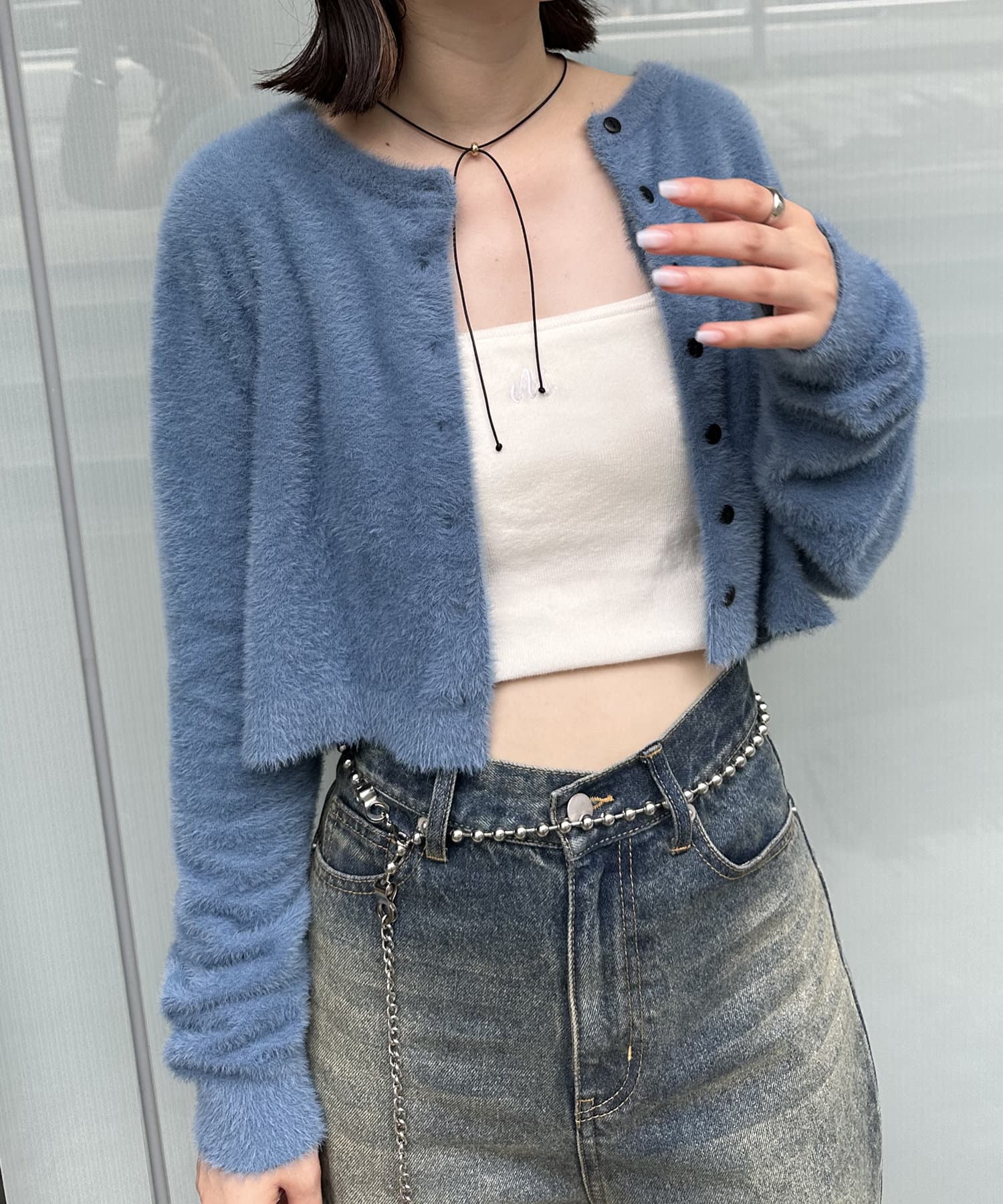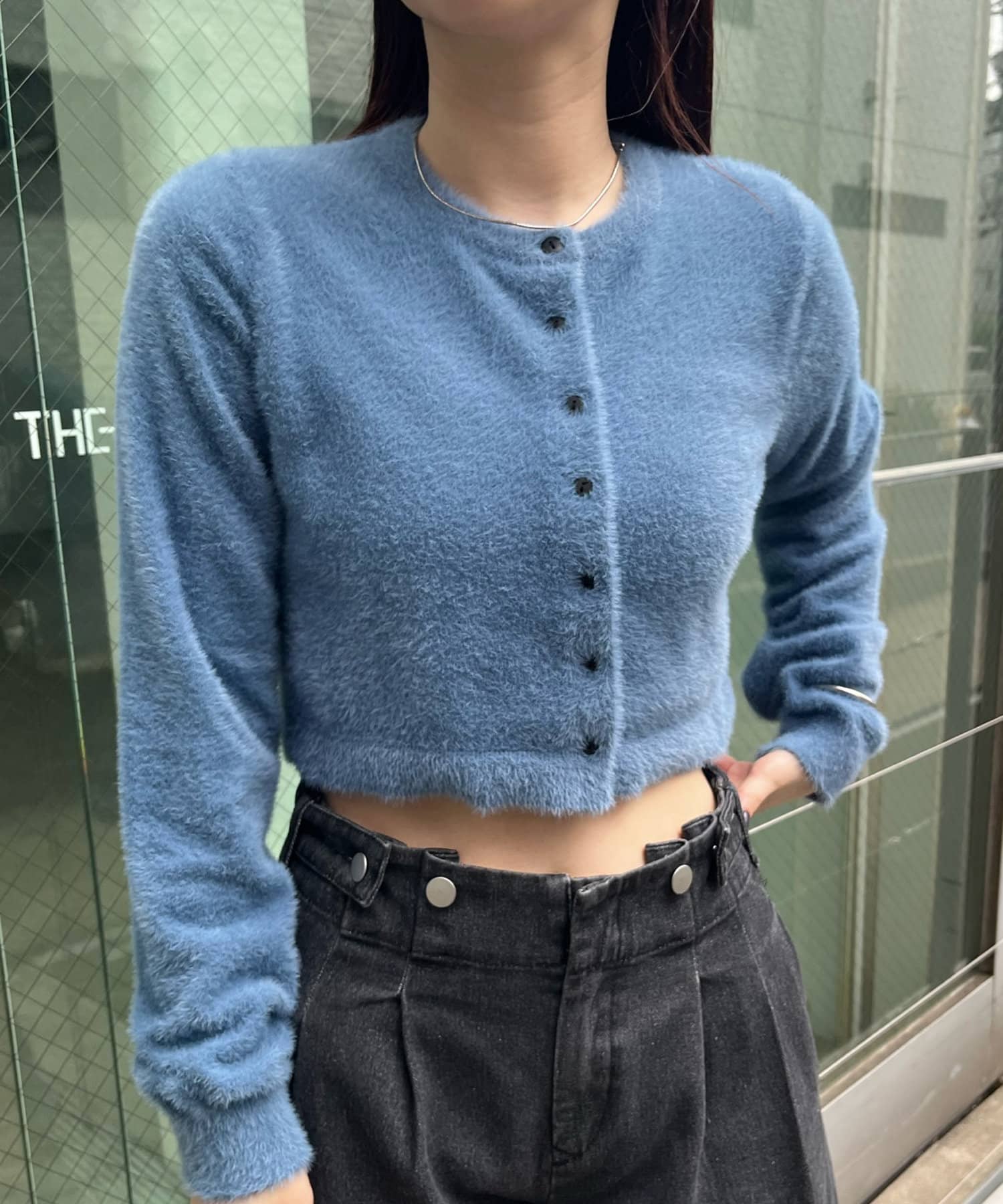 ・トレンドのシャギー素材とクロップド丈の両方を兼ね備えたカーディガン。