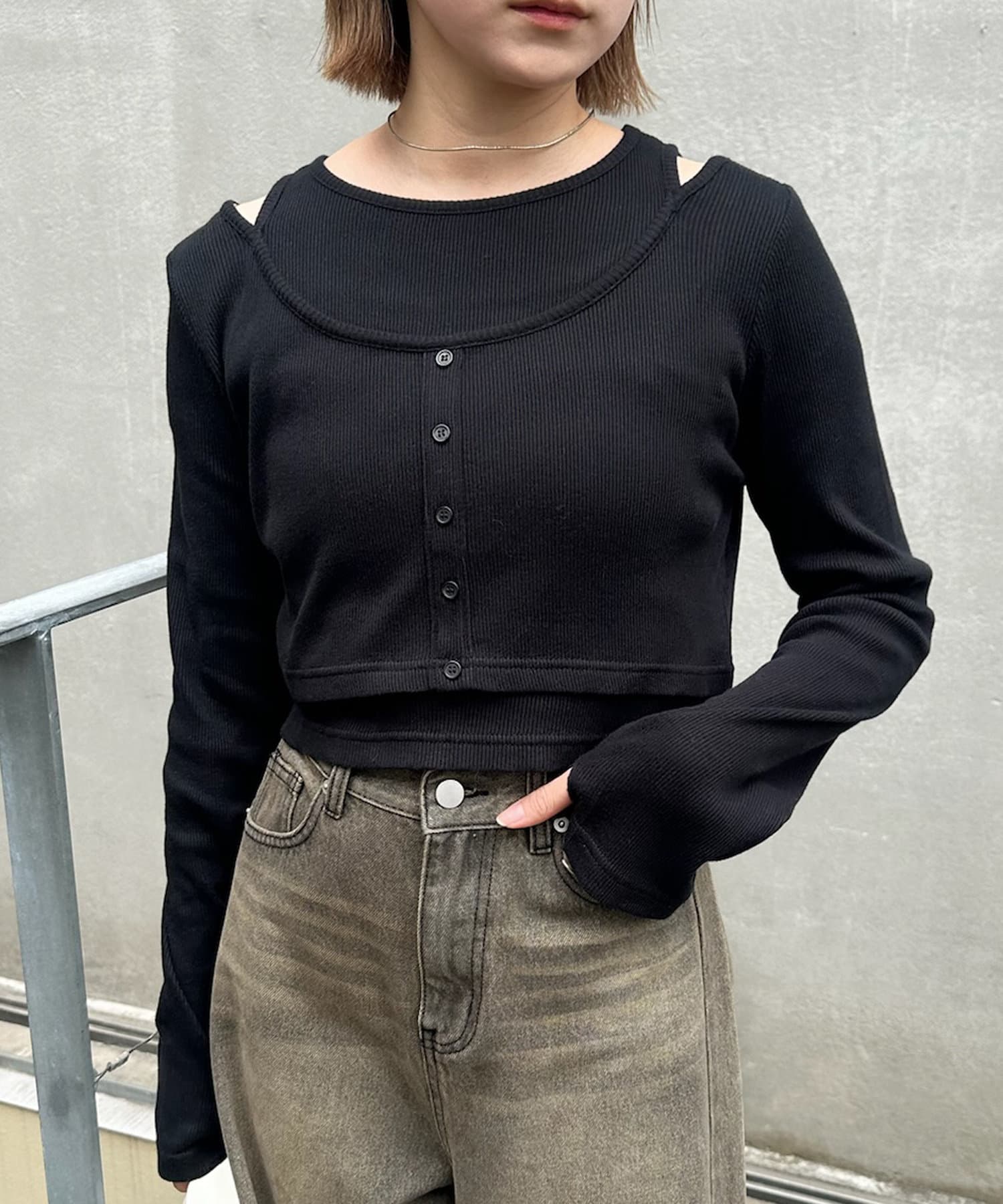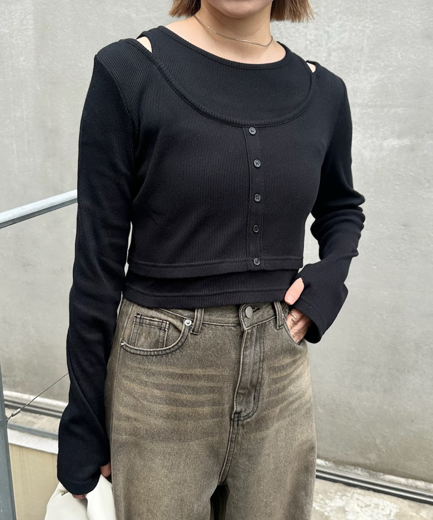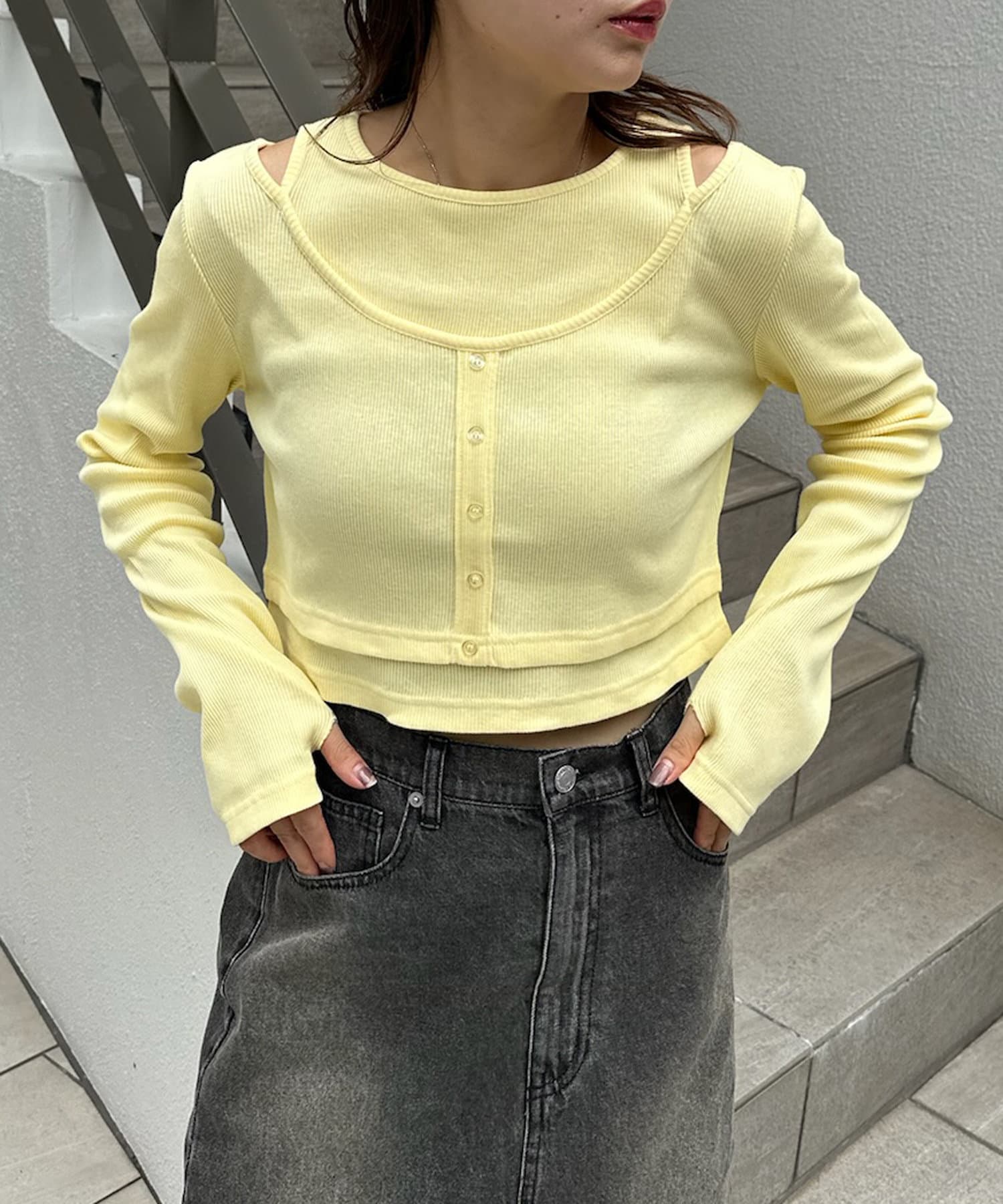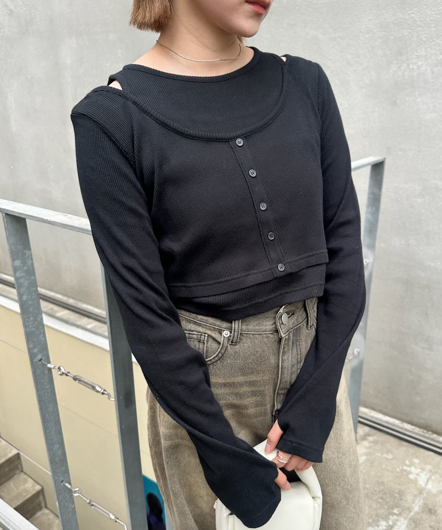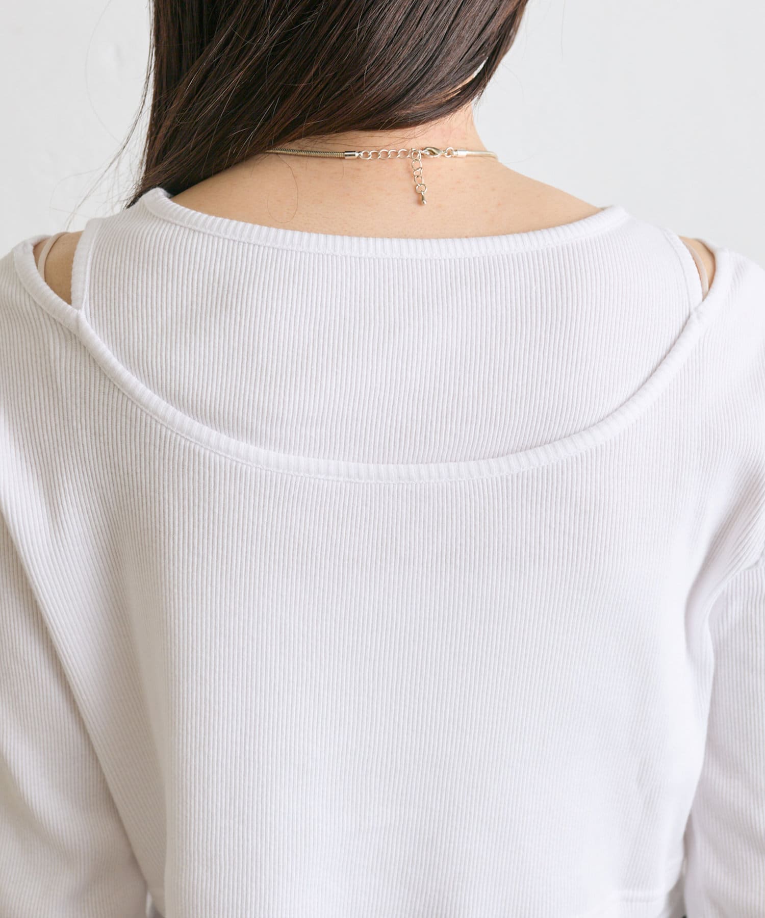 ・キャミとカーディガンをレイヤードしたようなデザインがポイントの一枚。