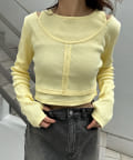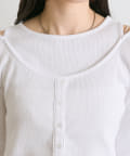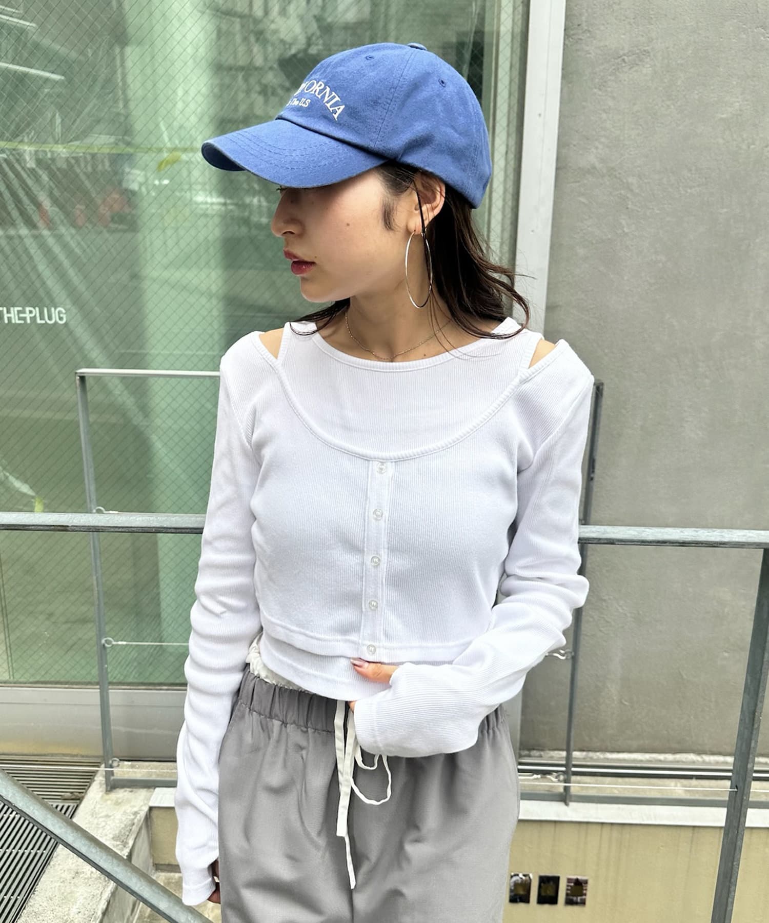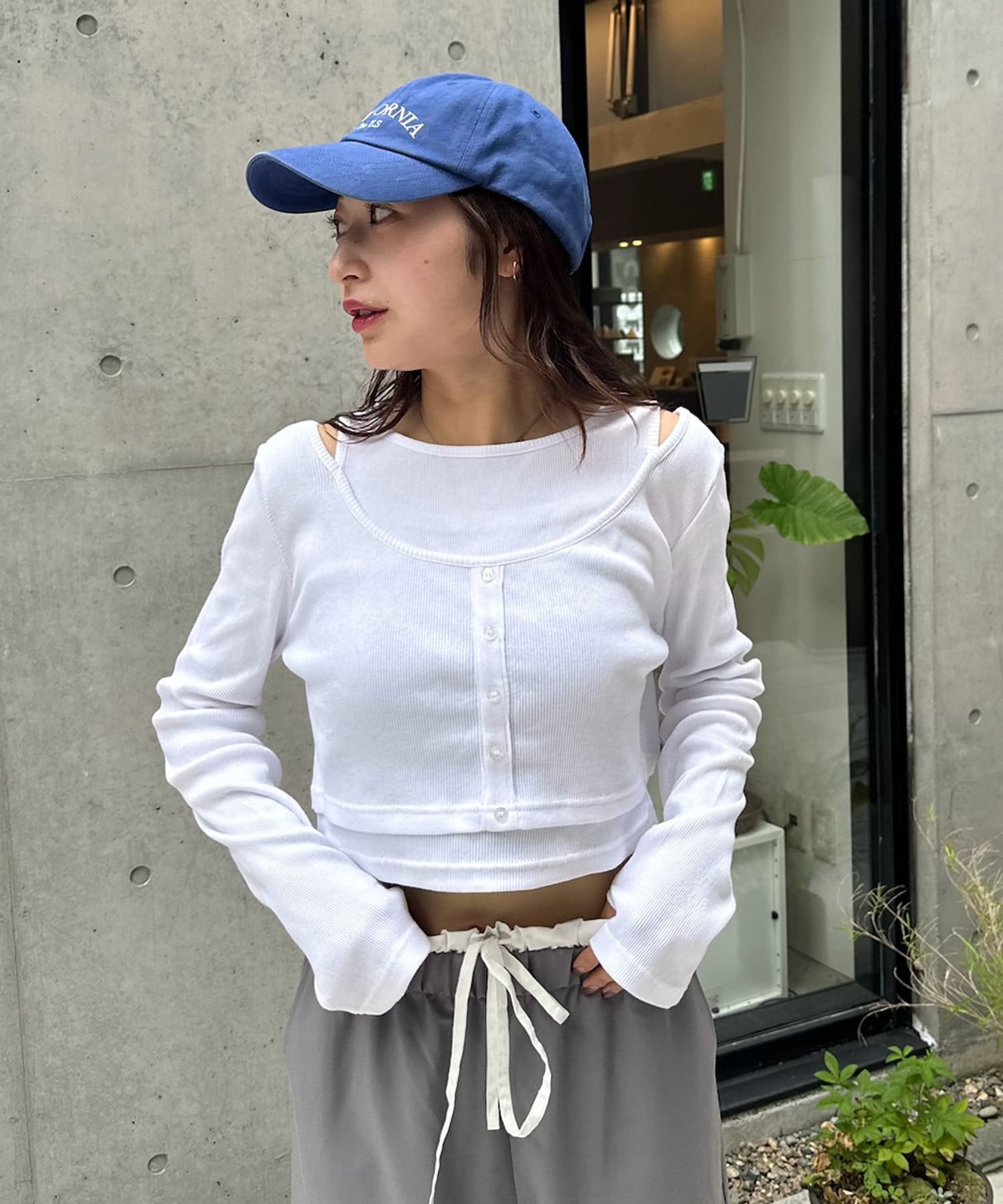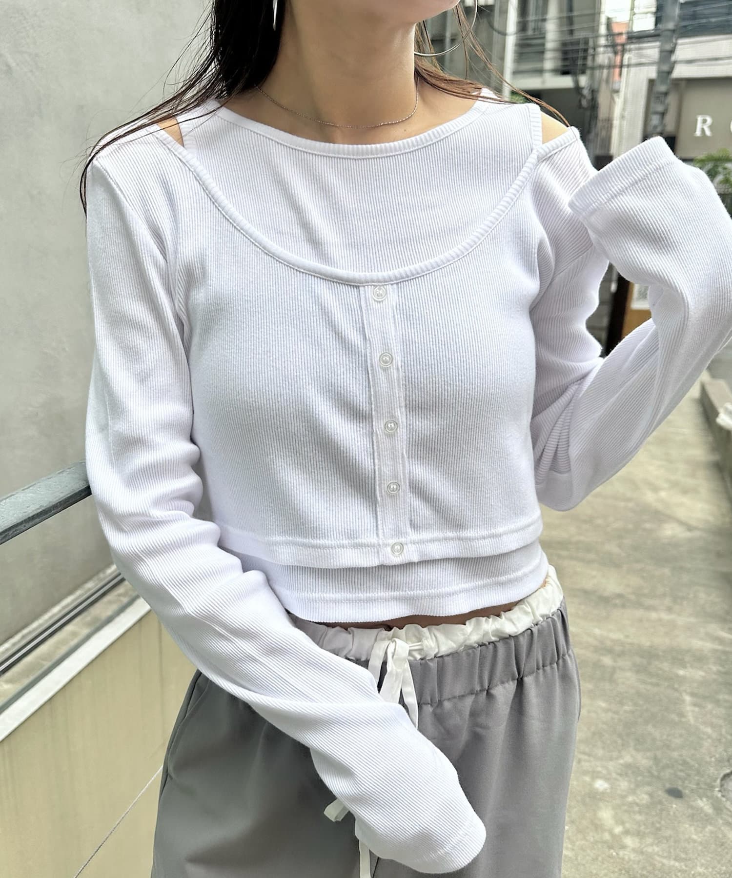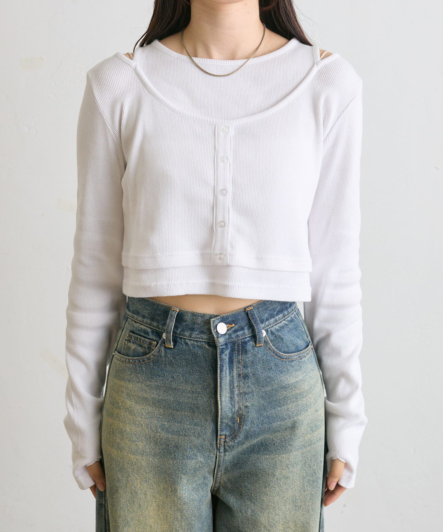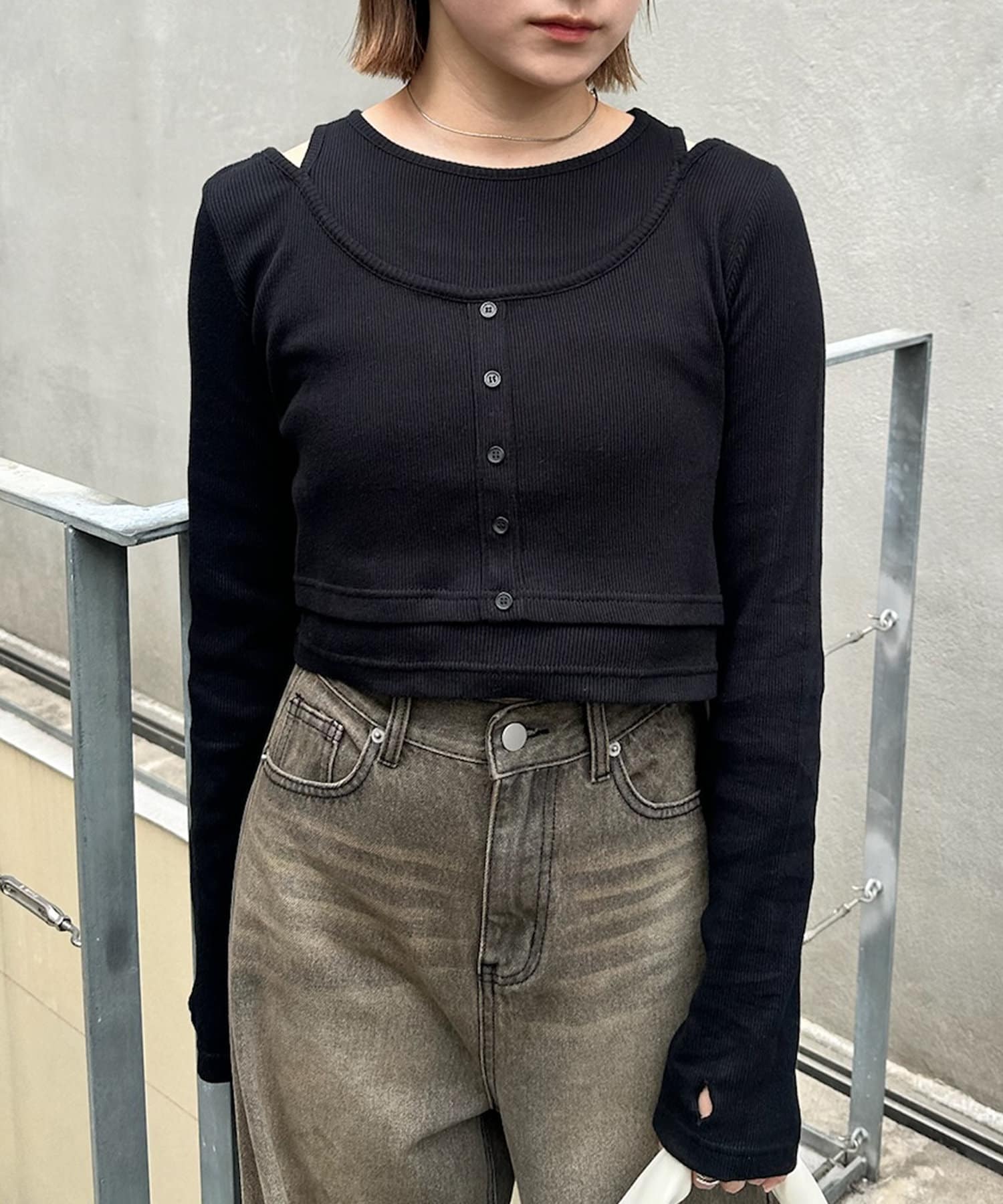 ・キャミとカーディガンをレイヤードしたようなデザインがポイントの一枚。