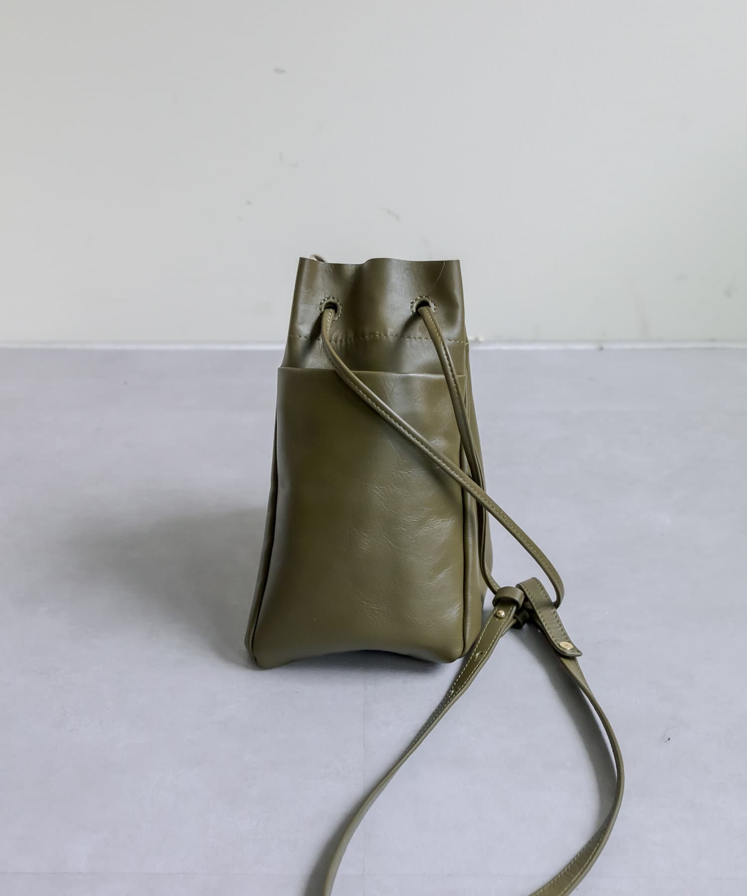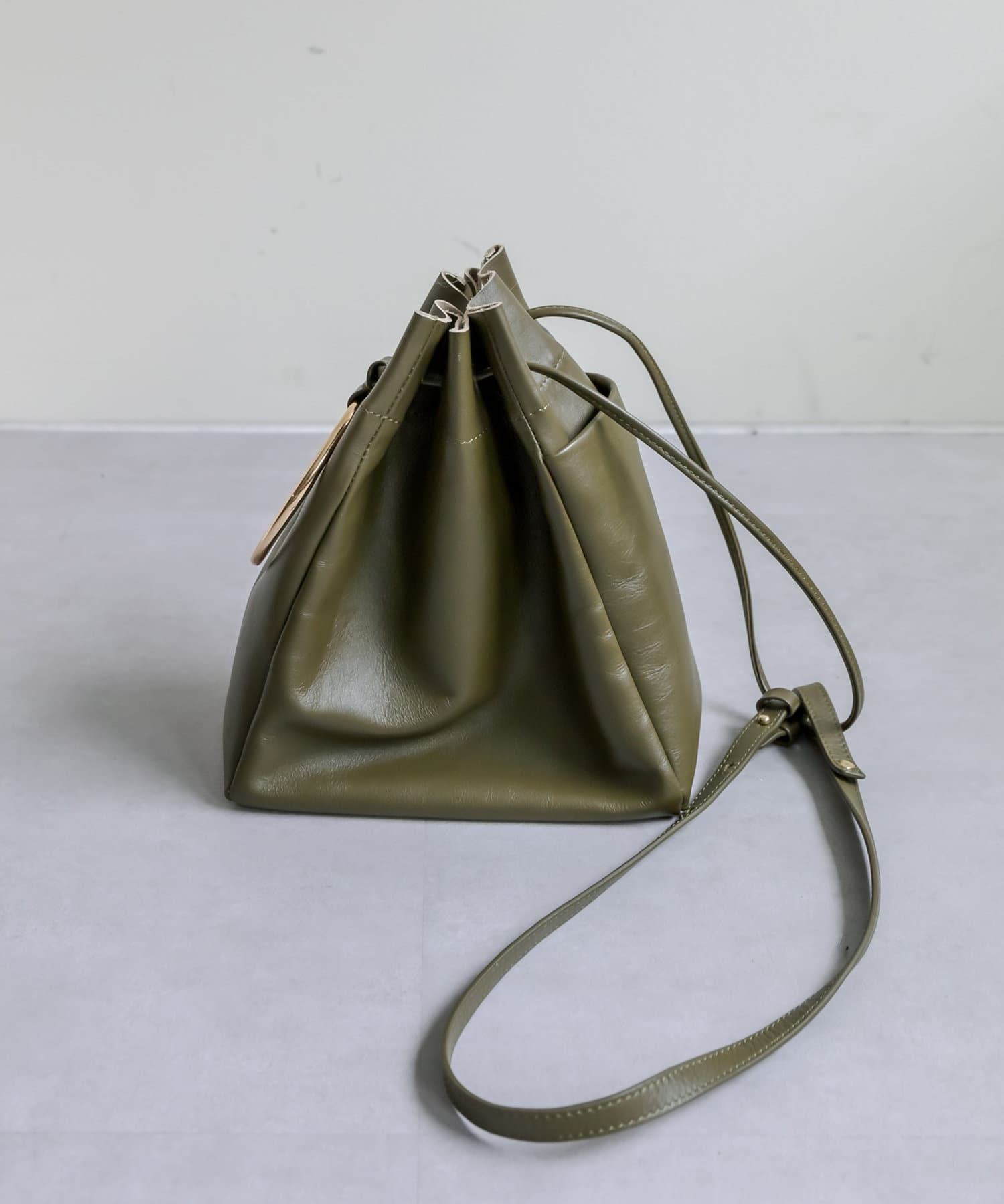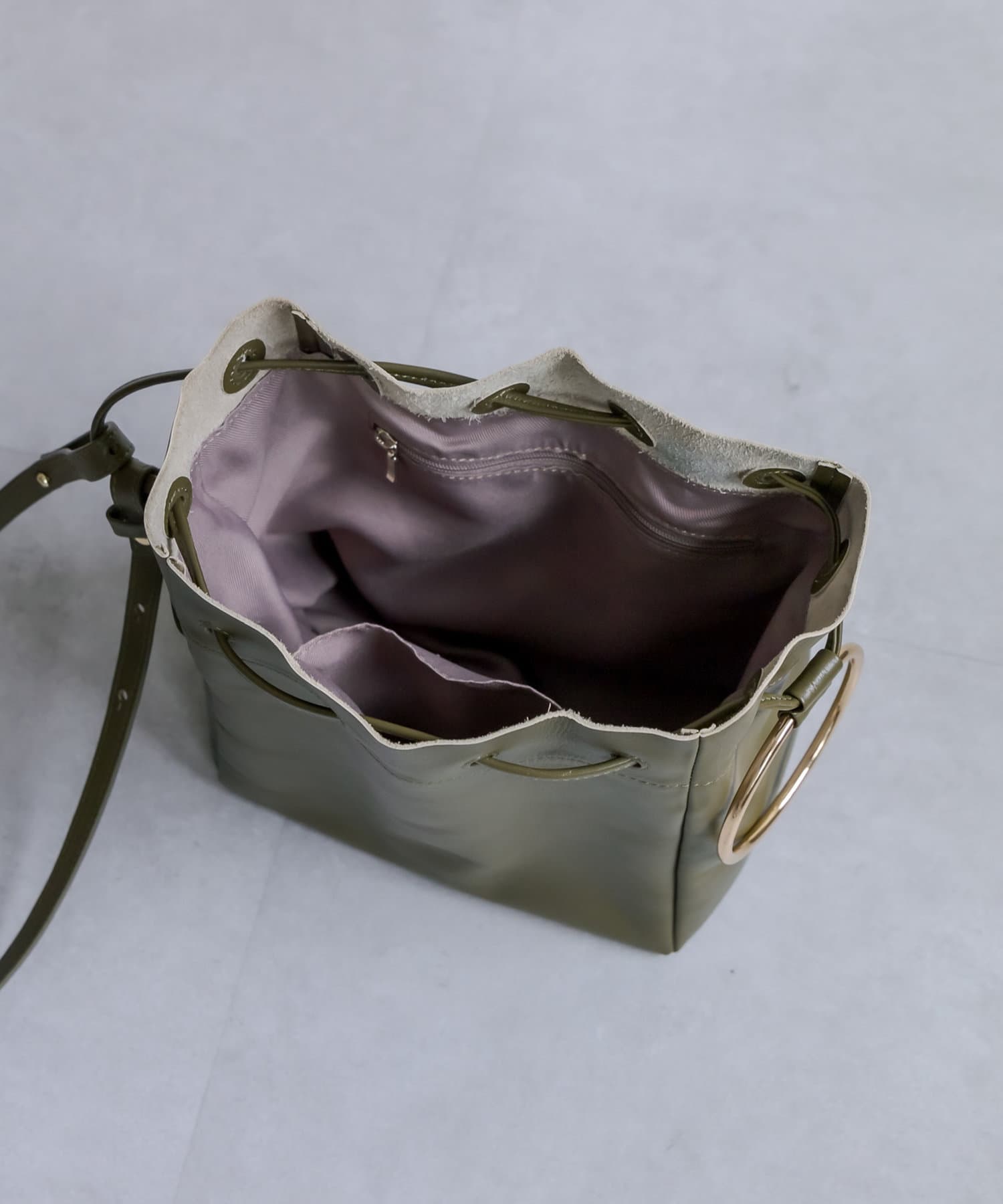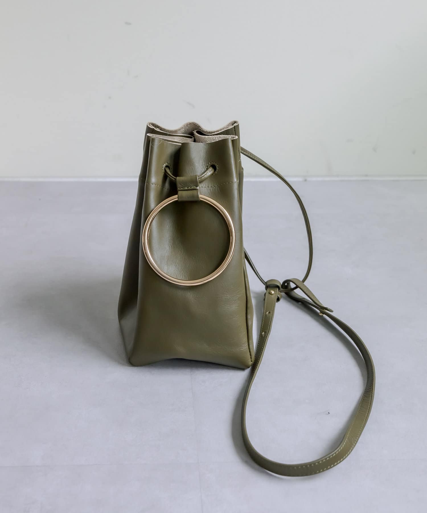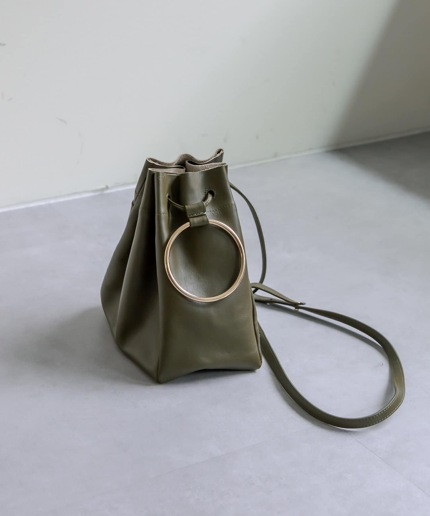 ・女性らしいゴールドのリングハンドルが目を惹く巾着BAG。