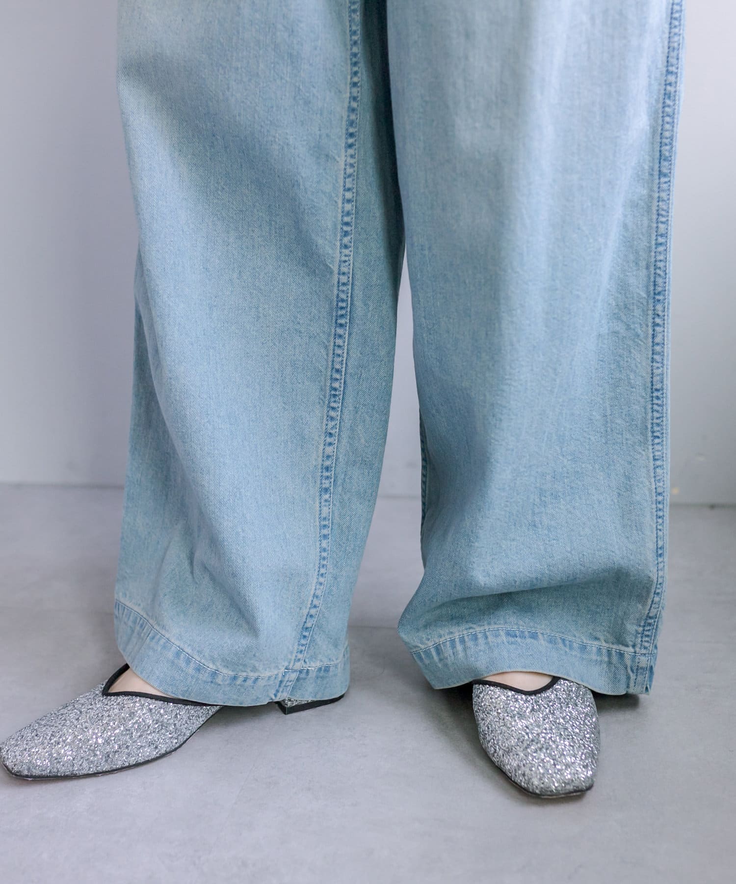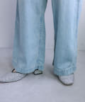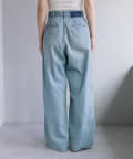 ボリュームのあるワイドなシルエットなのですが、8オンスと柔らかいライトオンスの生地を使用することで落ち感が出る為、ワイドなシルエットは残しつつ、