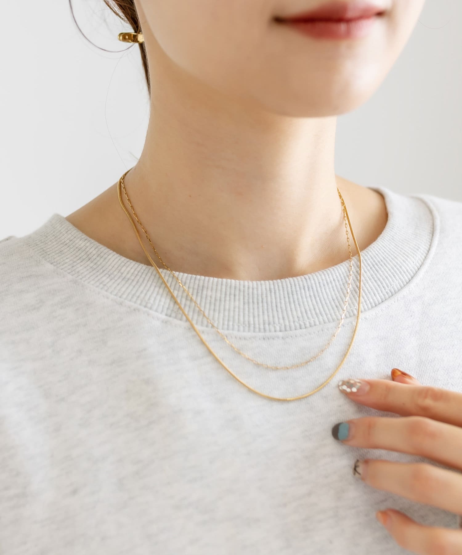 ・デザインの異なる二連ネックレスが首元に一気にトレンド感を出してくれます。