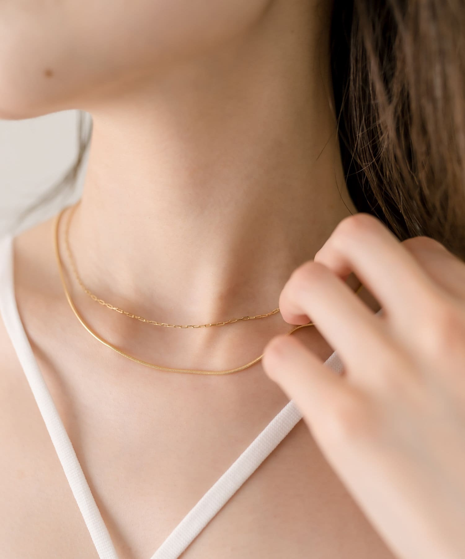 ・太めの平たいチェーンと細身チェーンデザインの二連ネックレス。