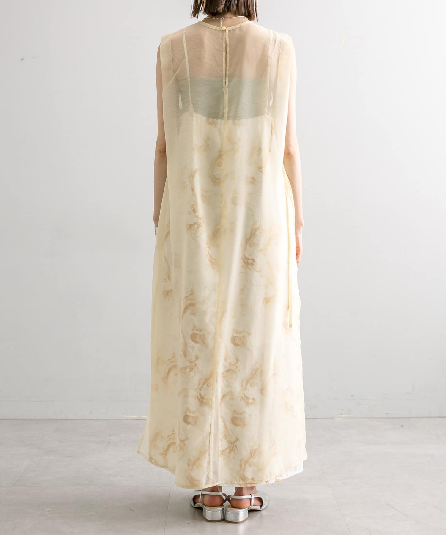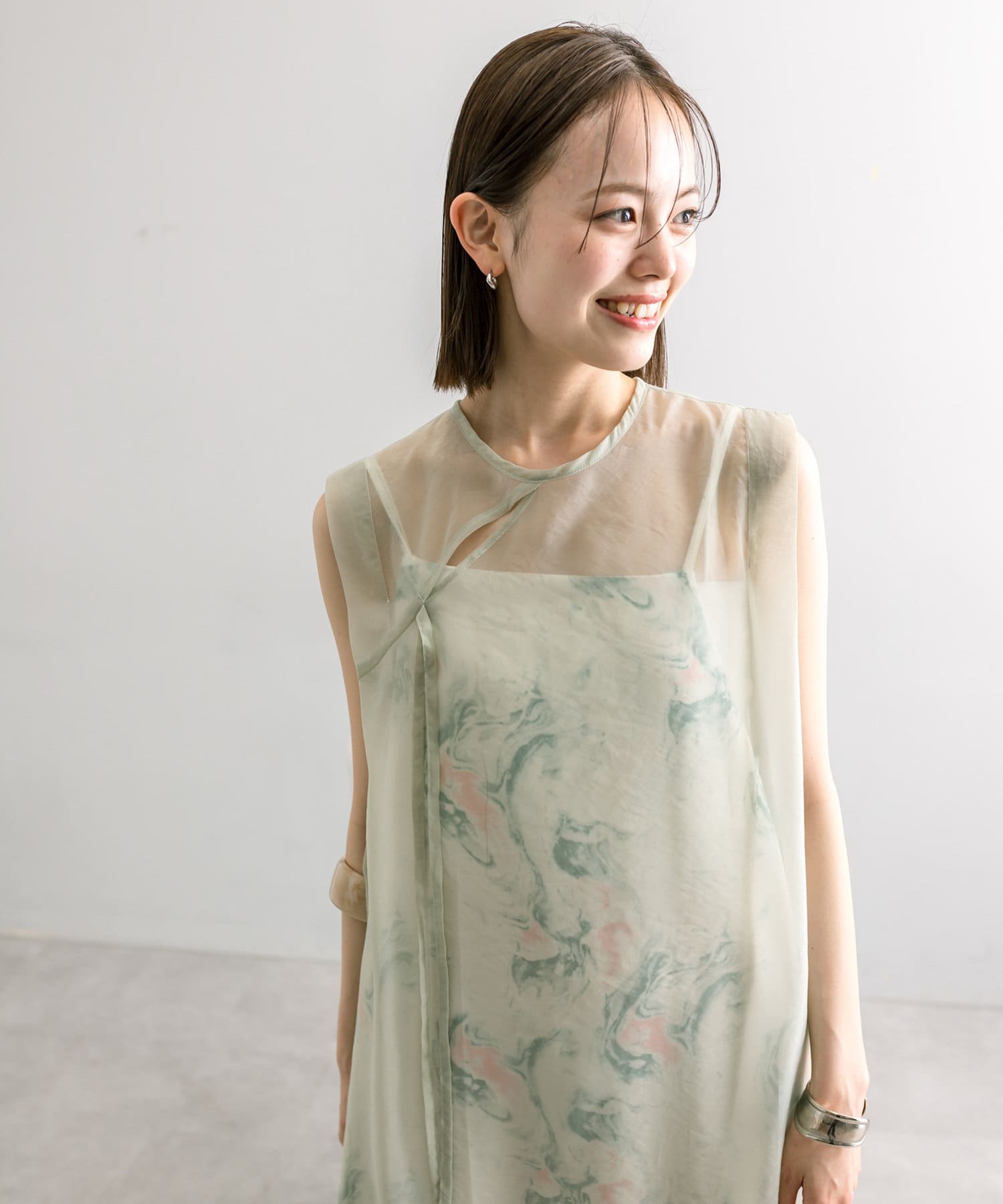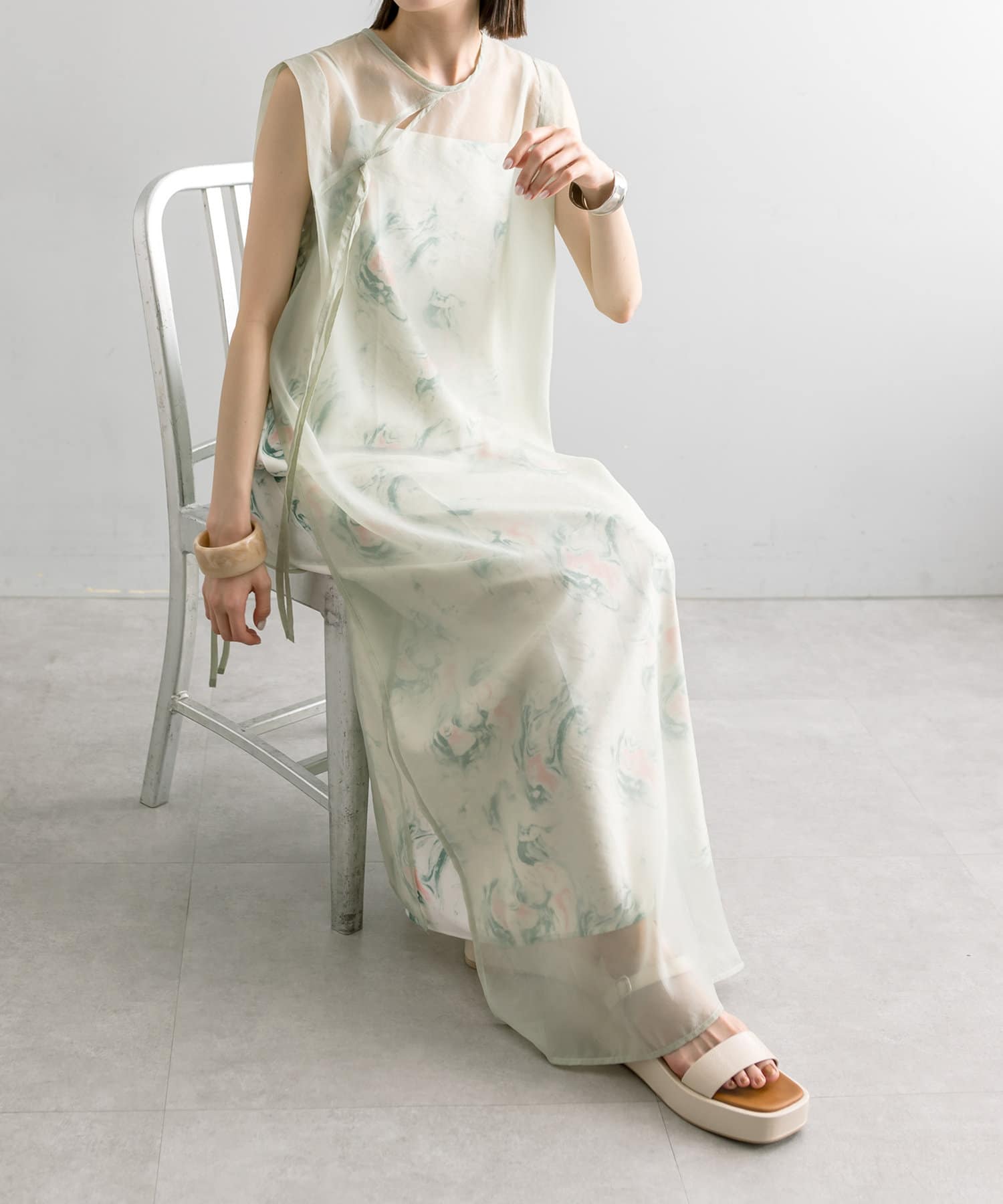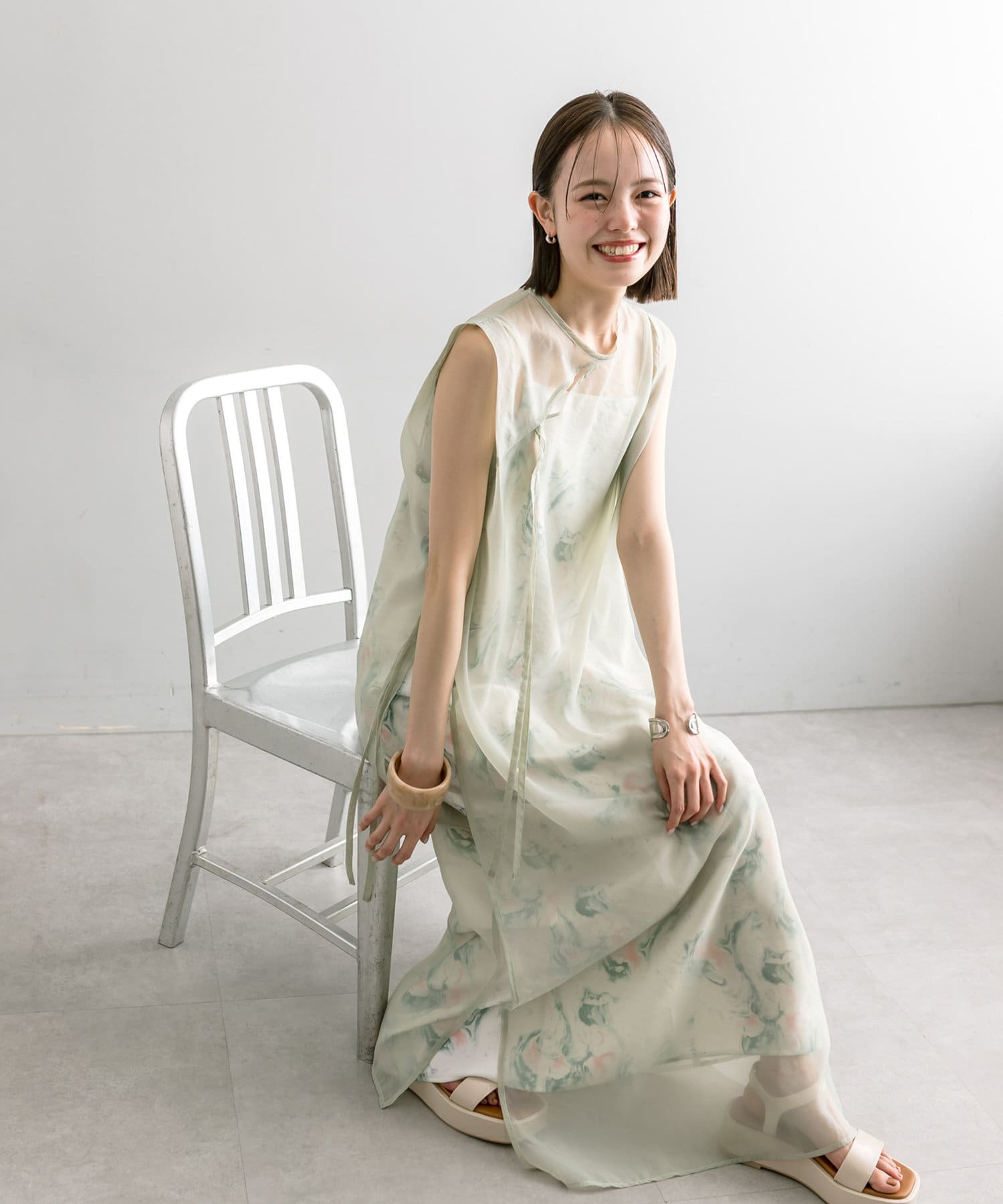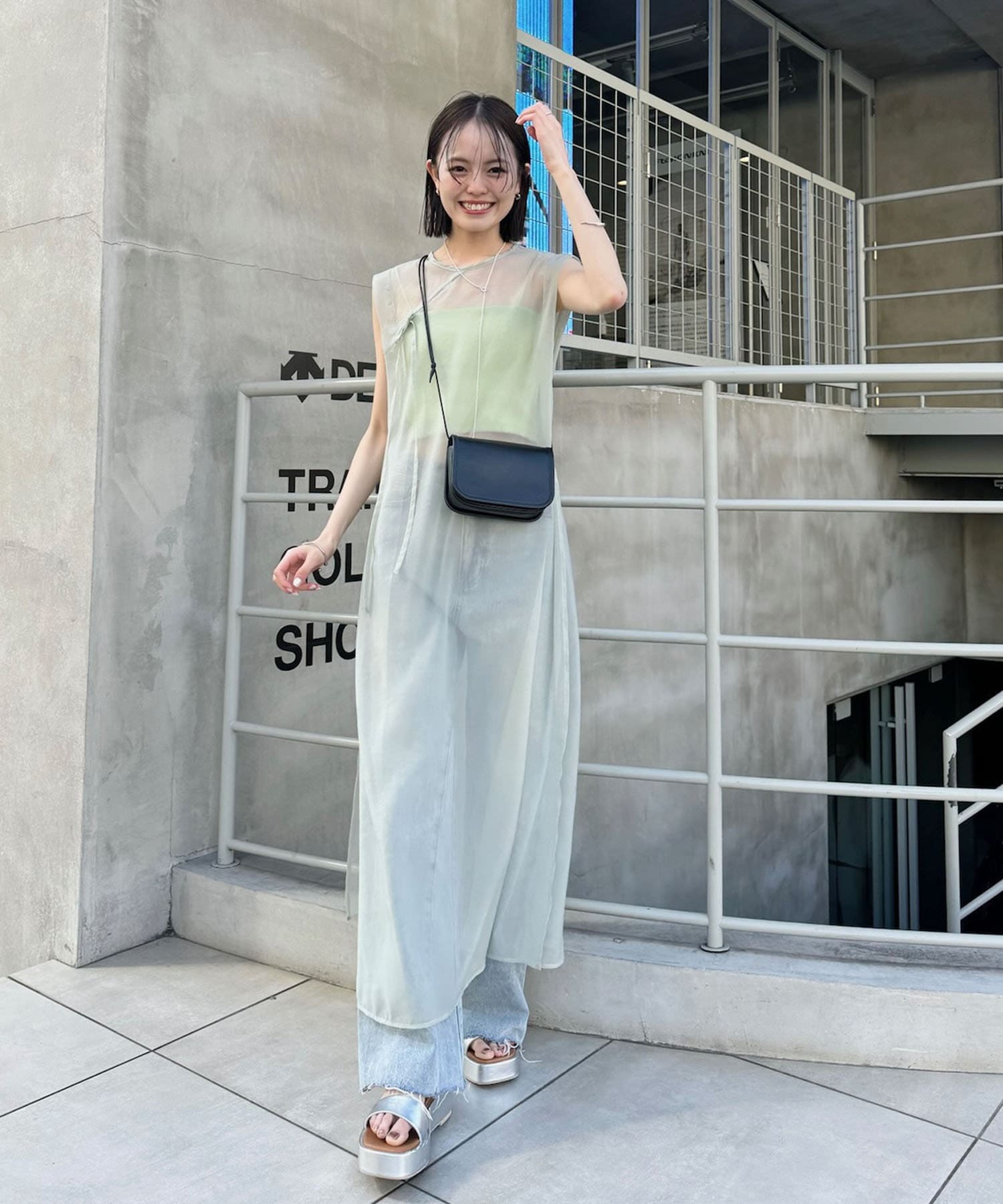 ・シアーワンピースはデニムやパンツスタイルに重ねて着ていただくのもおすすめ。
