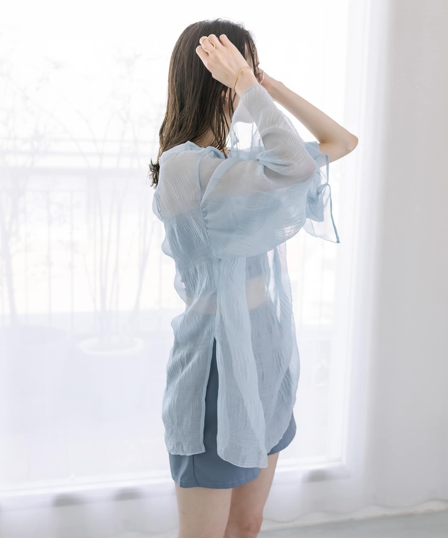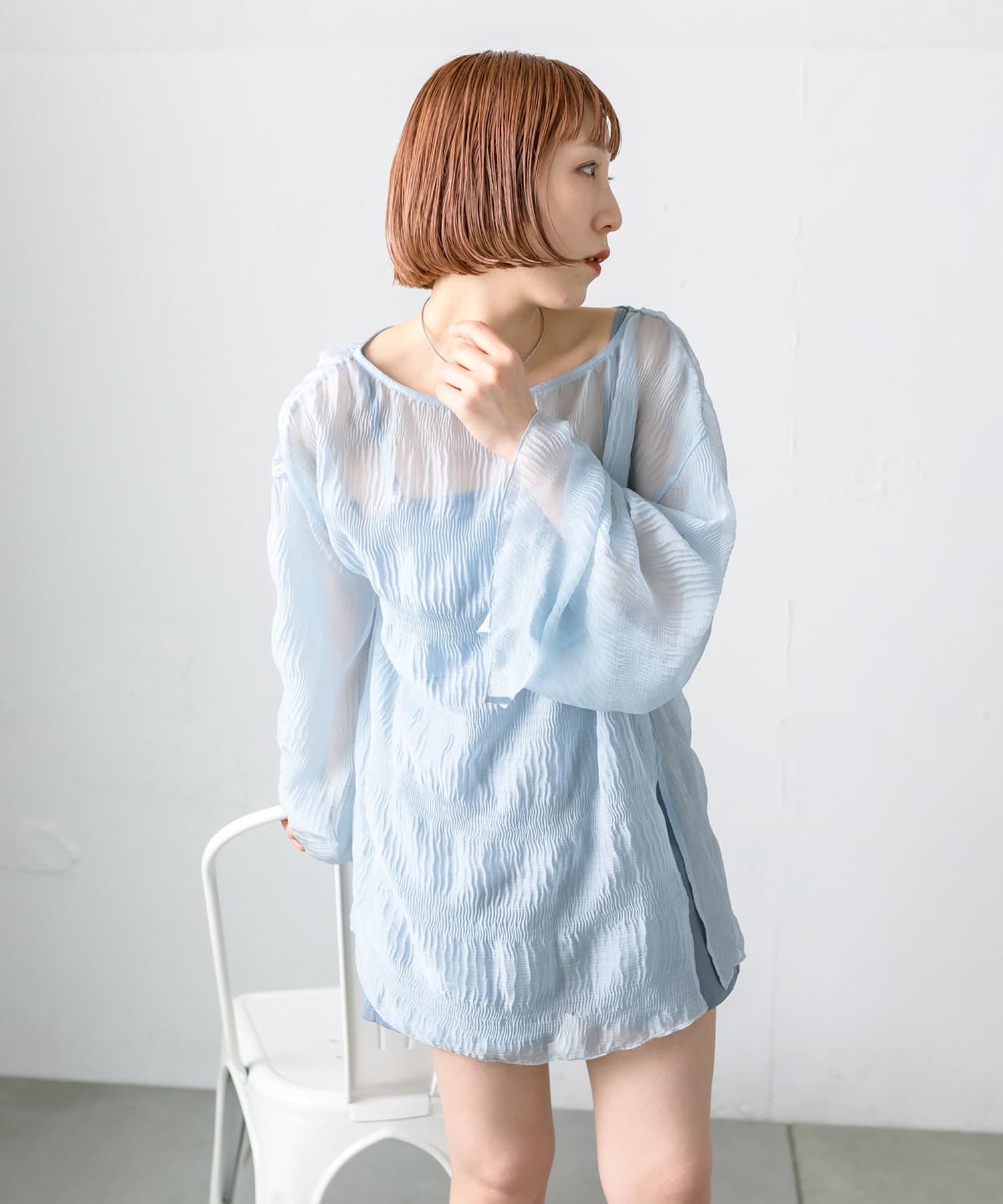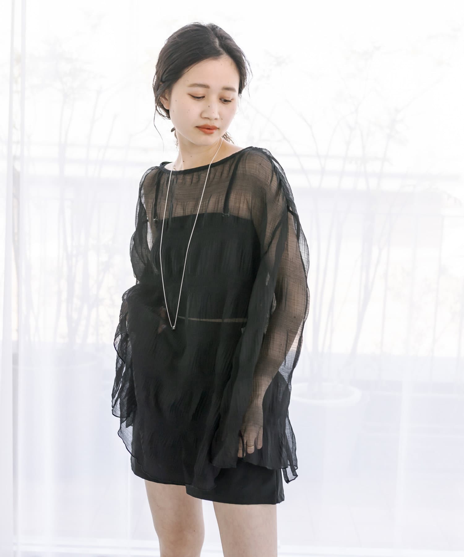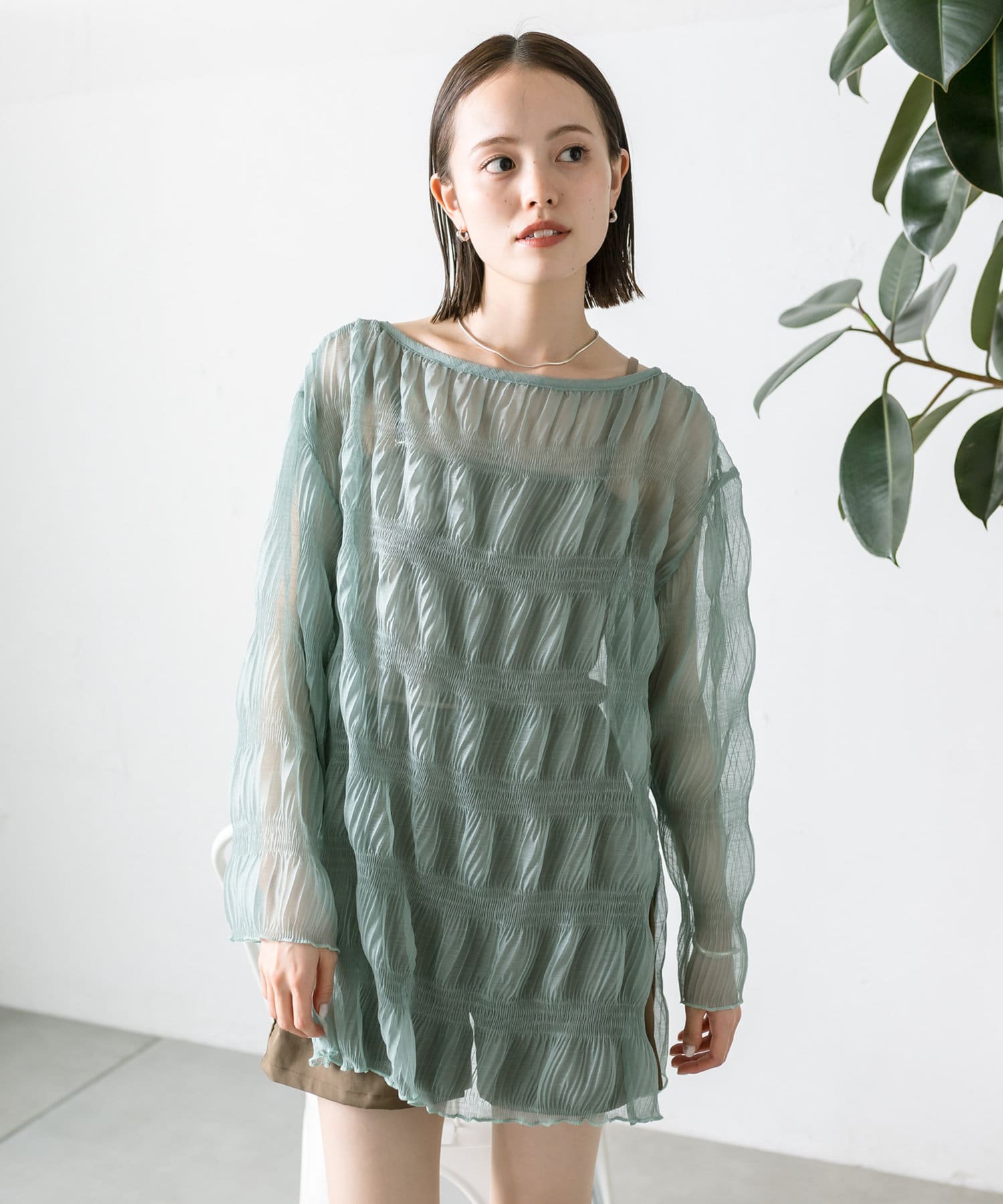 ・シアーブラウスはヒップラインが隠れる長めの丈感。