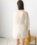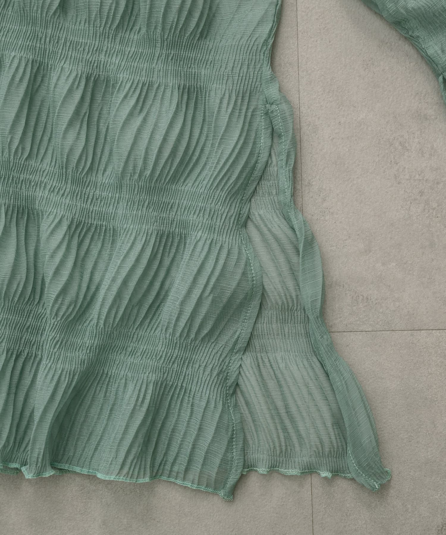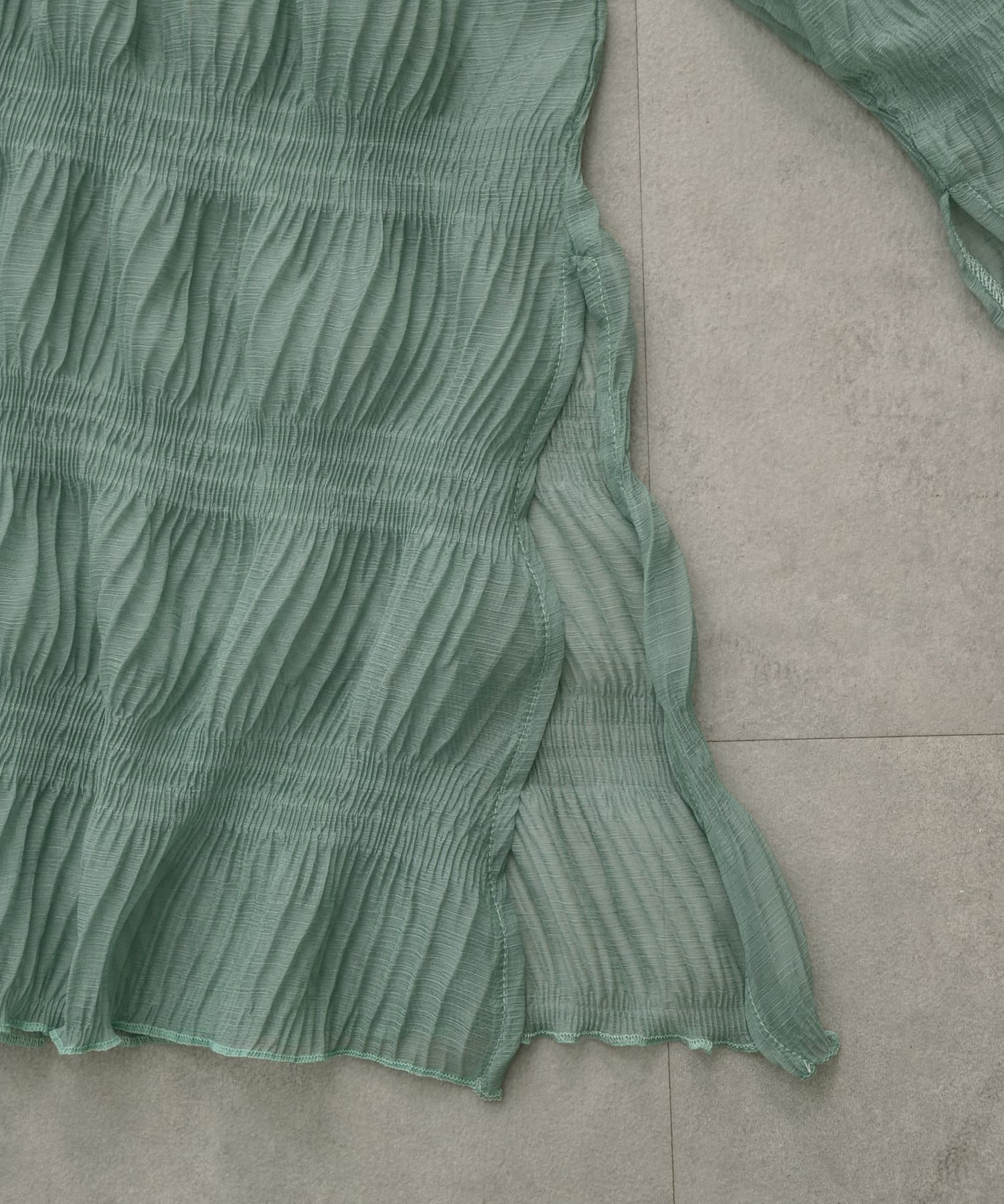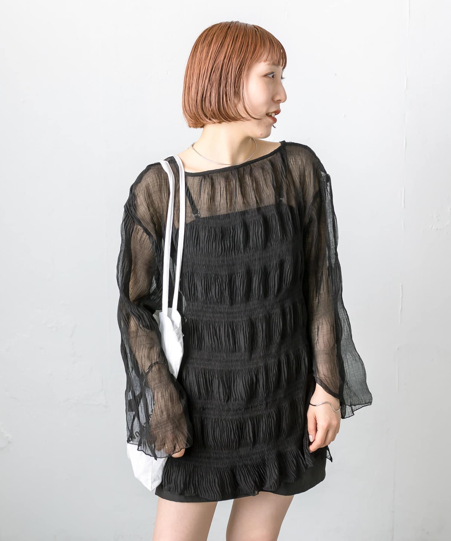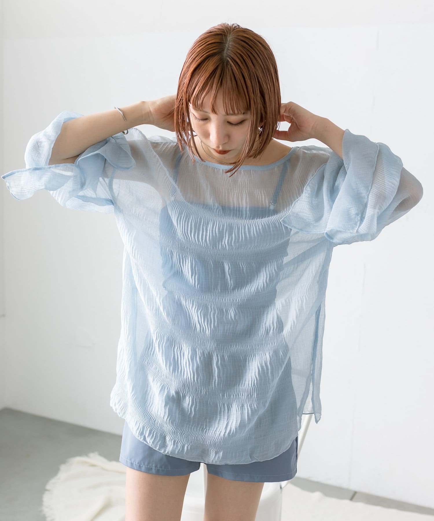 ・シアーブラウスはヒップラインが隠れる長めの丈感。