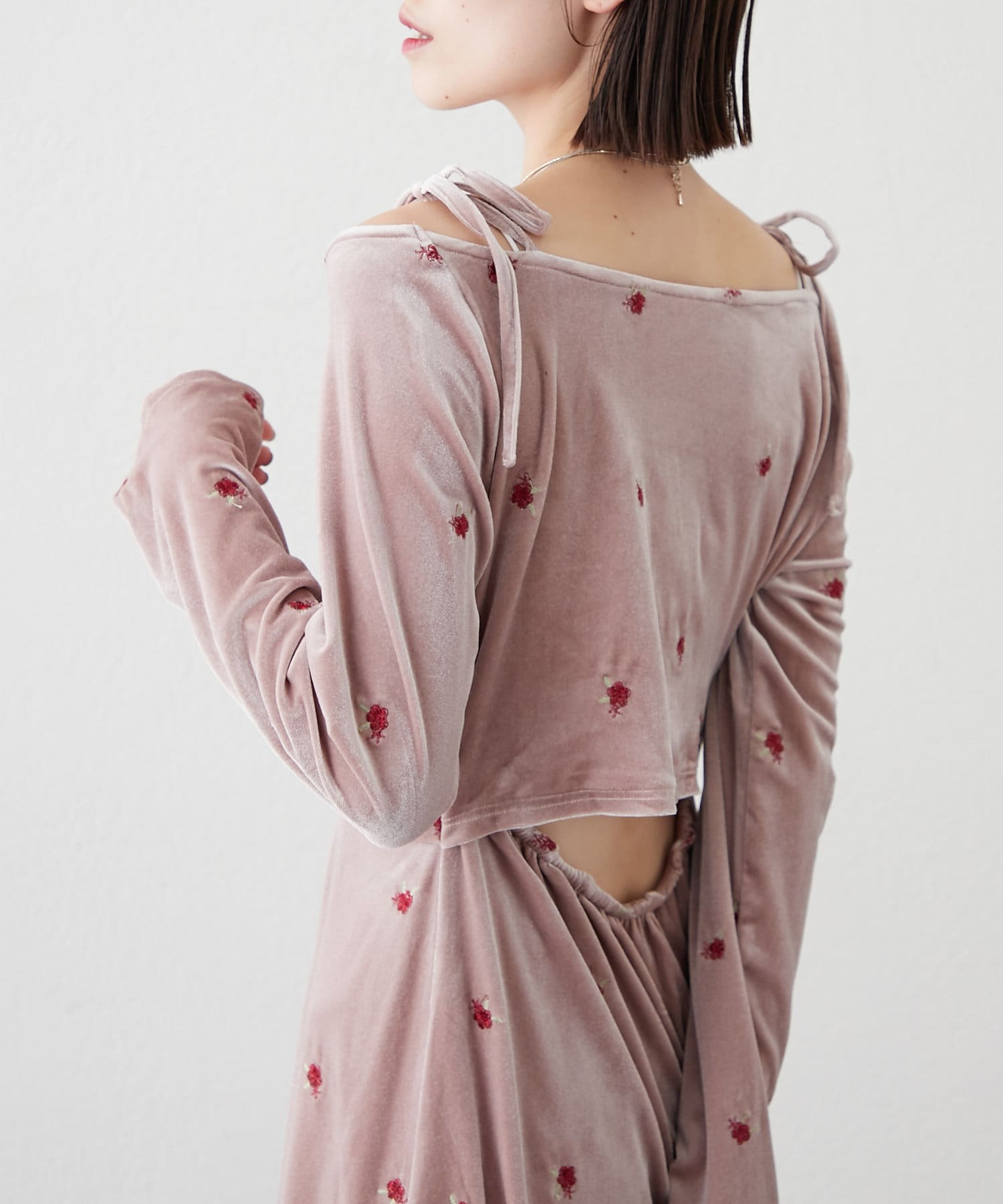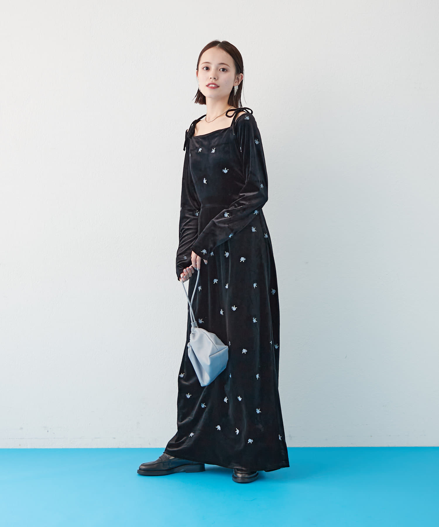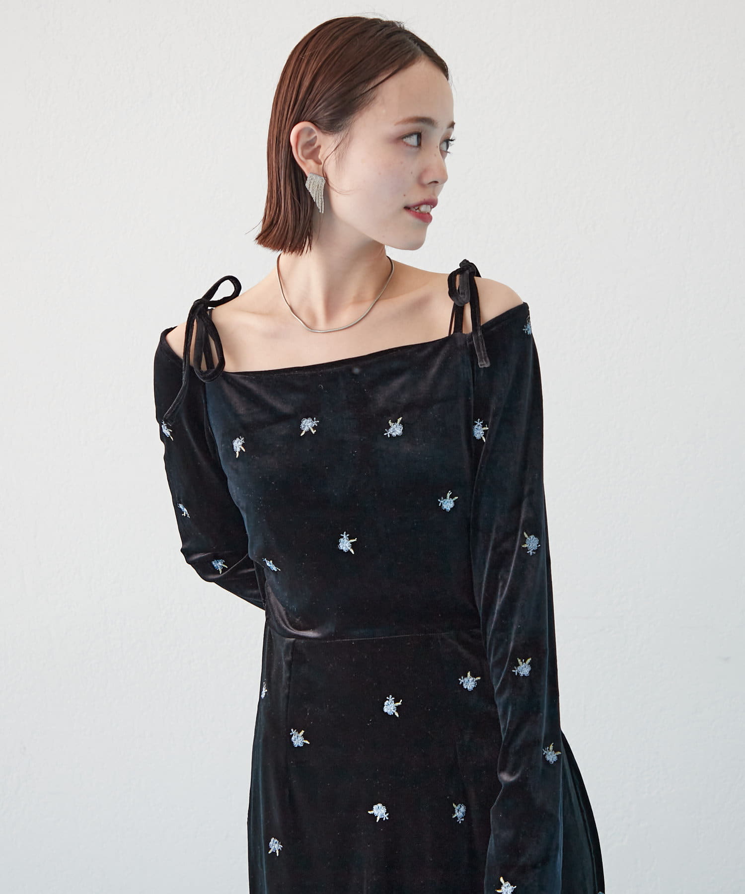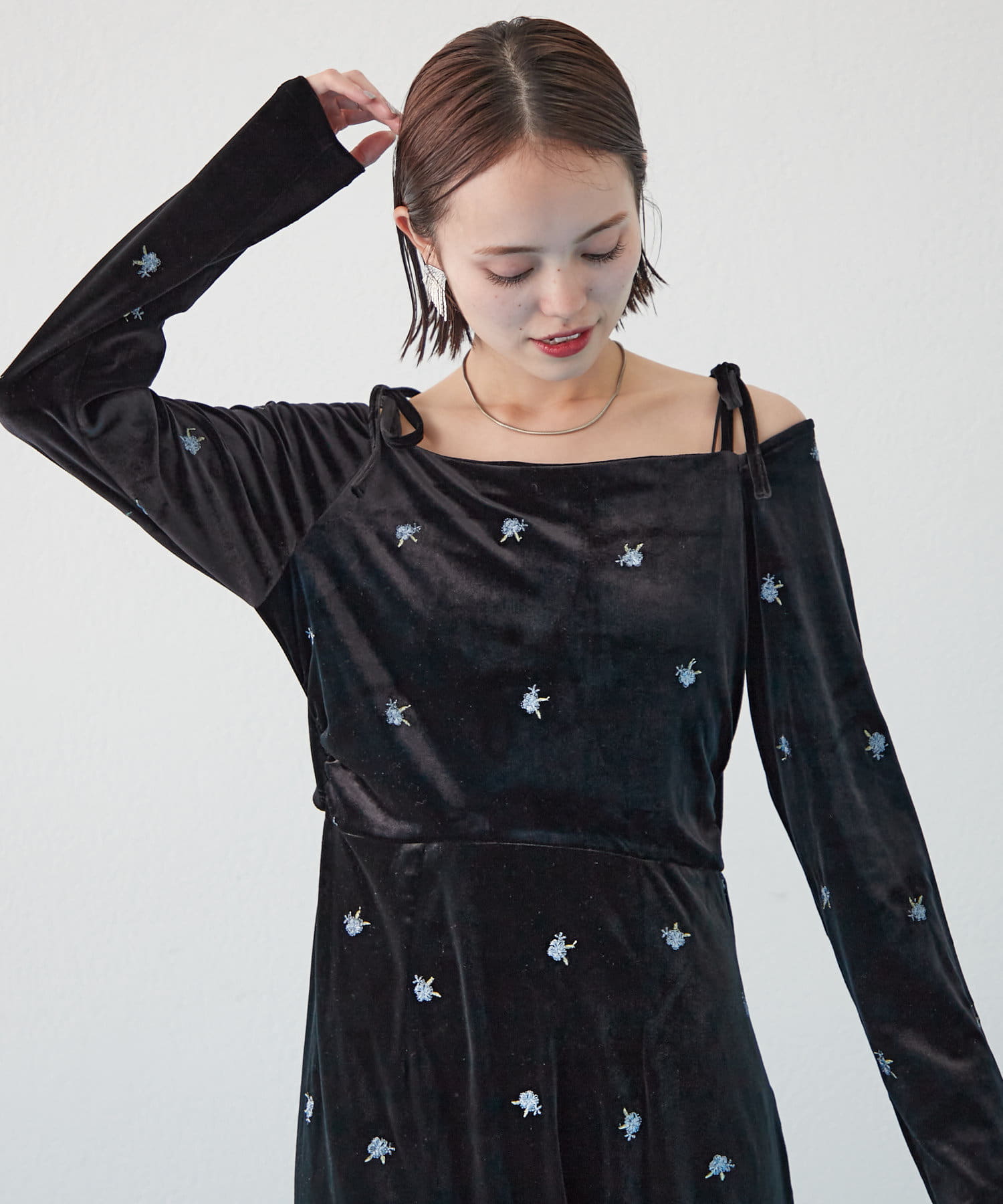 ・大人っぽいベロア素材でお花の刺繍がポイントの高見えワンピ♡!