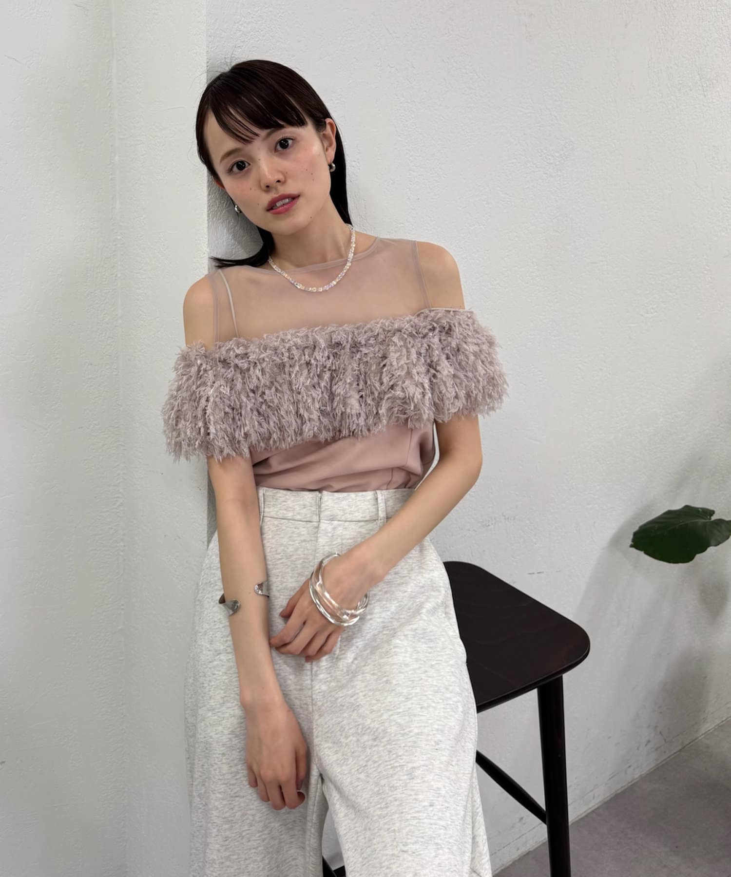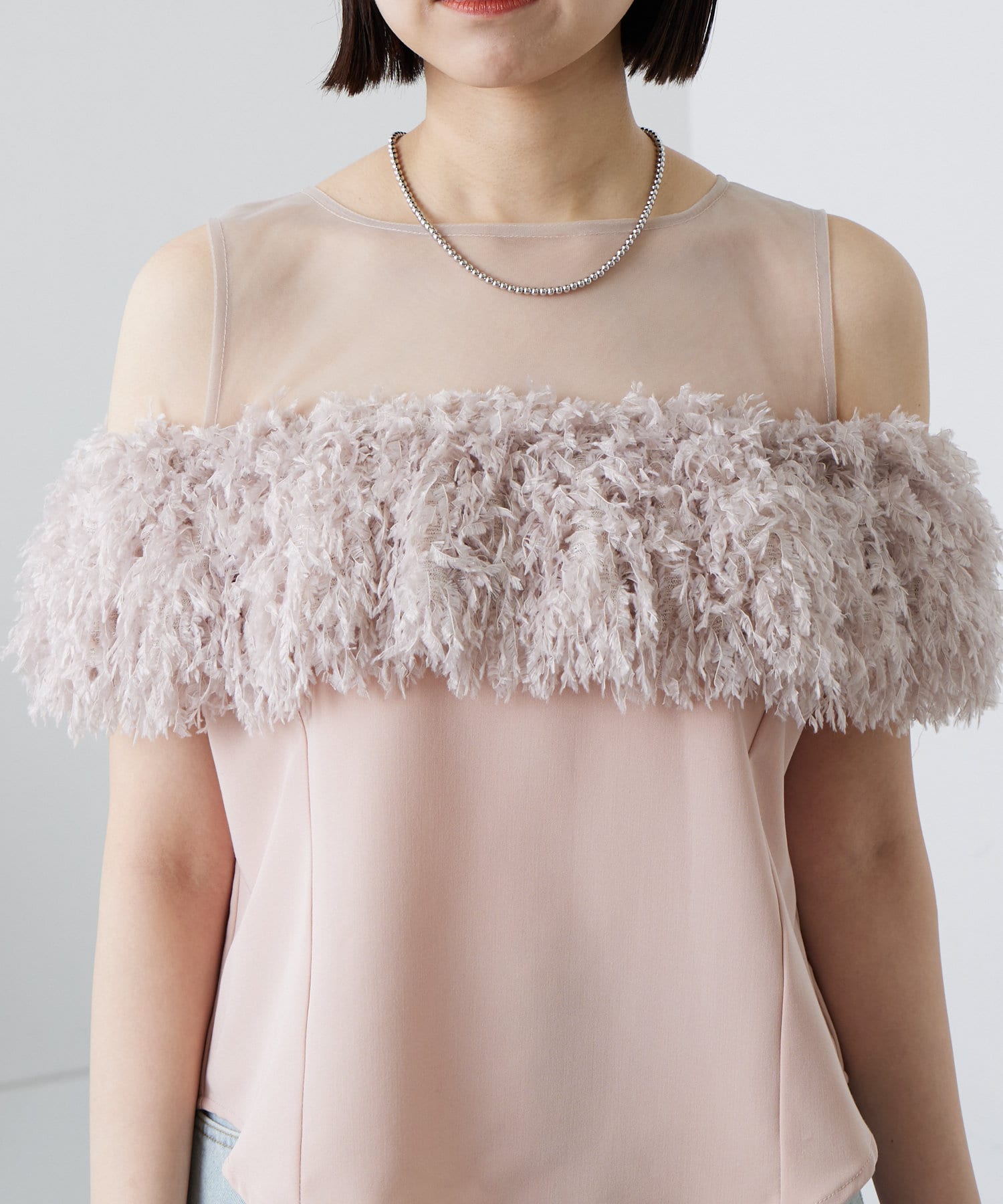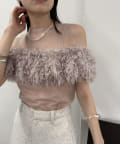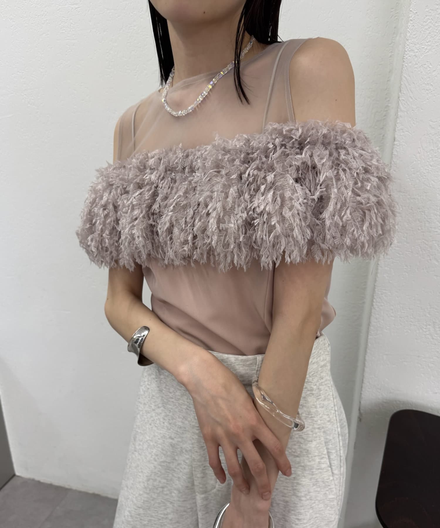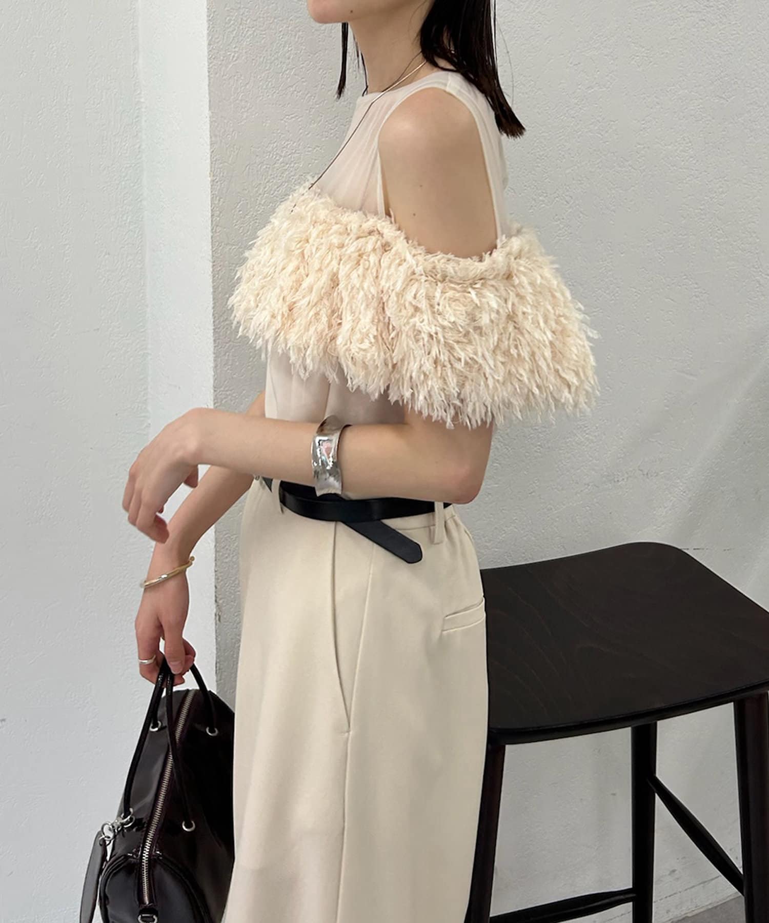 肌触りの良いフェザー素材が女性らしく着になる二の腕周りもすっきりと見せてくれます。