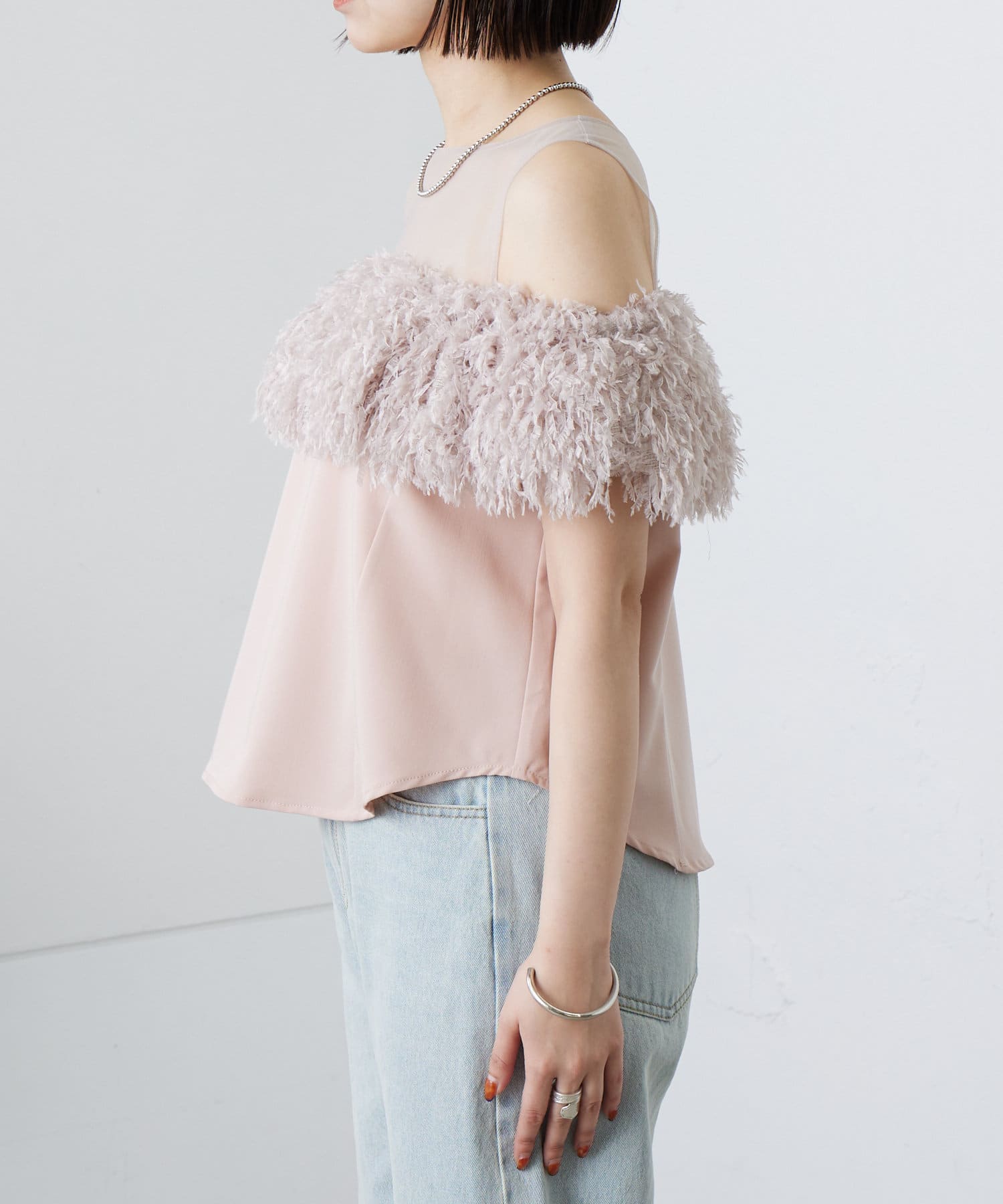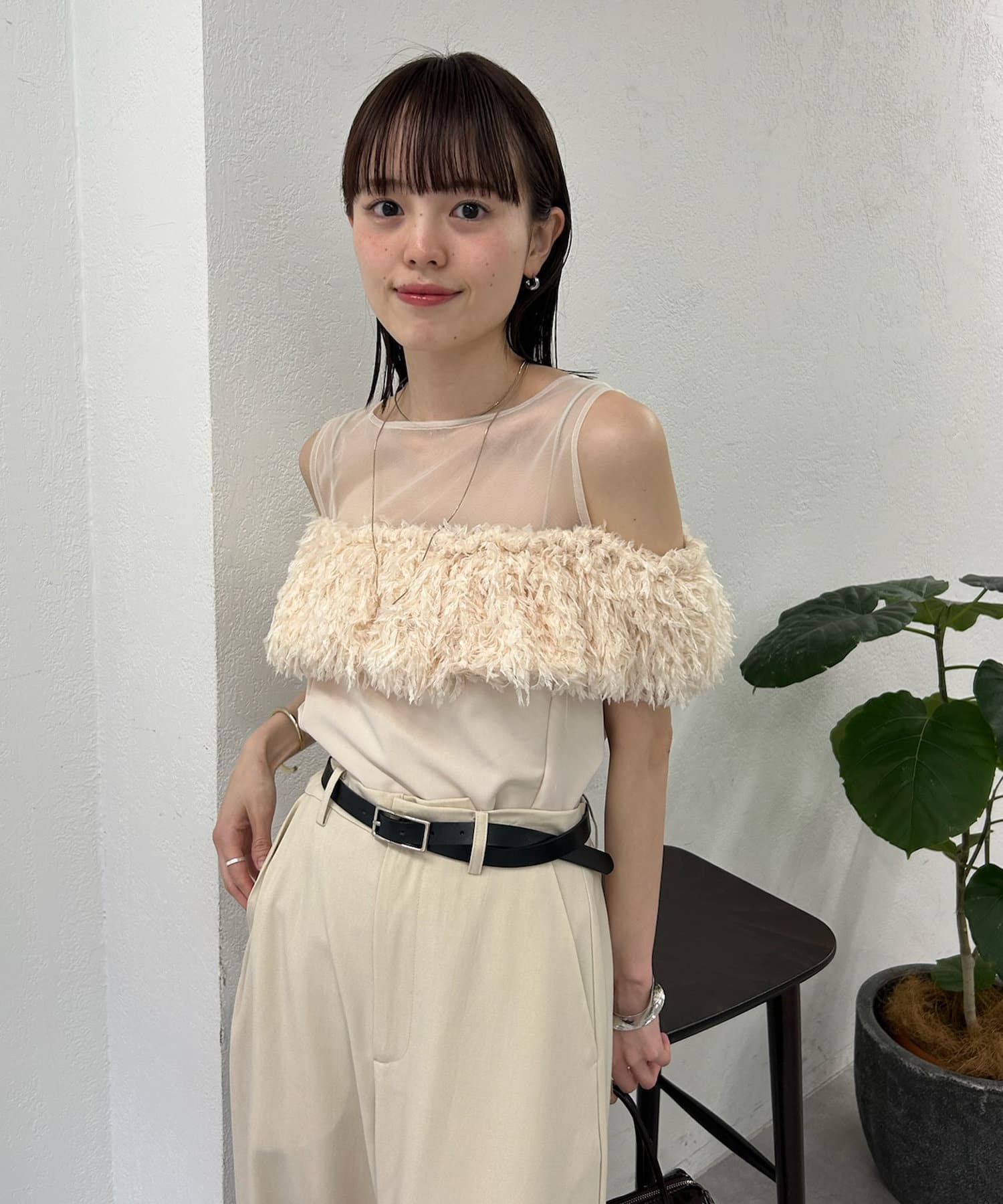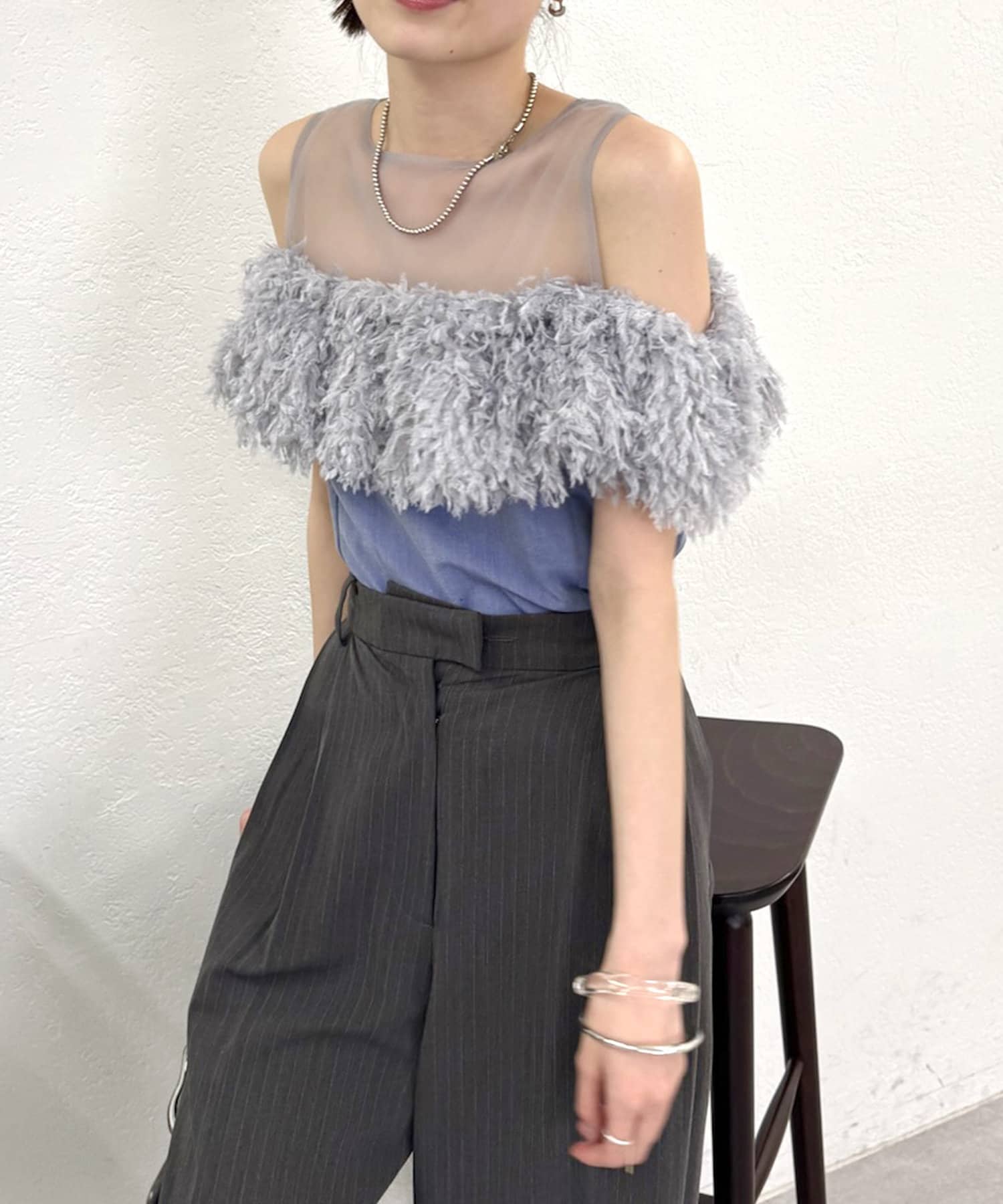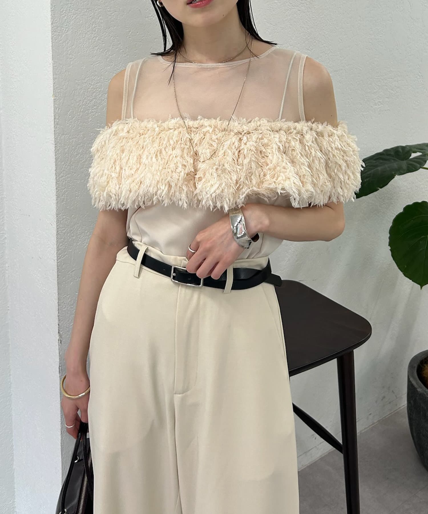 肌触りの良いフェザー素材が女性らしく着になる二の腕周りもすっきりと見せてくれます。