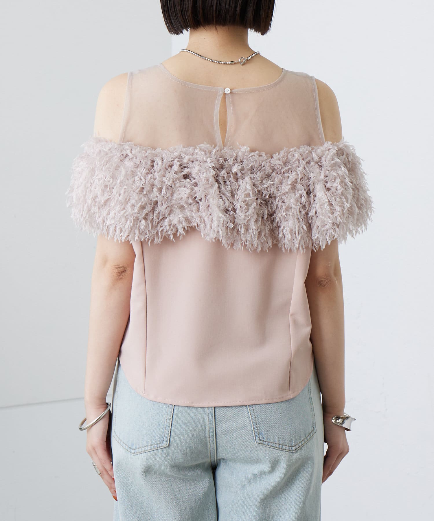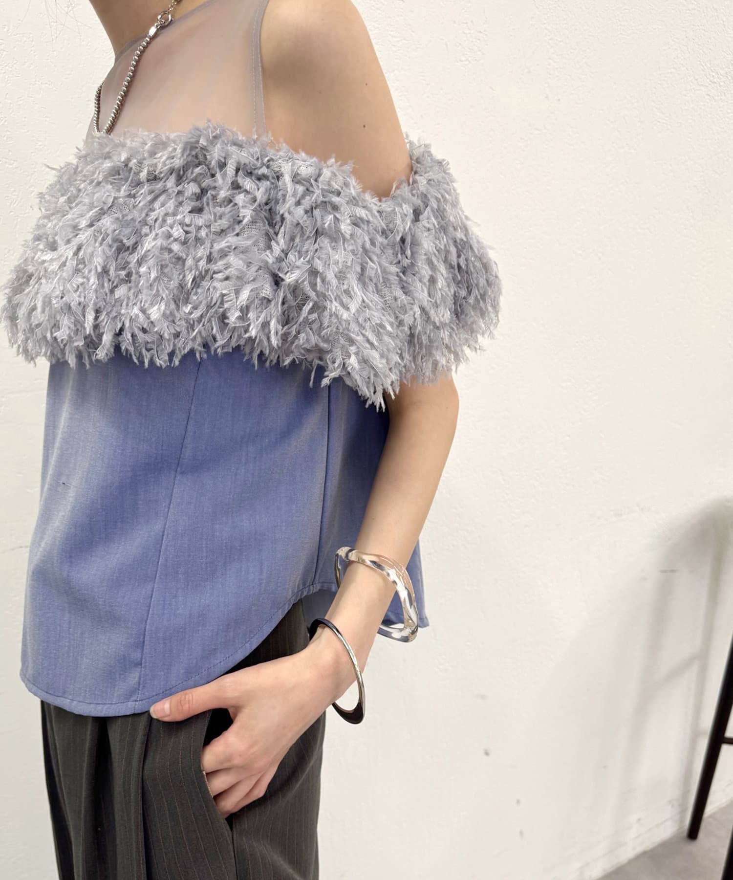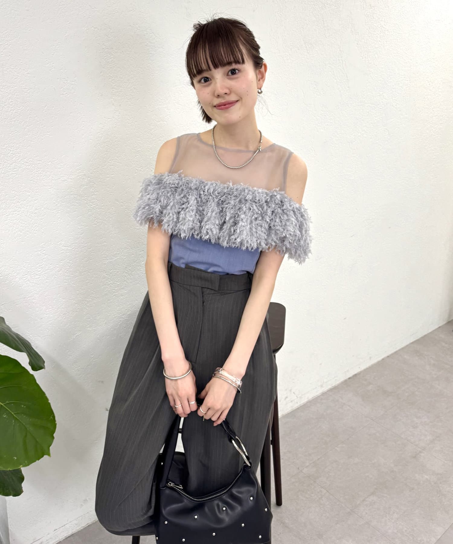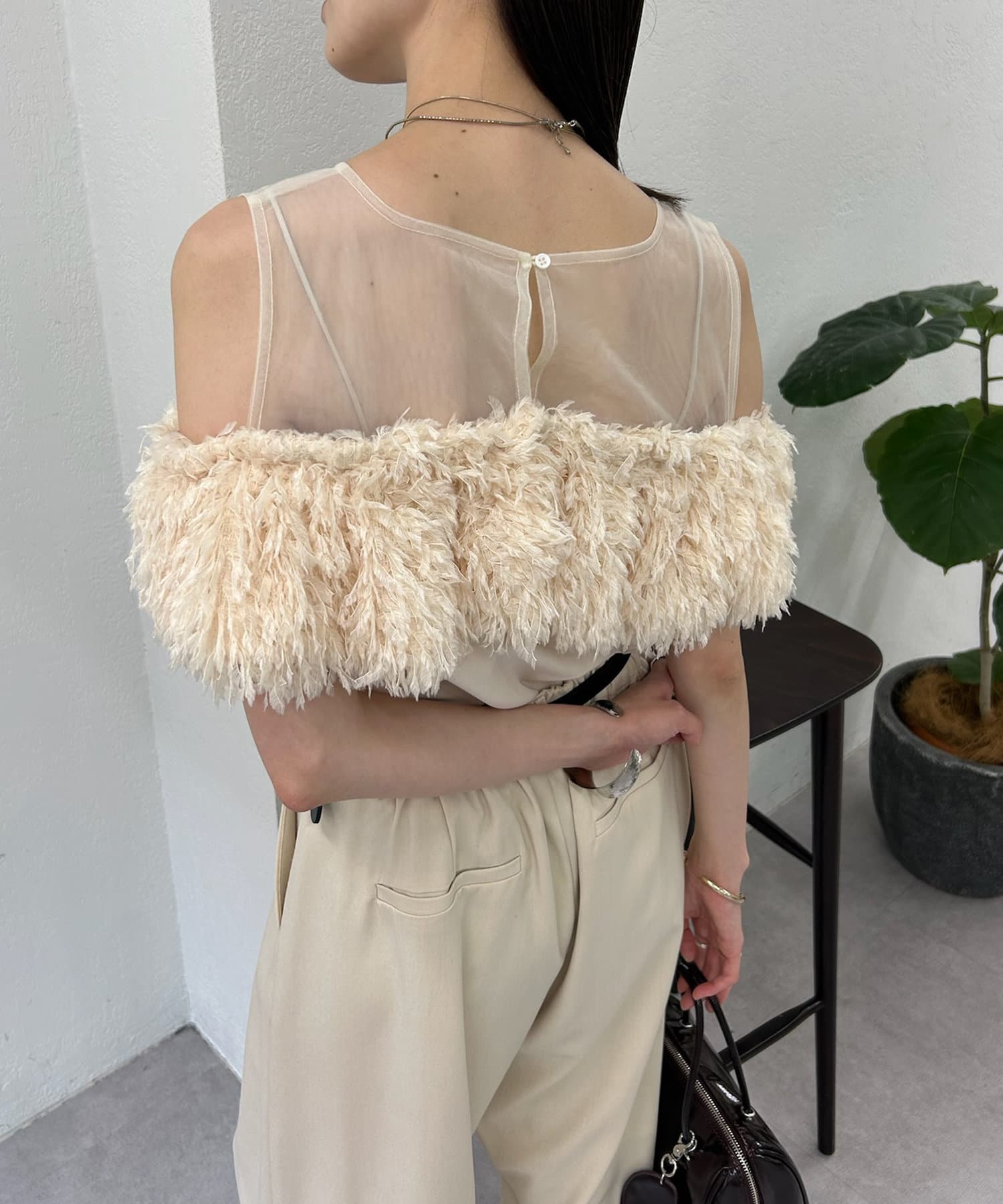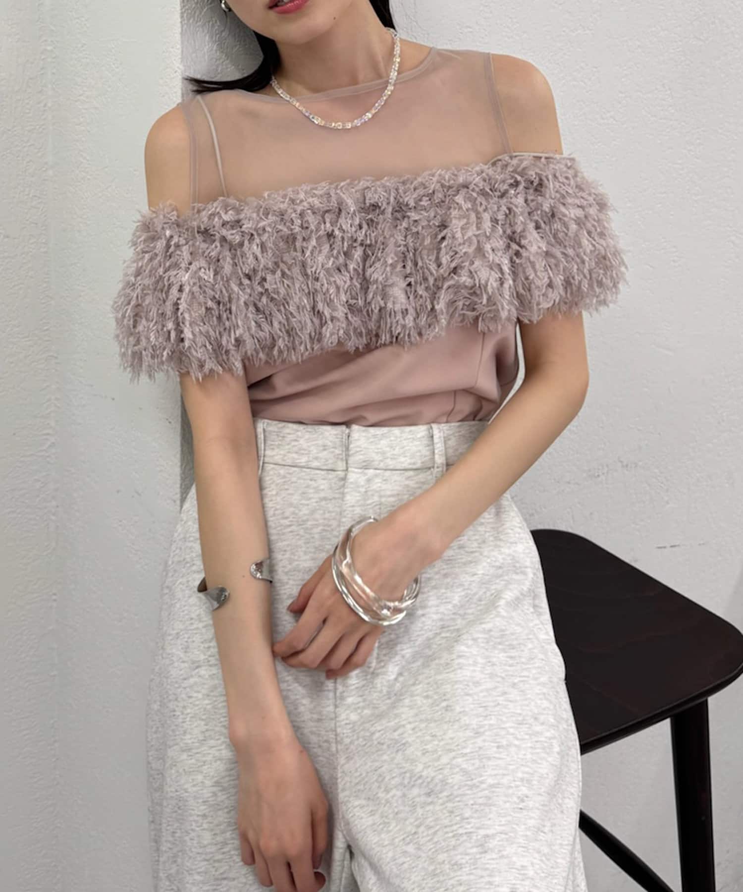 肌触りの良いフェザー素材が女性らしく着になる二の腕周りもすっきりと見せてくれます。