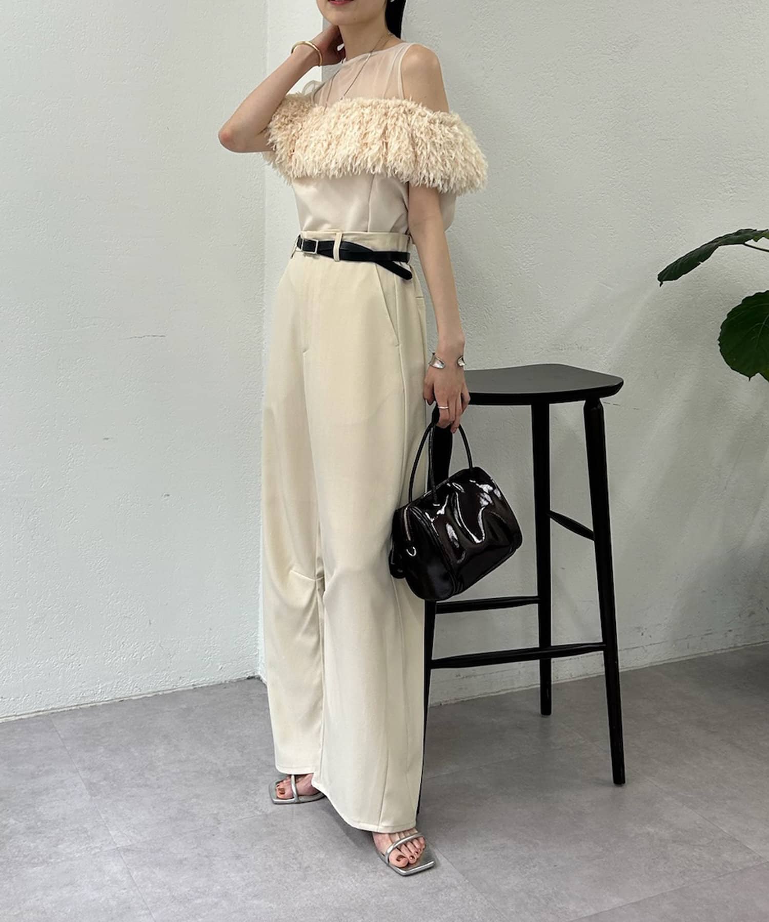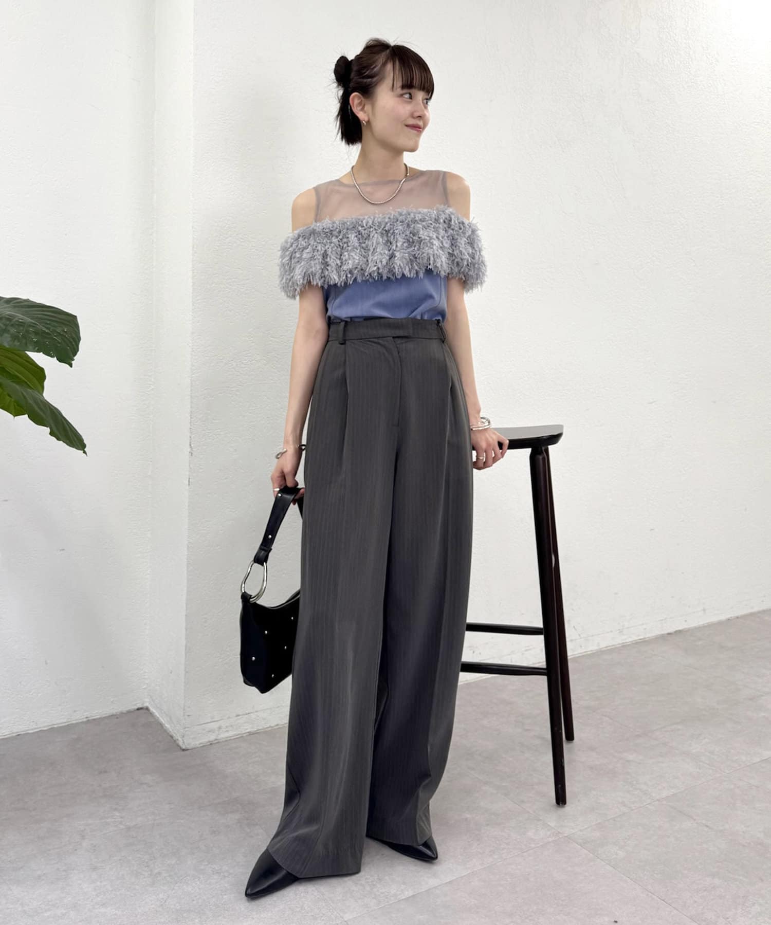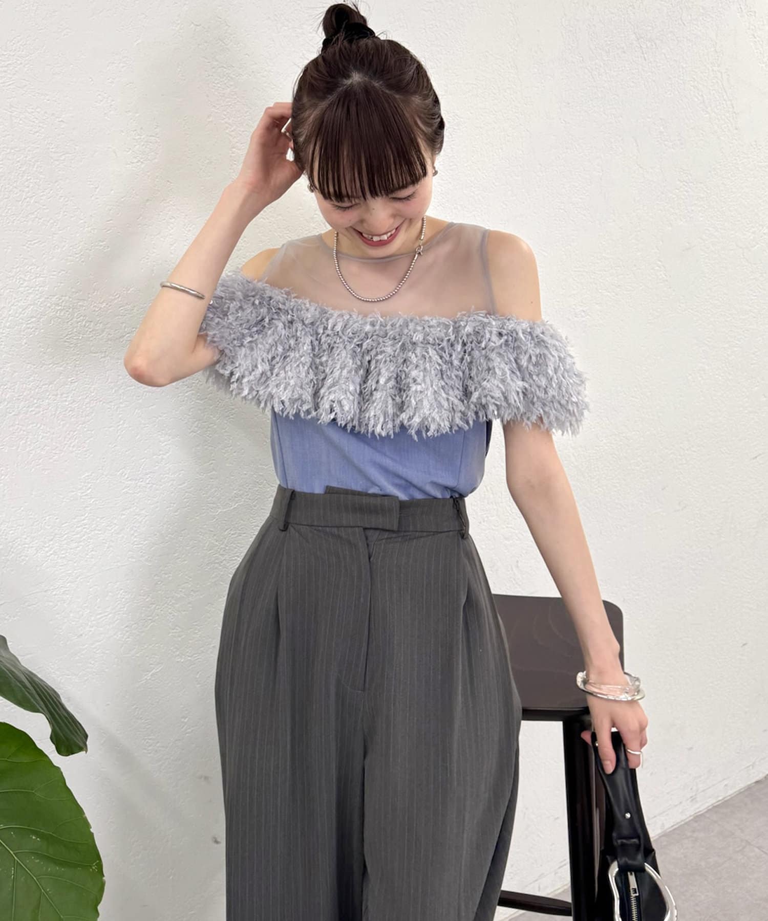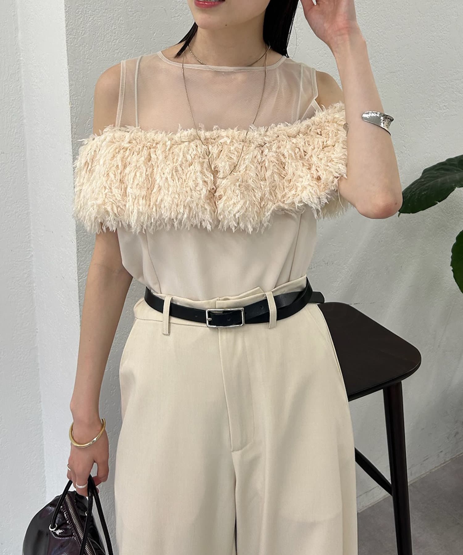 肌触りの良いフェザー素材が女性らしく着になる二の腕周りもすっきりと見せてくれます。