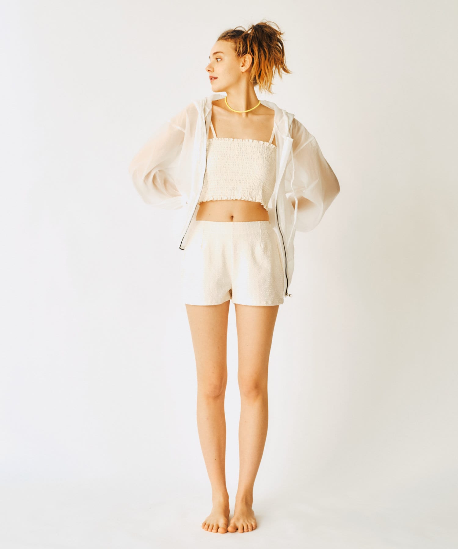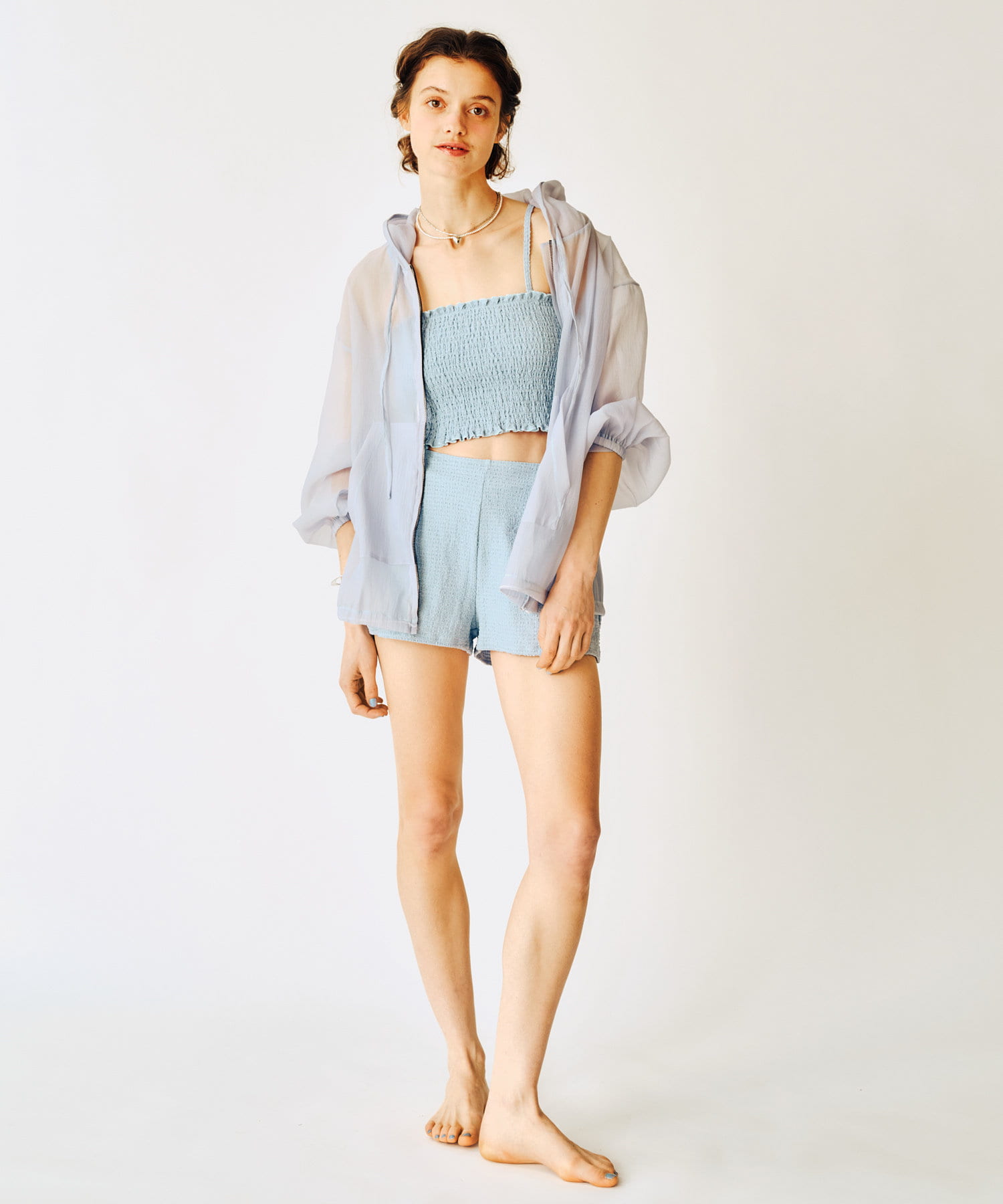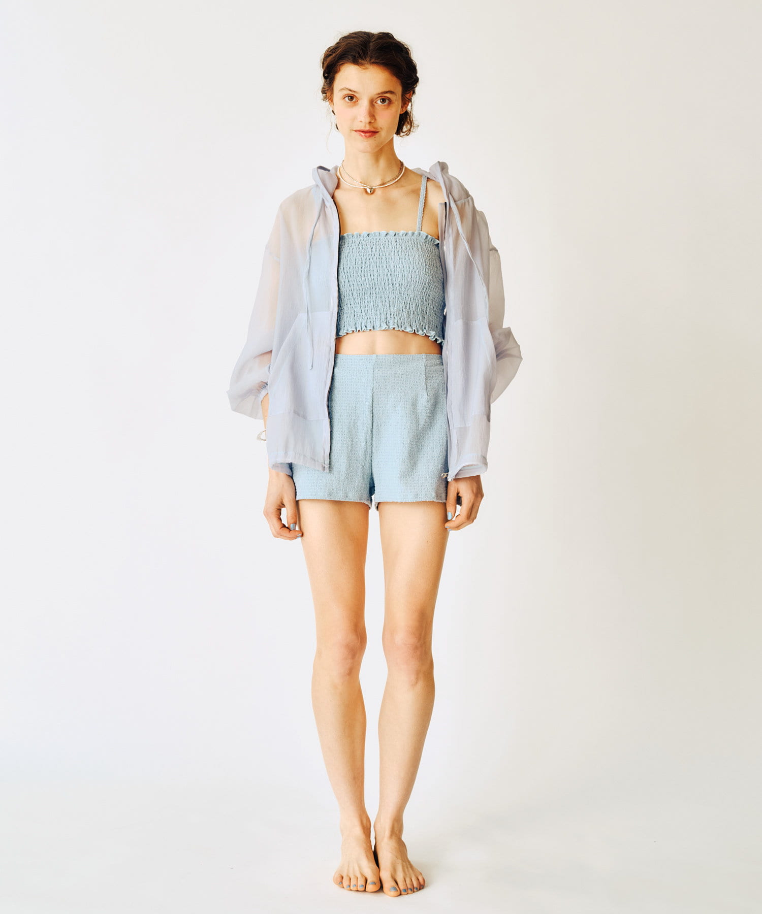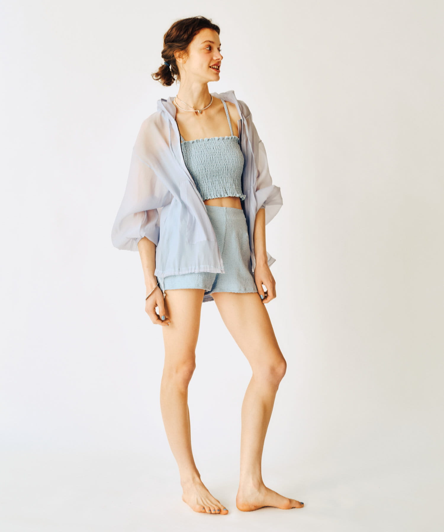 透け感のあるシアー素材のパーカーと、軽やかな着心地のキャミ、ショートパンツ、ショーツの4点セット。