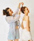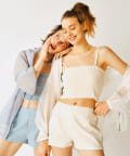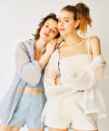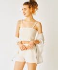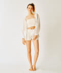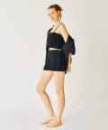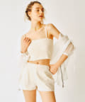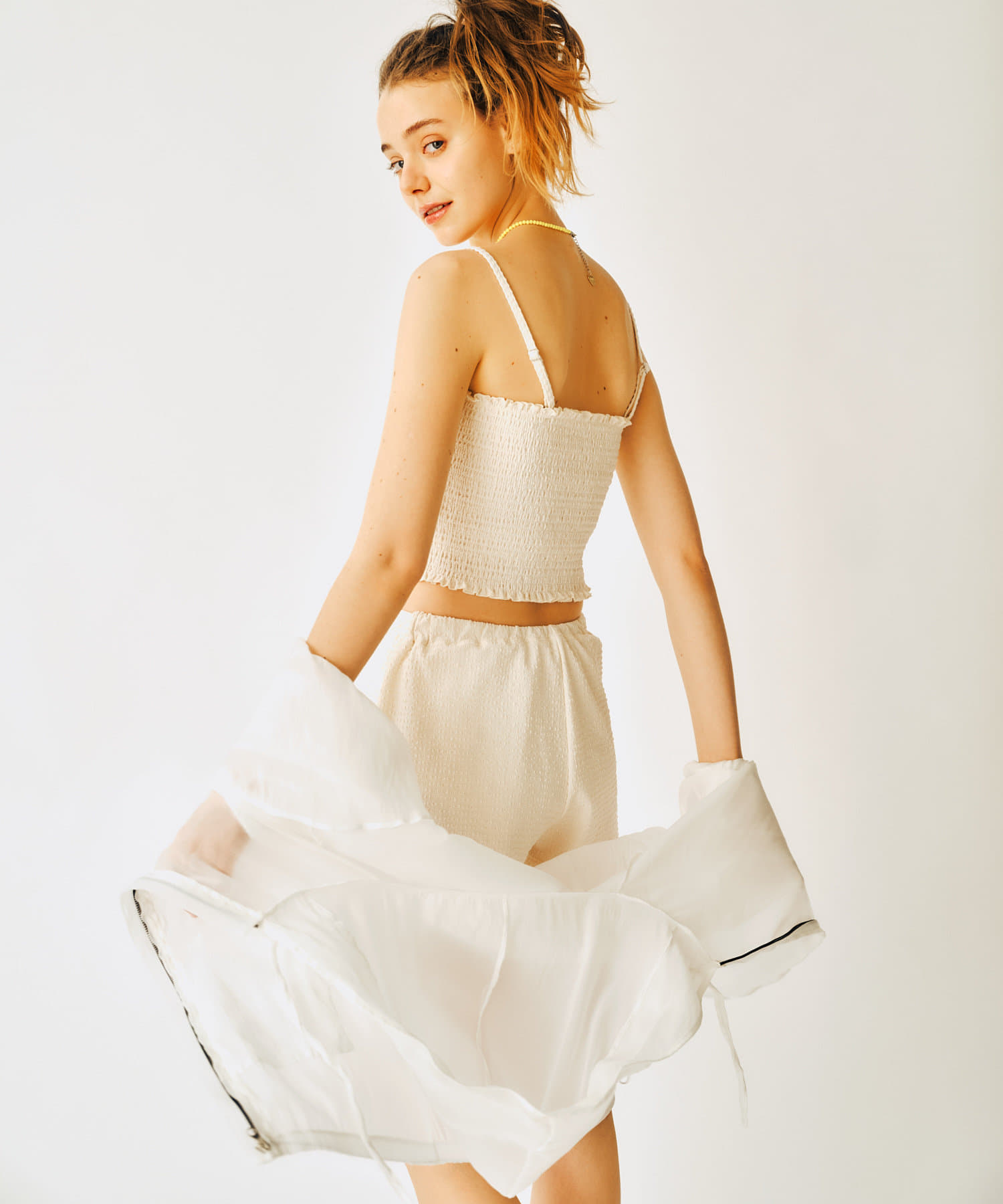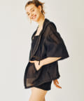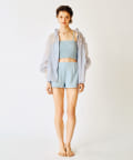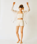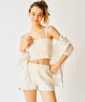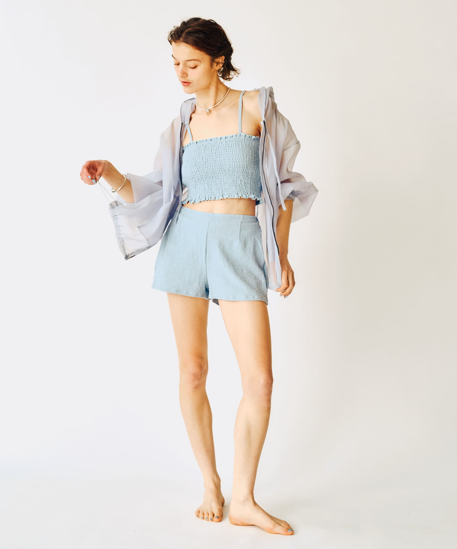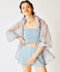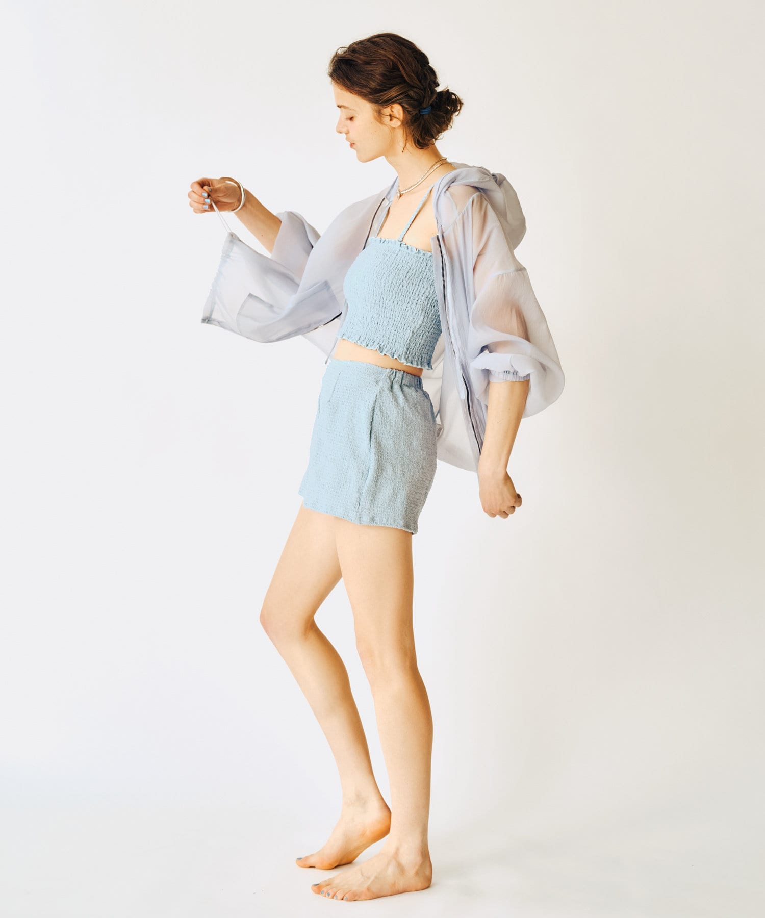 透け感のあるシアー素材のパーカーと、軽やかな着心地のキャミ、ショートパンツ、ショーツの4点セット。