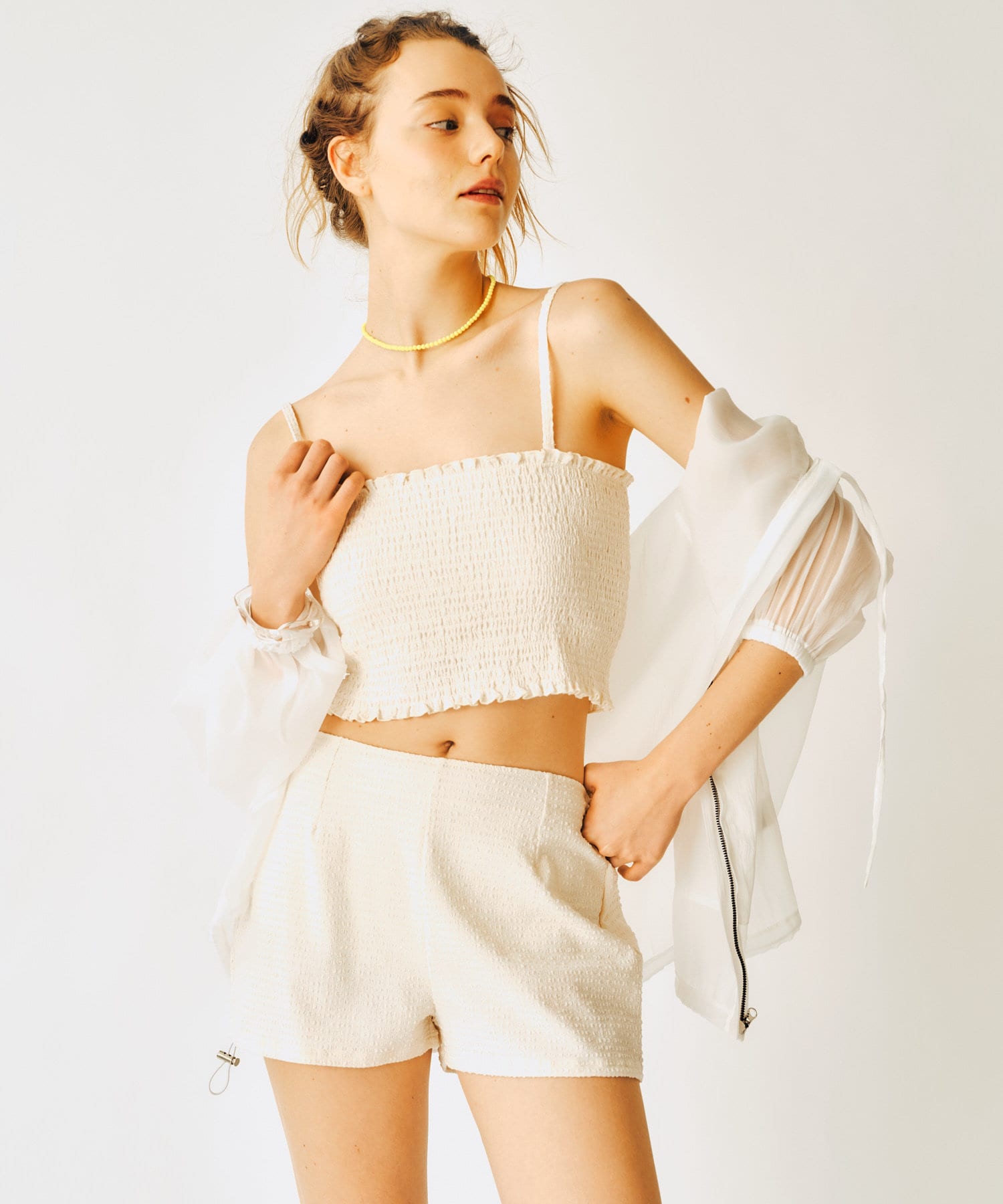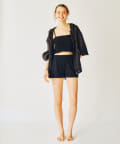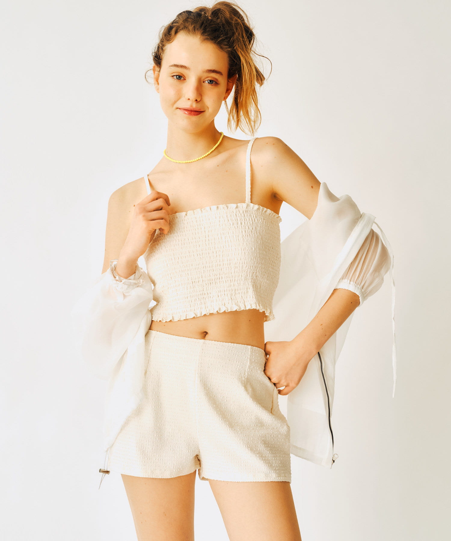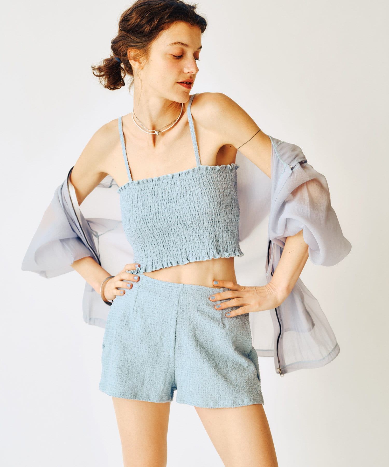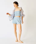 ショーツはハイウエストですっきりとしたシルエット。ショートパンツも程よく短めの丈感で、脚長効果も◎