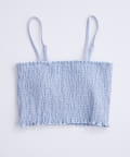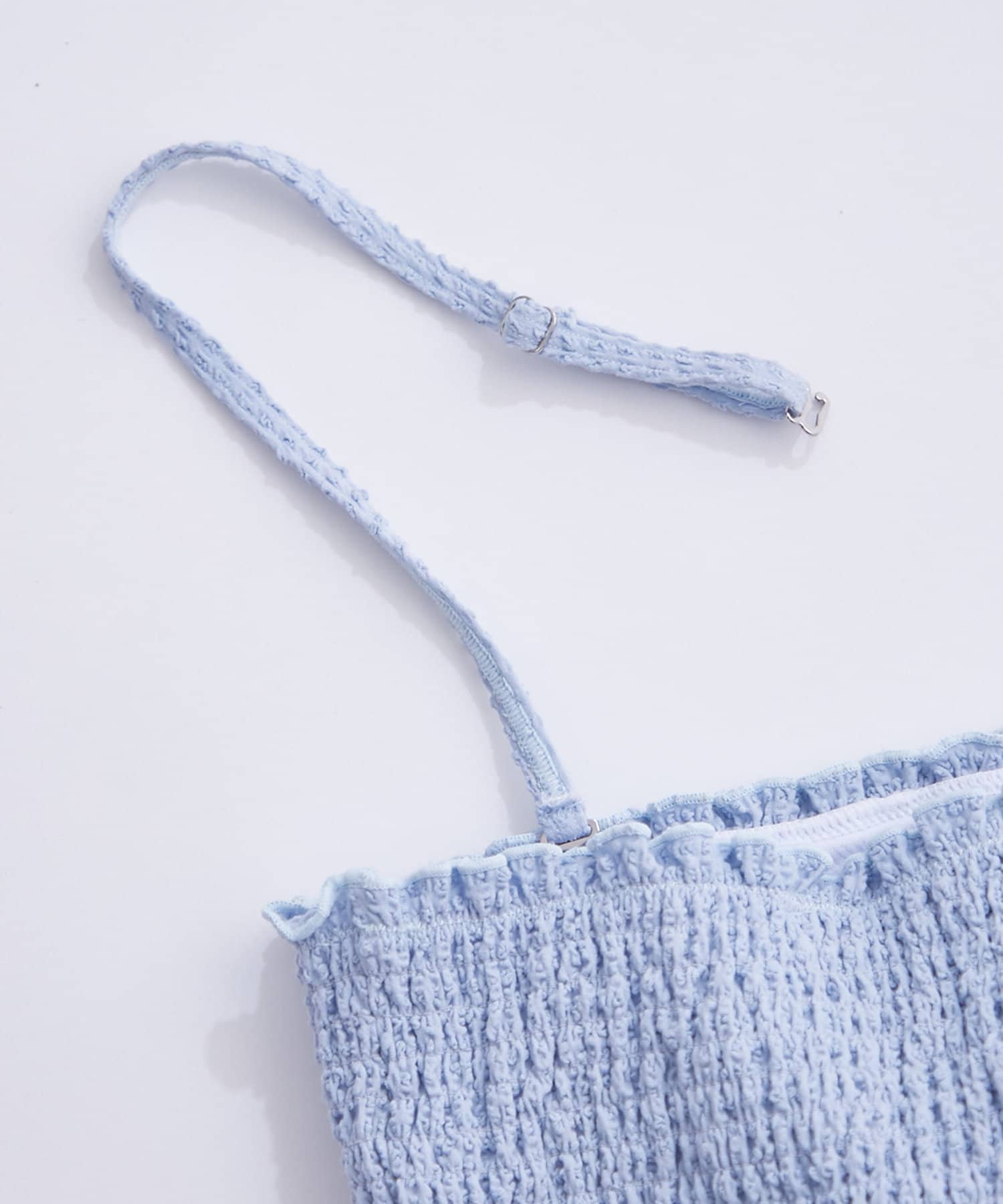 トップスはバストラインをカバーするシャーリングデザインで、体型カバーにも役立ちます◎