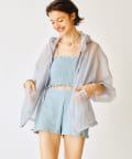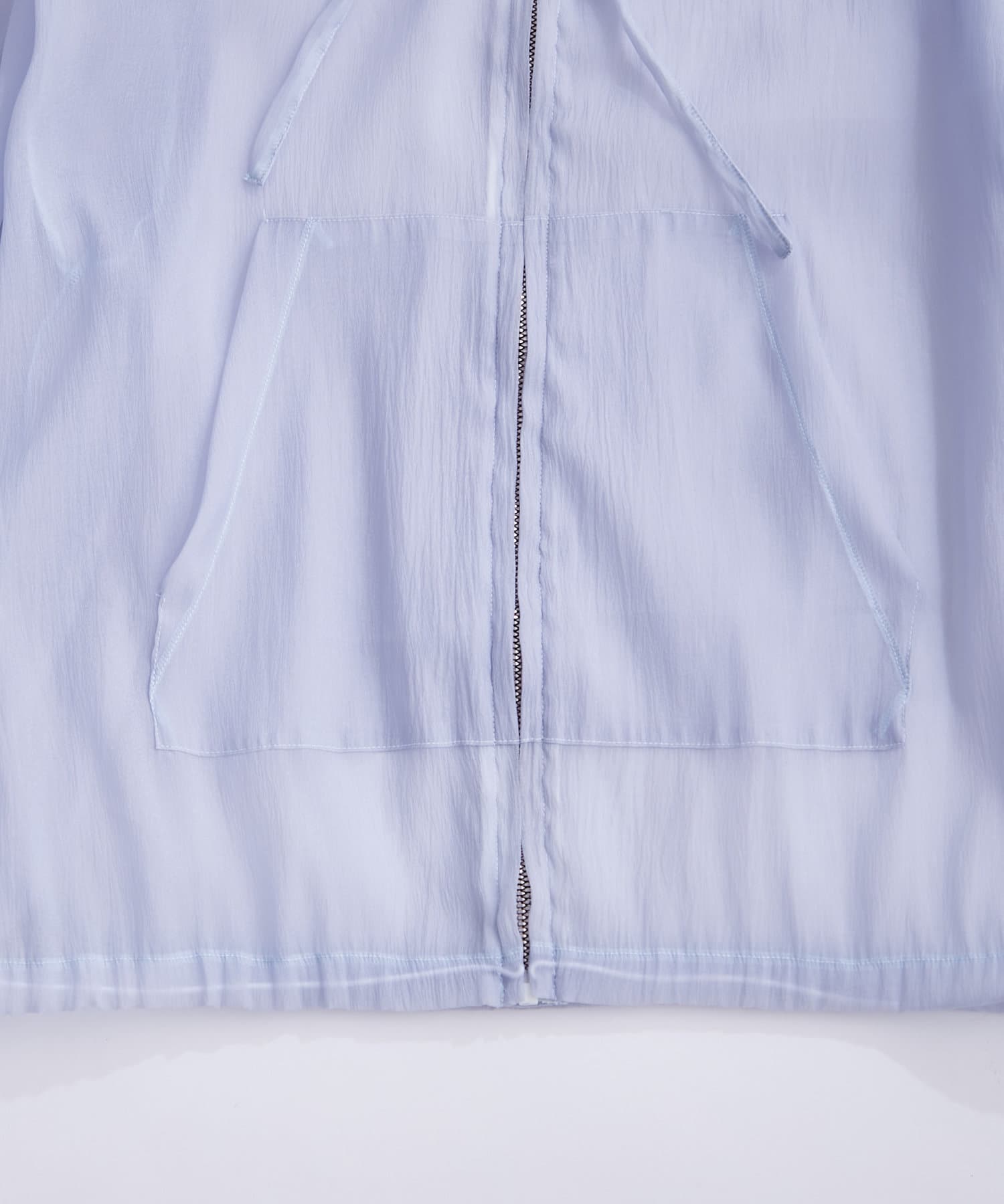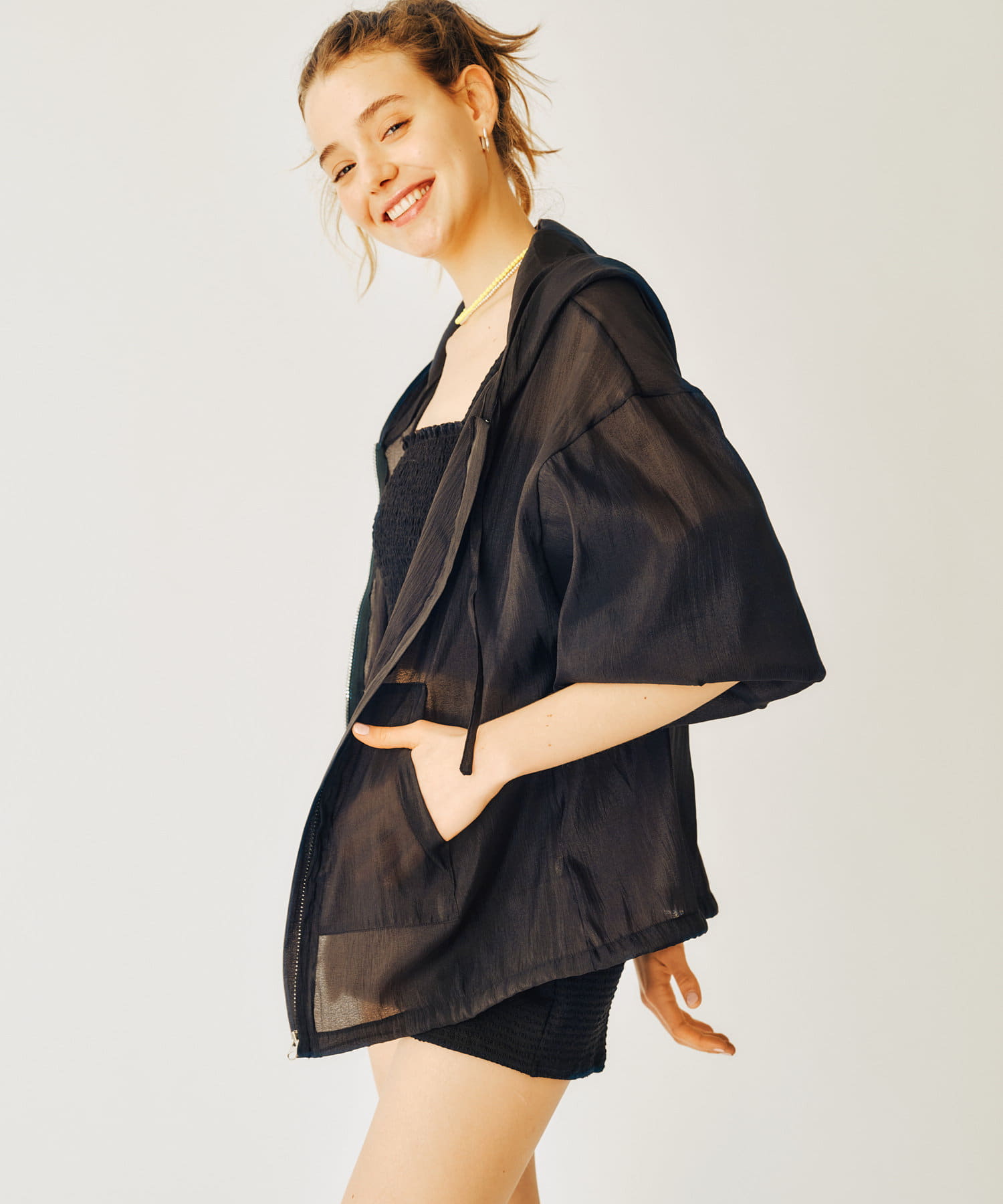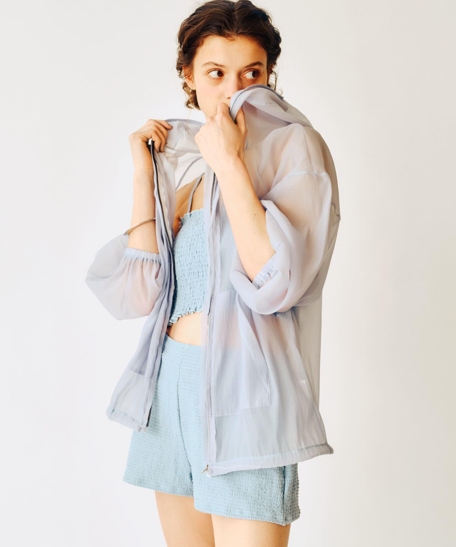 シアーパーカーはジッパー式で、透け感とゆったりとしたシルエットが女性らしい印象に。