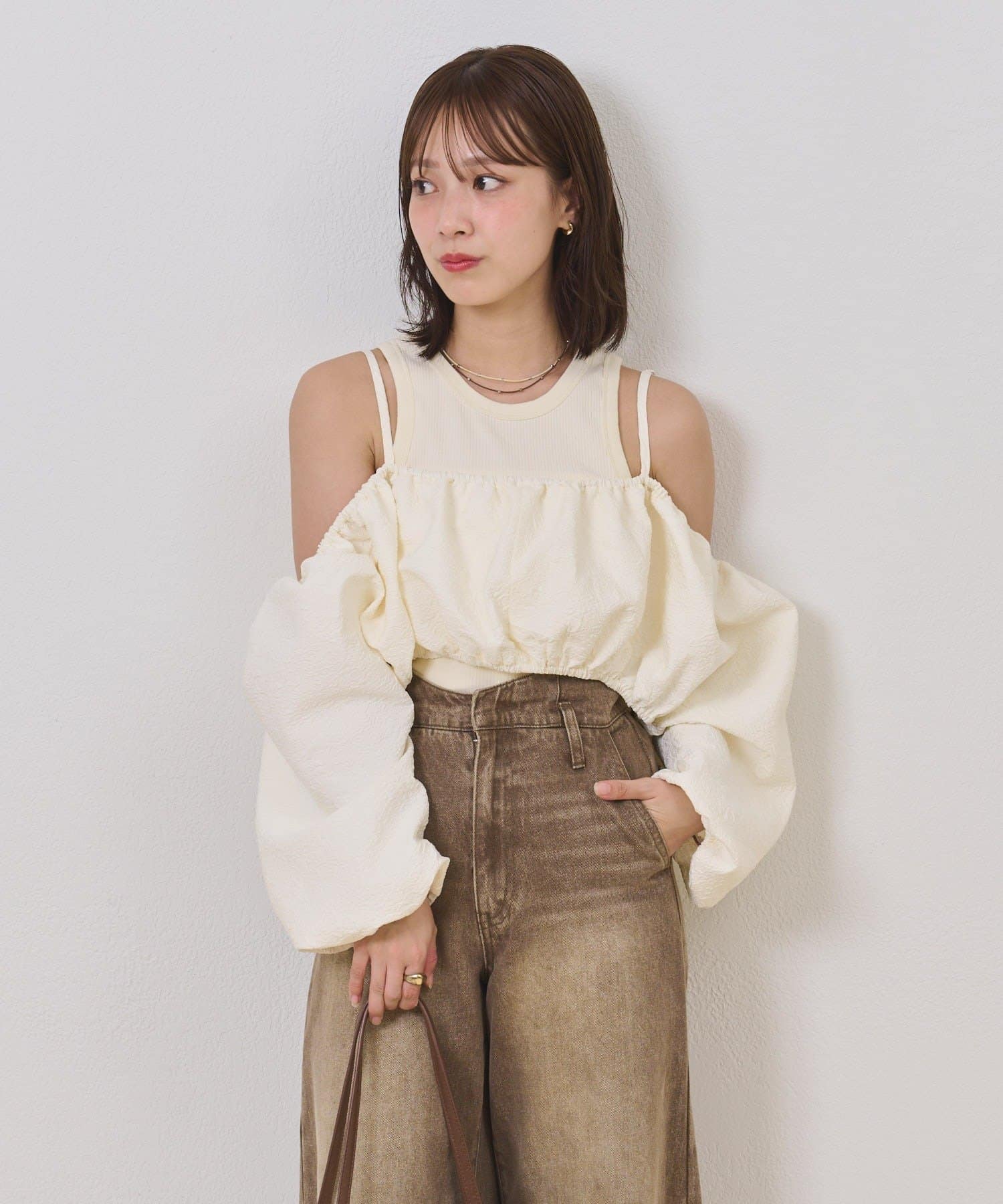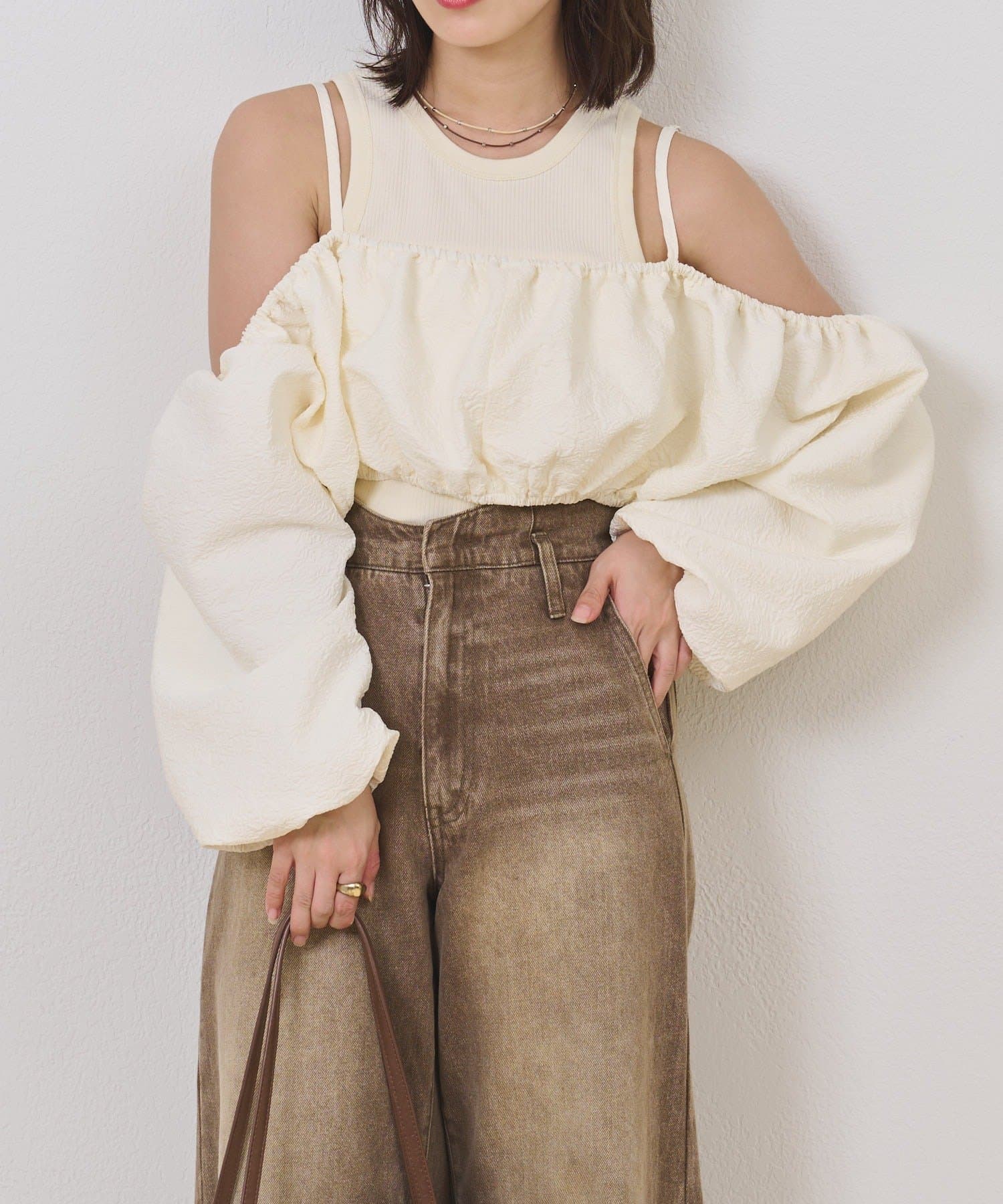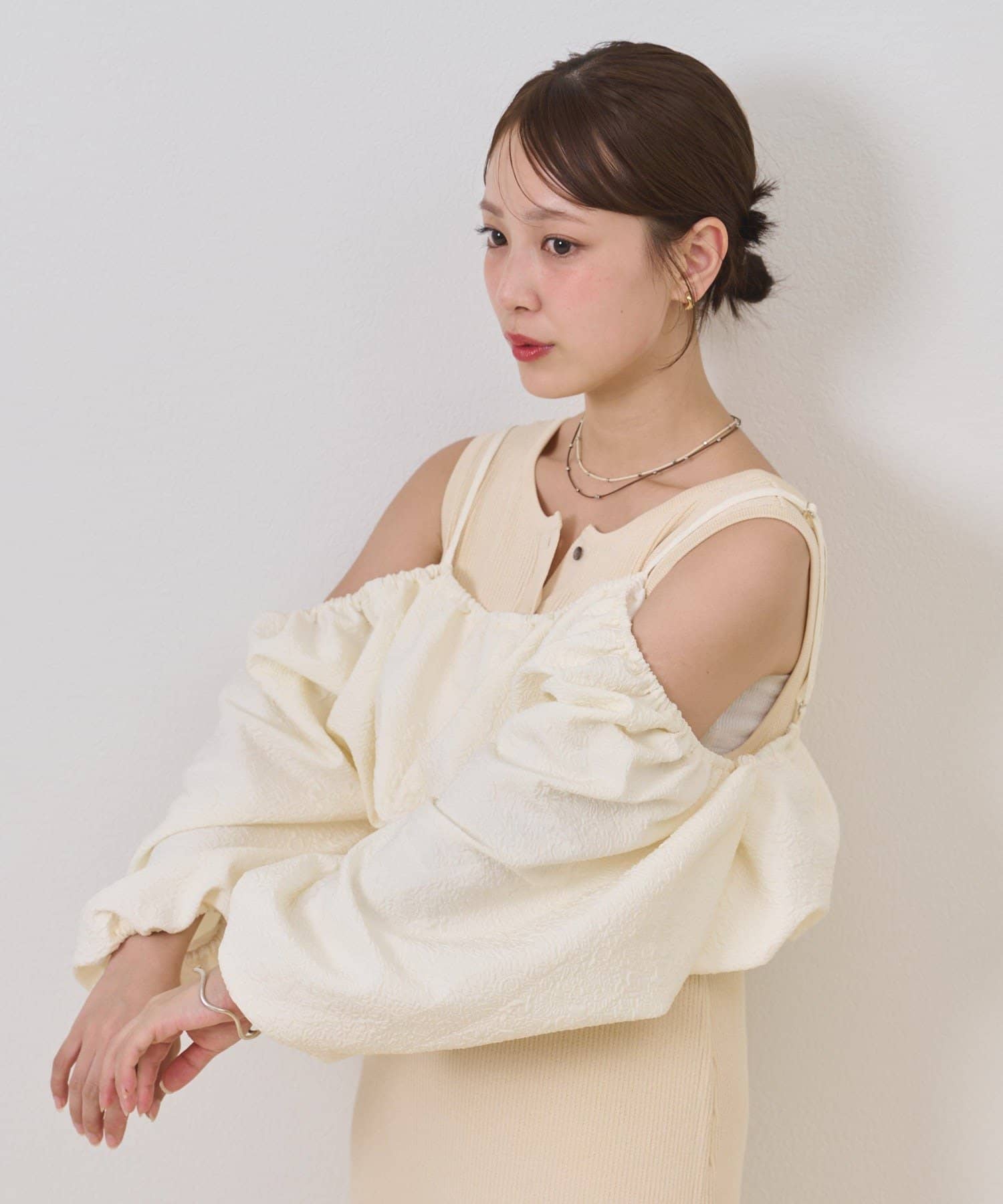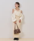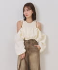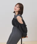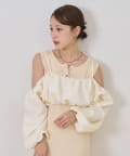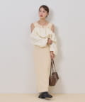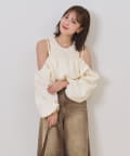 ・オフショルブラウスはふんわりとしたシルエットで女性らしいフェミニンな印象に仕上げました◎気になる二の腕も可愛くカバーできるのもうれしいポイントです♩