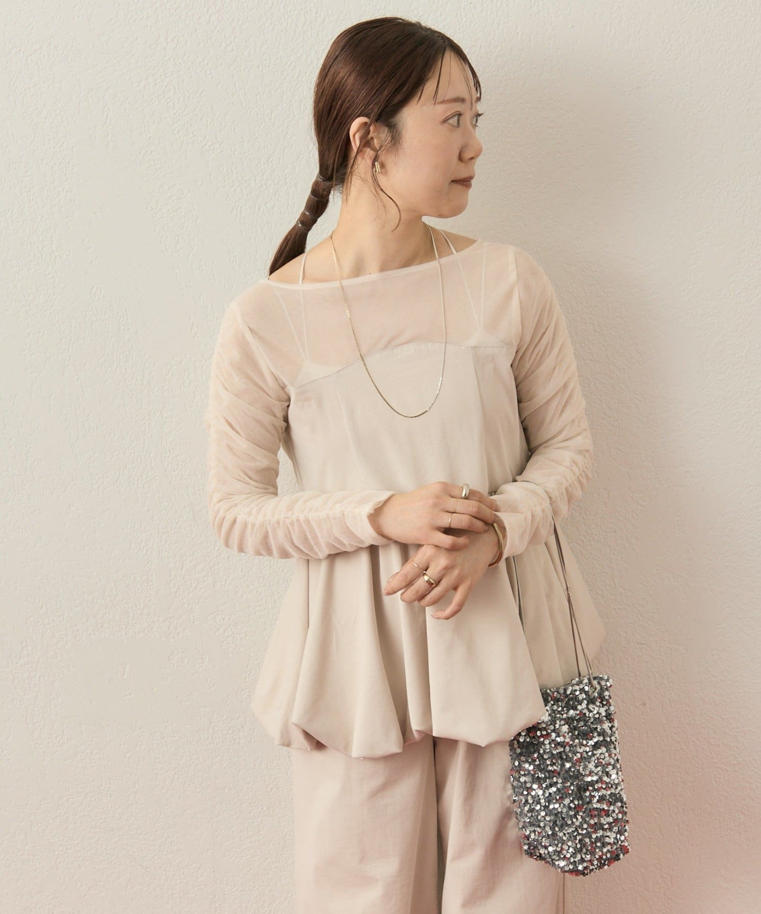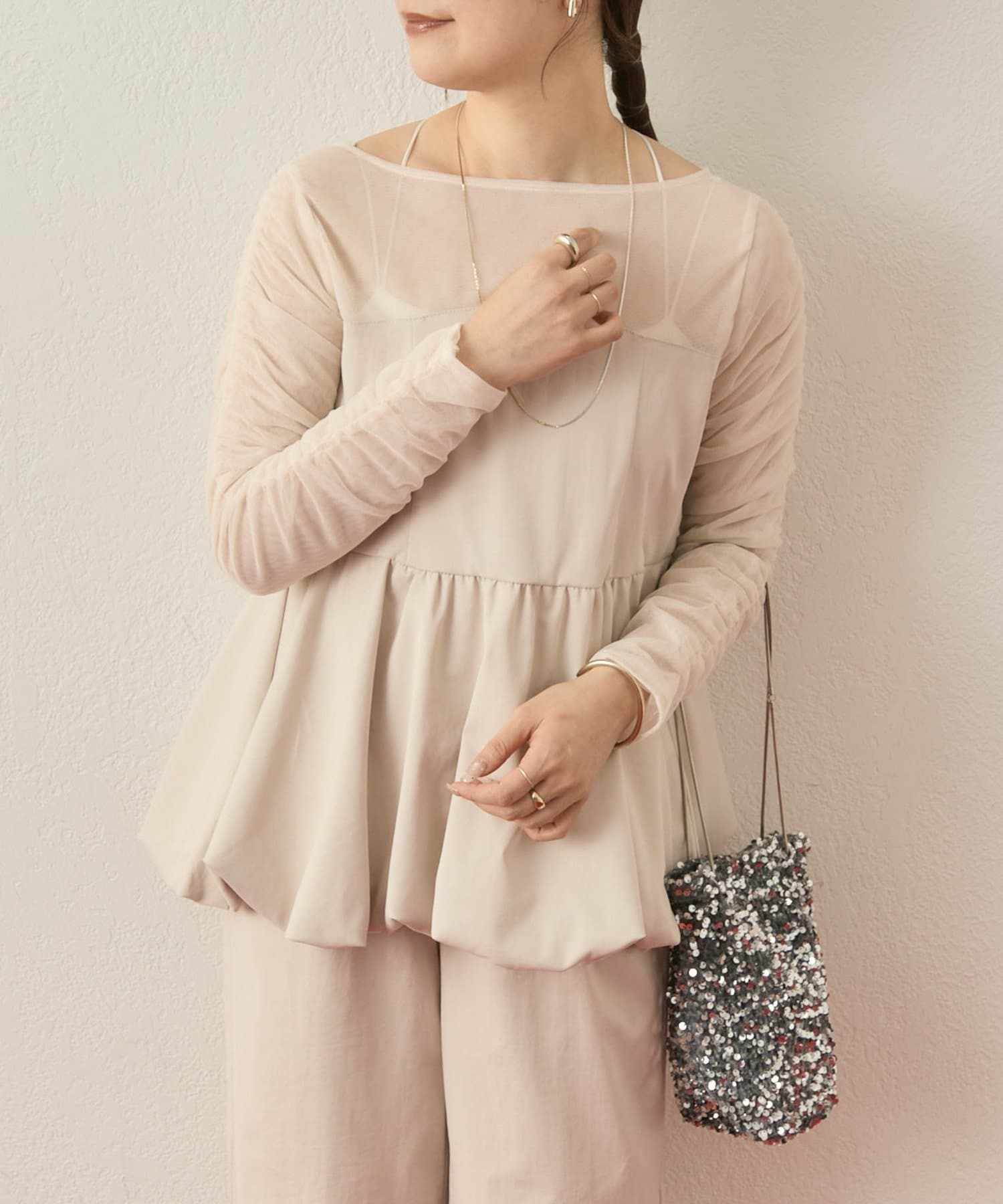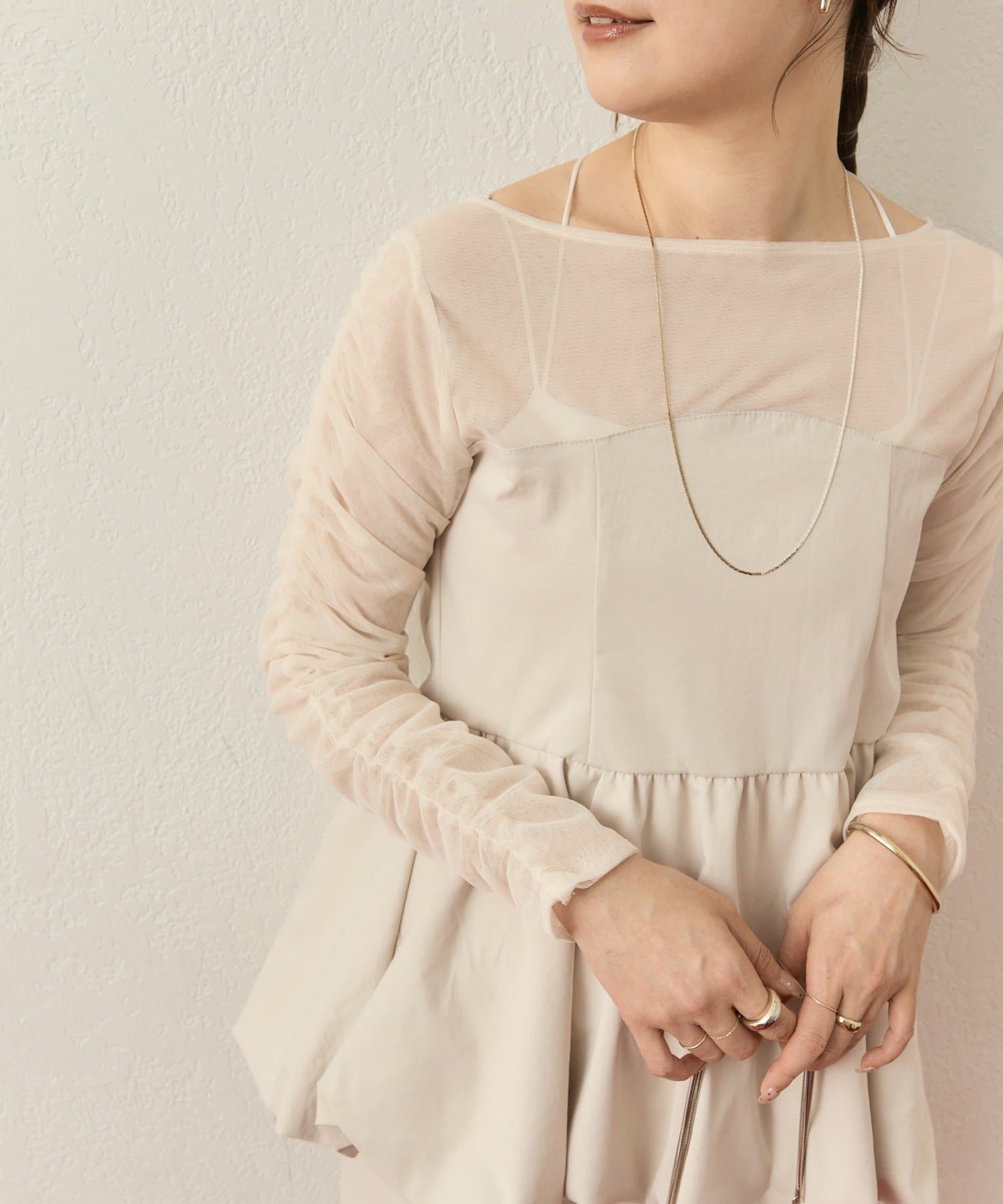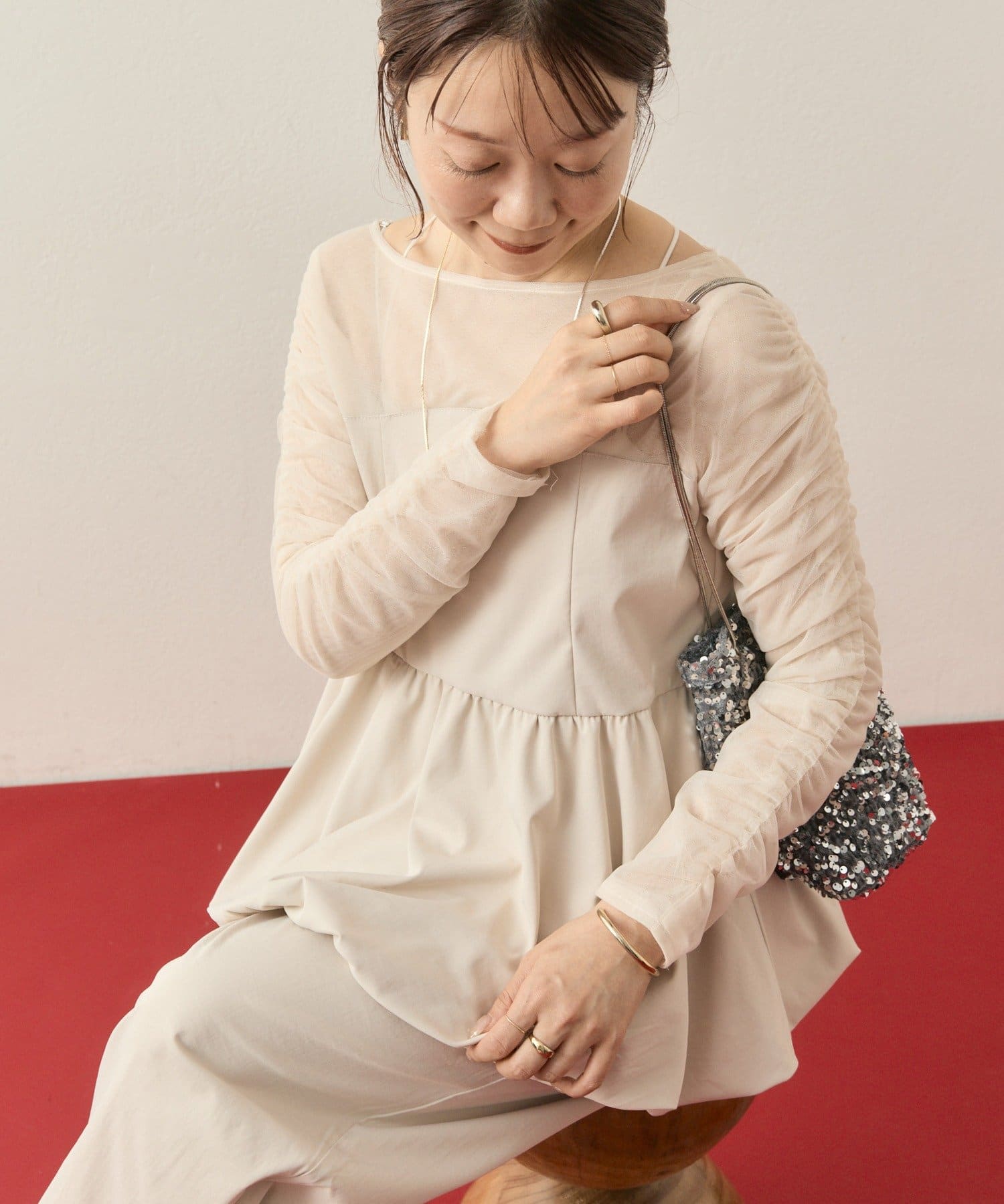・トップスの袖もとのギャザーがスッキリと見せてくれ、チュールは透けすぎない2枚重ね仕様なので安心してお使いいただけます。