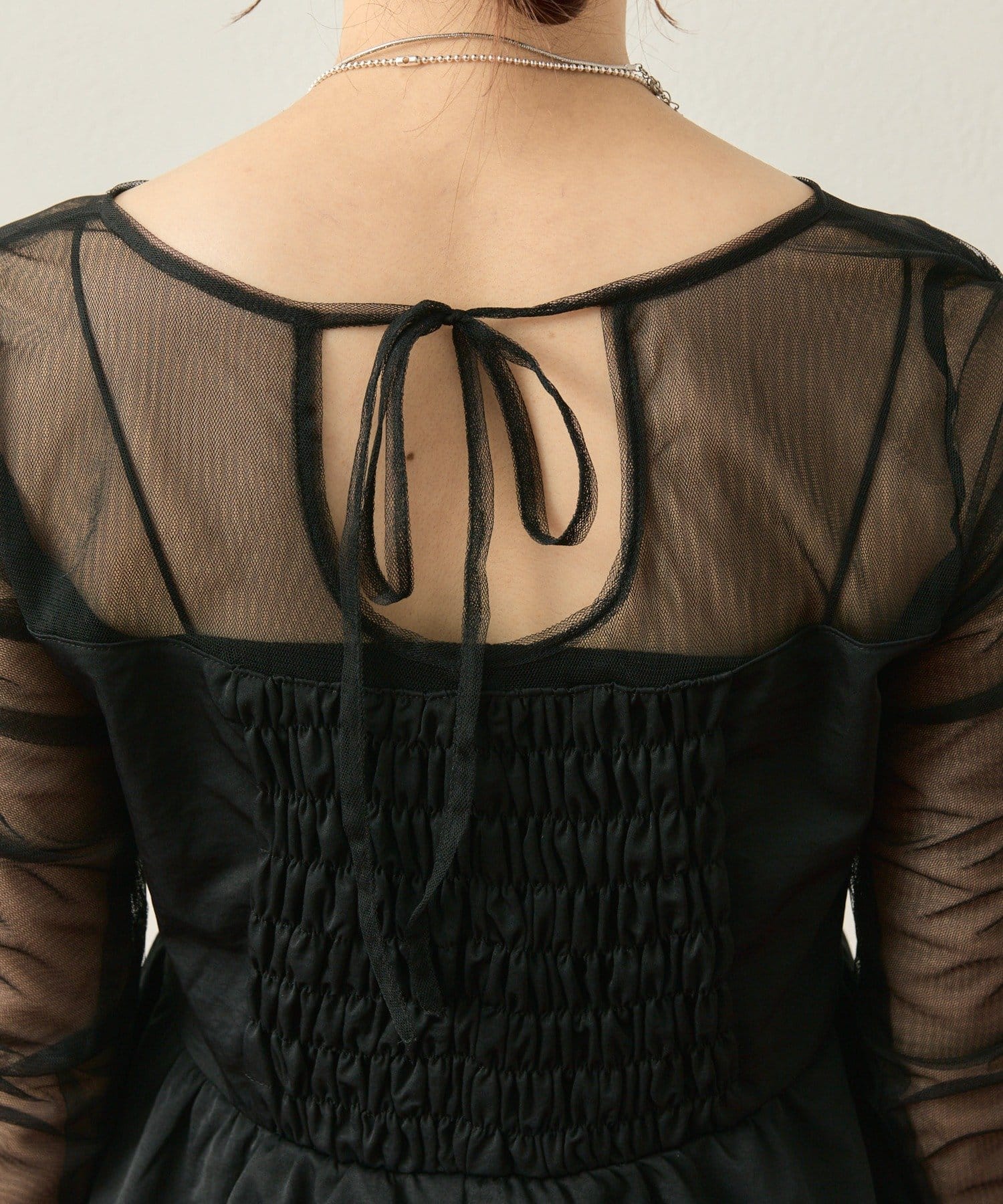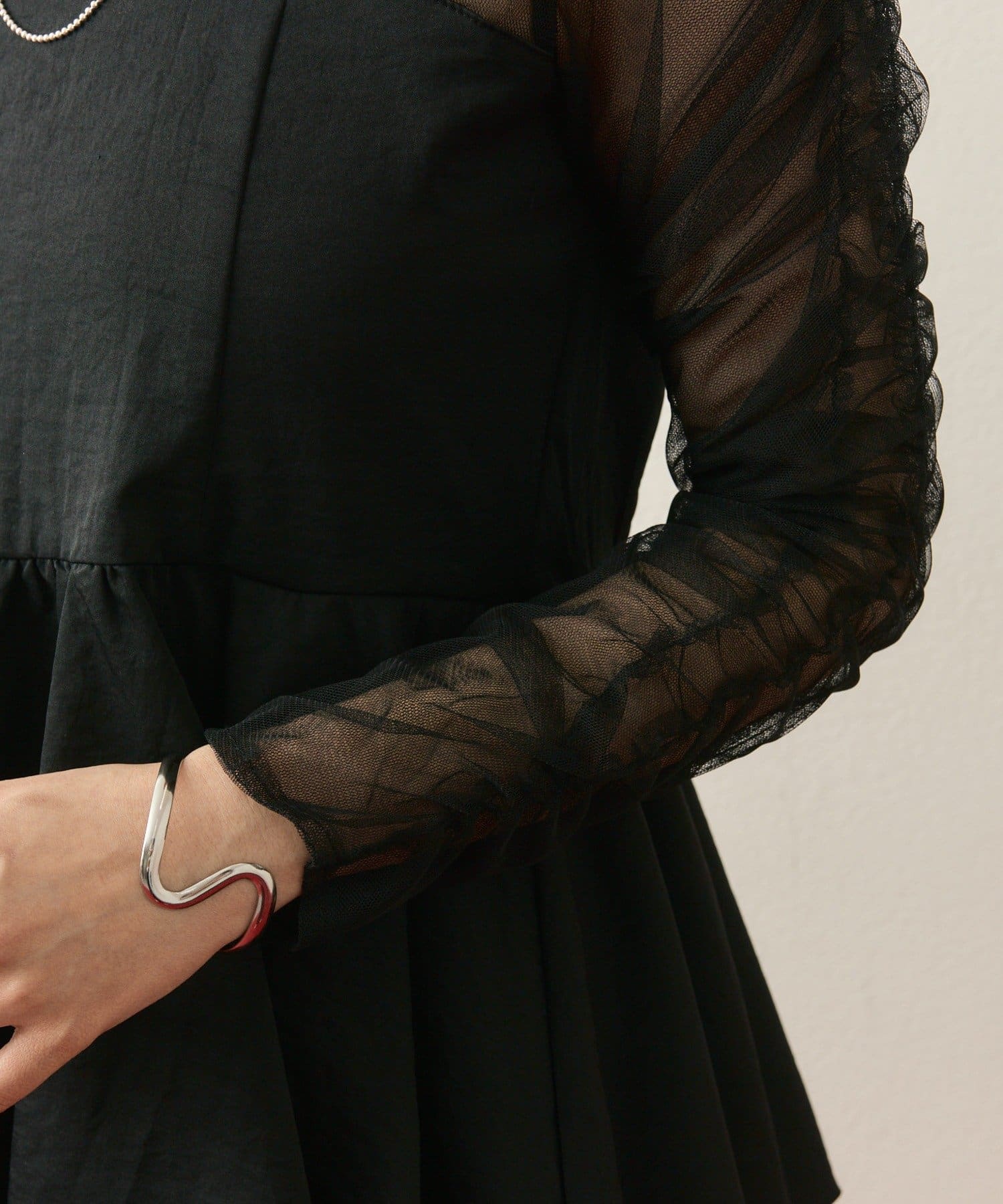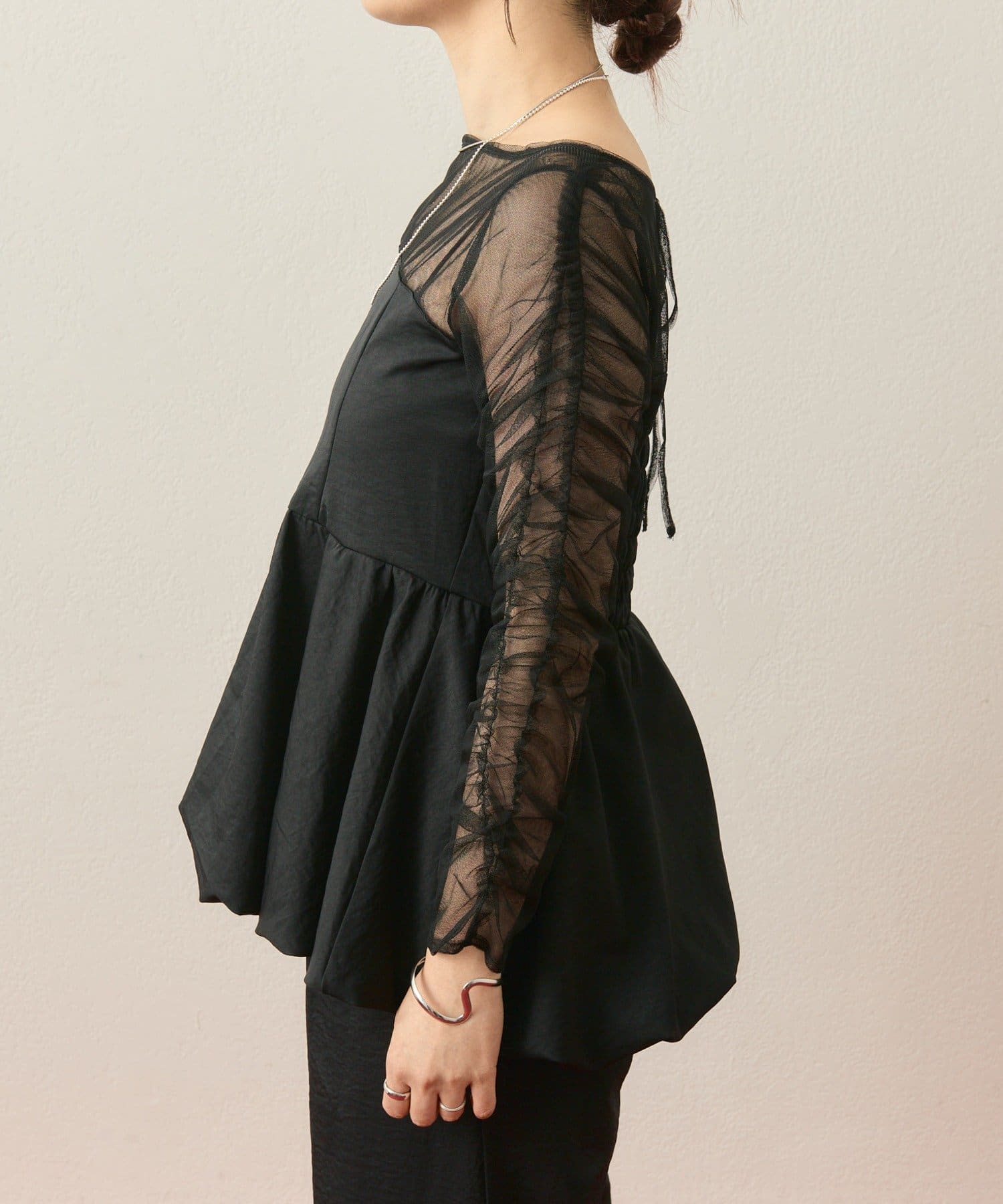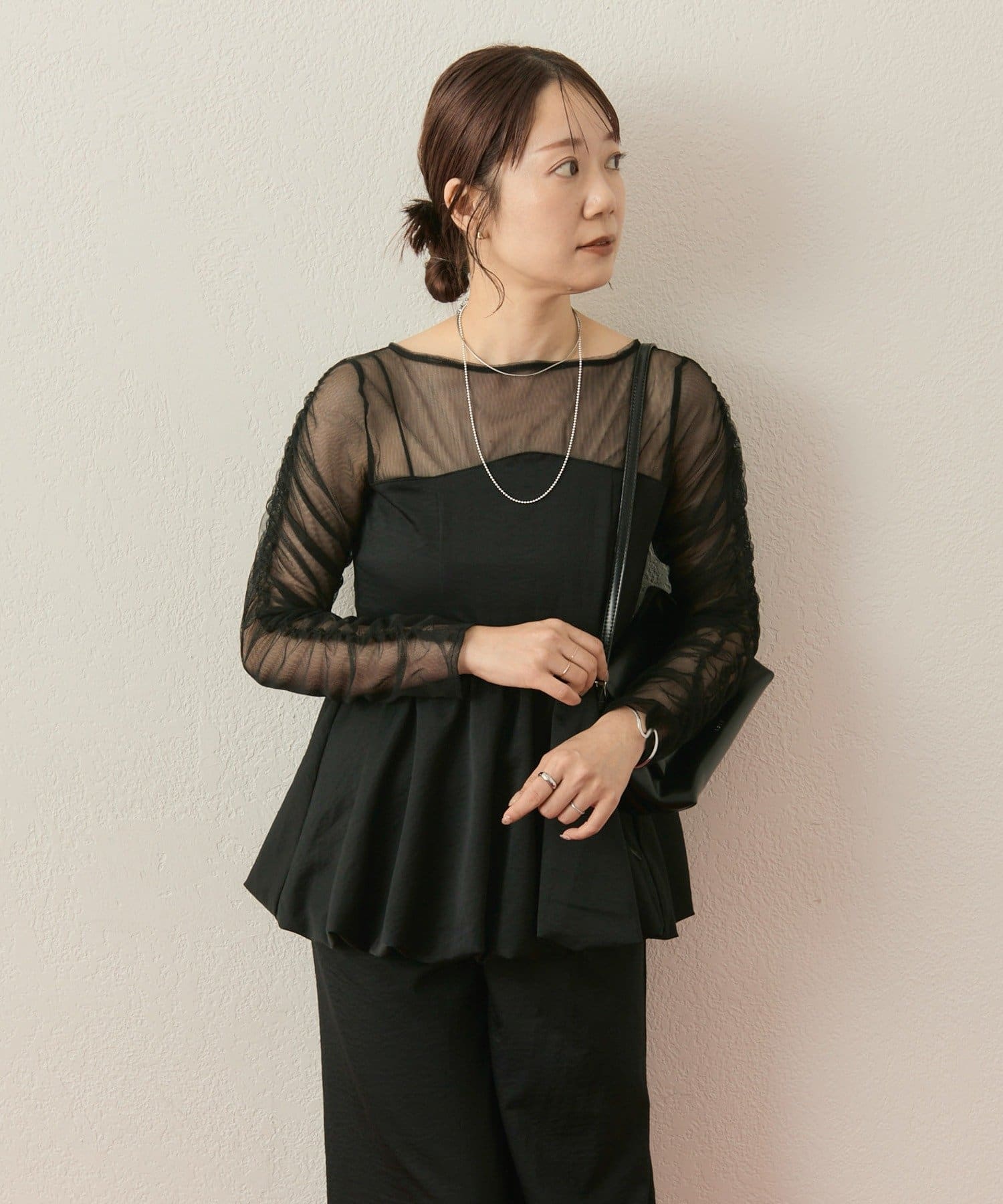 ・トップスの袖もとのギャザーがスッキリと見せてくれ、チュールは透けすぎない2枚重ね仕様なので安心してお使いいただけます。