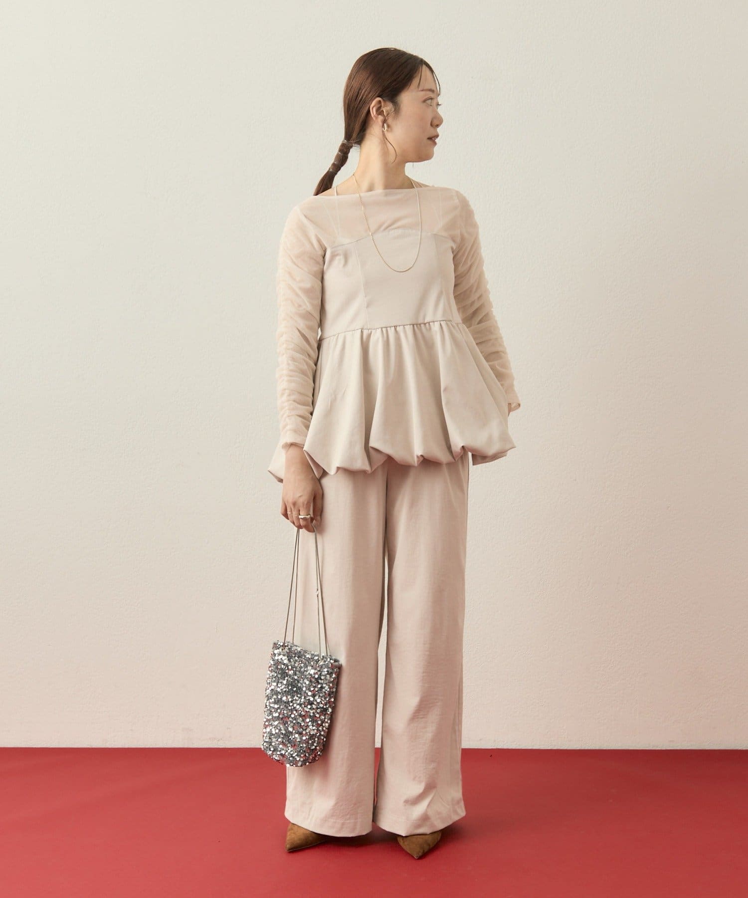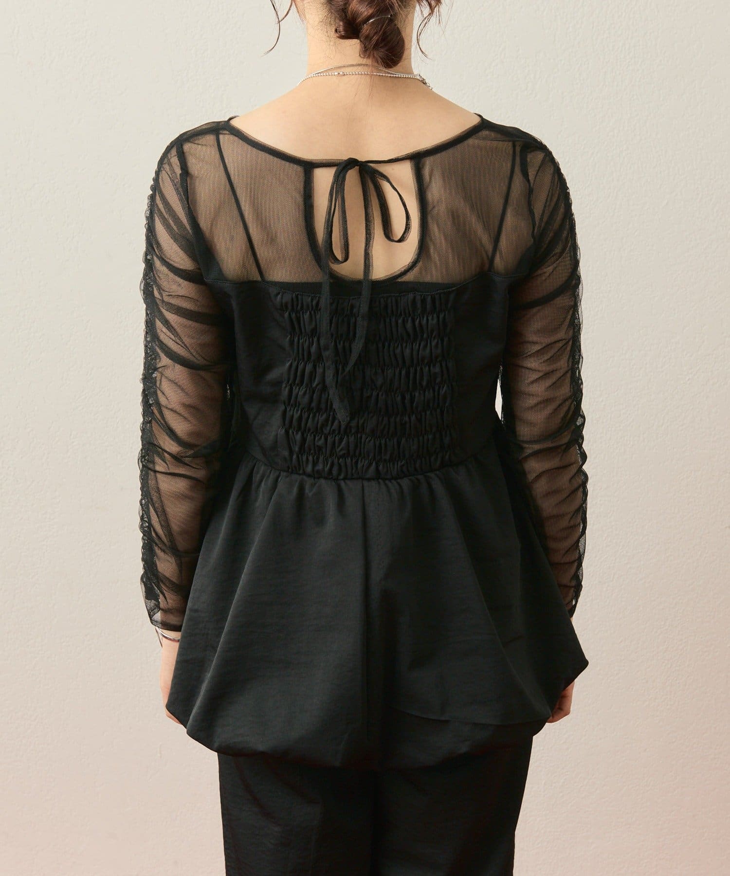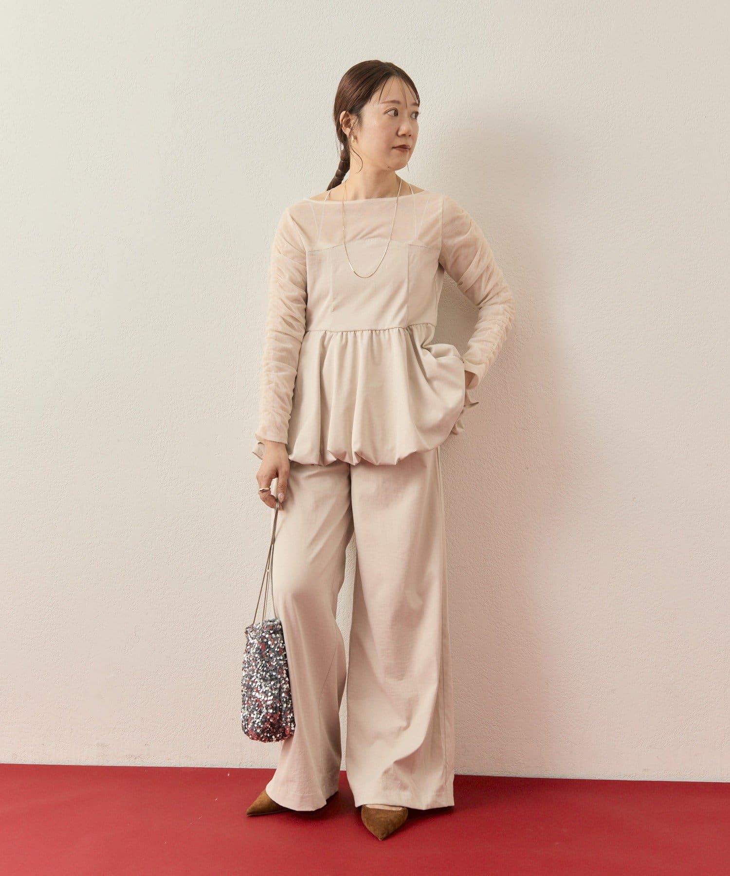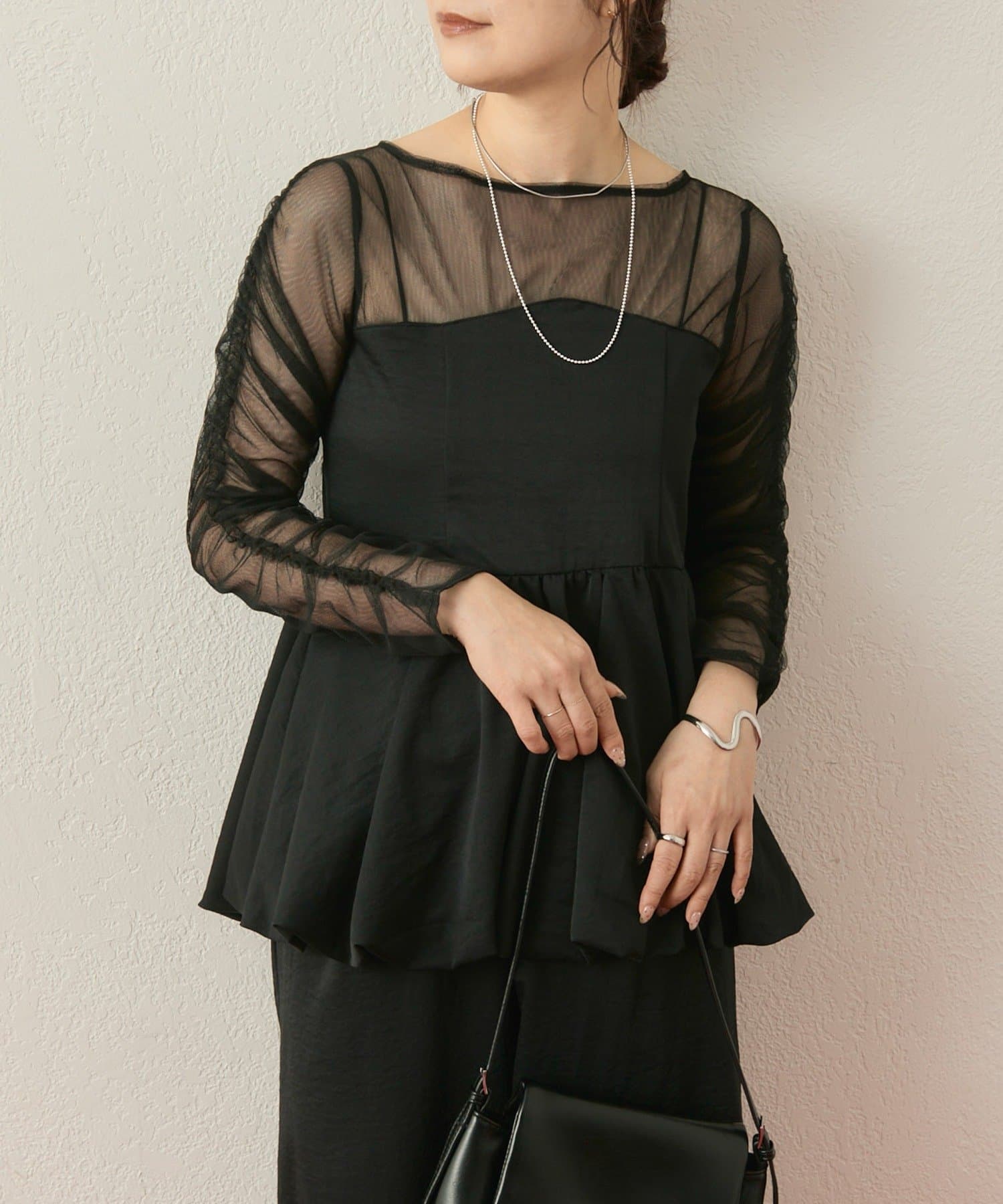 ・トップスの袖もとのギャザーがスッキリと見せてくれ、チュールは透けすぎない2枚重ね仕様なので安心してお使いいただけます。
