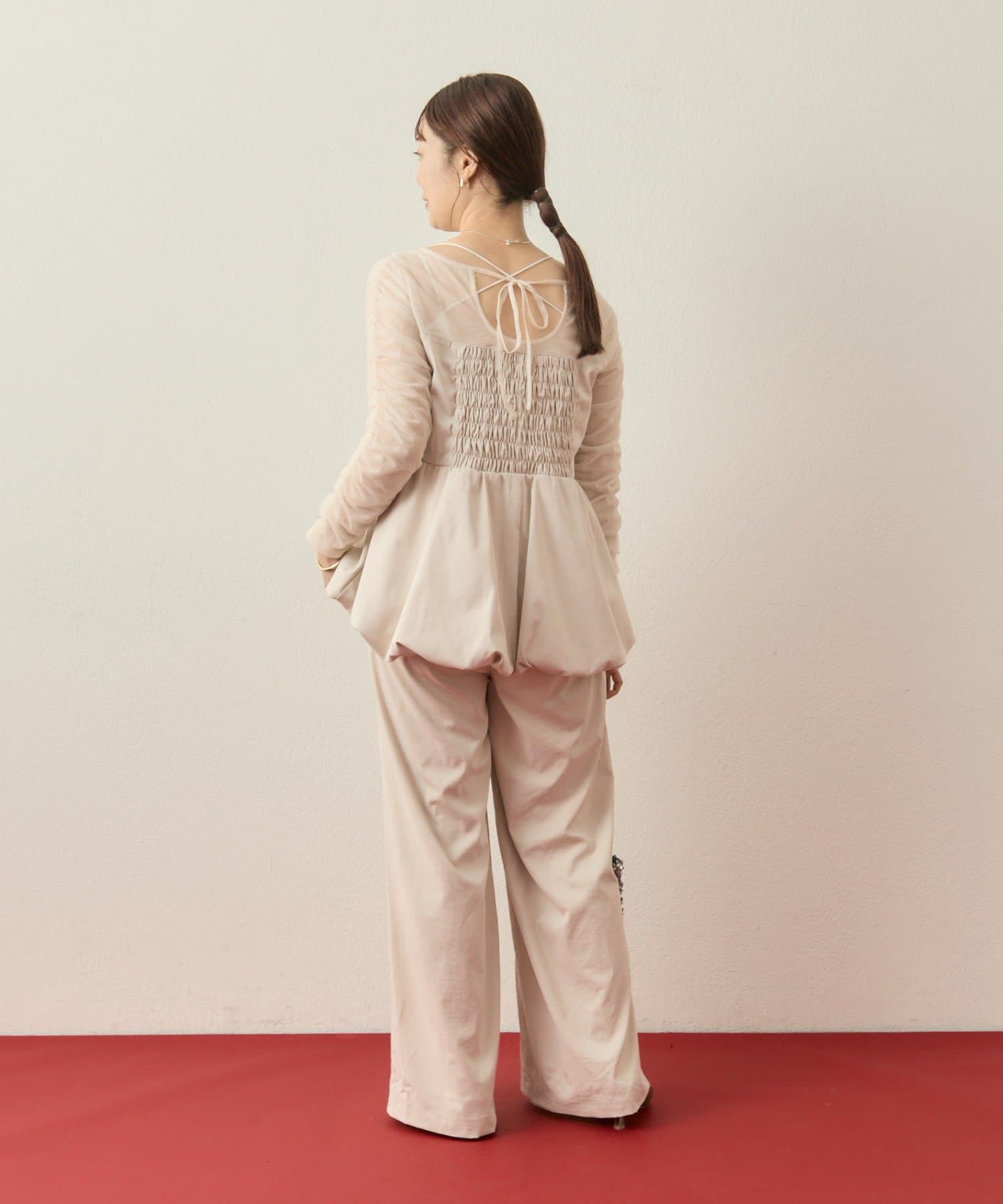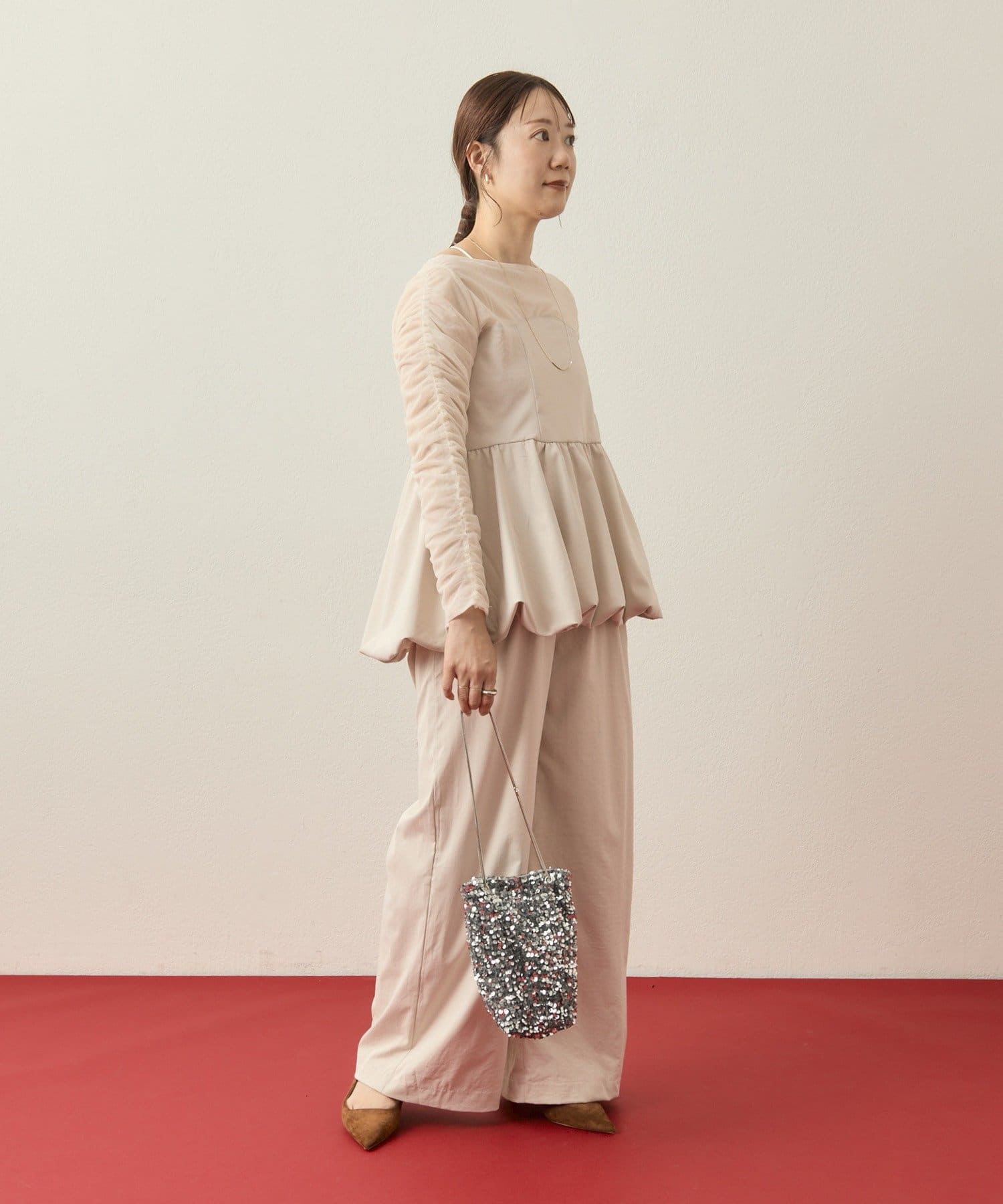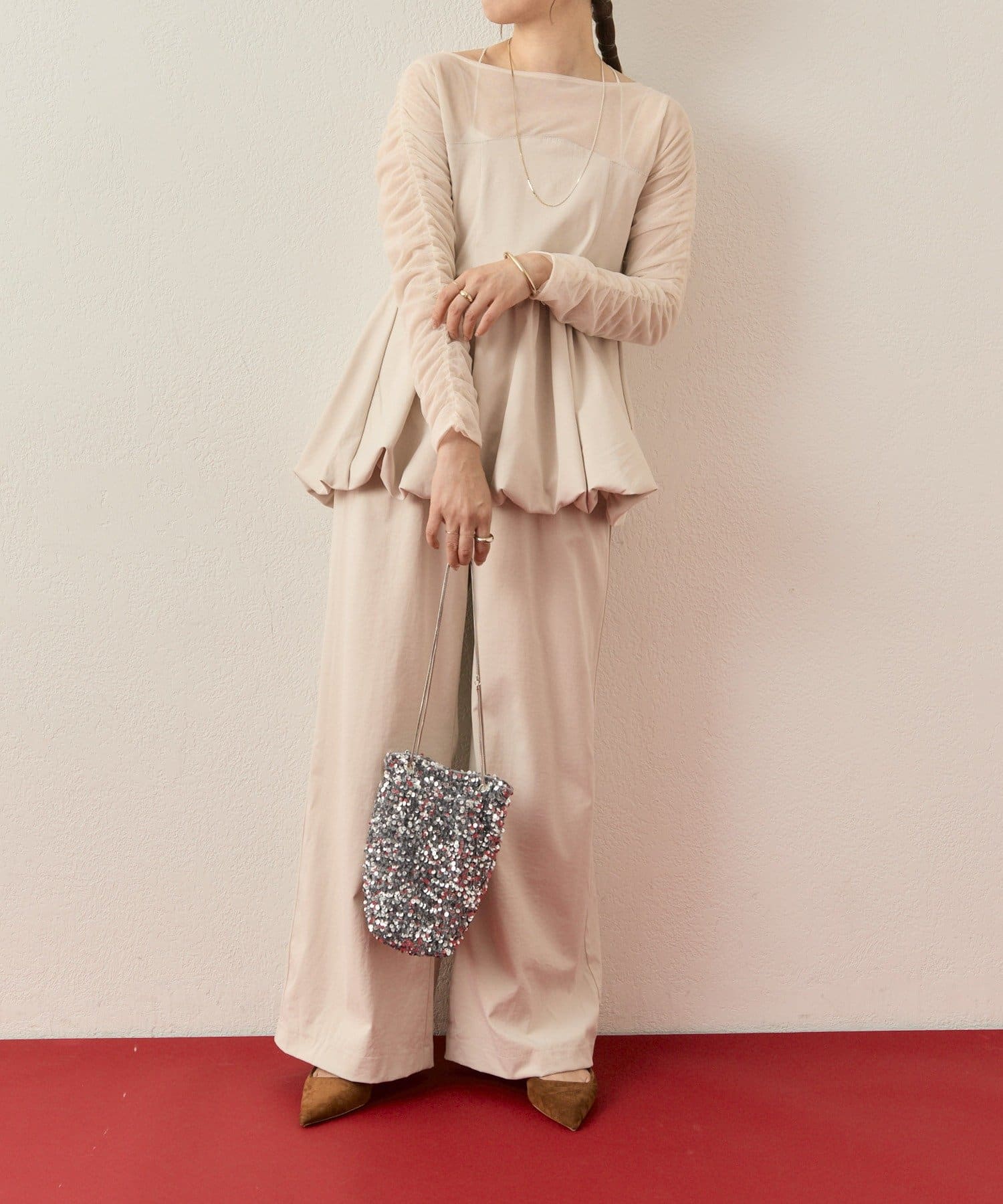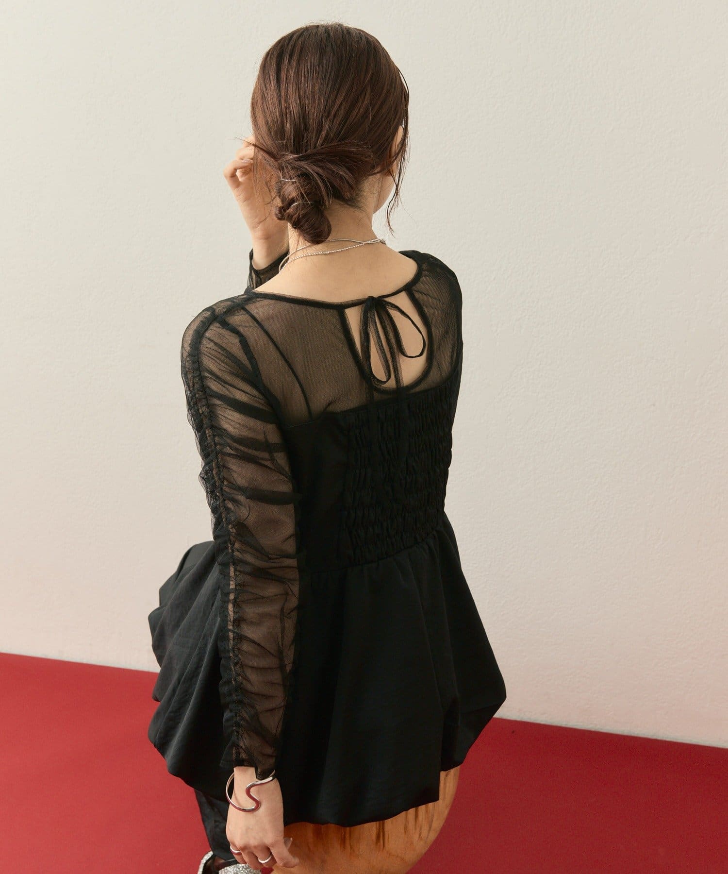 ・トップスの袖もとのギャザーがスッキリと見せてくれ、チュールは透けすぎない2枚重ね仕様なので安心してお使いいただけます。