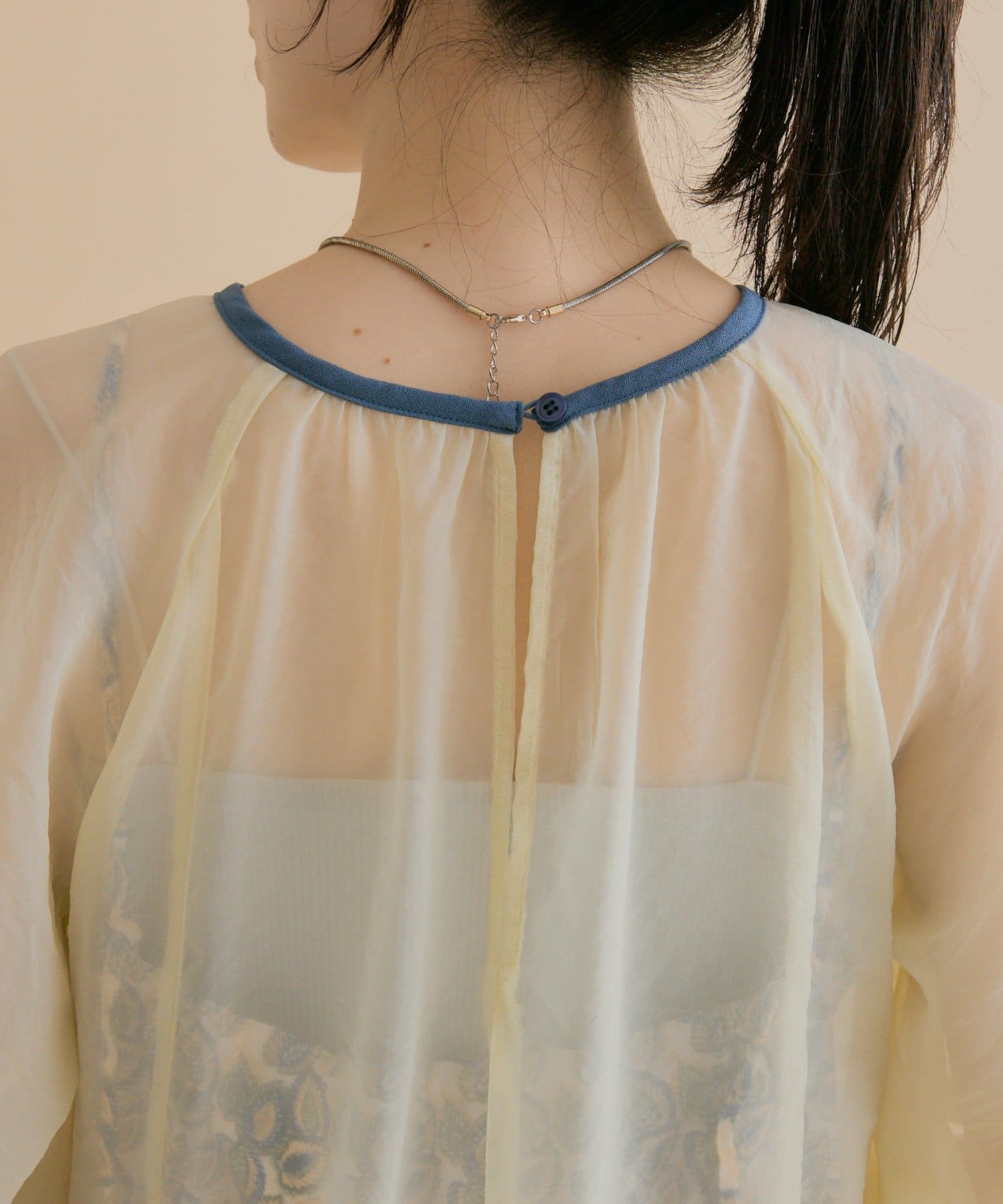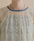 ・首元のパイピングデザインが顔回りを華やかな印象に。