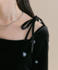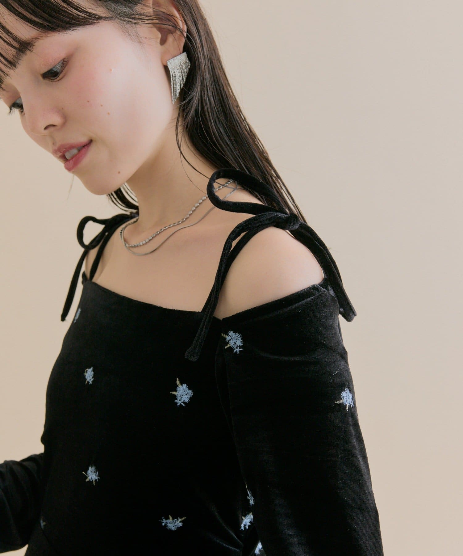 ・肩部分のリボンとバックの肌見せがアクセントになり程よい抜け感を演出◎